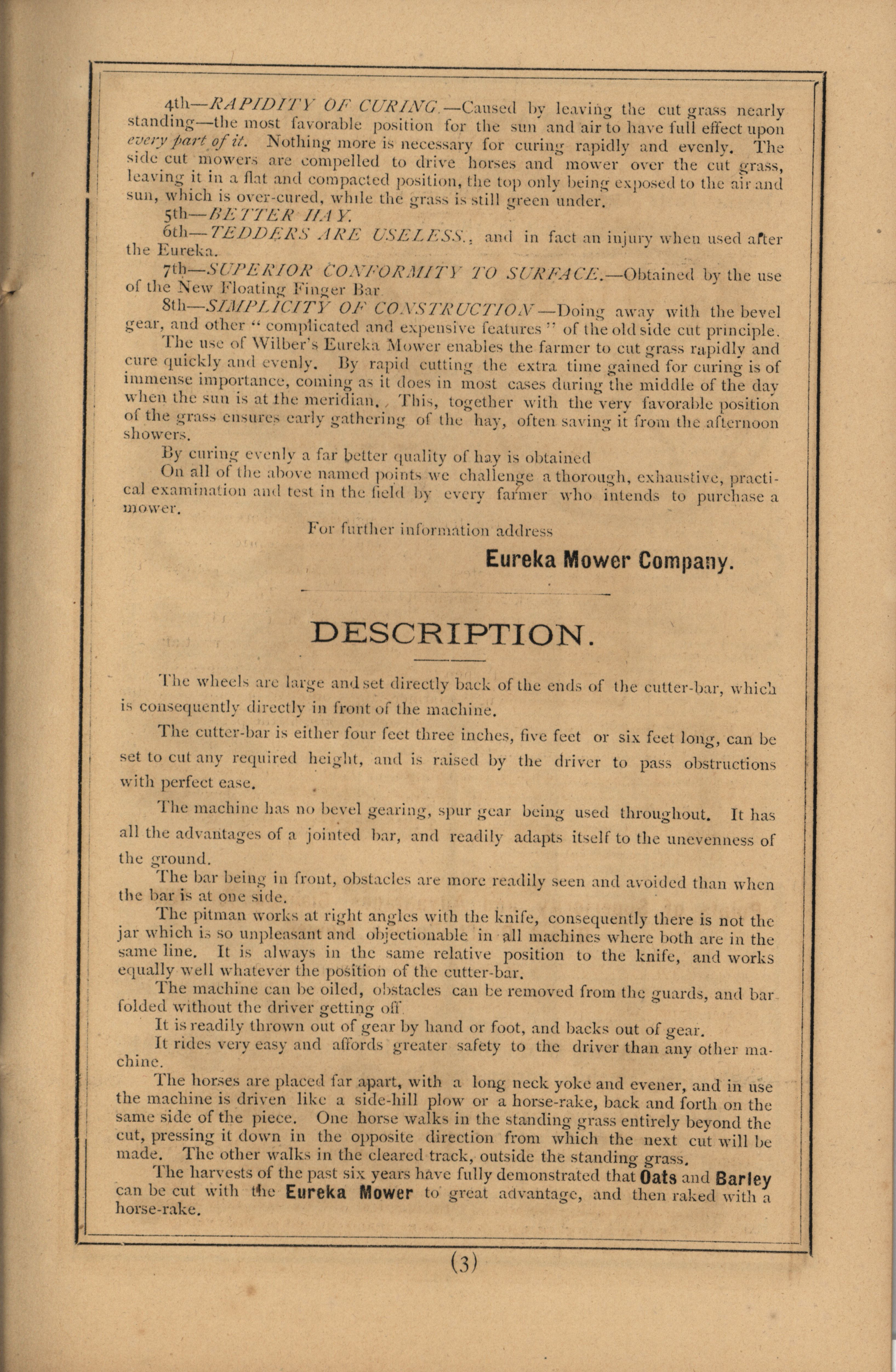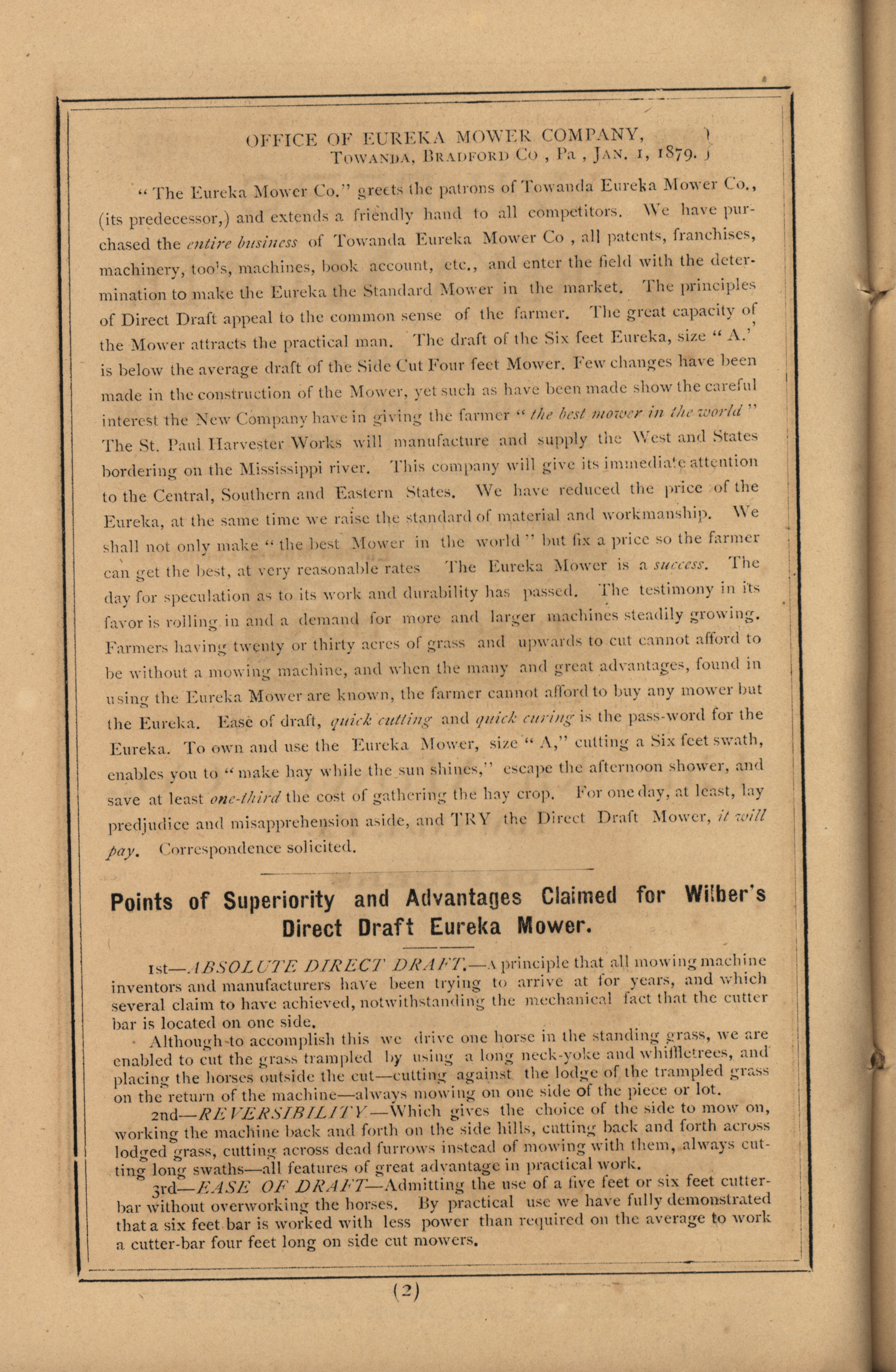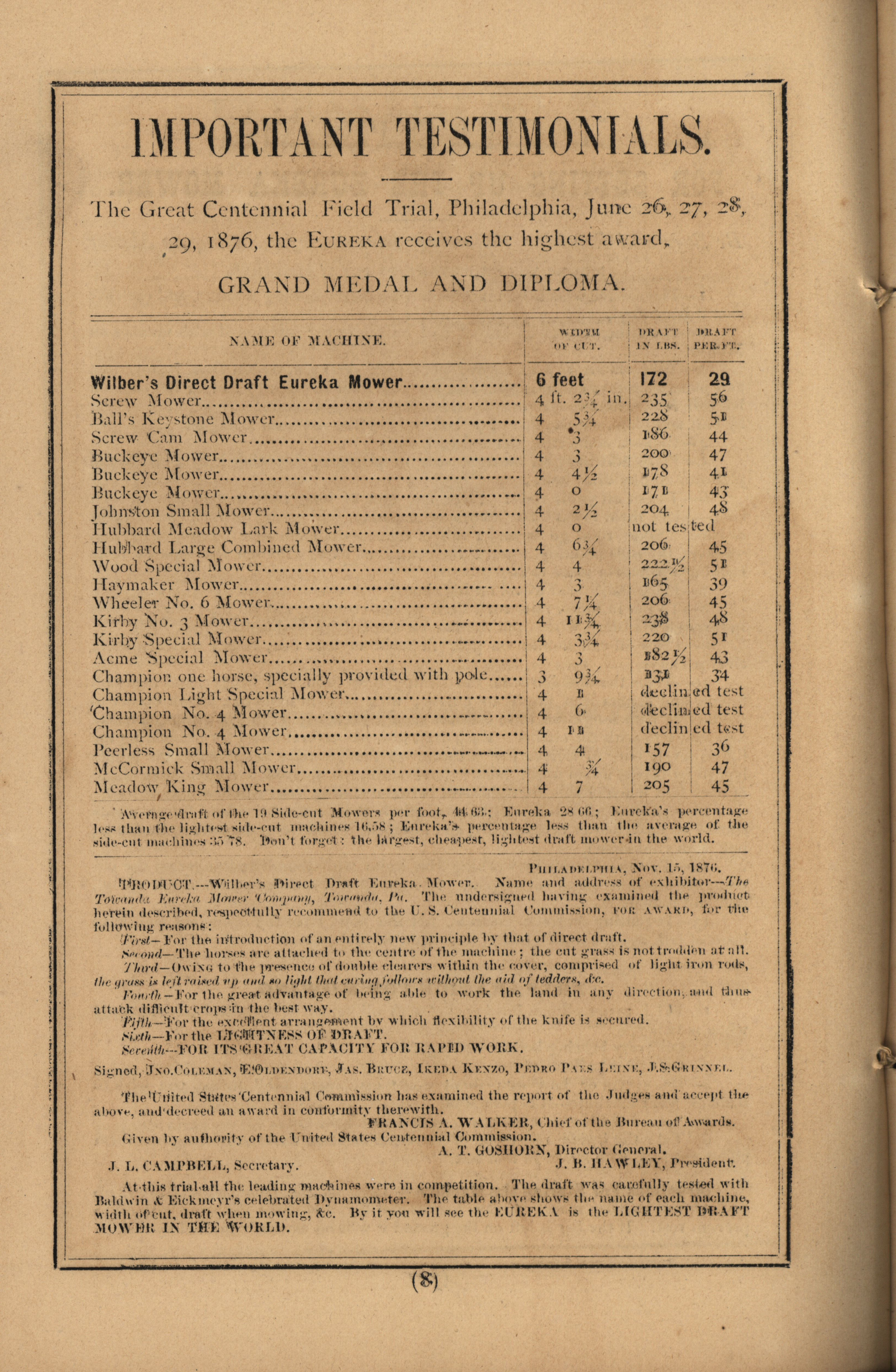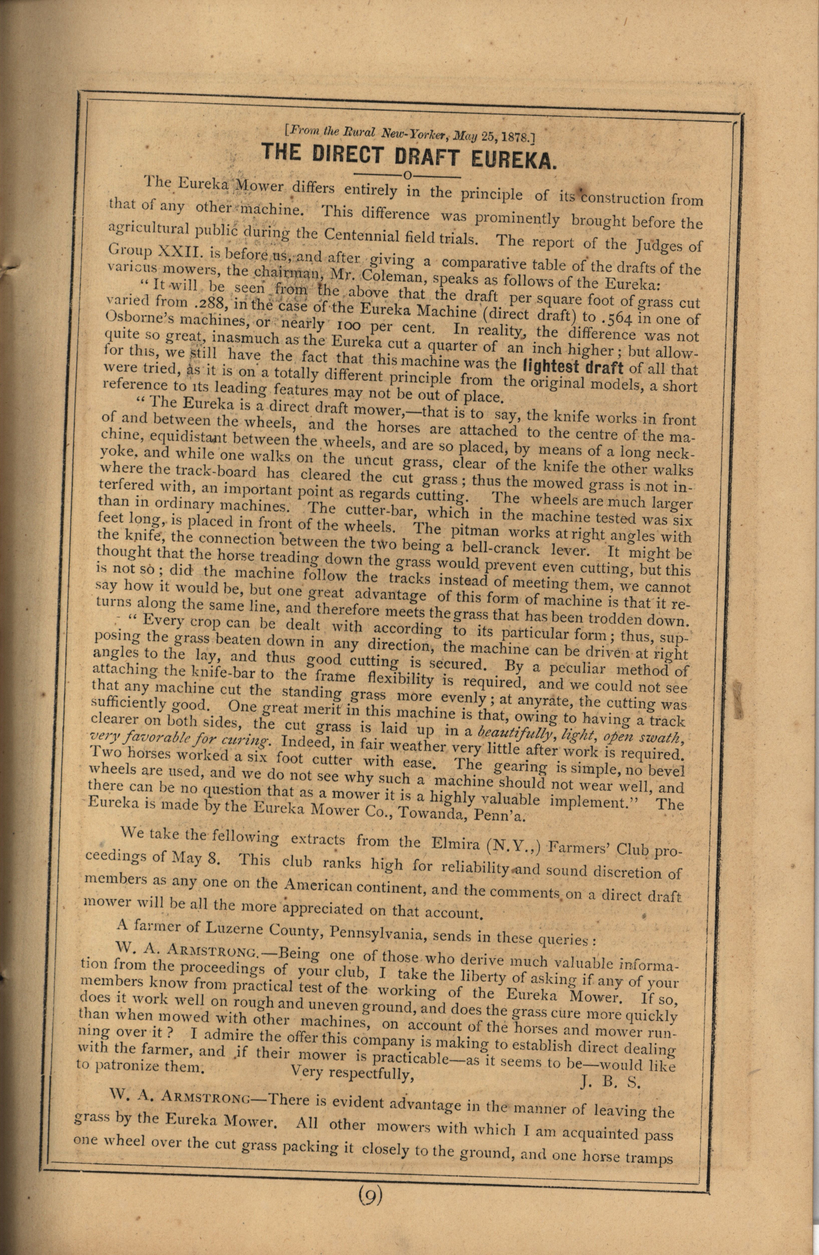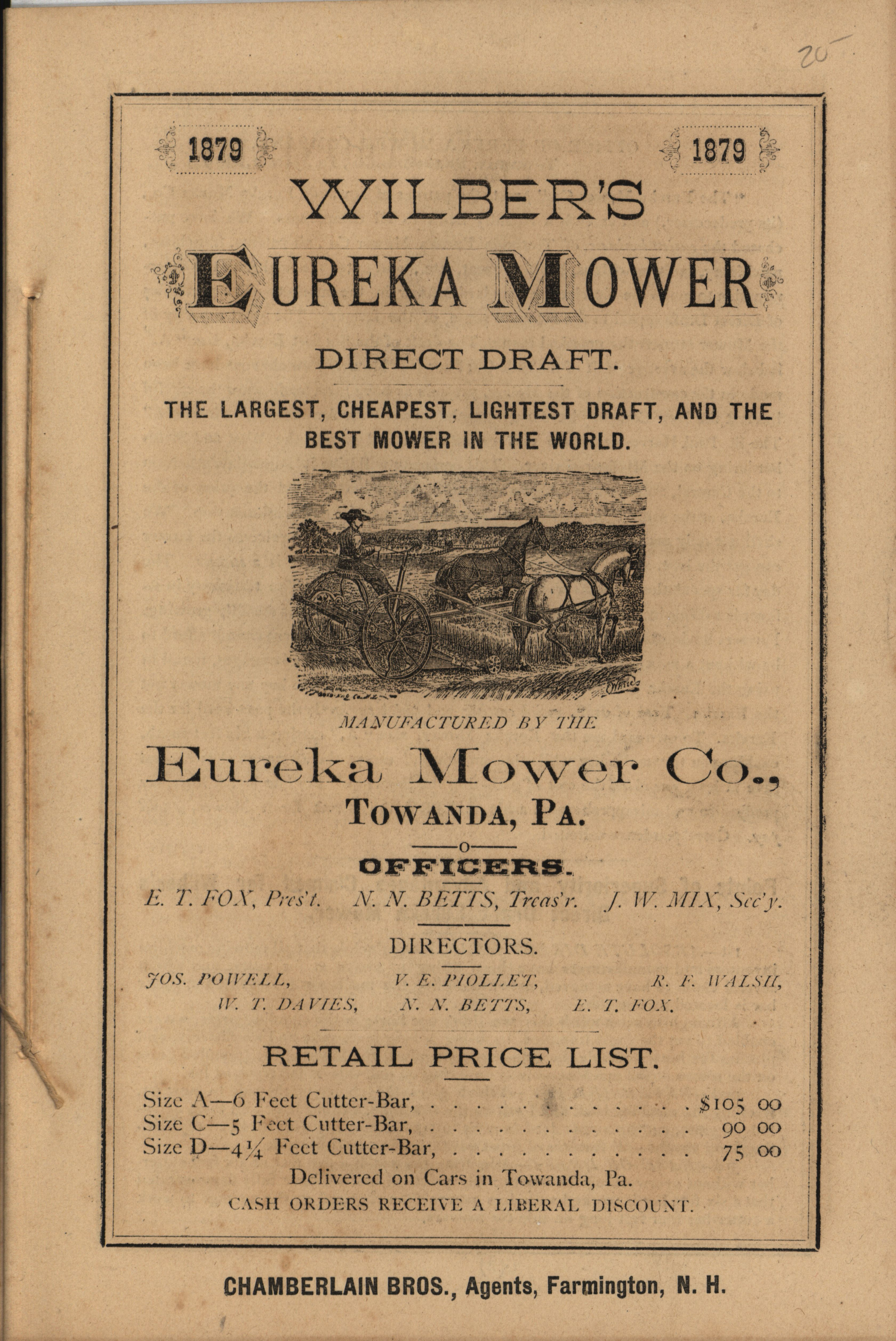 - "Eureka Mower Company 1879 catalog", Agricultural Machinery Literature Collection, Iowa State University Library Digital Collections