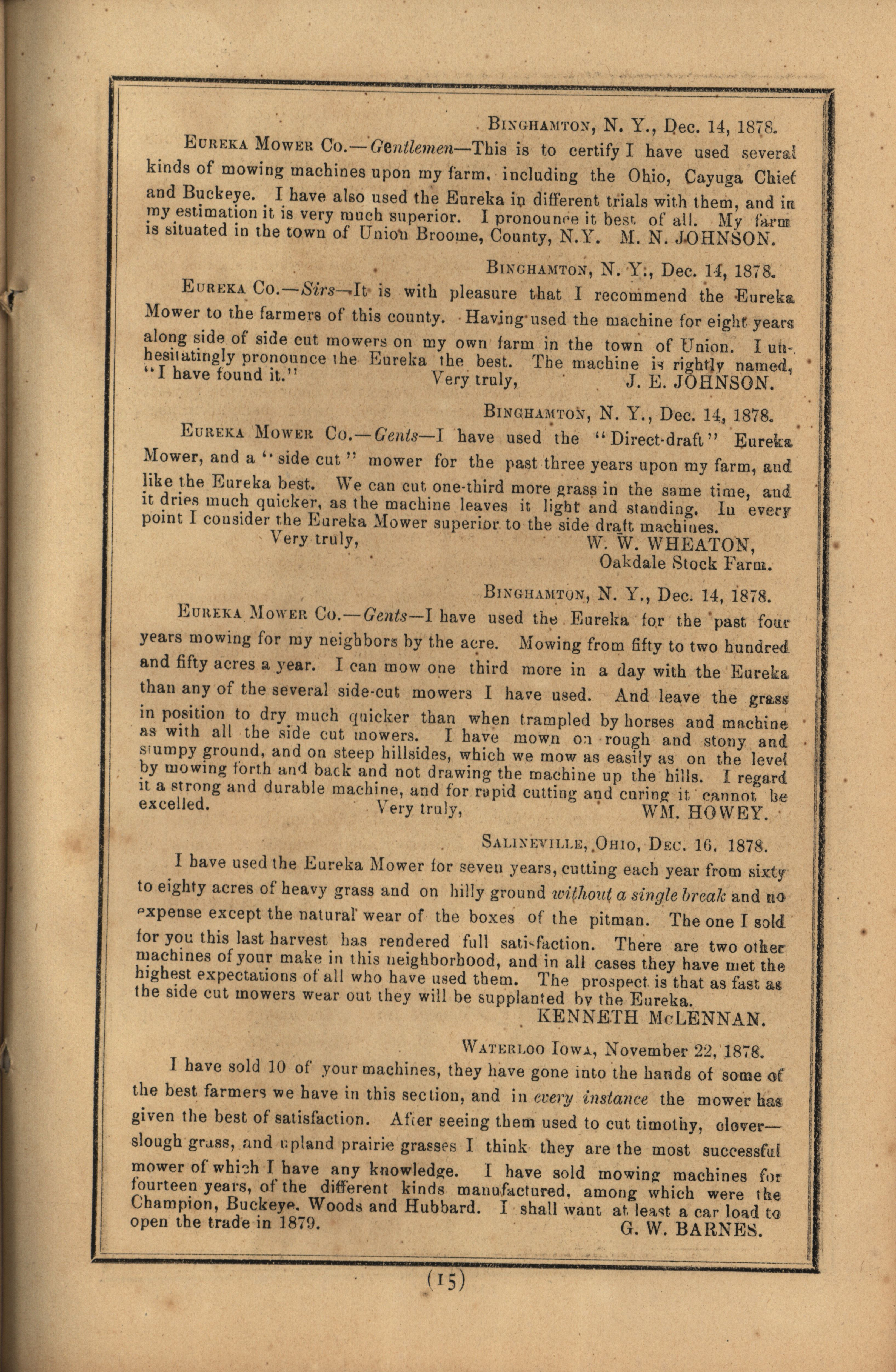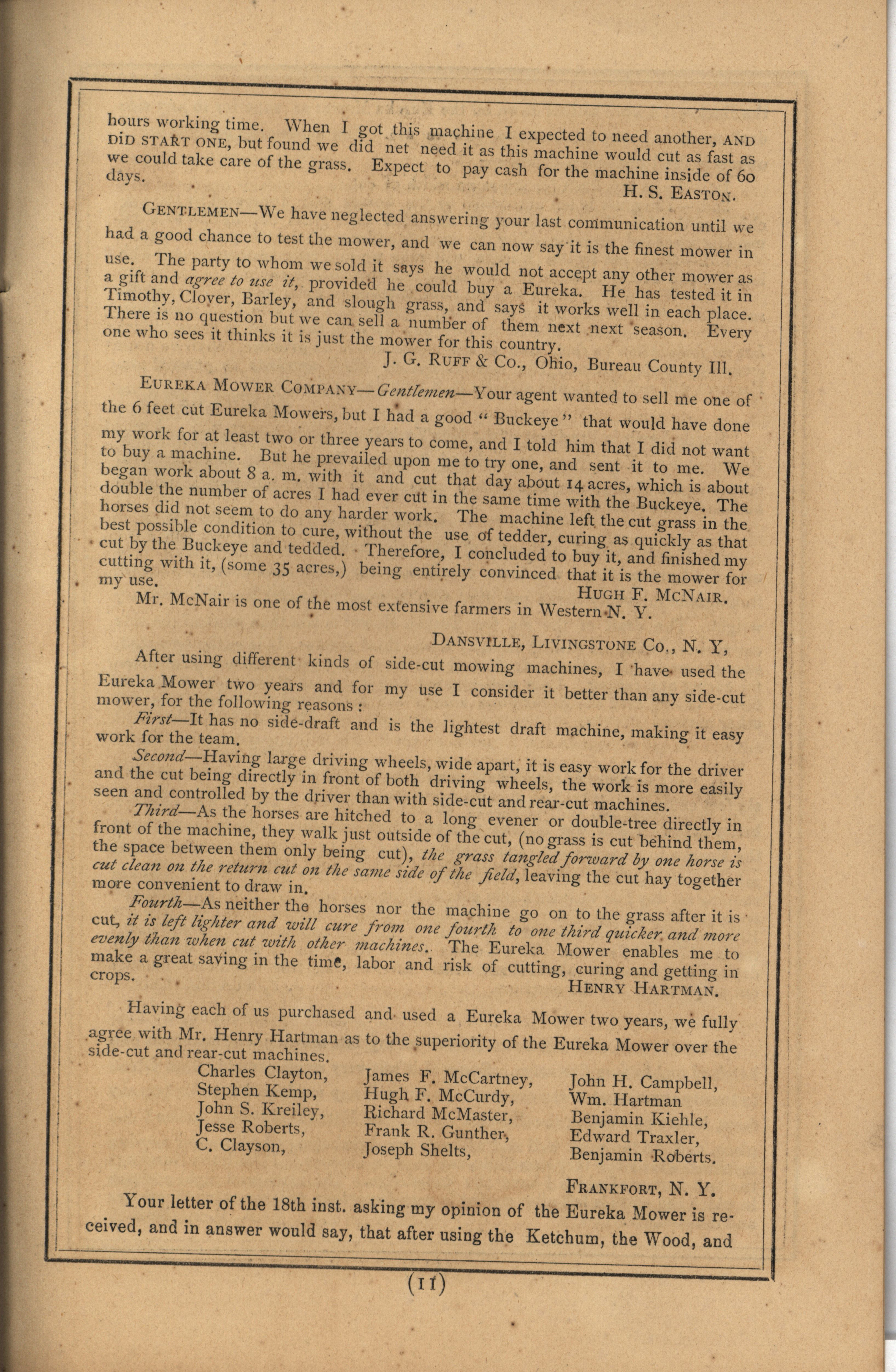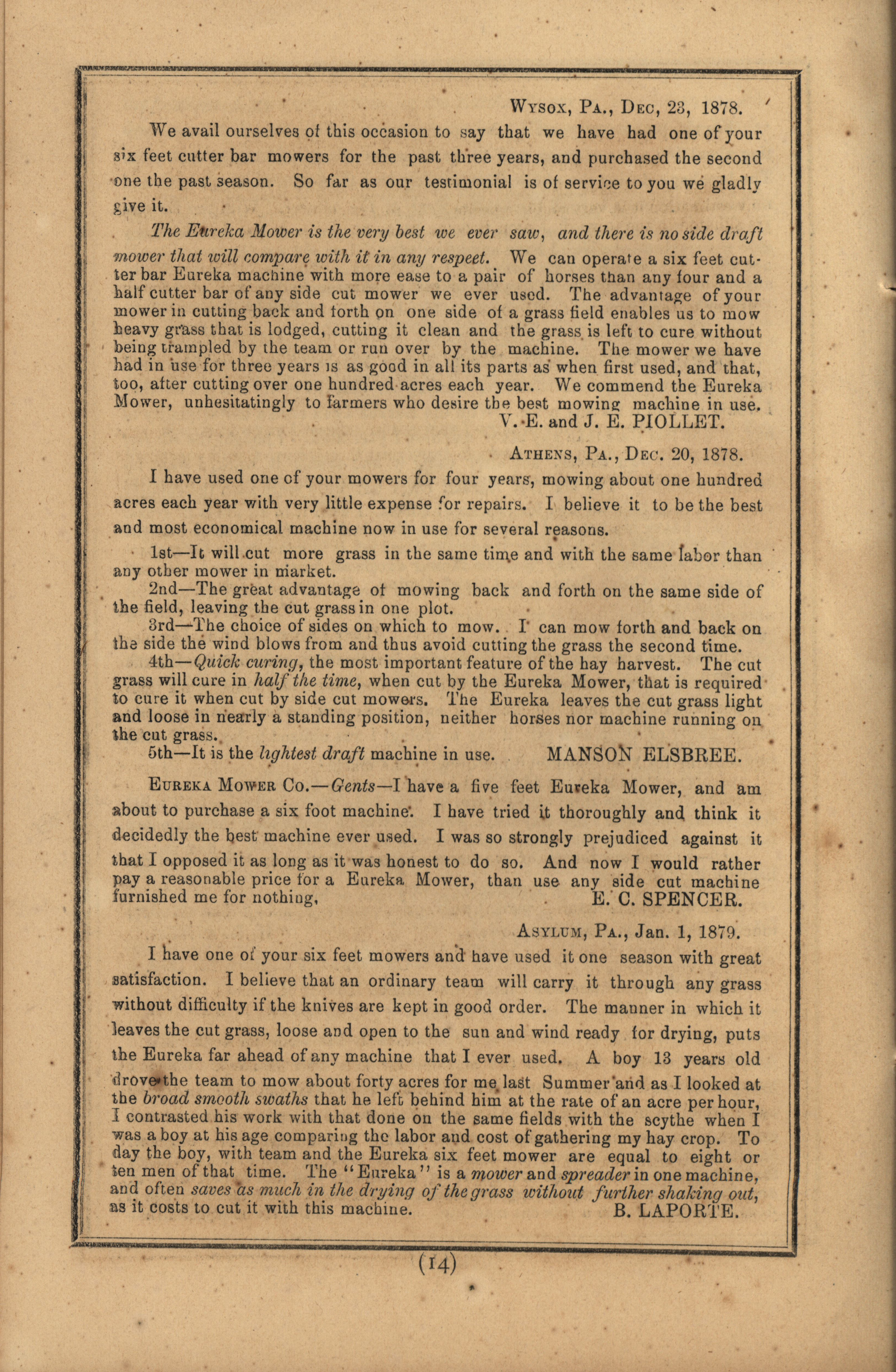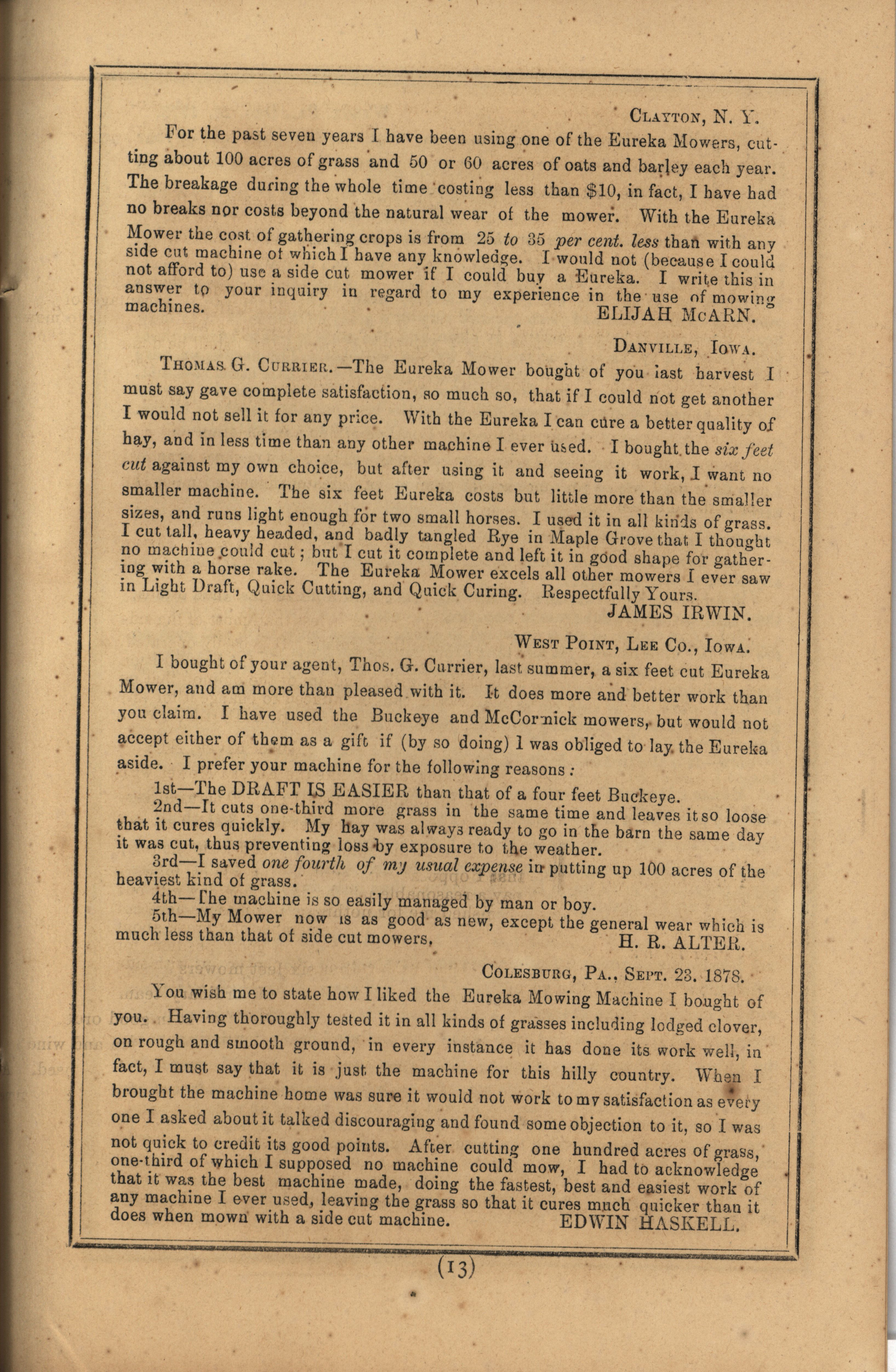 - "Eureka Mower Company 1879 catalog", Agricultural Machinery Literature Collection, Iowa State University Library Digital Collections