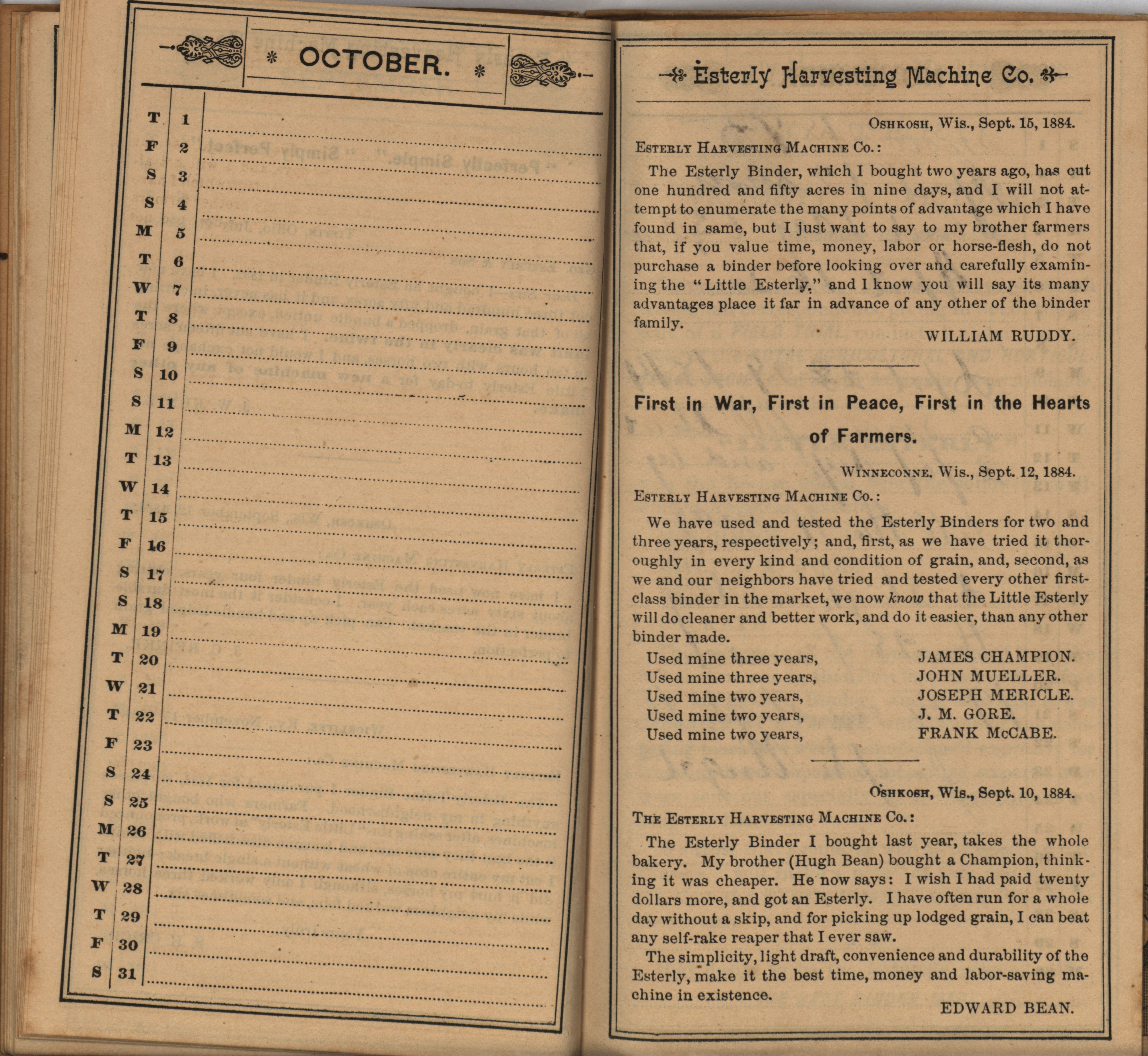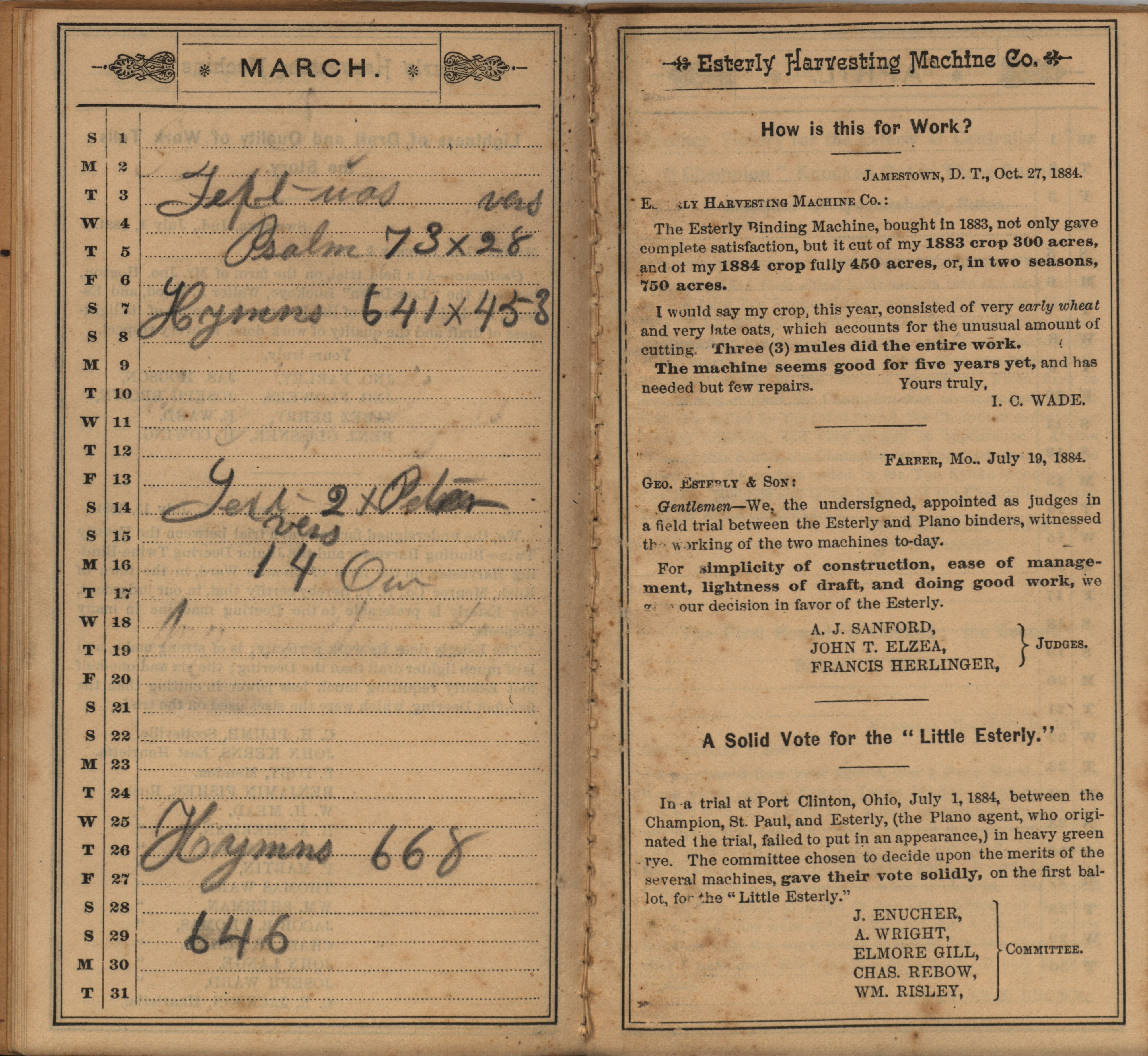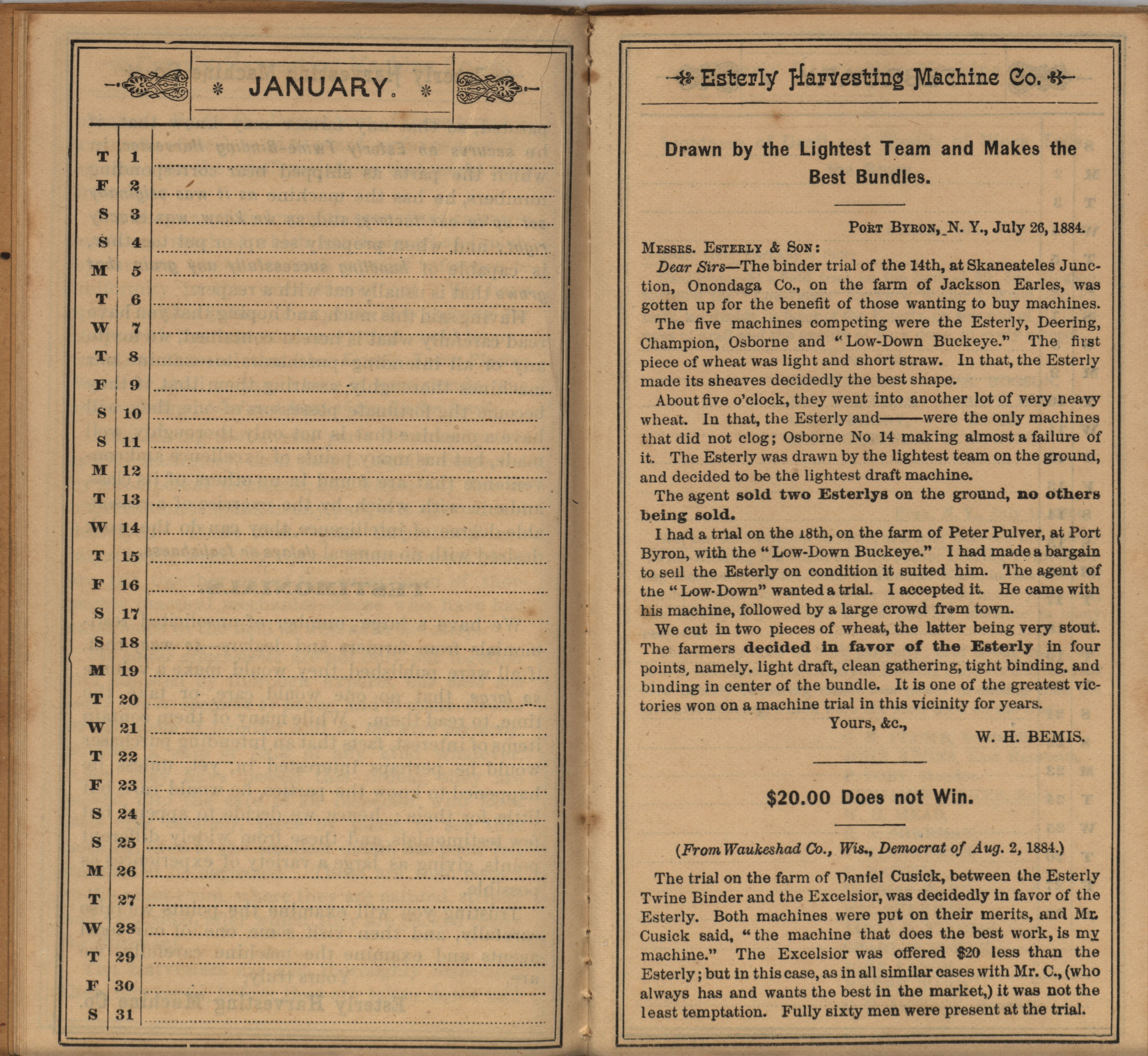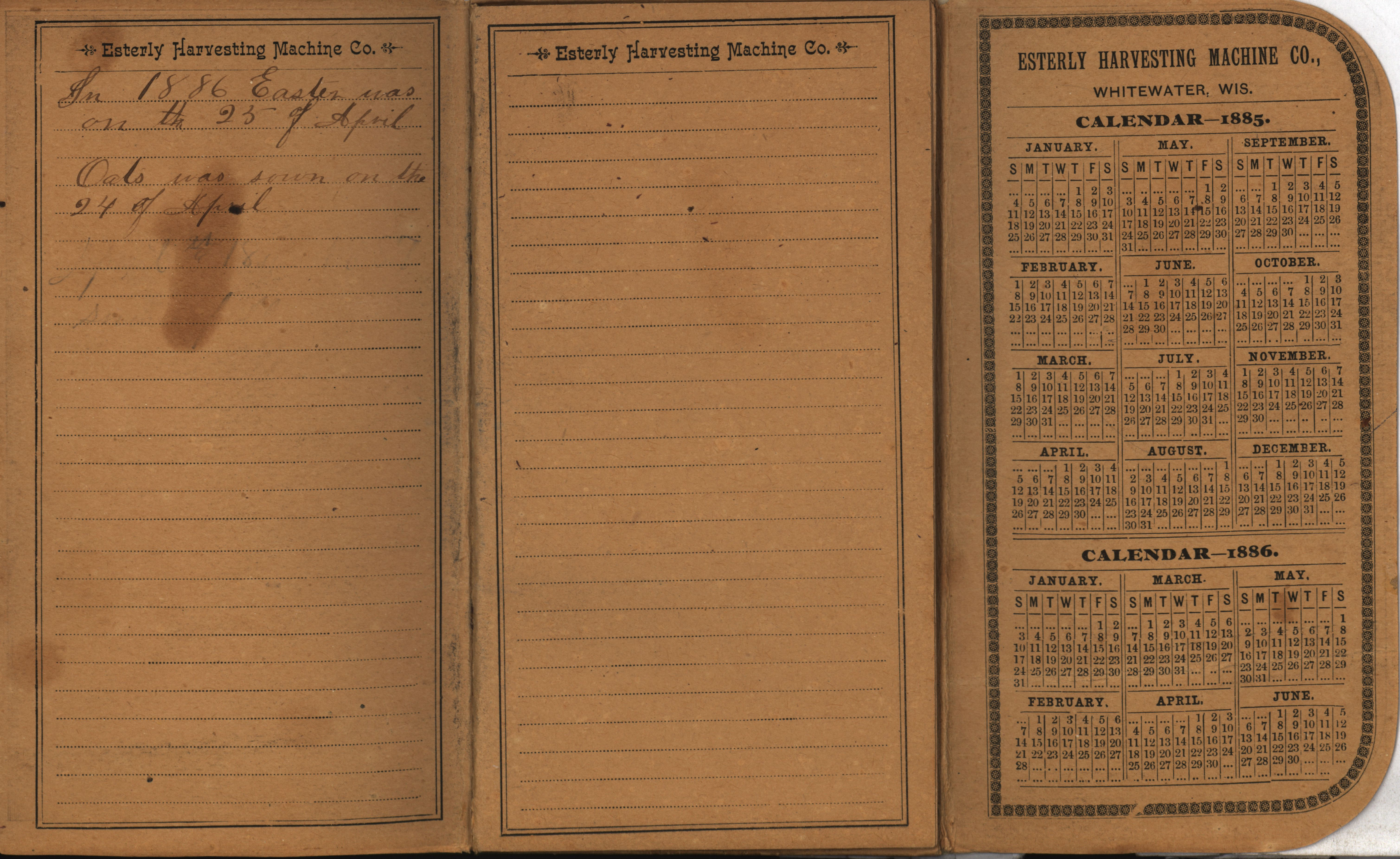 - Pocket book for Esterly Harvesting Machine Company from 1885 including calendar, advertisements and notebook pages.