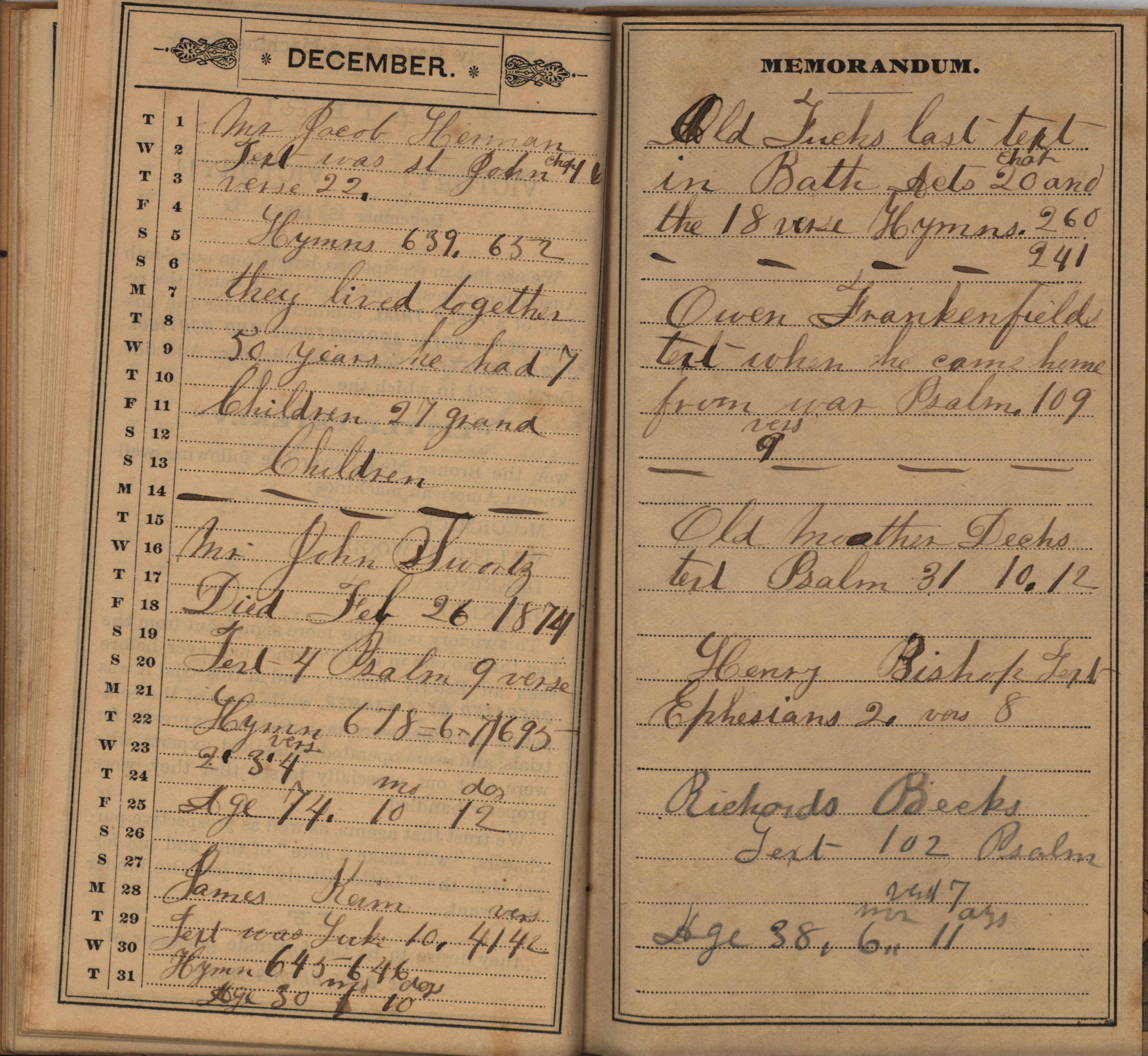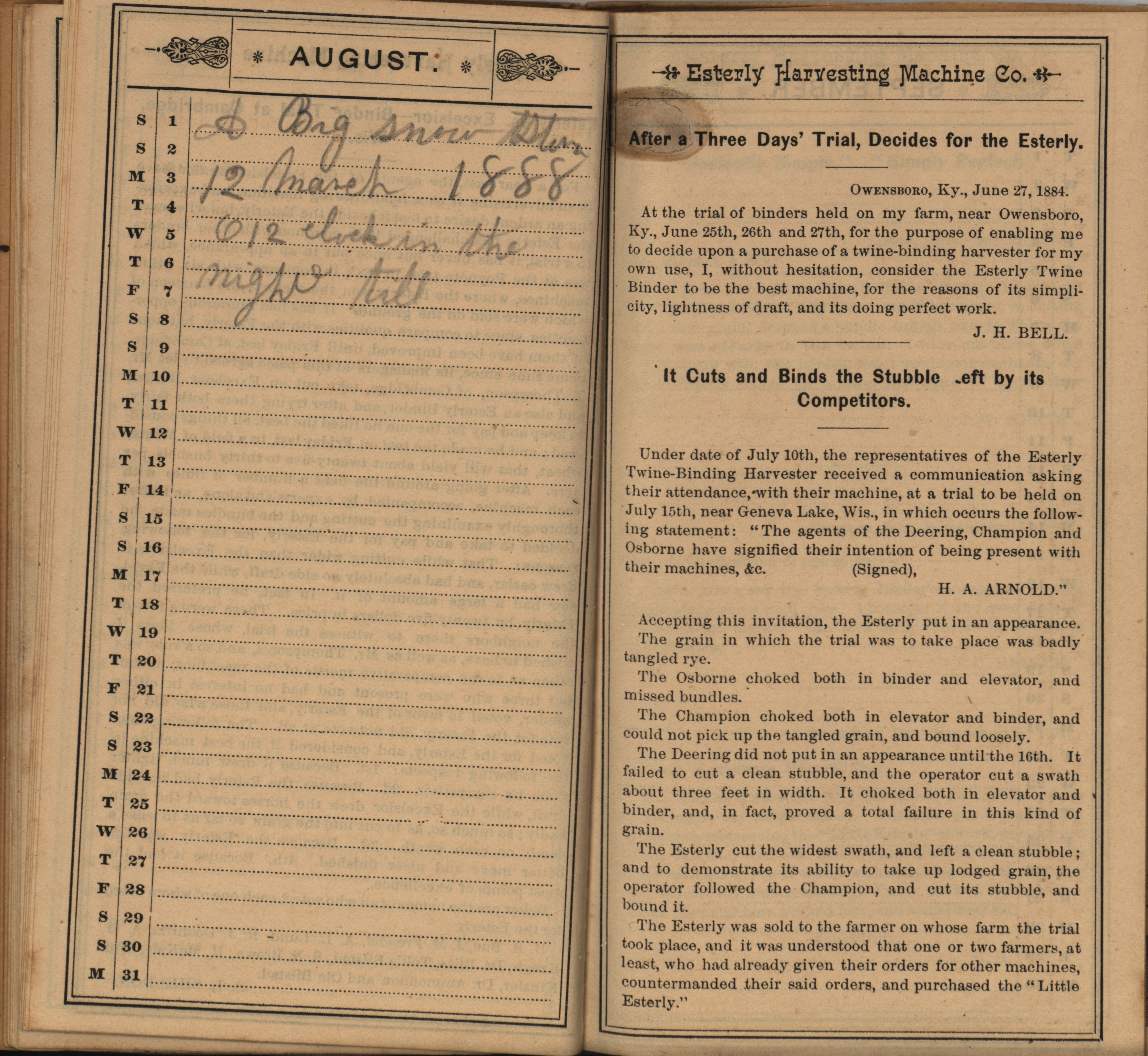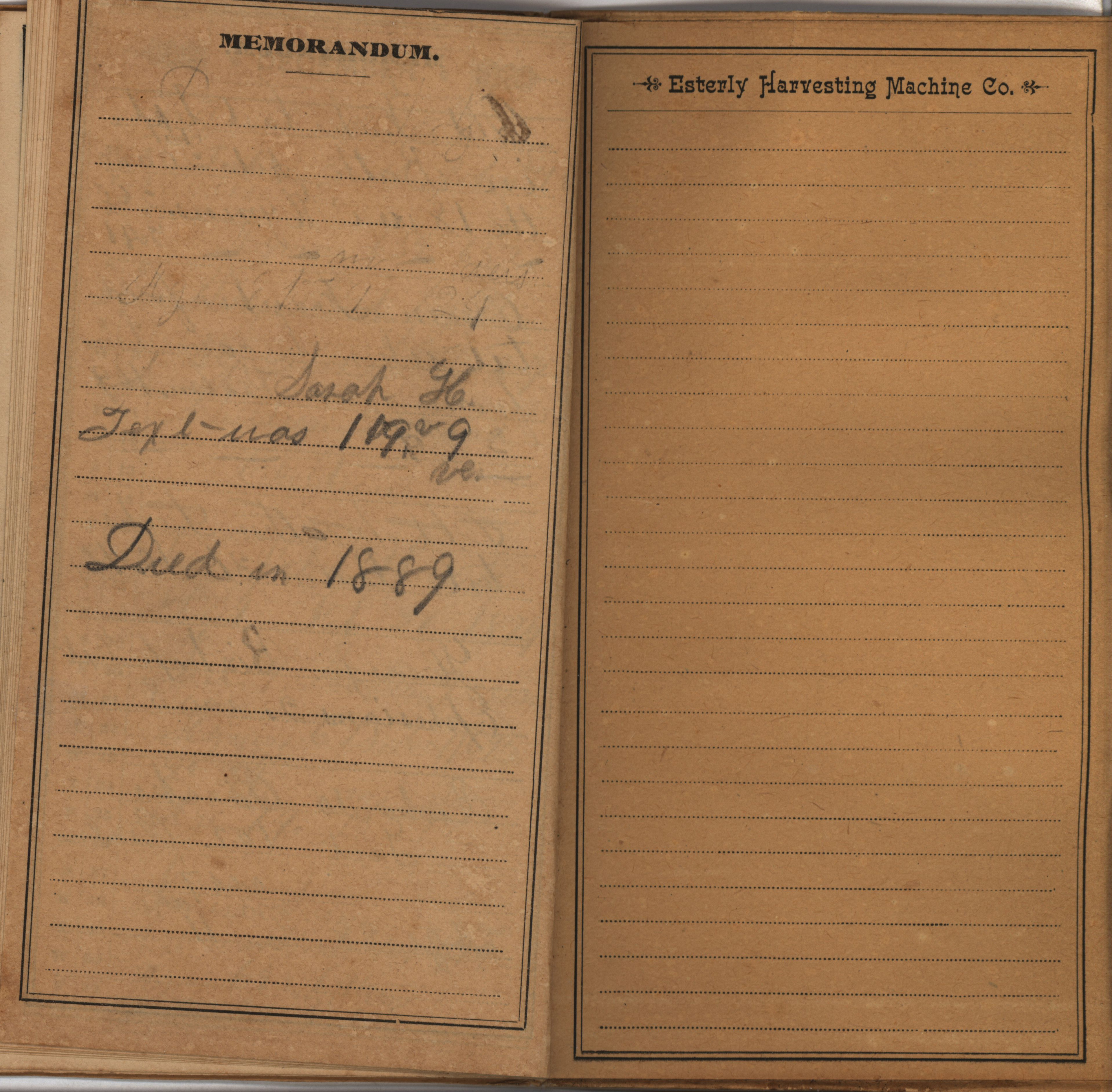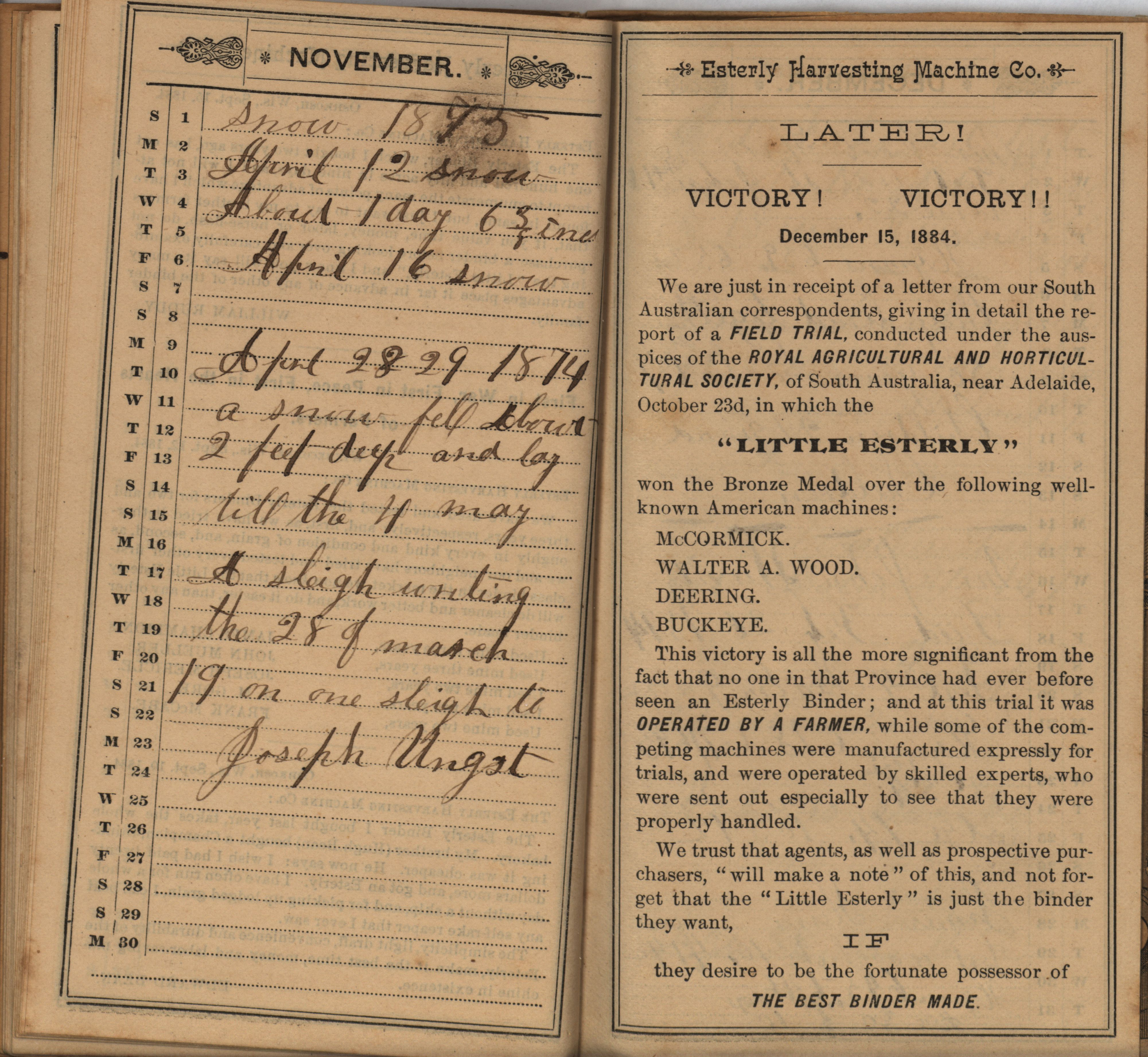 - Pocket book for Esterly Harvesting Machine Company from 1885 including calendar, advertisements and notebook pages.