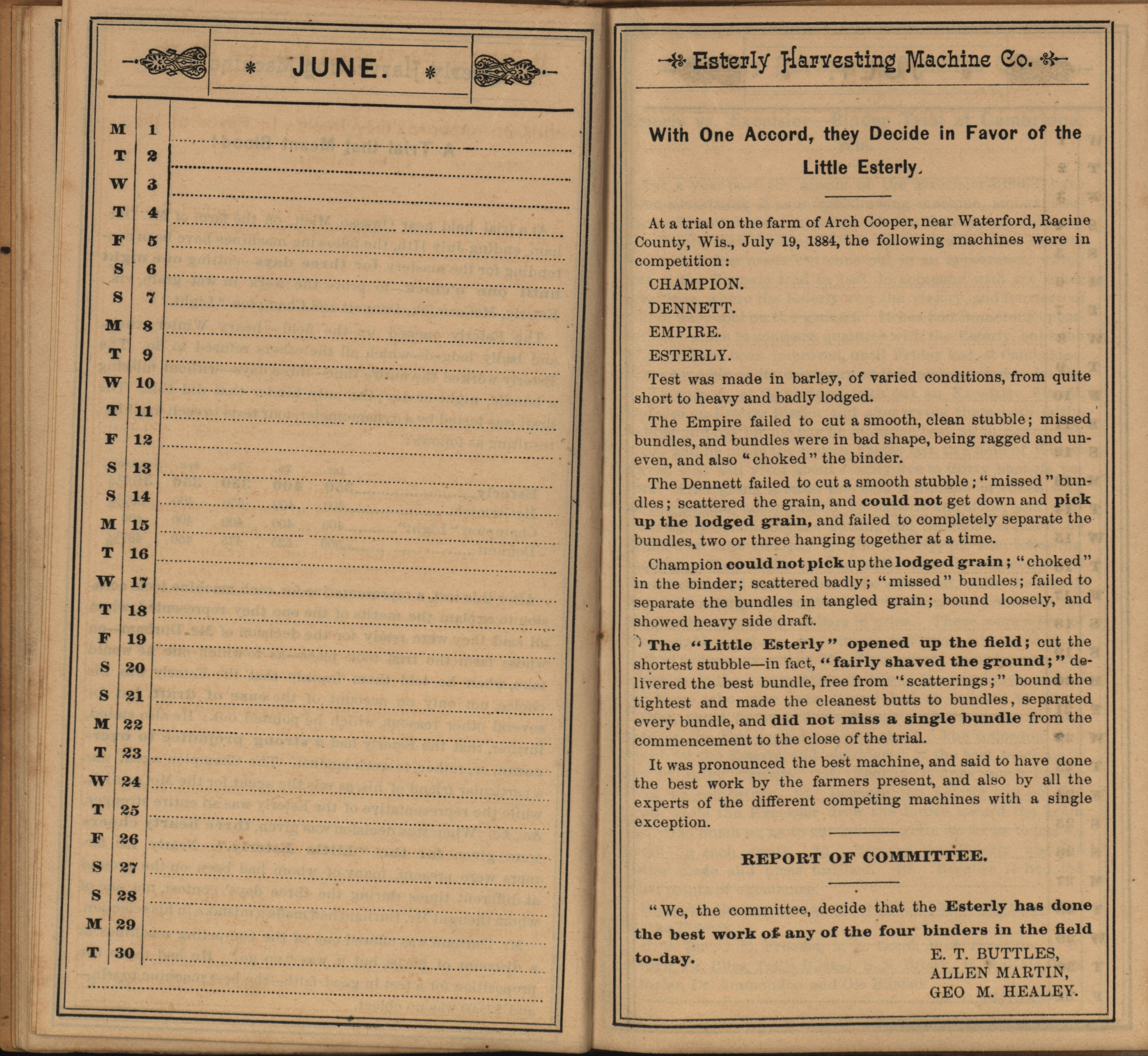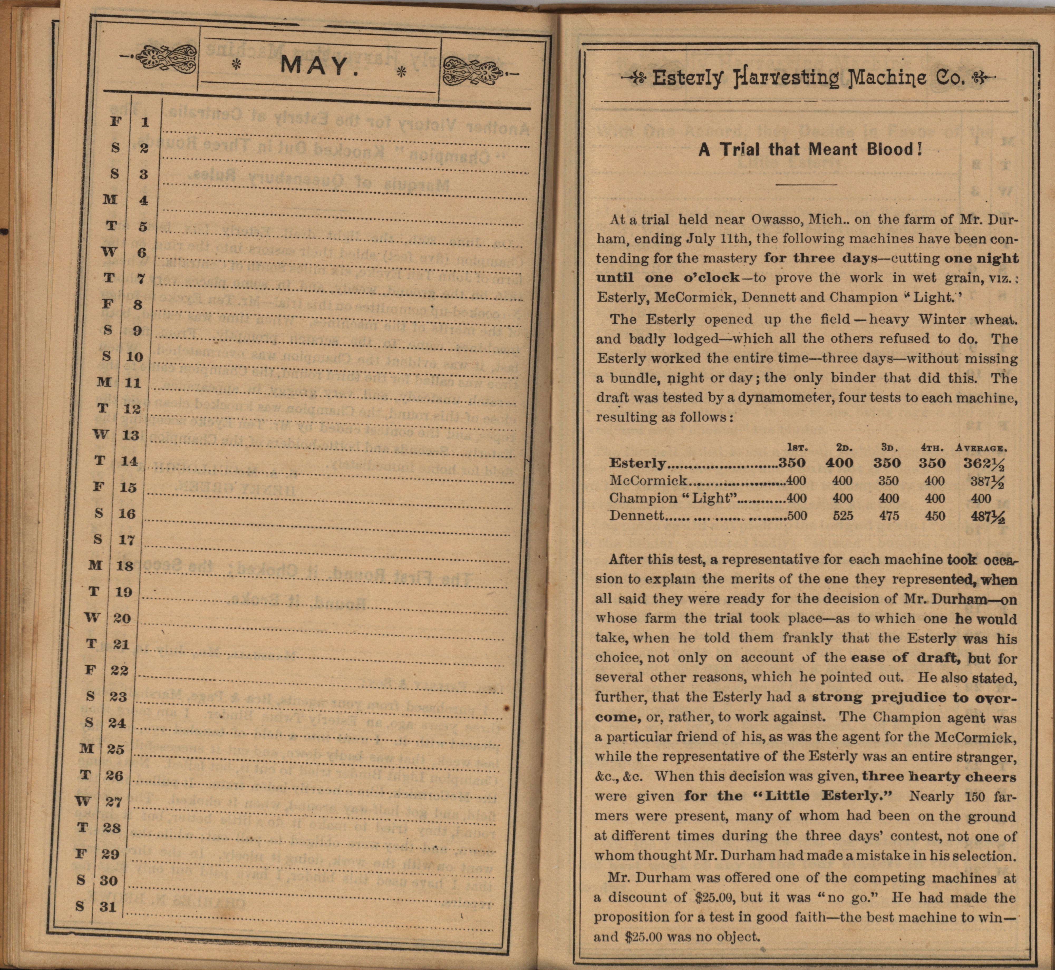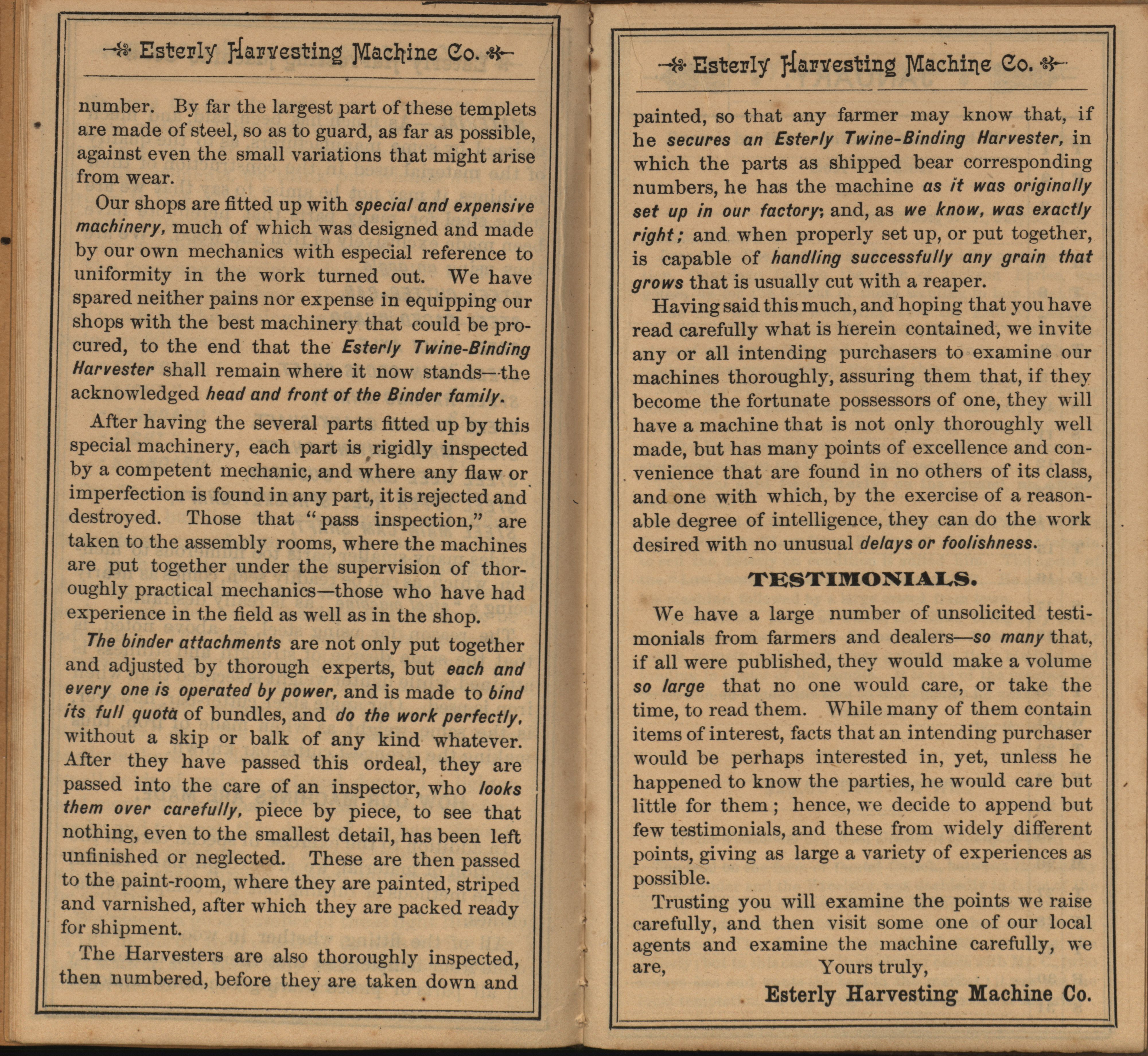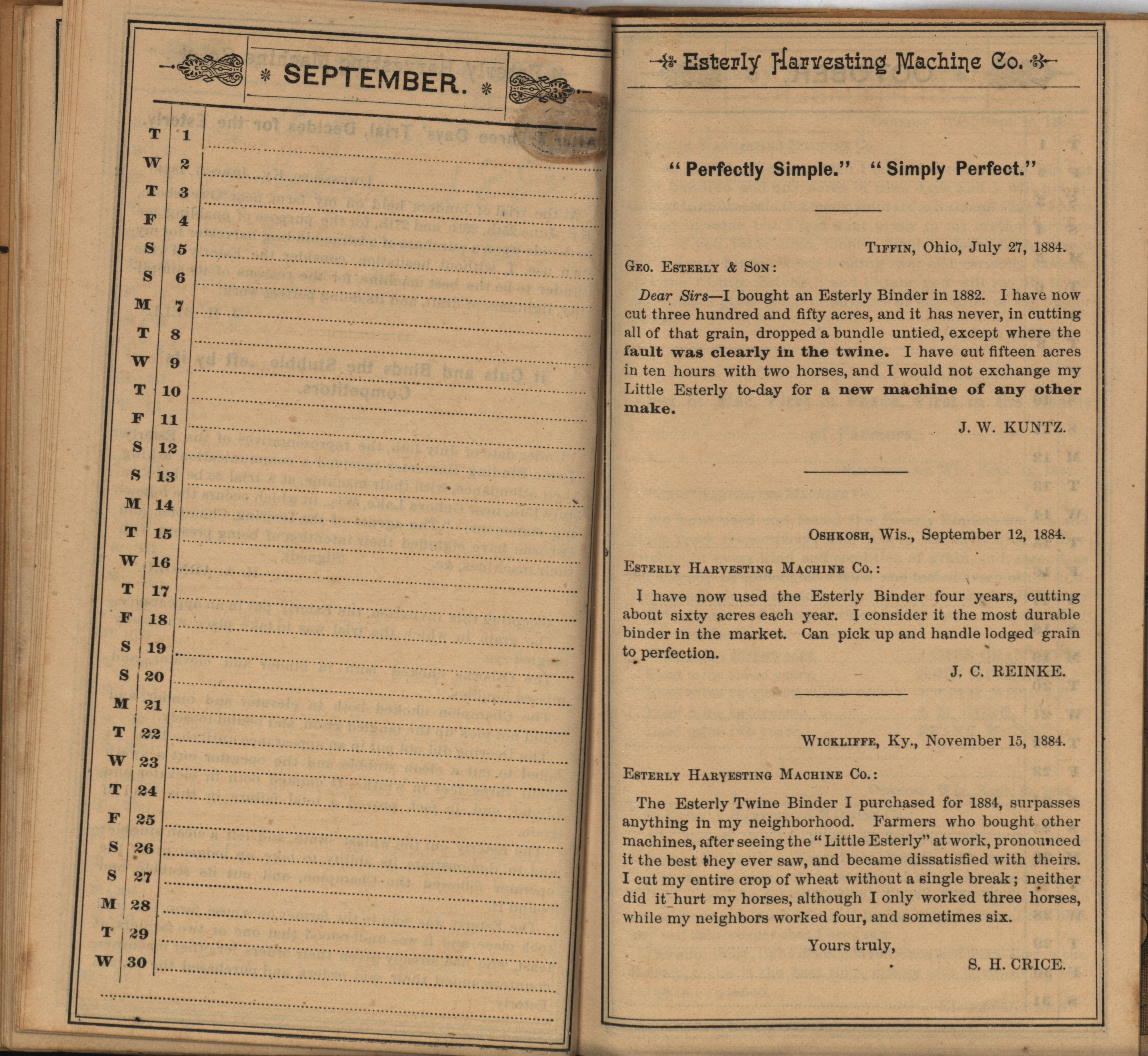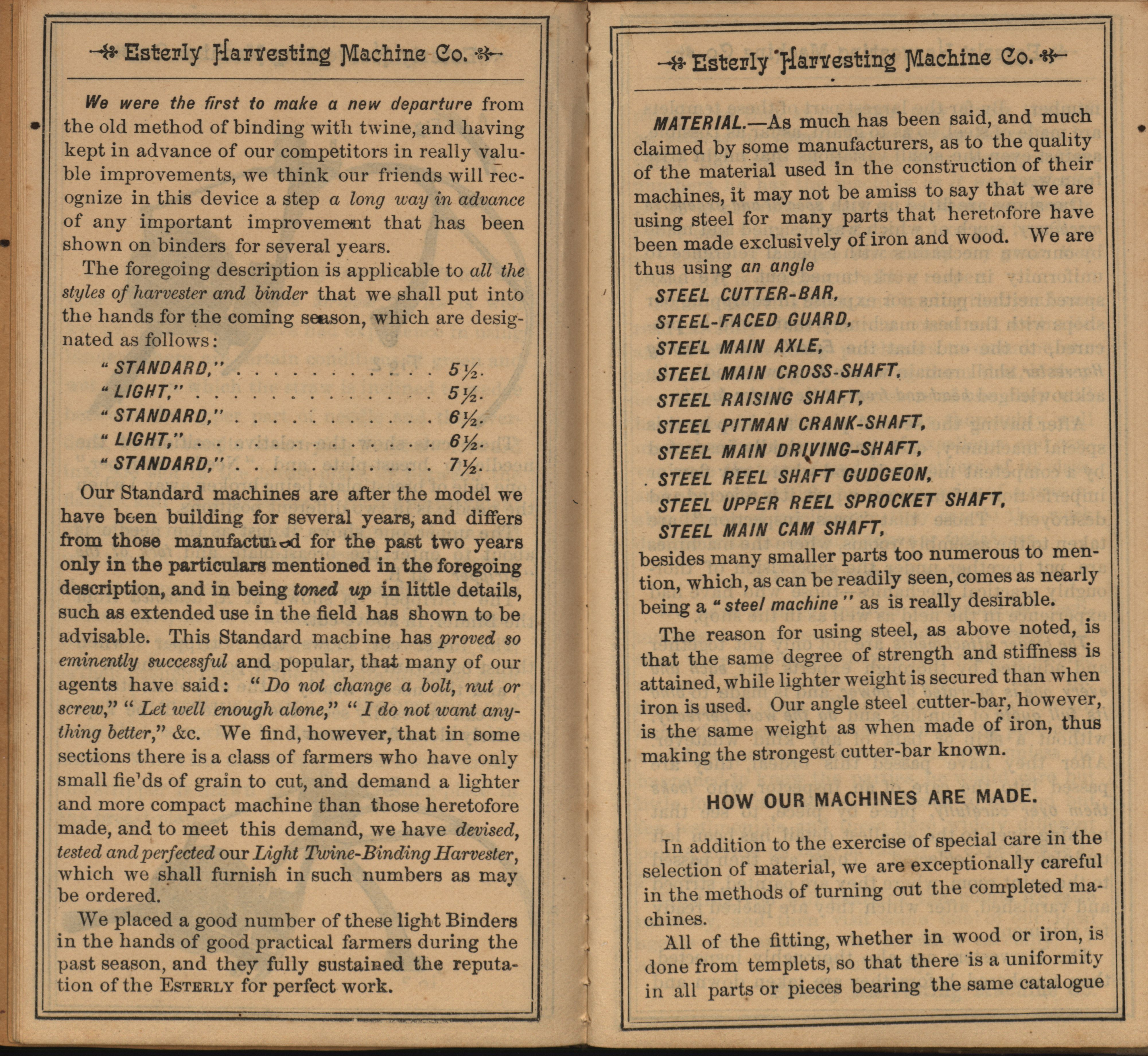 - "Esterly Harvesting Machine Company pocket diary and pamphlet", Agricultural Machinery Literature Collection, Iowa State University Library Digital Collections