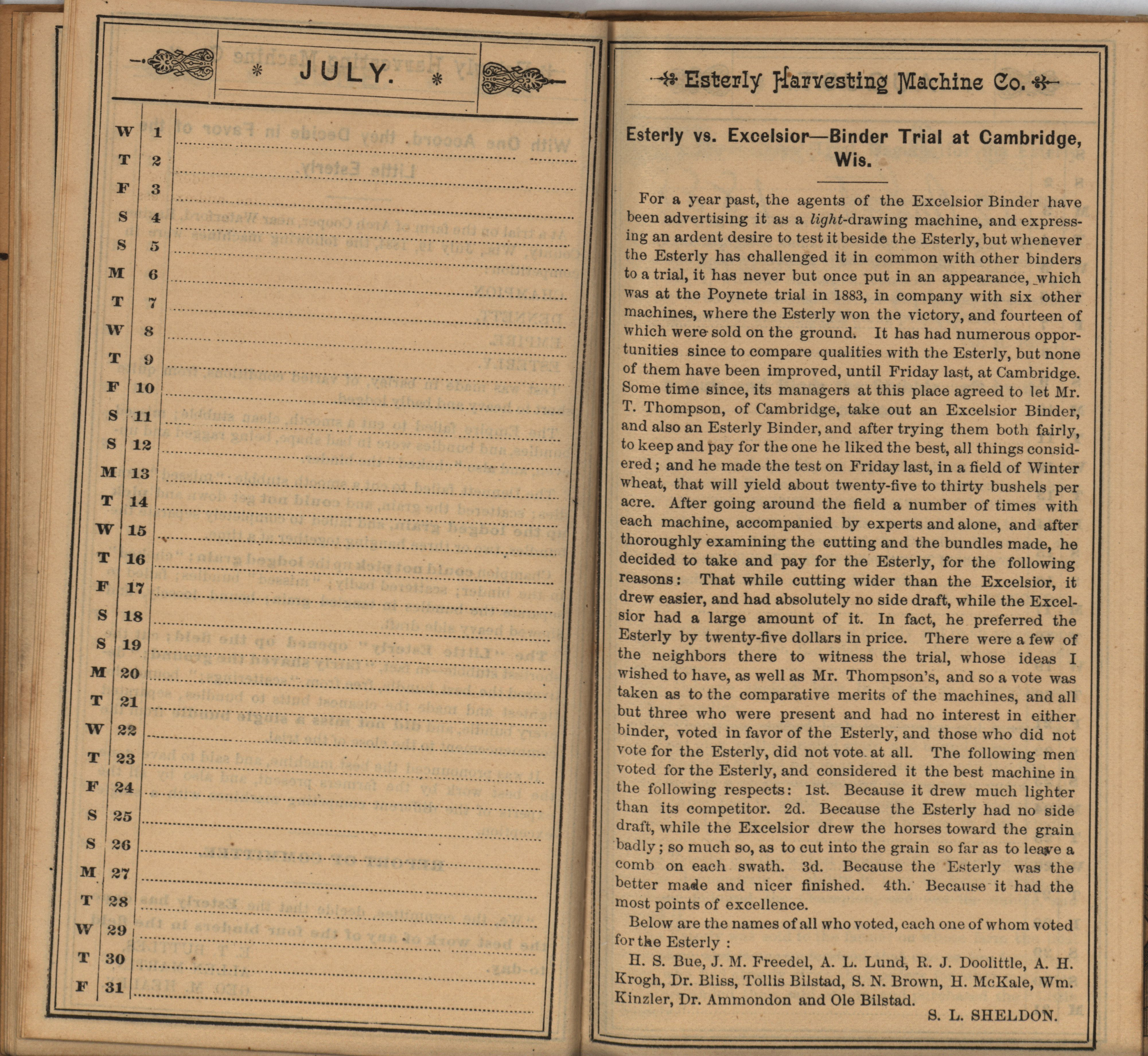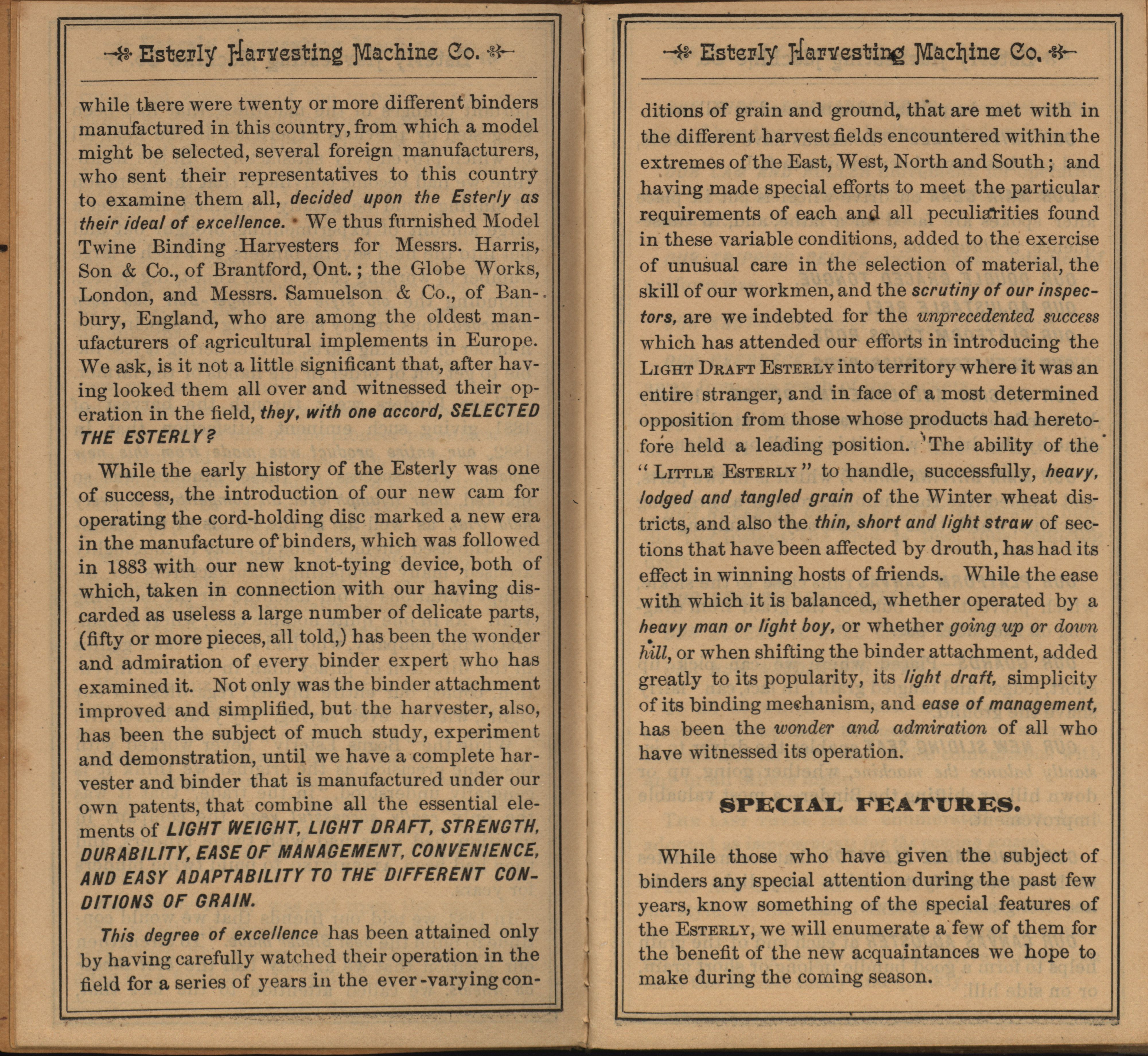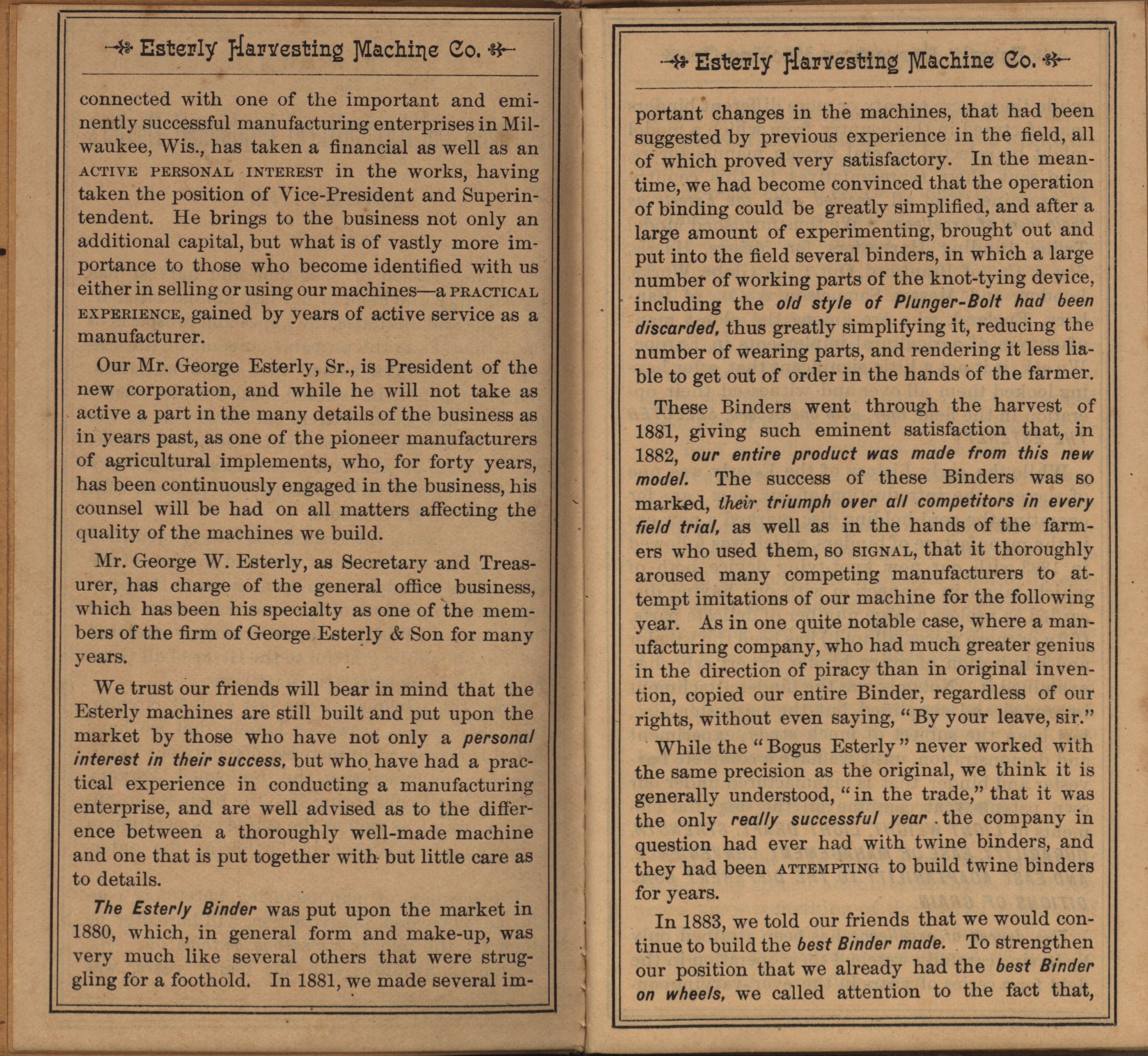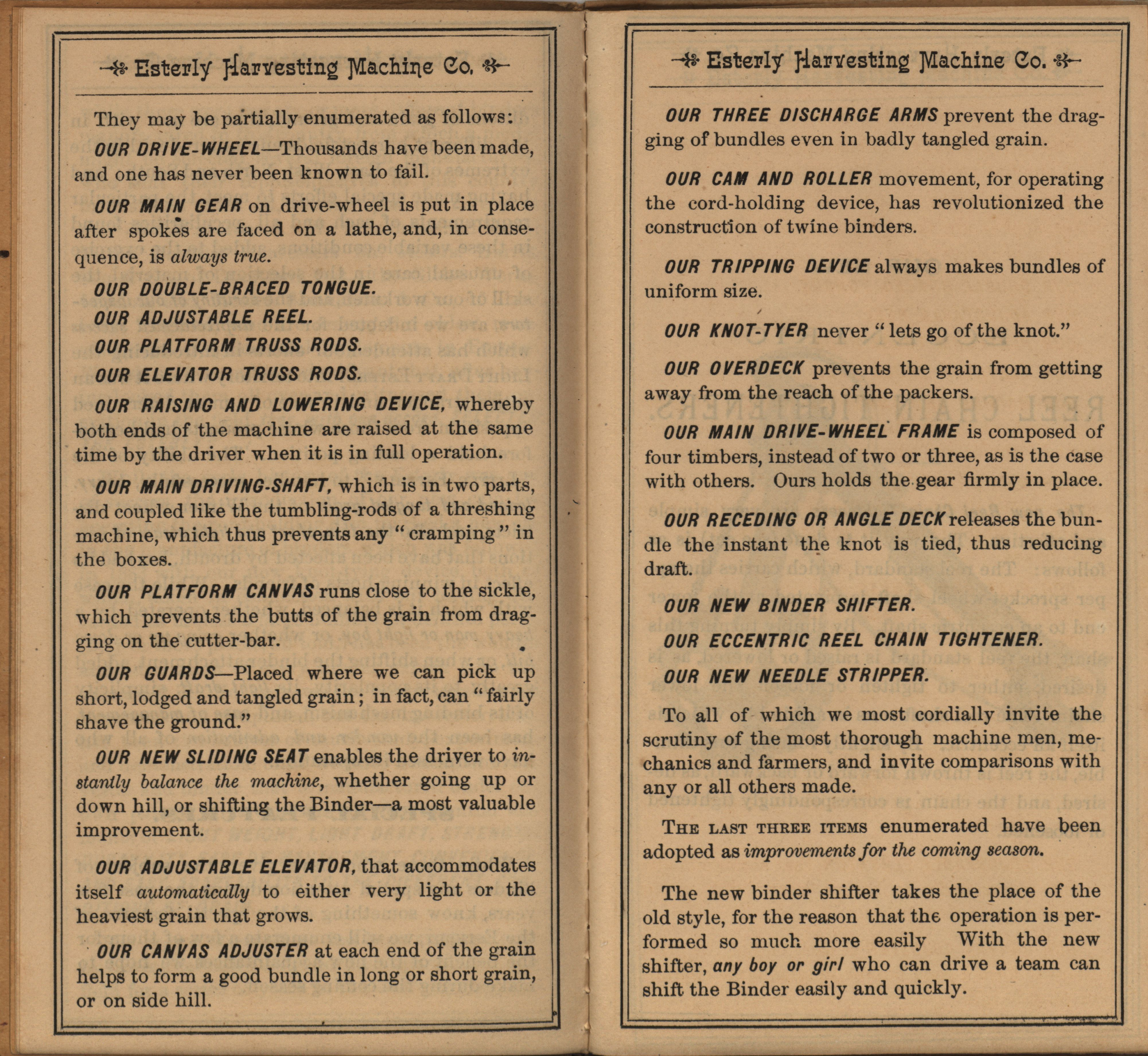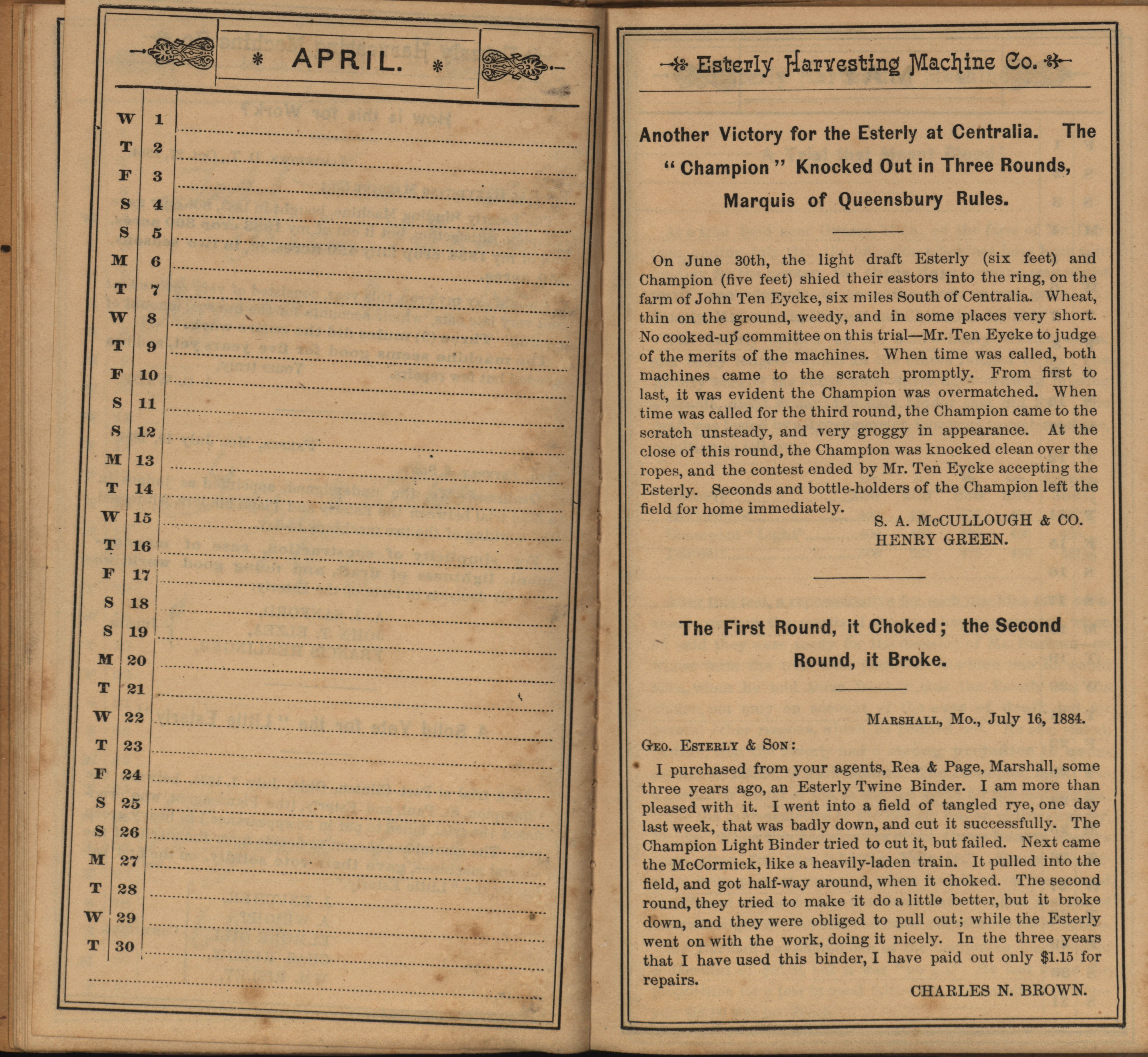 - "Esterly Harvesting Machine Company pocket diary and pamphlet", Agricultural Machinery Literature Collection, Iowa State University Library Digital Collections