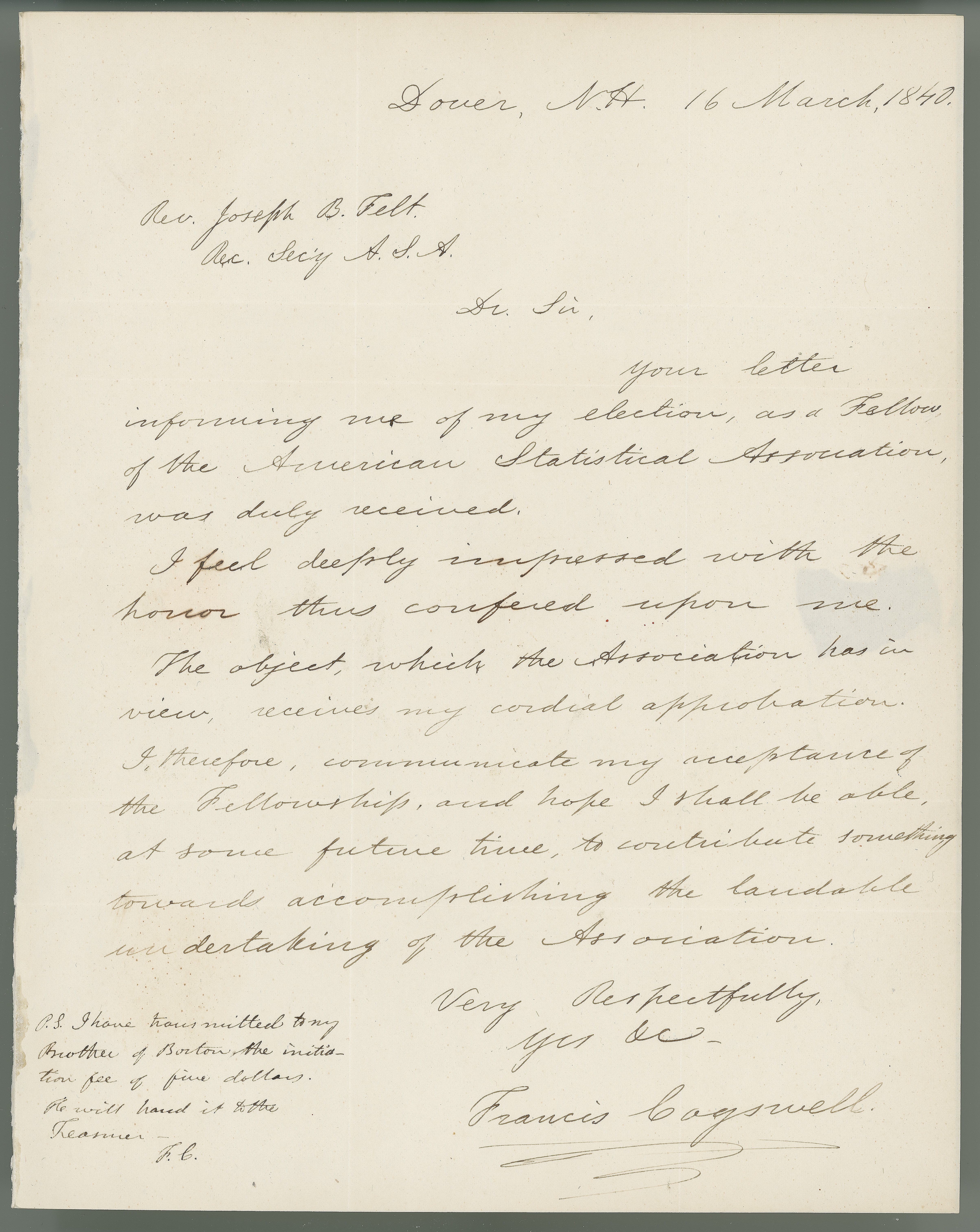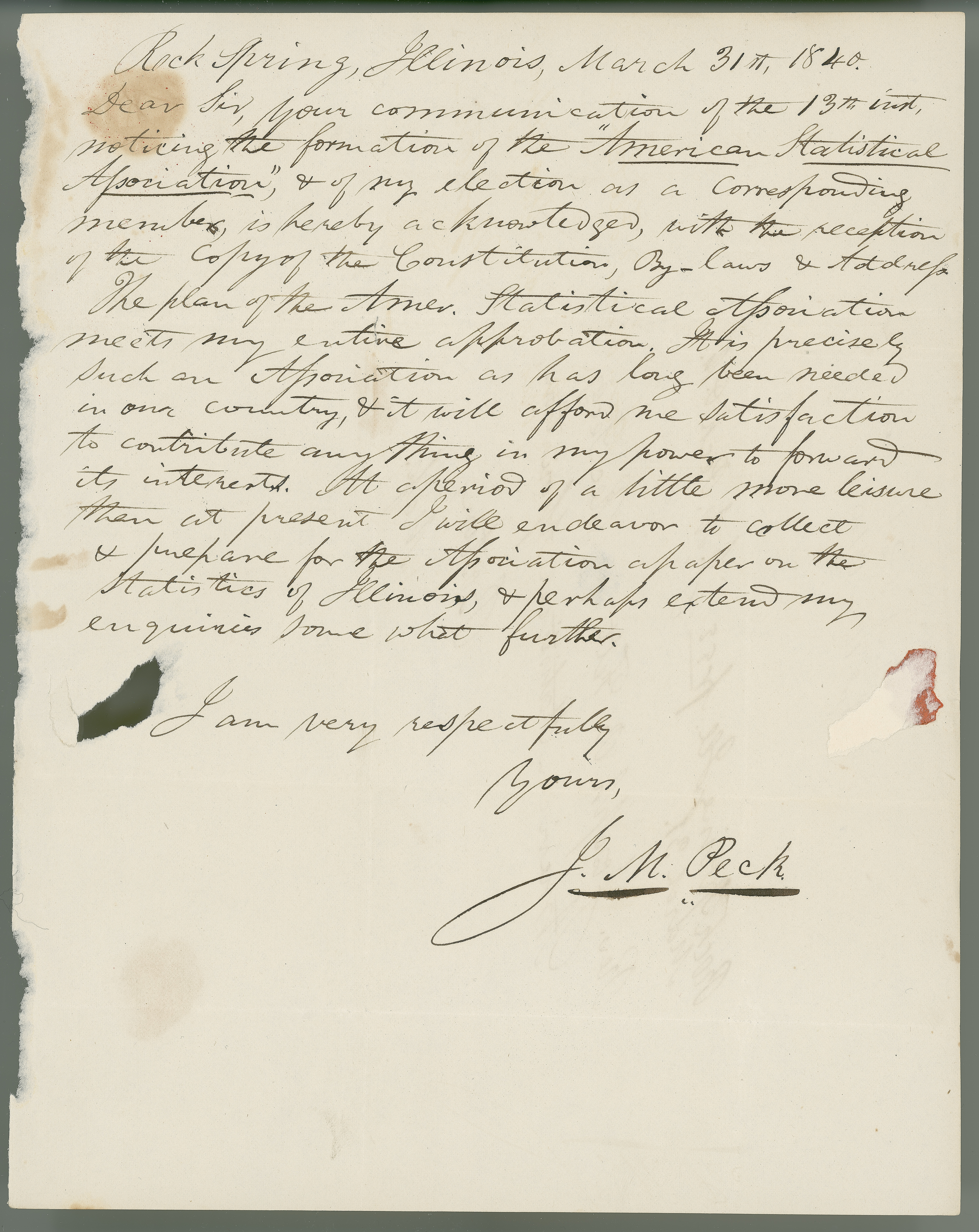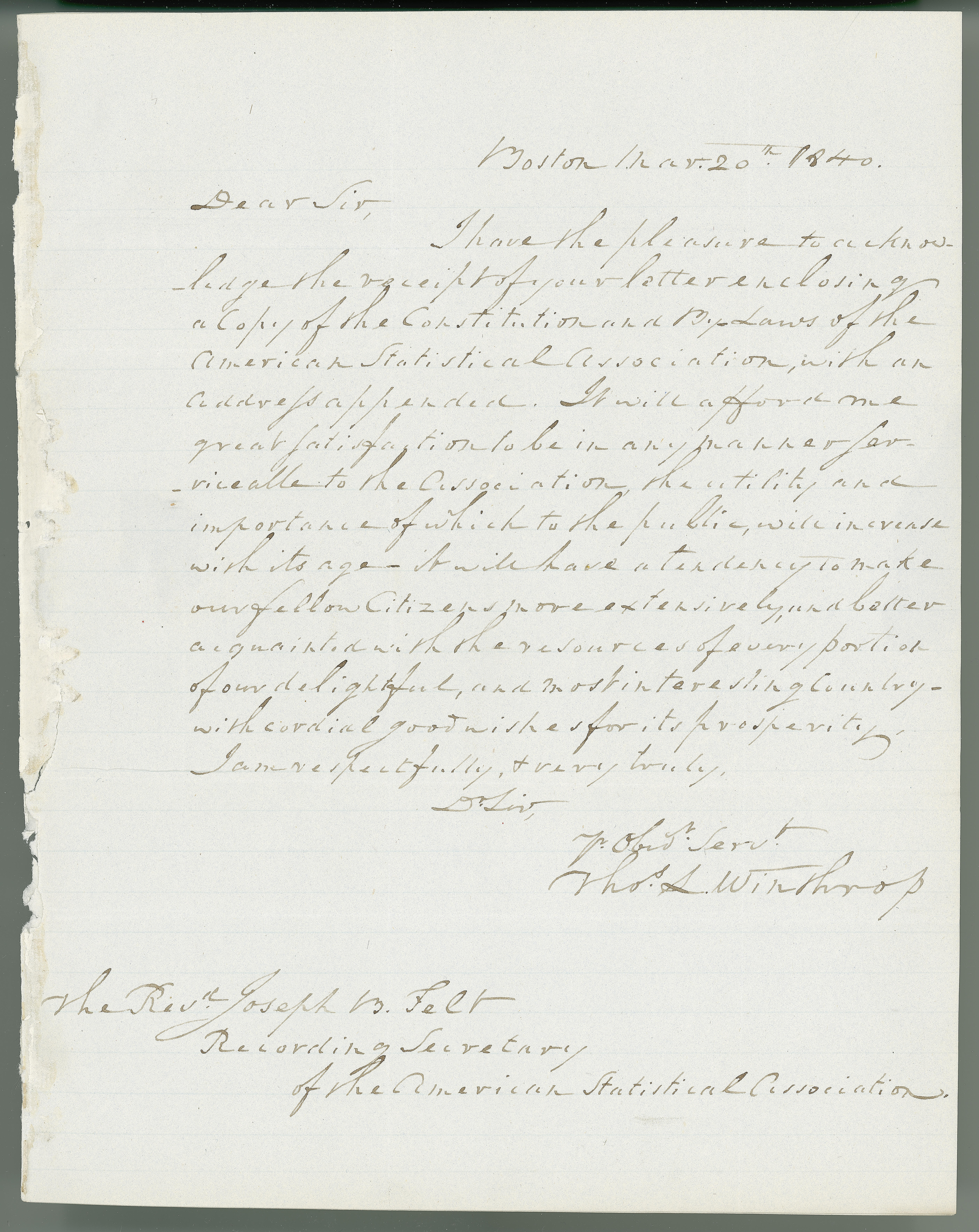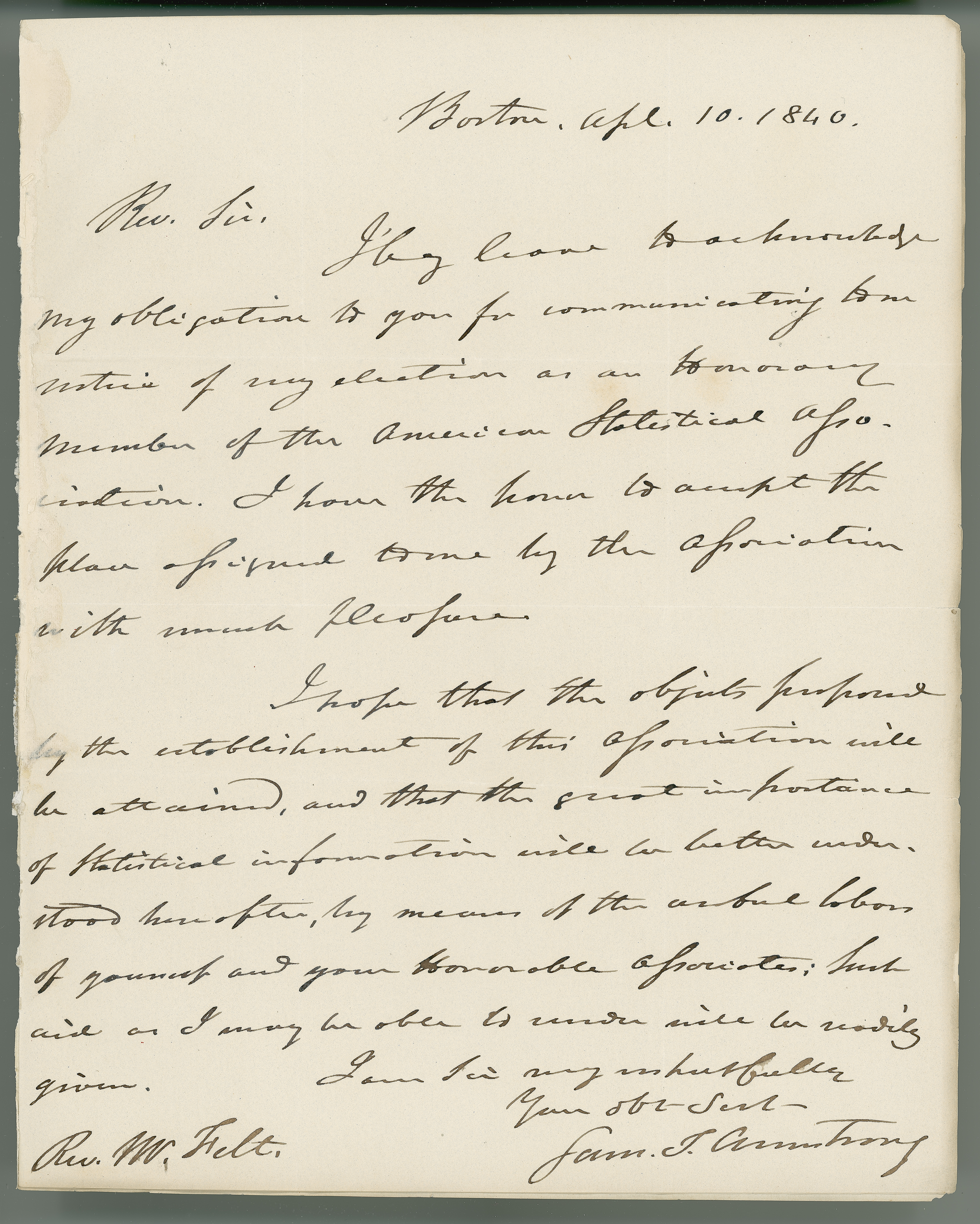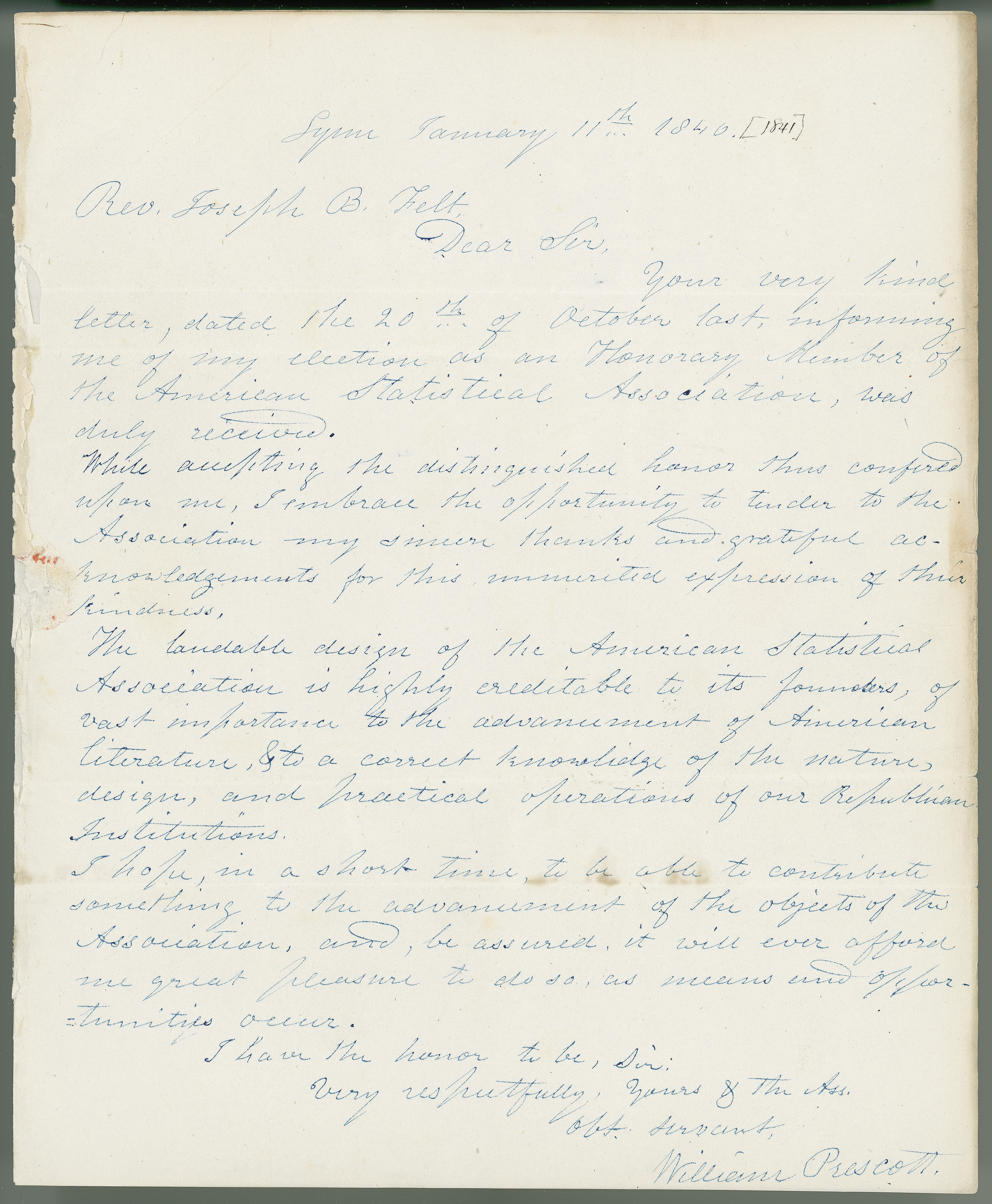- This collection of letters (1840-1844) contains the initial responses for those invited to join the recently inaugurated American Statistical Association. The respondents include well-known statisticians such as Edward Jarvis, Francis Lieber, J.M. Peck, and William Prescott. The initial letter, written by ASA Secretary Joseph B. Felt, was sent (along with the constitution and by-laws) to nominated individuals after the ASA organizing meeting held in November 1839. These letters were used in an exhibit for the ASA Sesquicentennial in 1989.