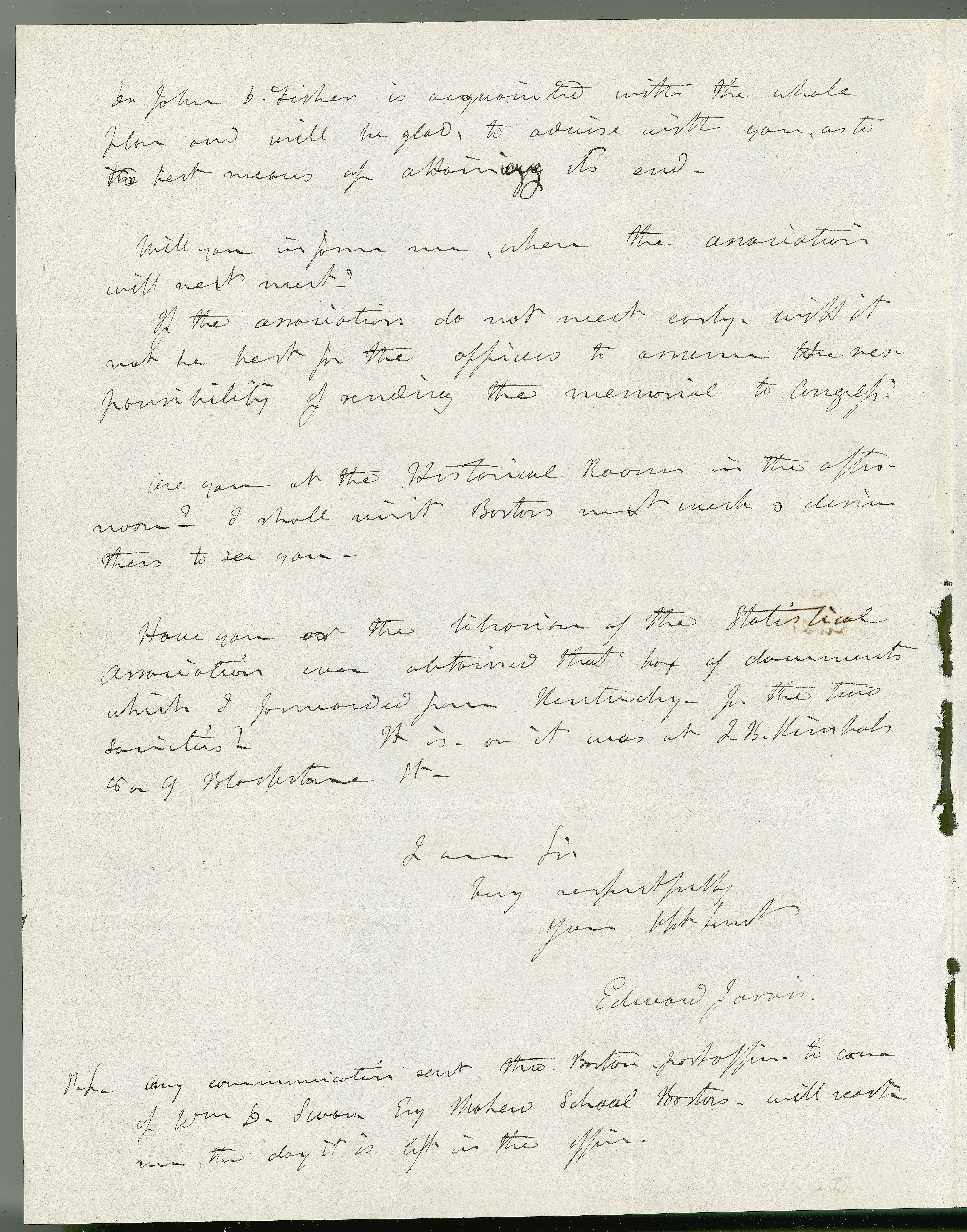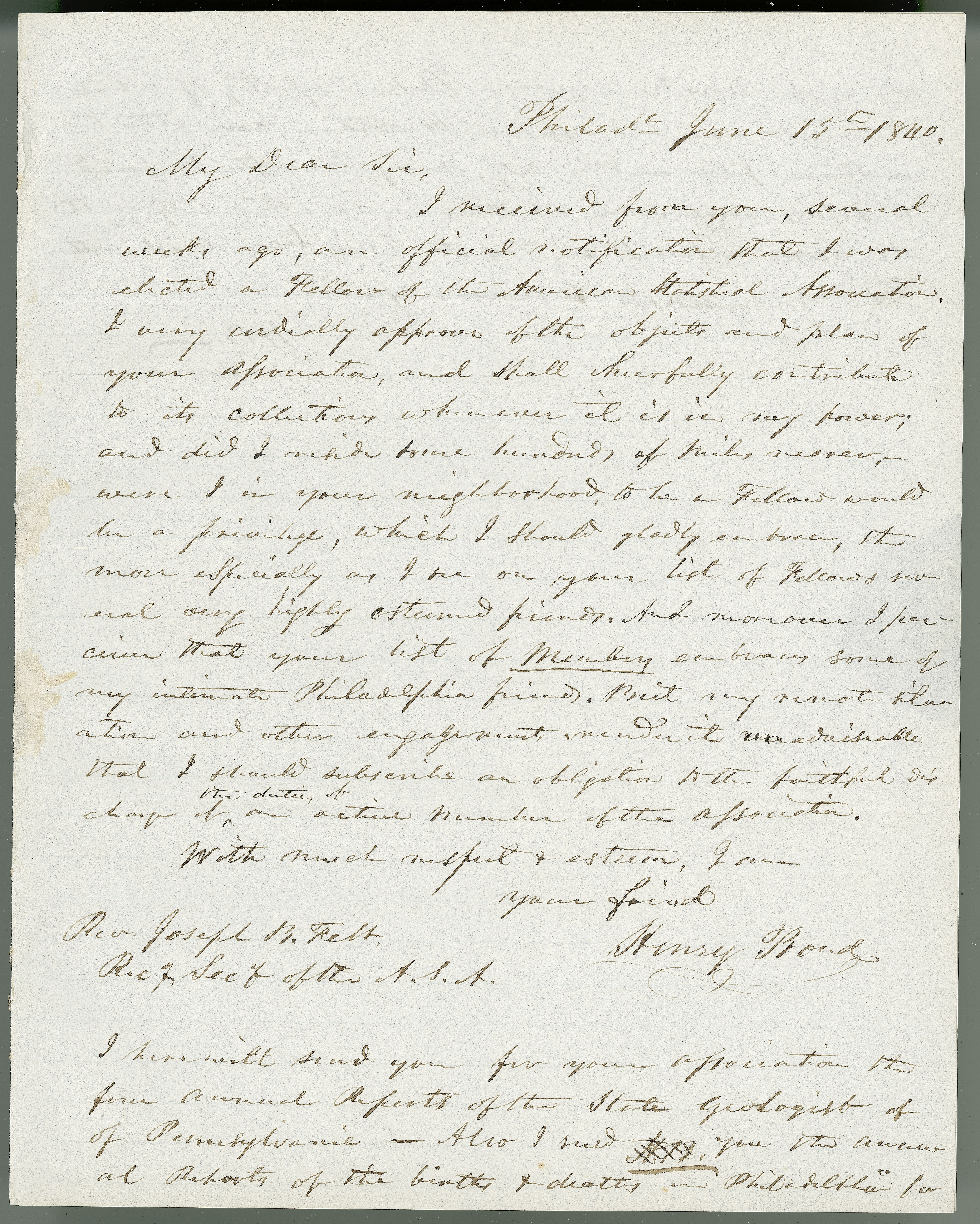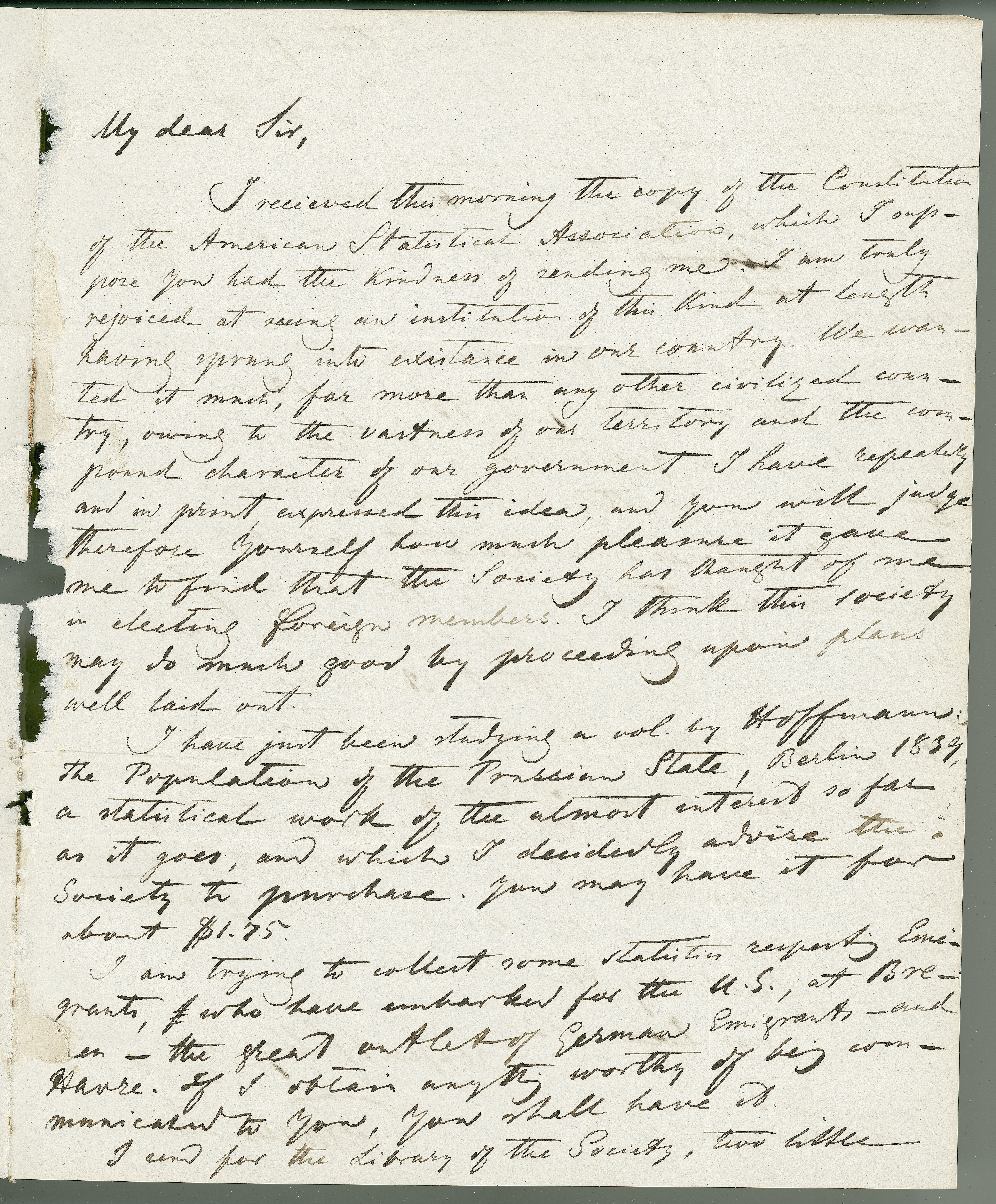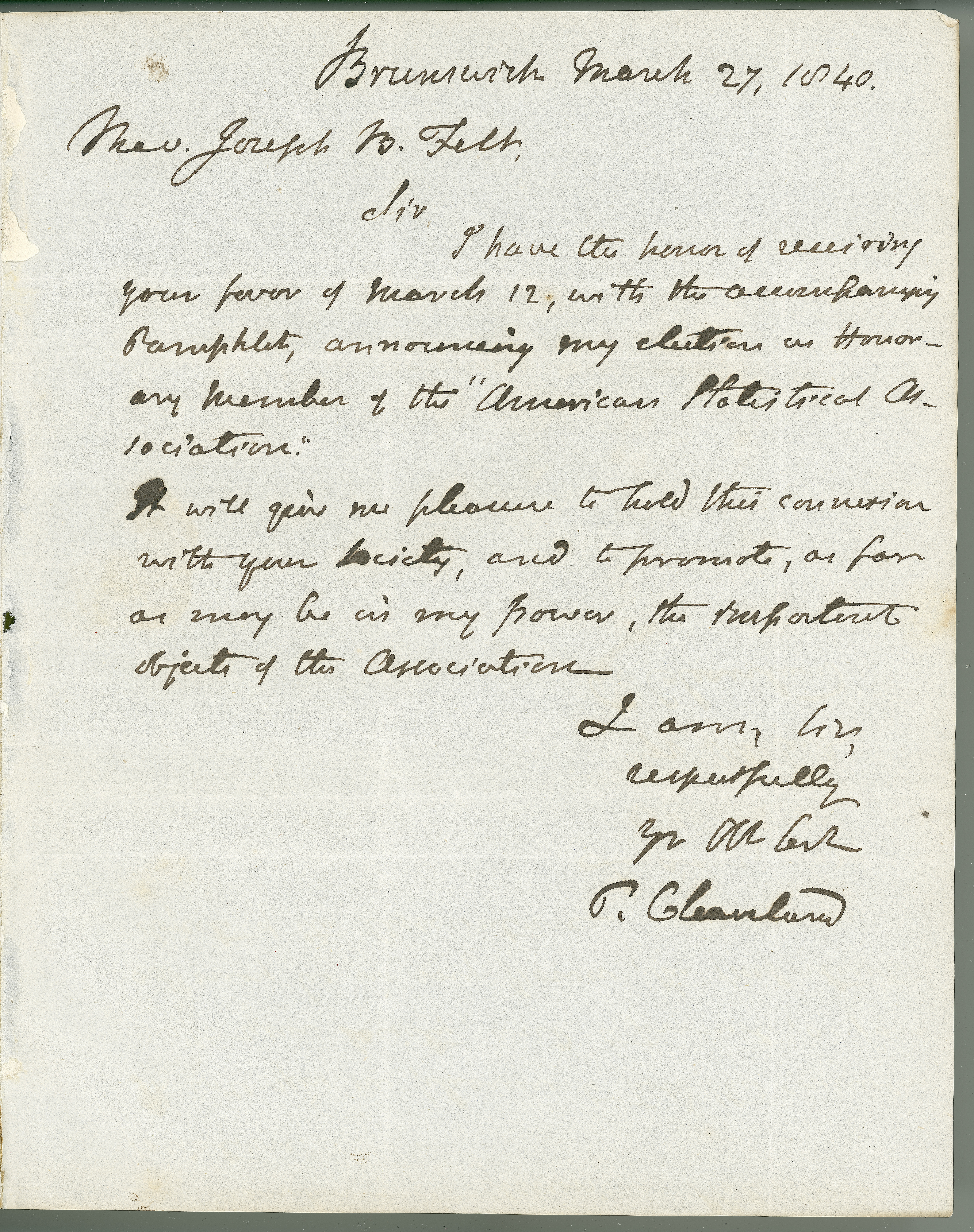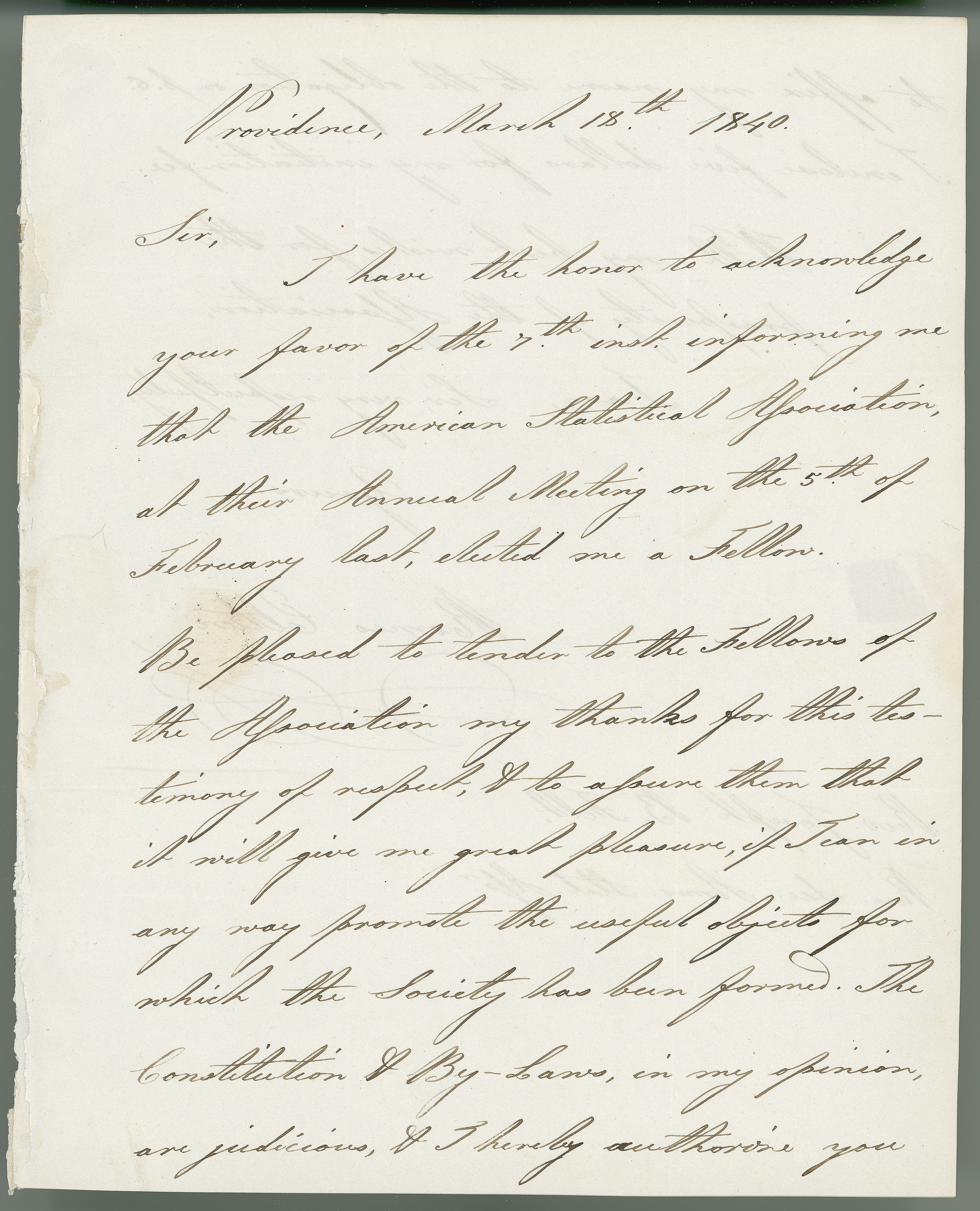 - This collection of letters (1840-1844) contains the initial responses for those invited to join the recently inaugurated American Statistical Association. The respondents include well-known statisticians such as Edward Jarvis, Francis Lieber, J.M. Peck, and William Prescott. The initial letter, written by ASA Secretary Joseph B. Felt, was sent (along with the constitution and by-laws) to nominated individuals after the ASA organizing meeting held in November 1839. These letters were used in an exhibit for the ASA Sesquicentennial in 1989.