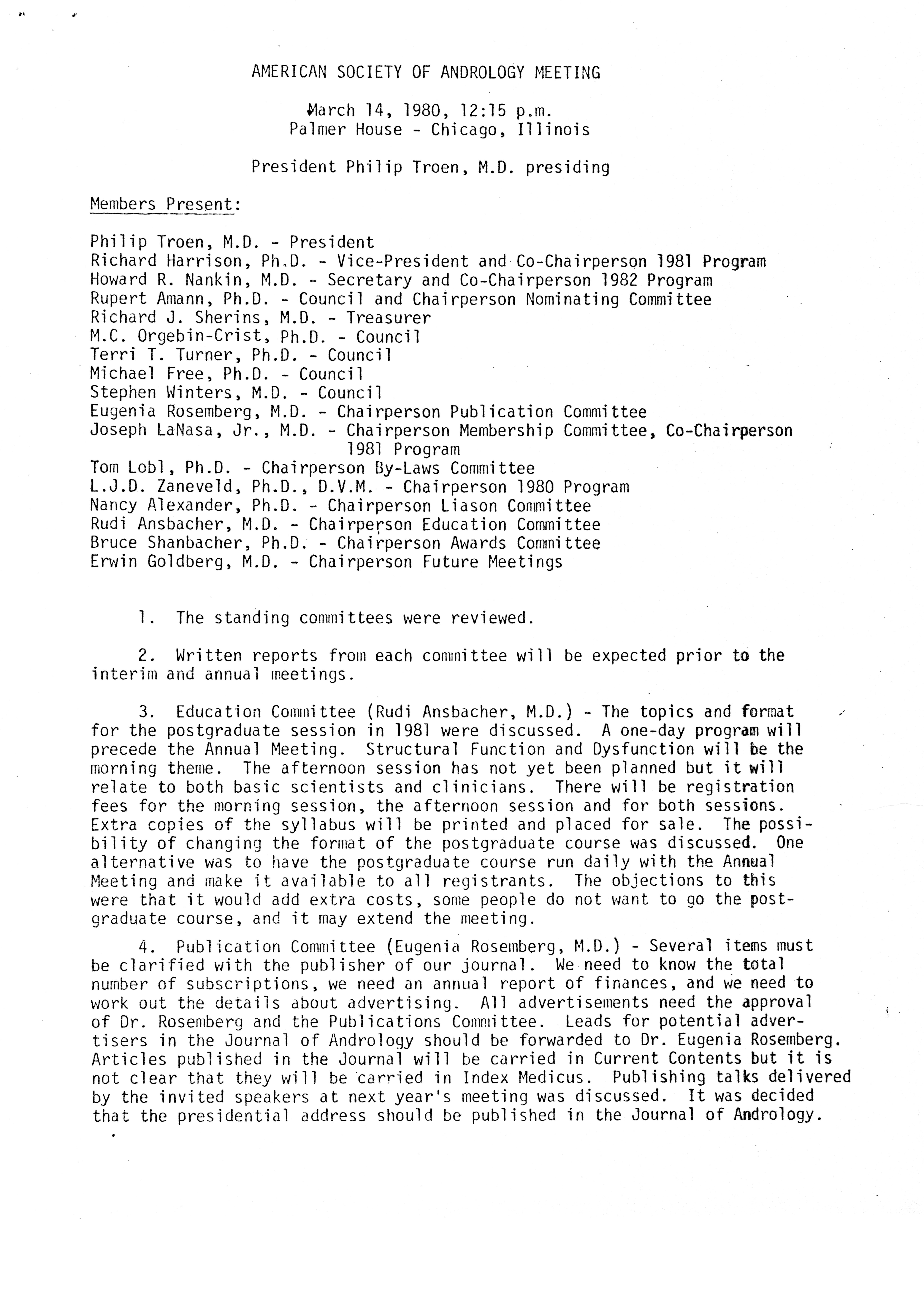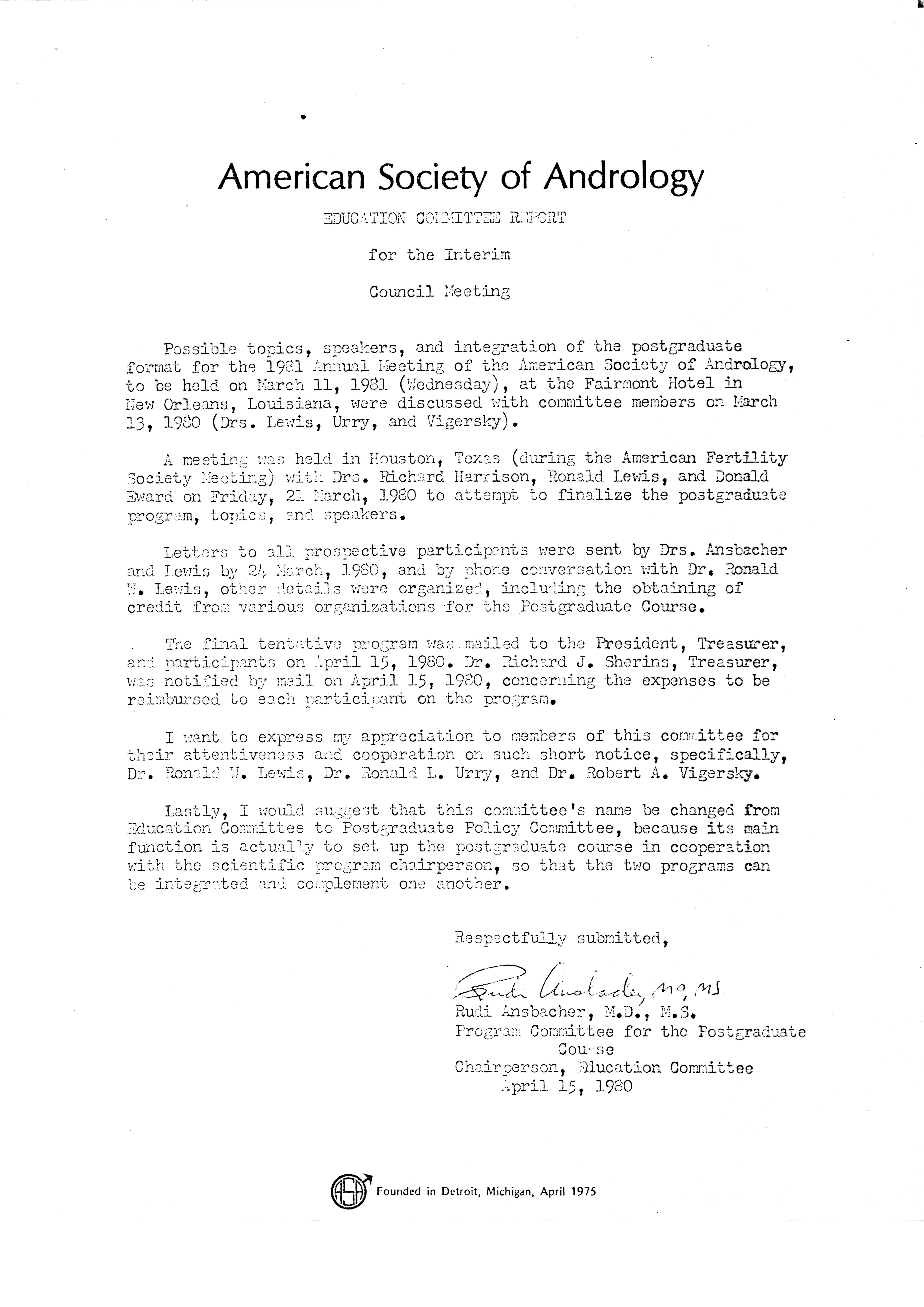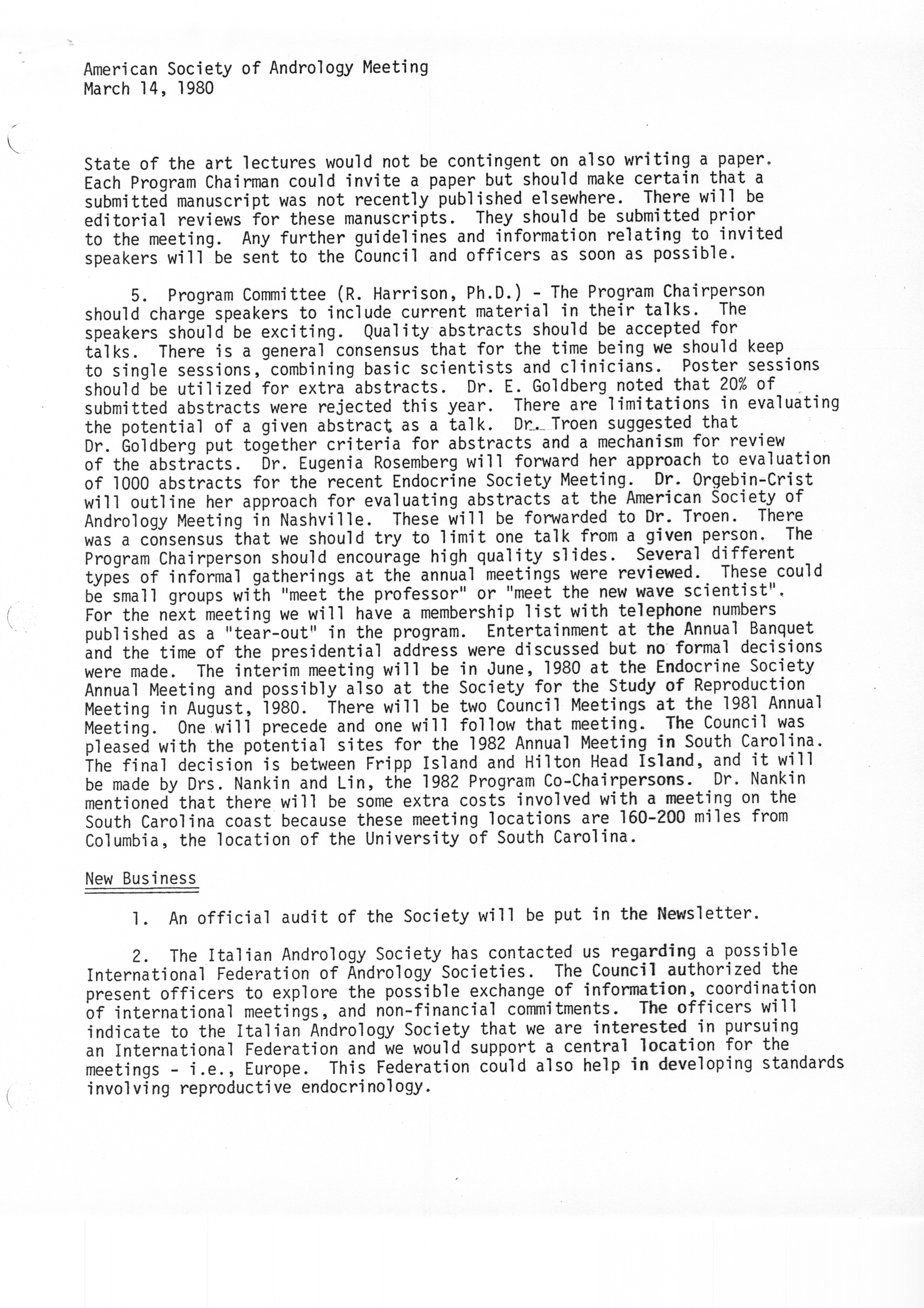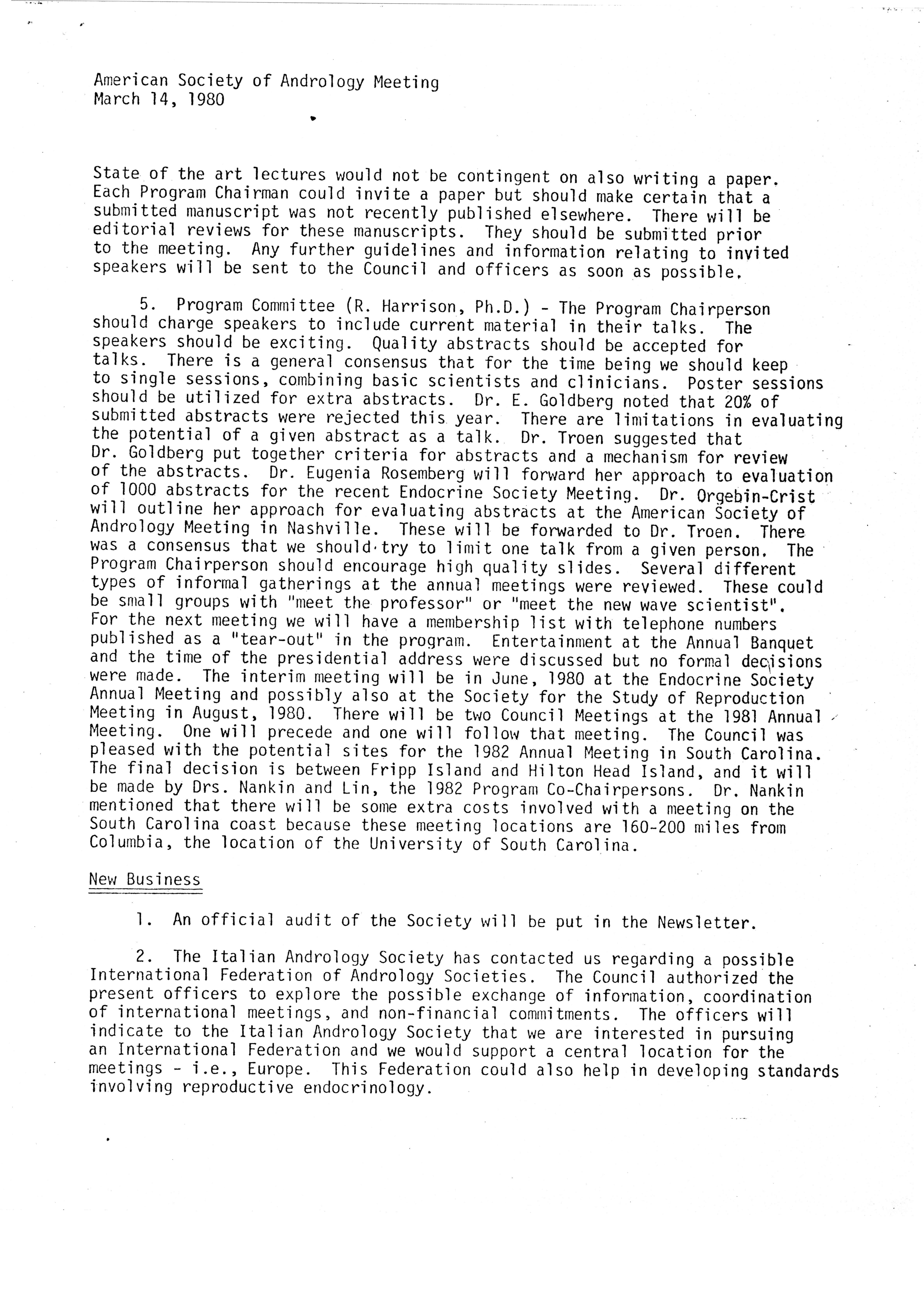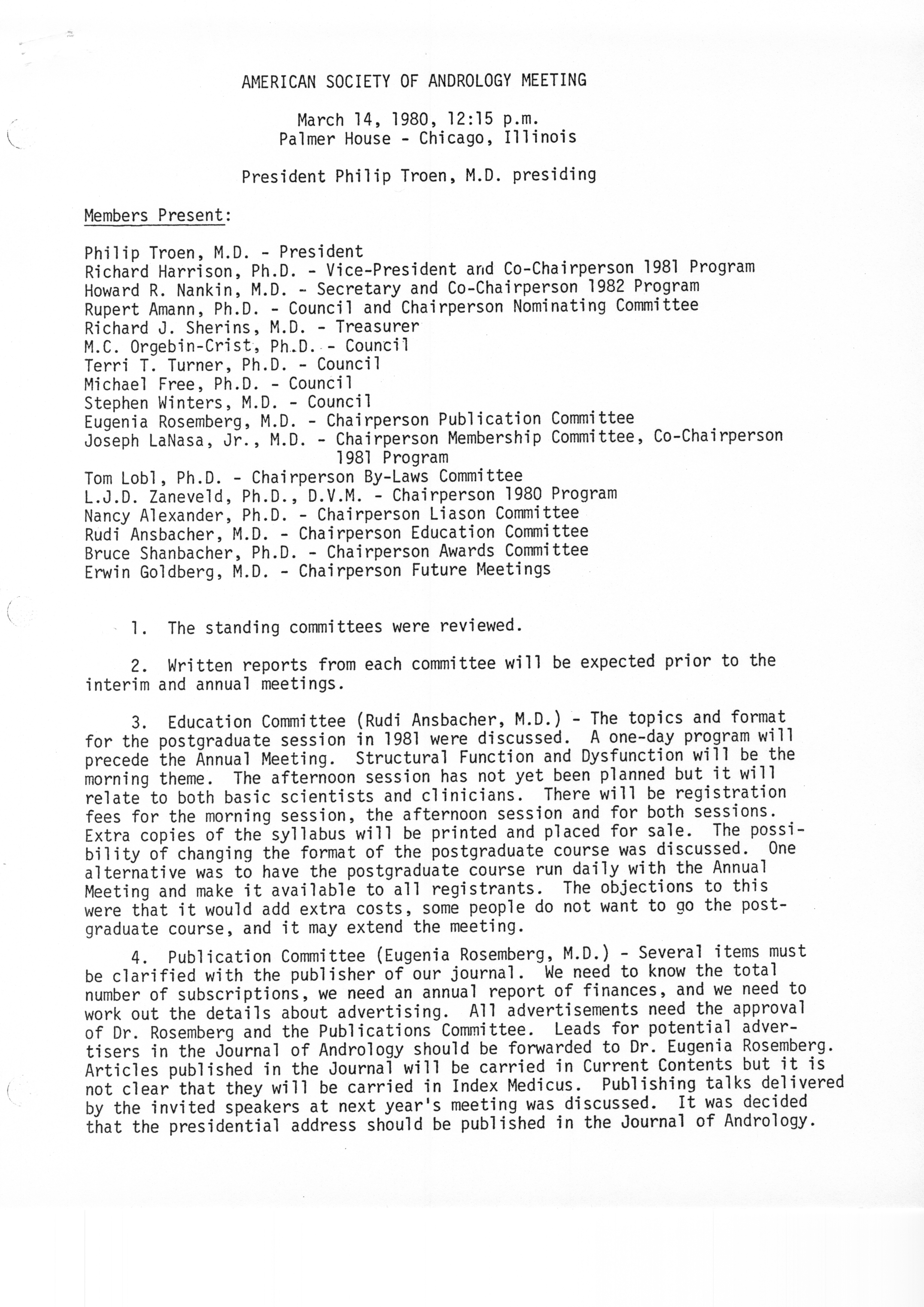 - "Executive Council Meetings of the American Society of Andrology, 1980", American Society of Andrology Collection, Iowa State University Library Digital Collections