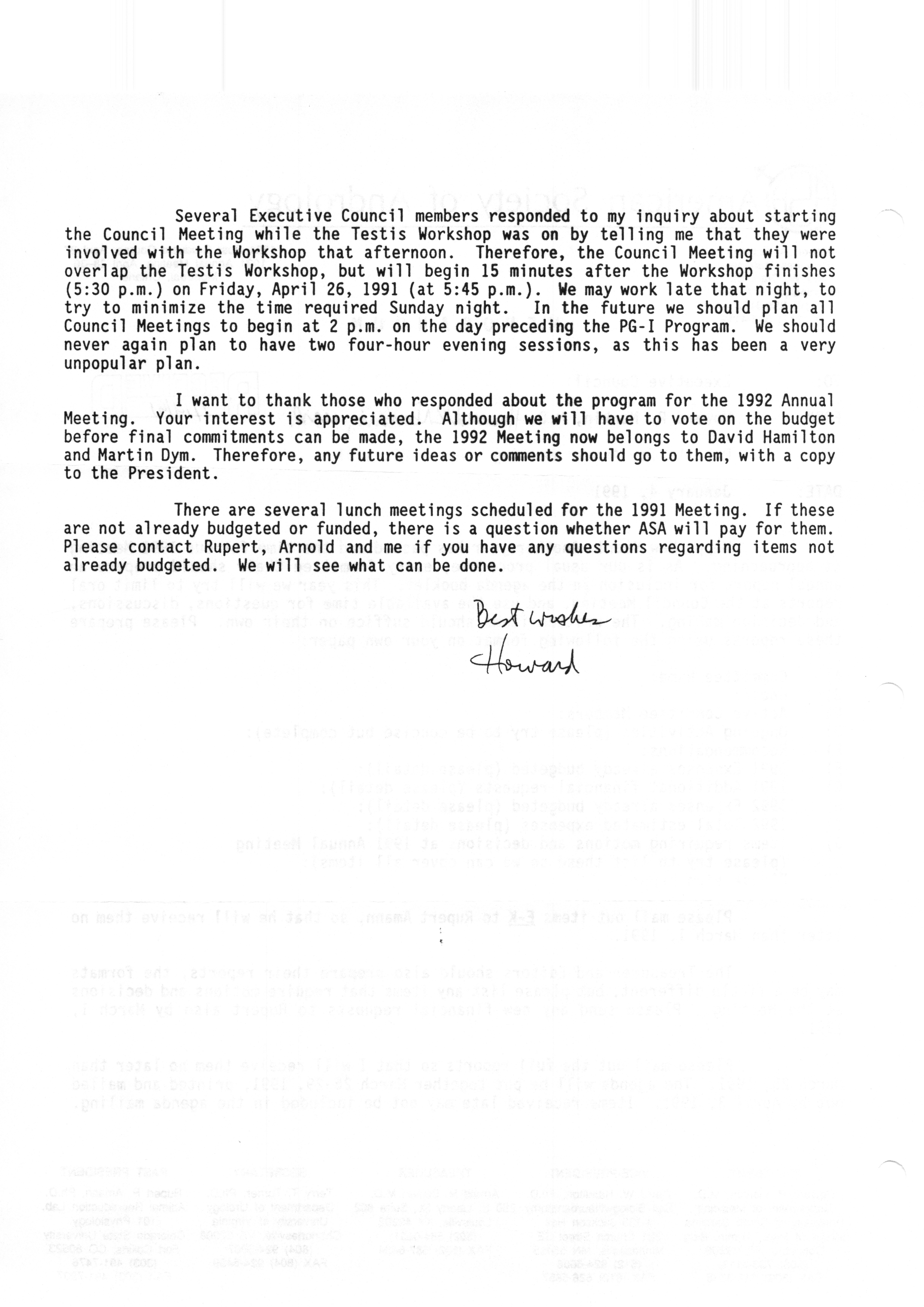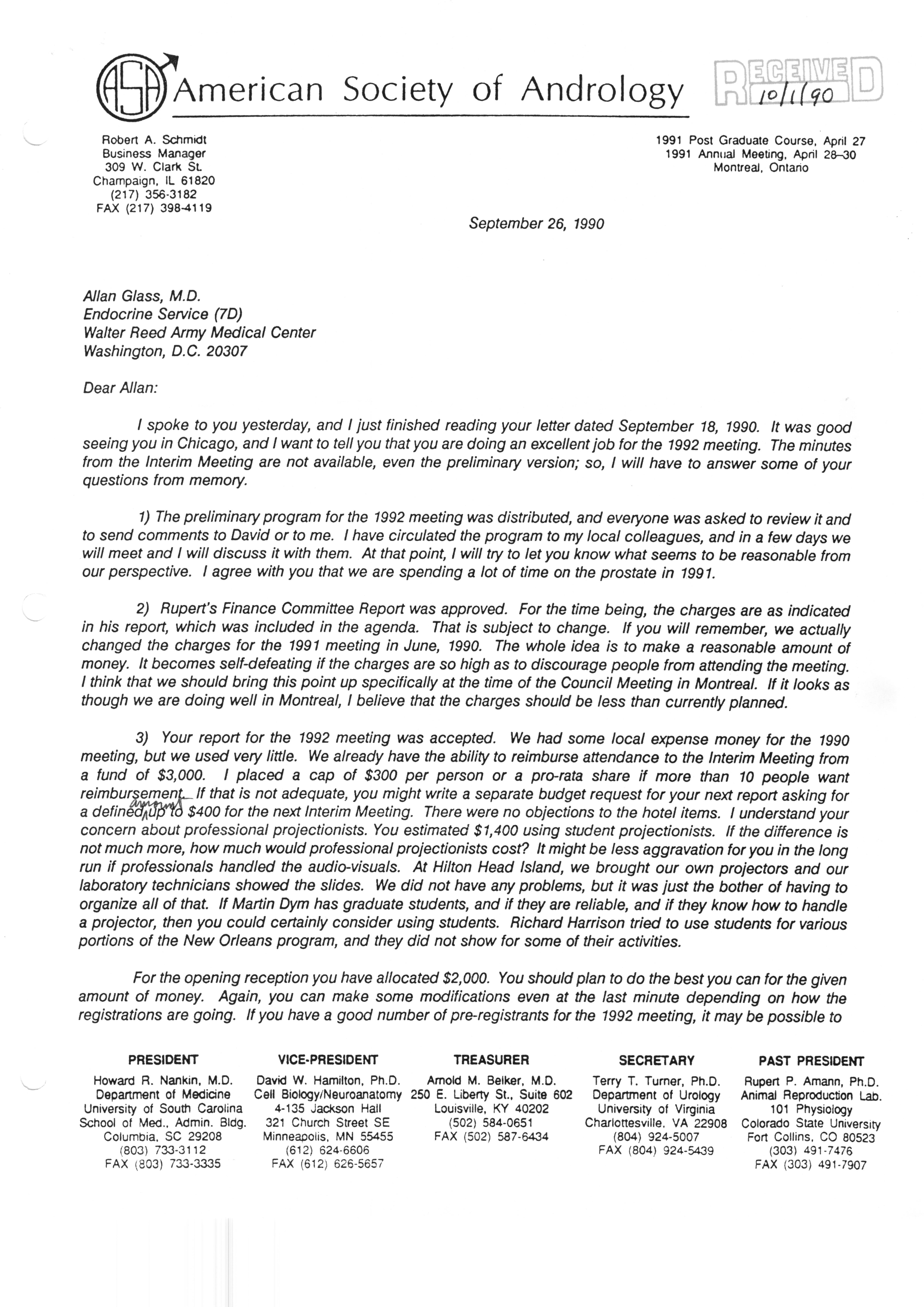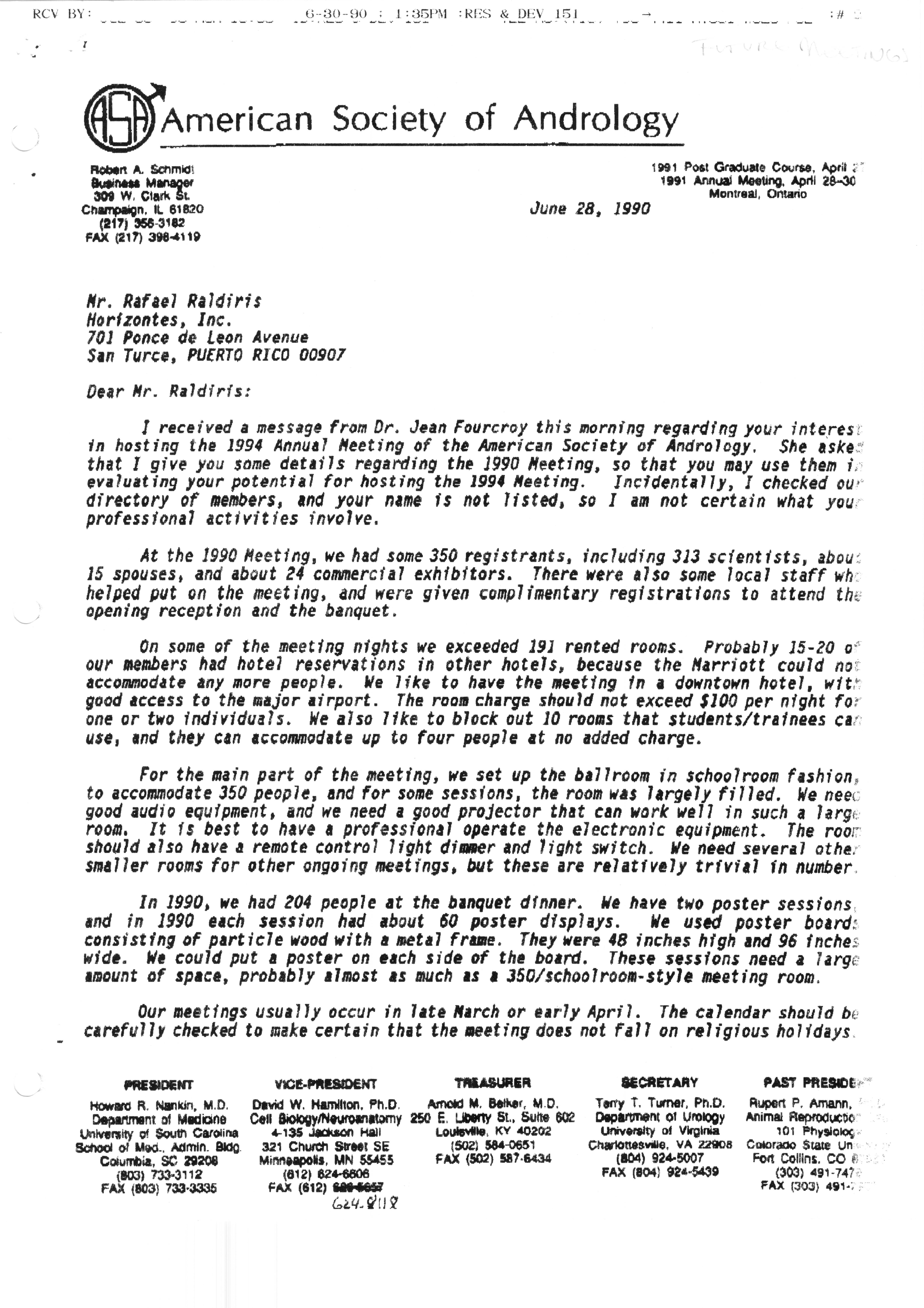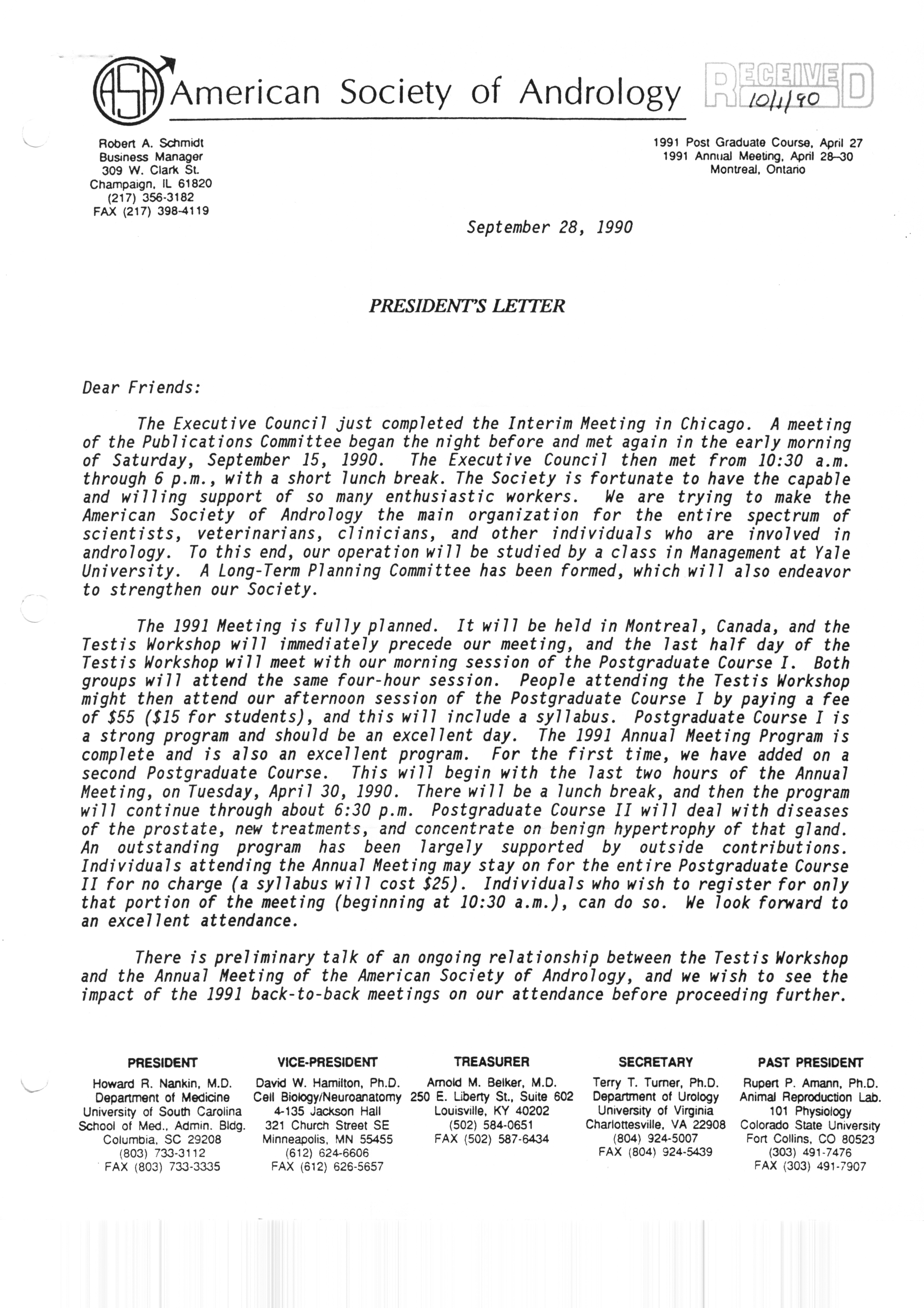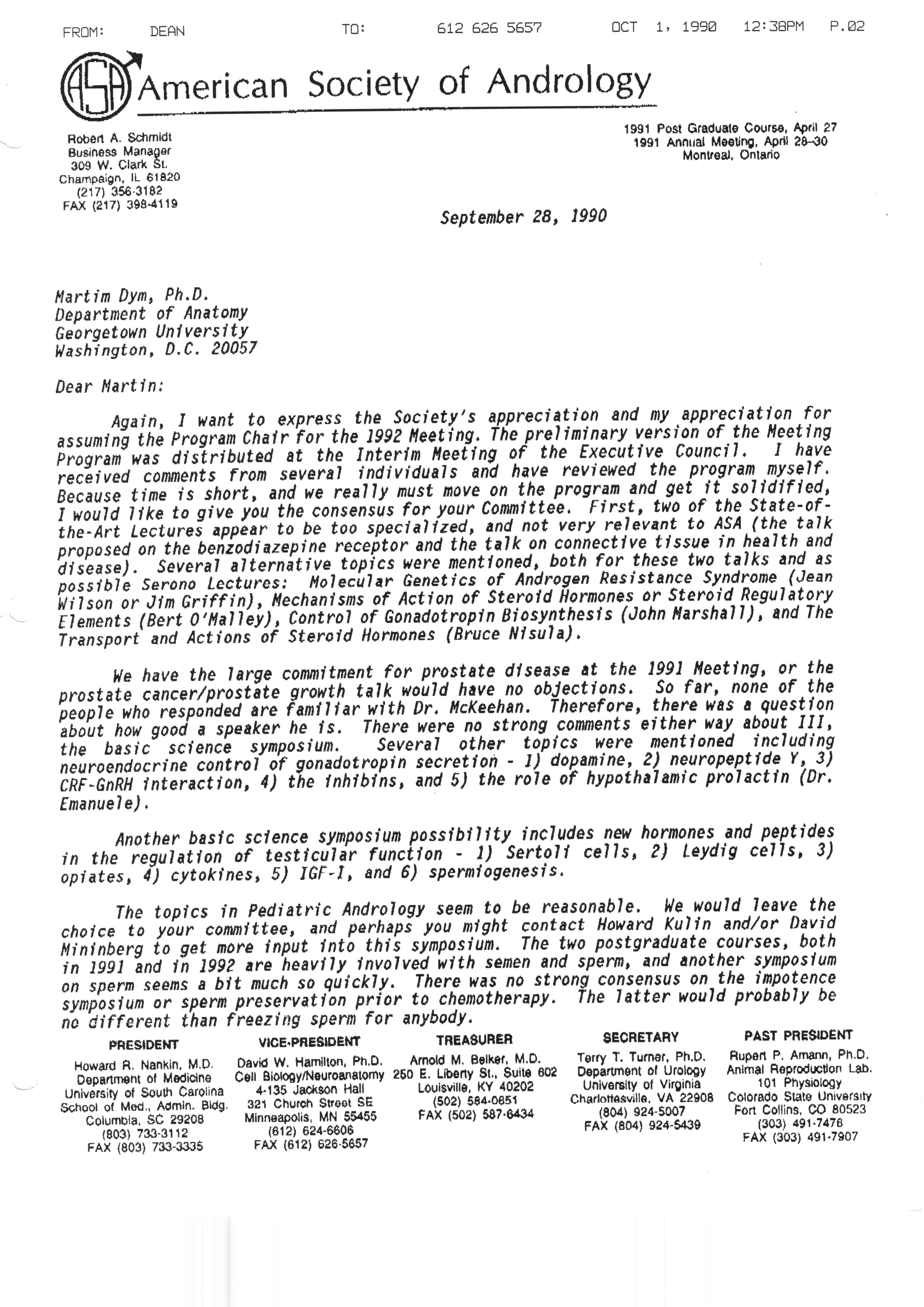 Executive Council Meetings correspondence of the American Society of Andrology, 1990