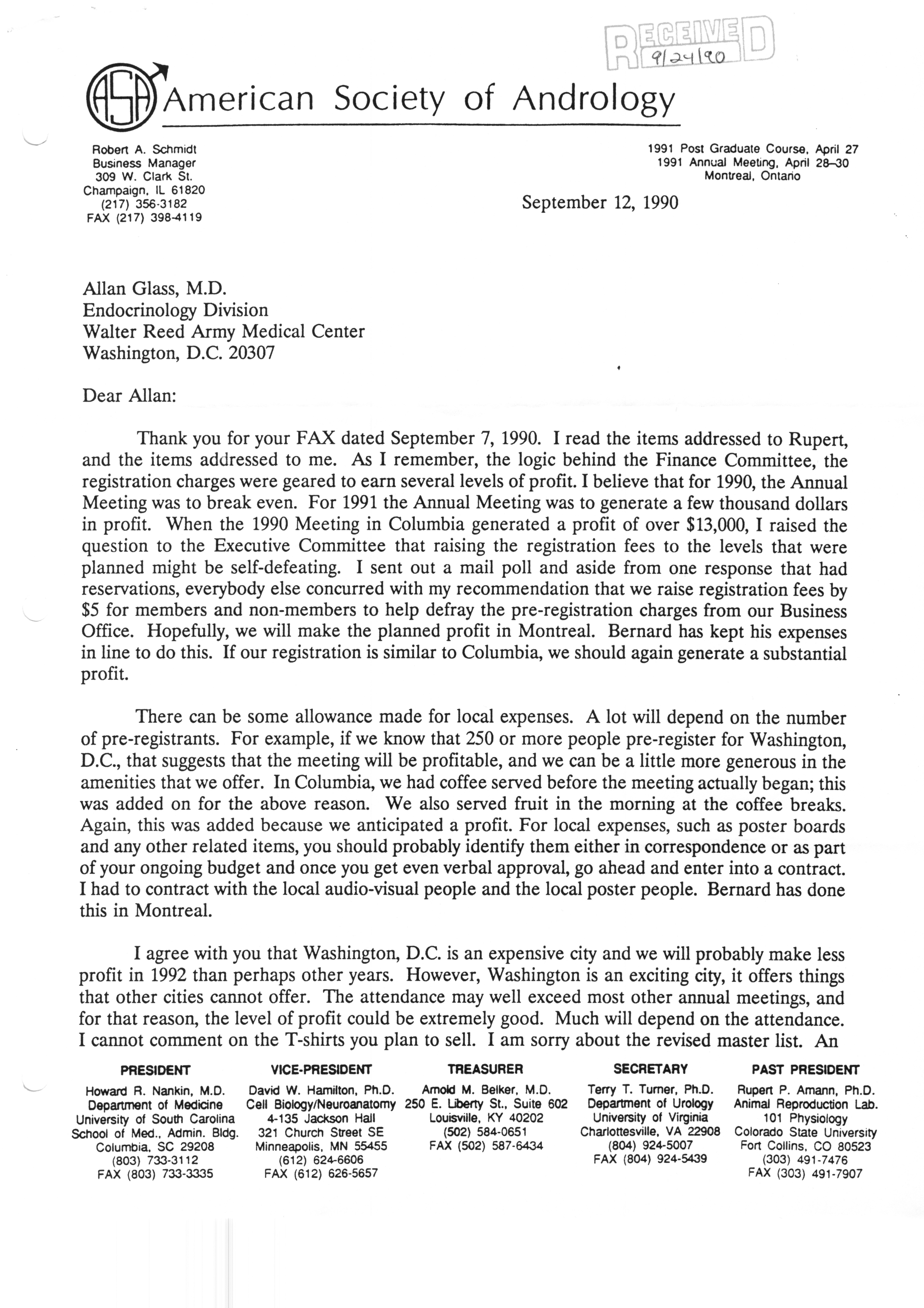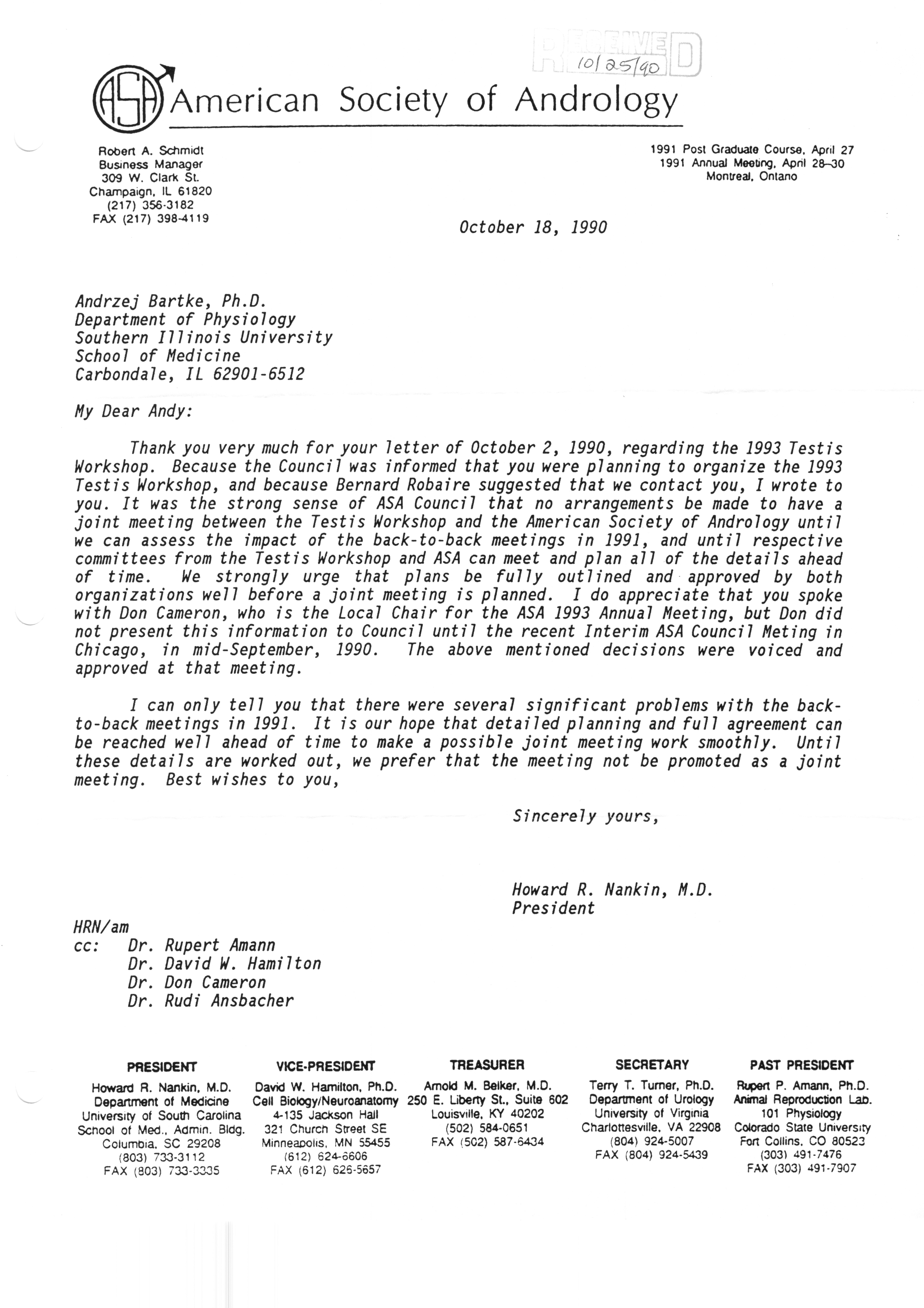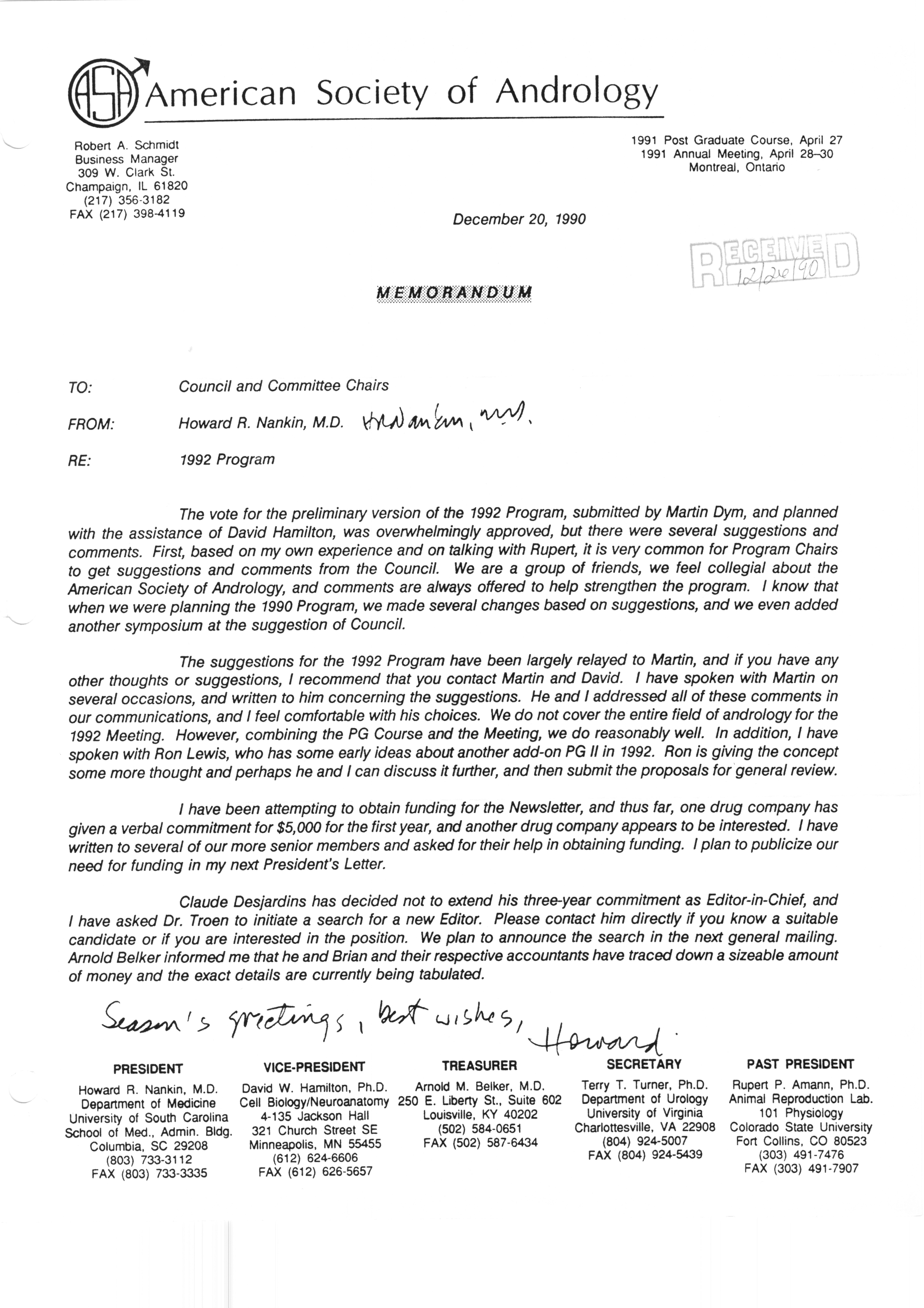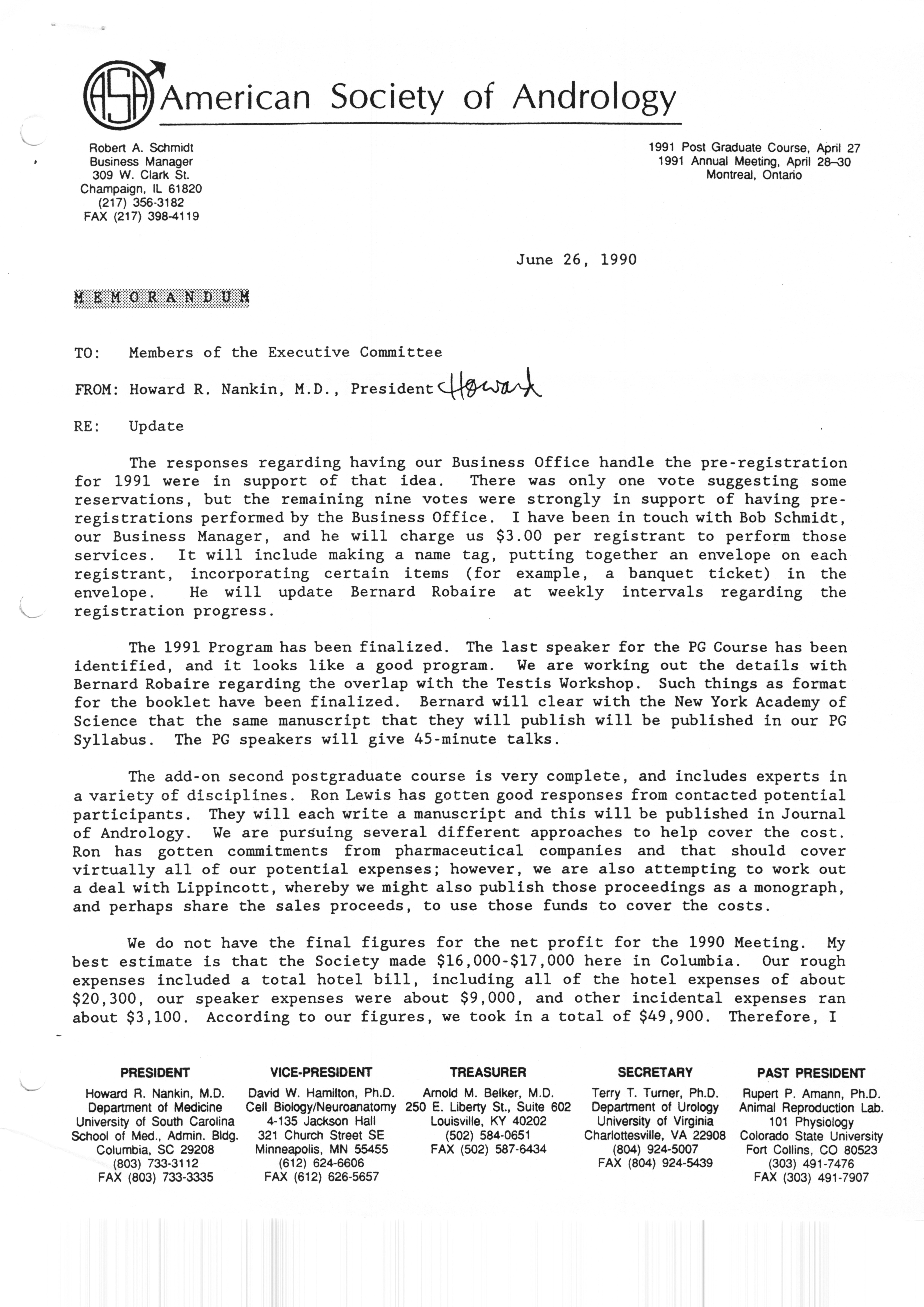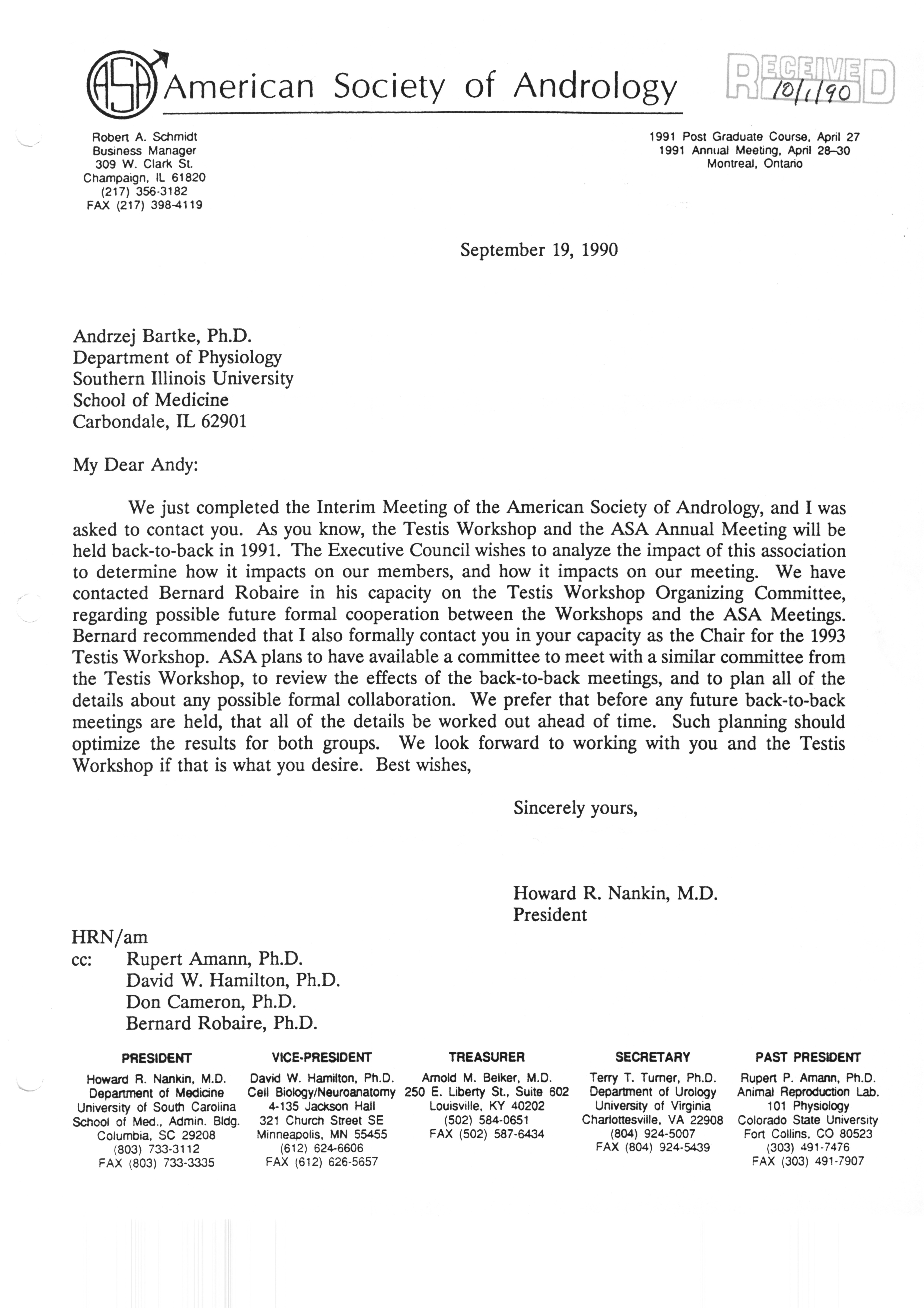 Executive Council Meetings correspondence of the American Society of Andrology, 1990