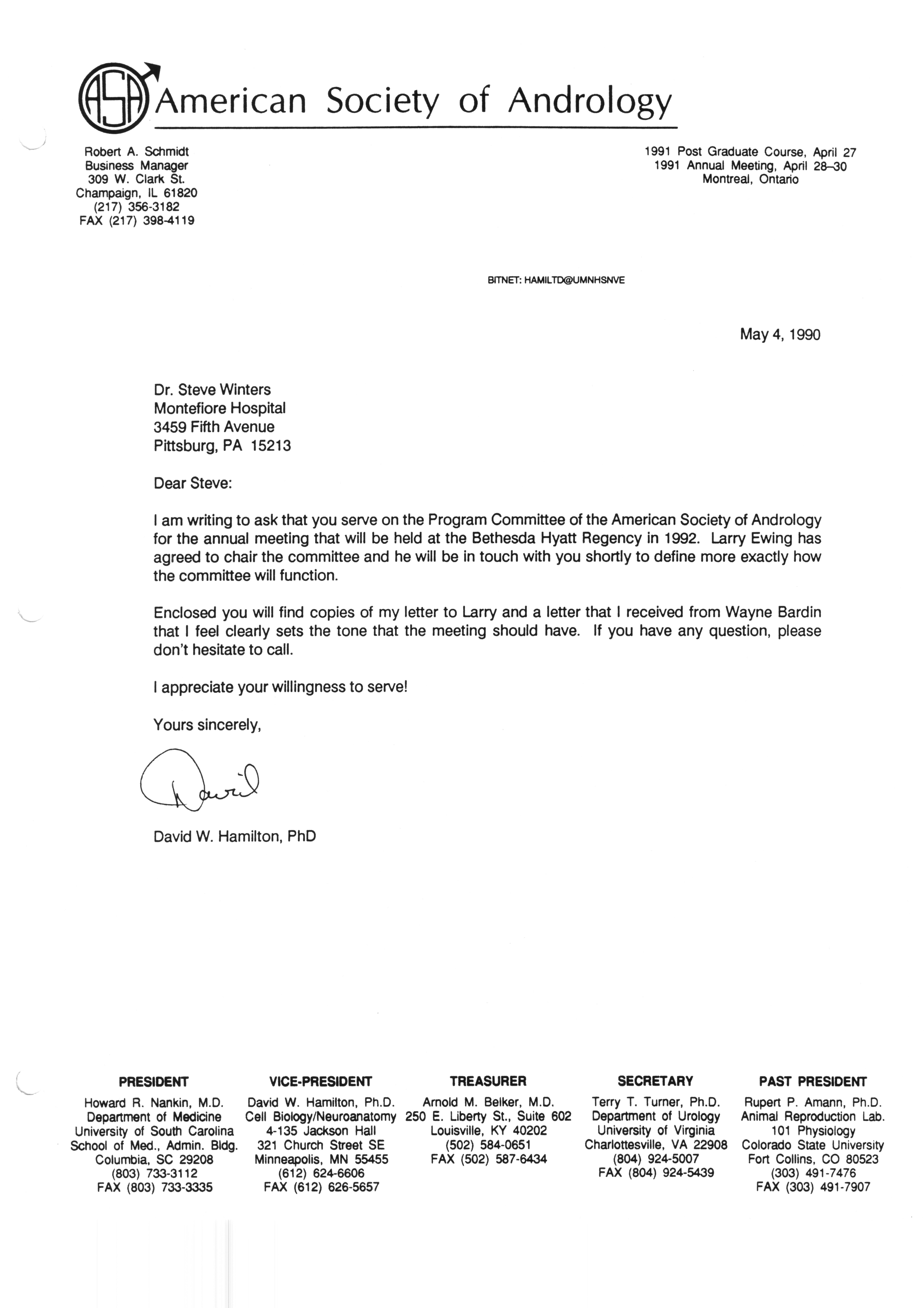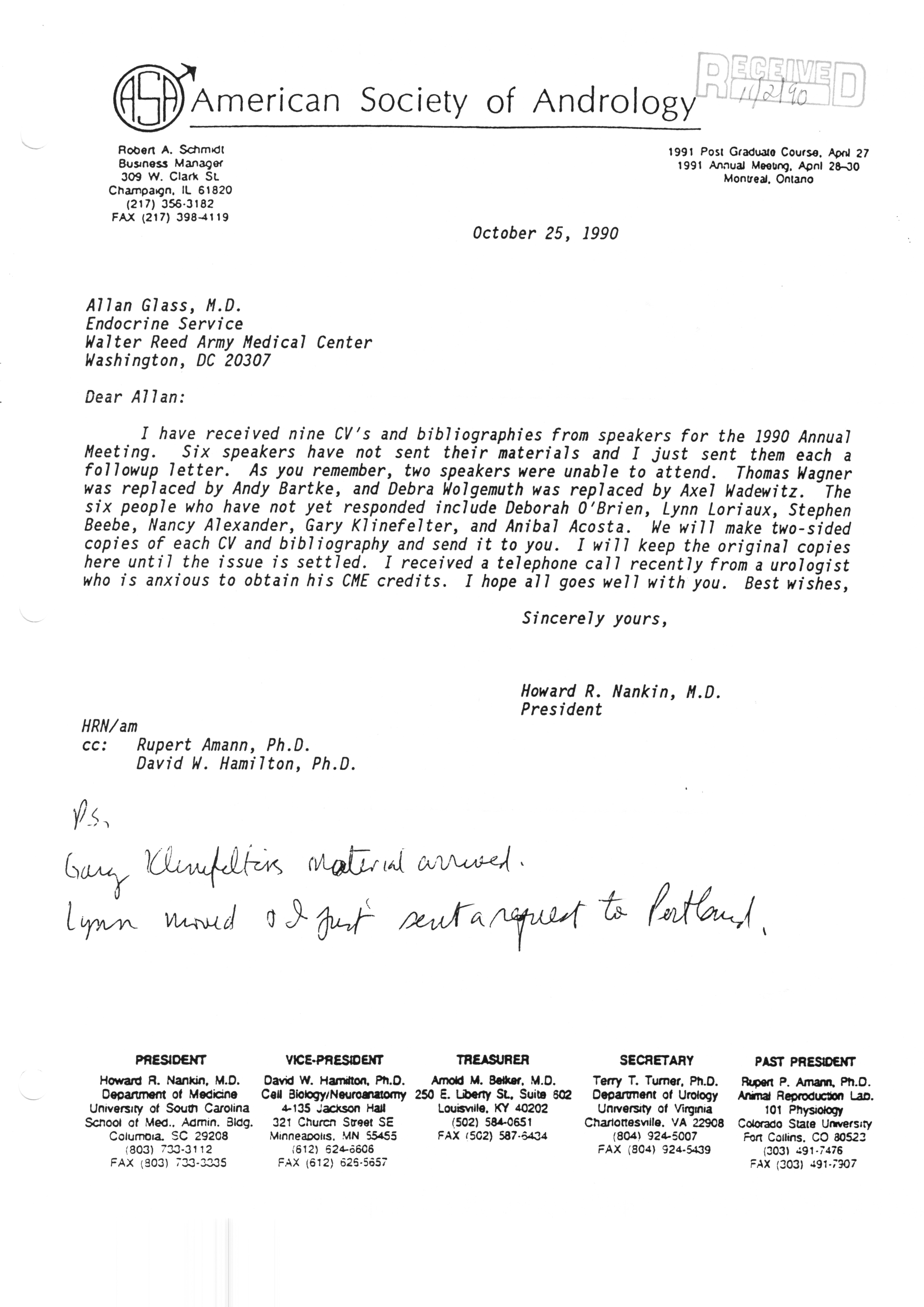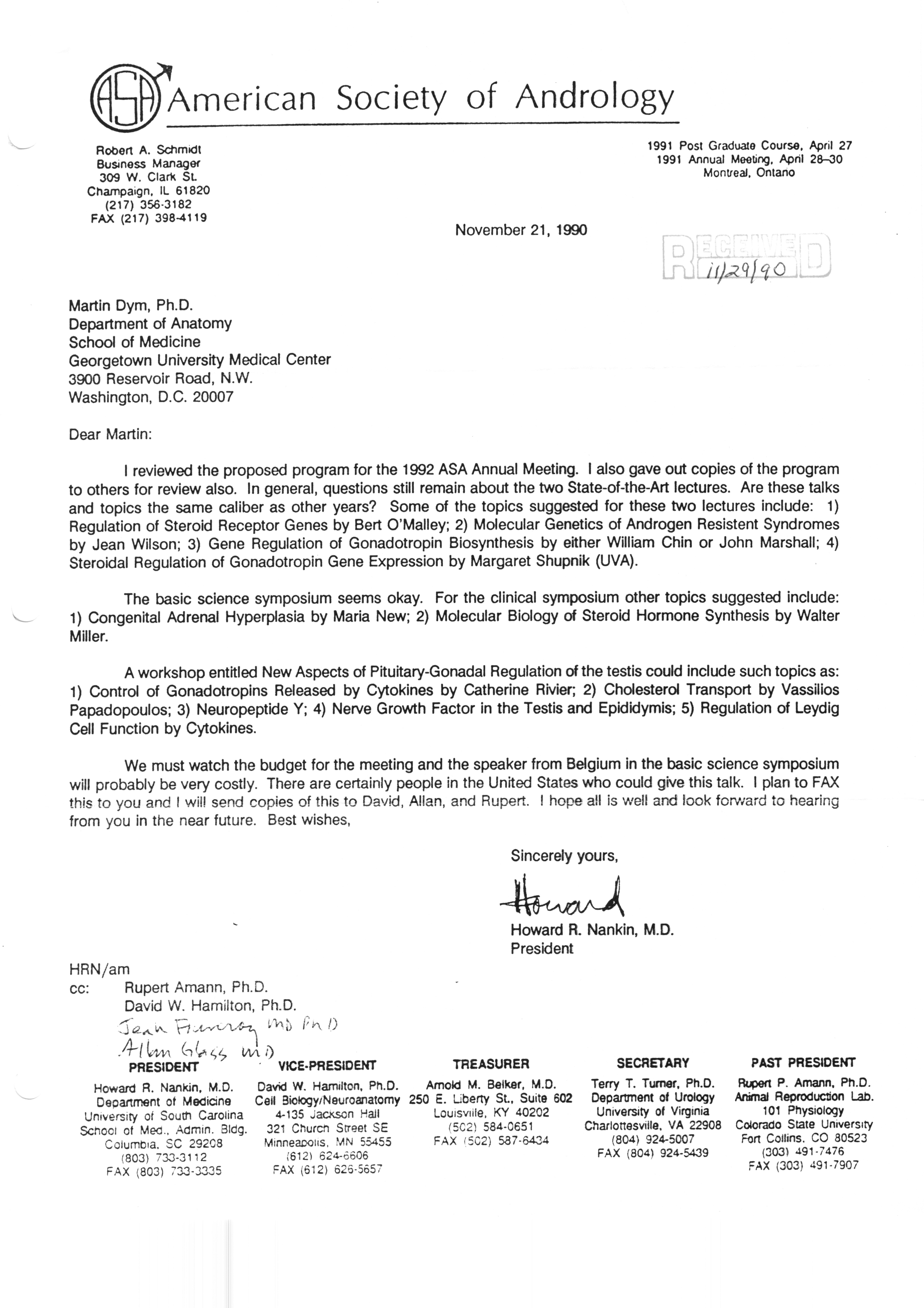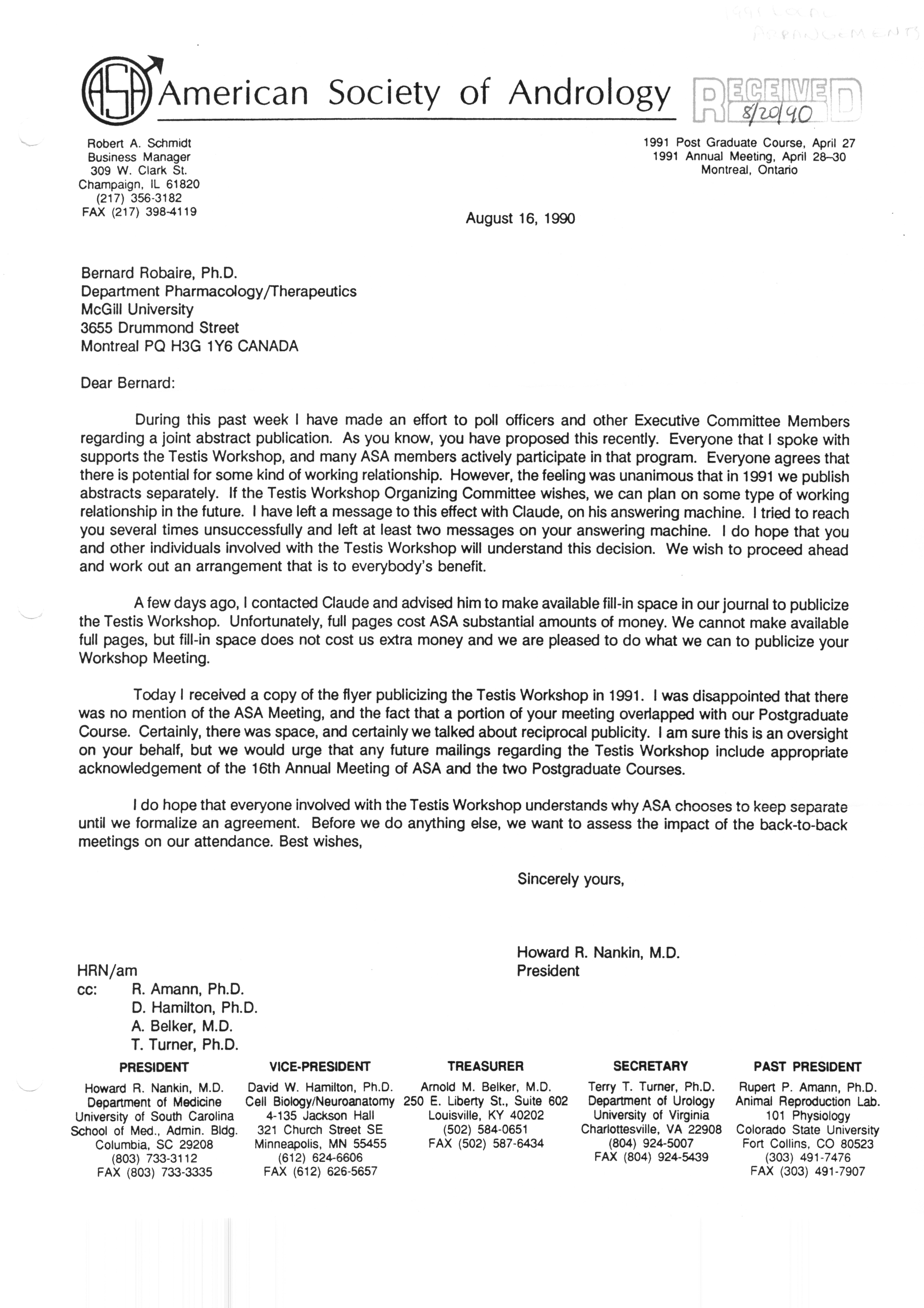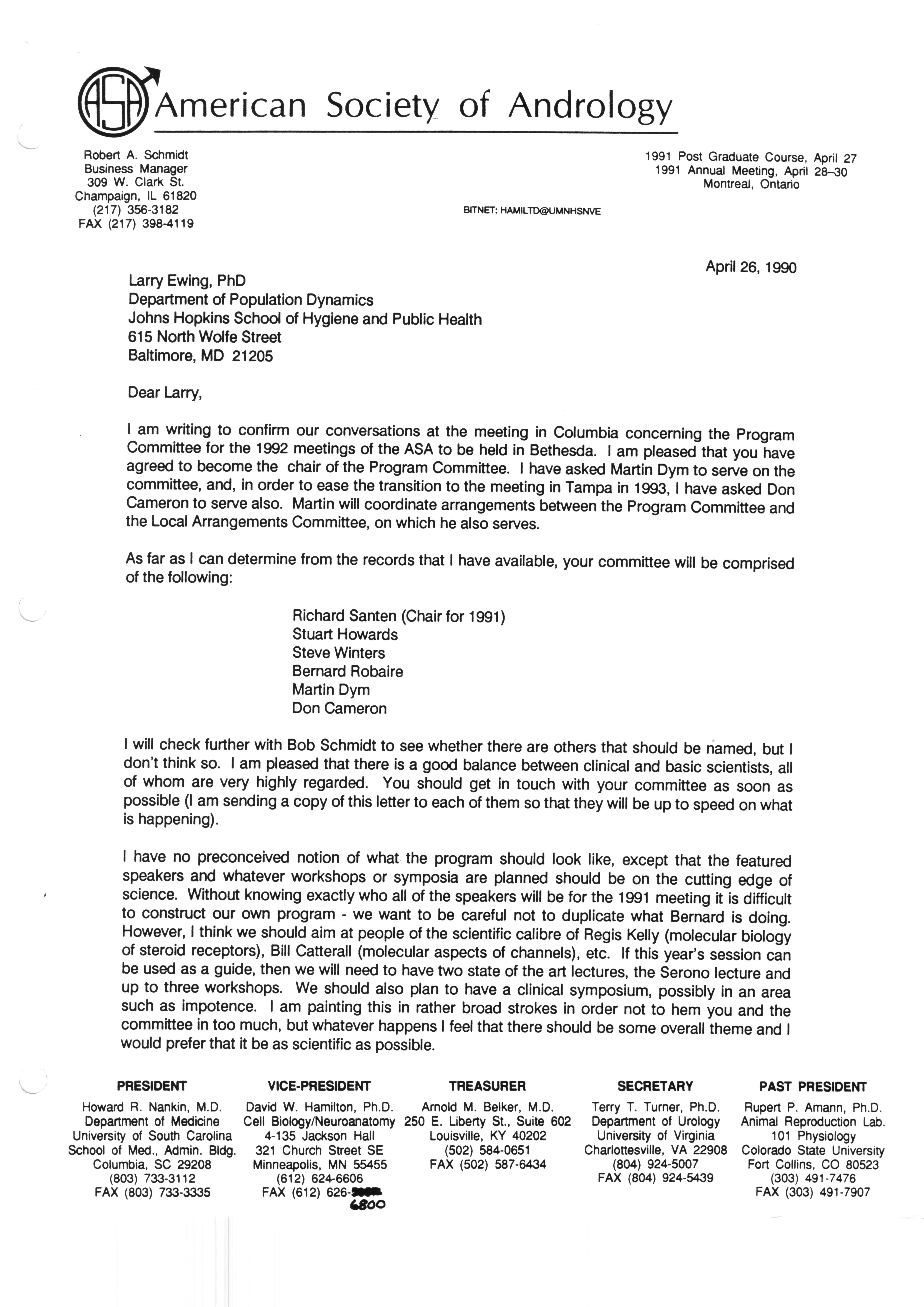 Executive Council Meetings correspondence of the American Society of Andrology, 1990