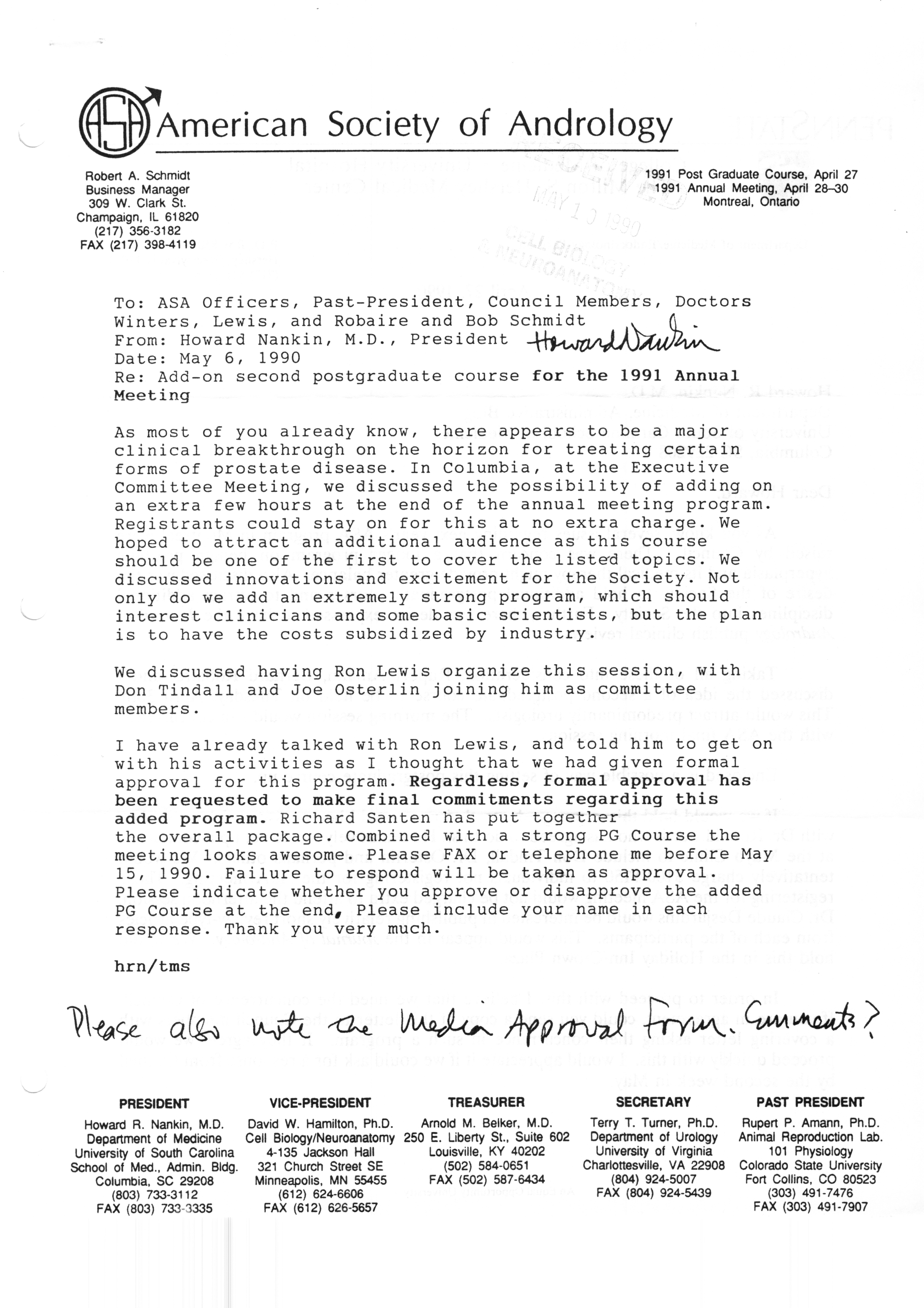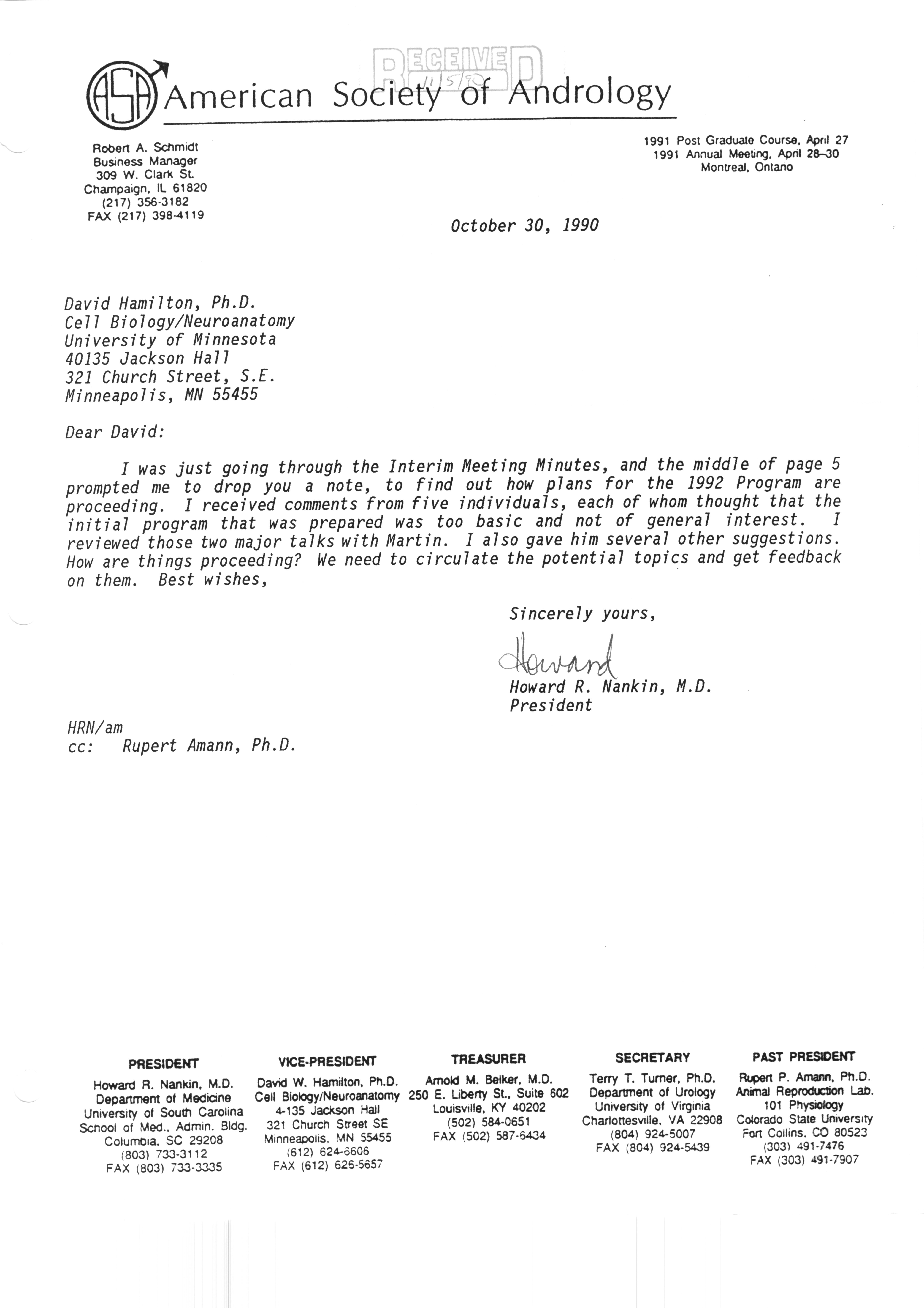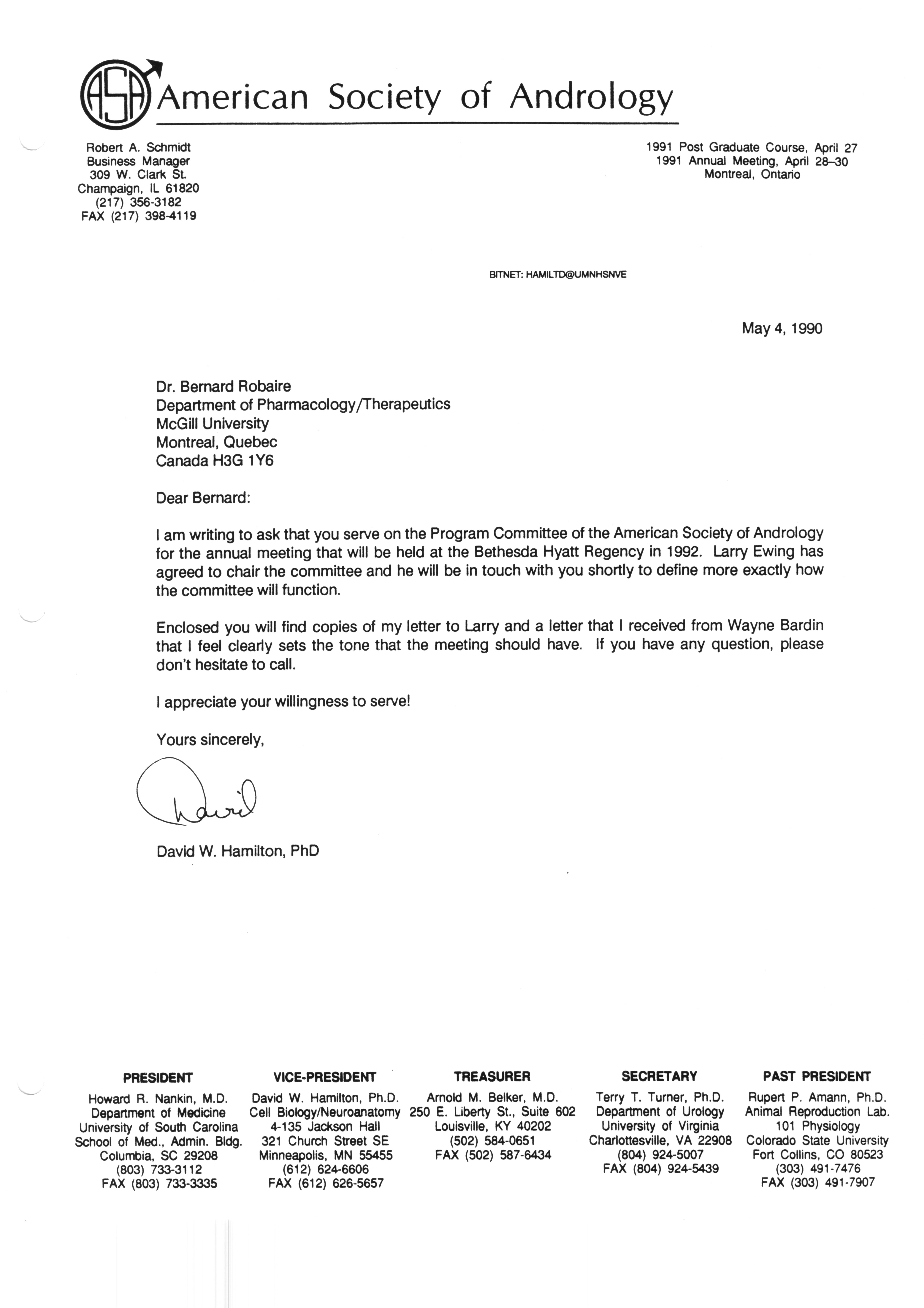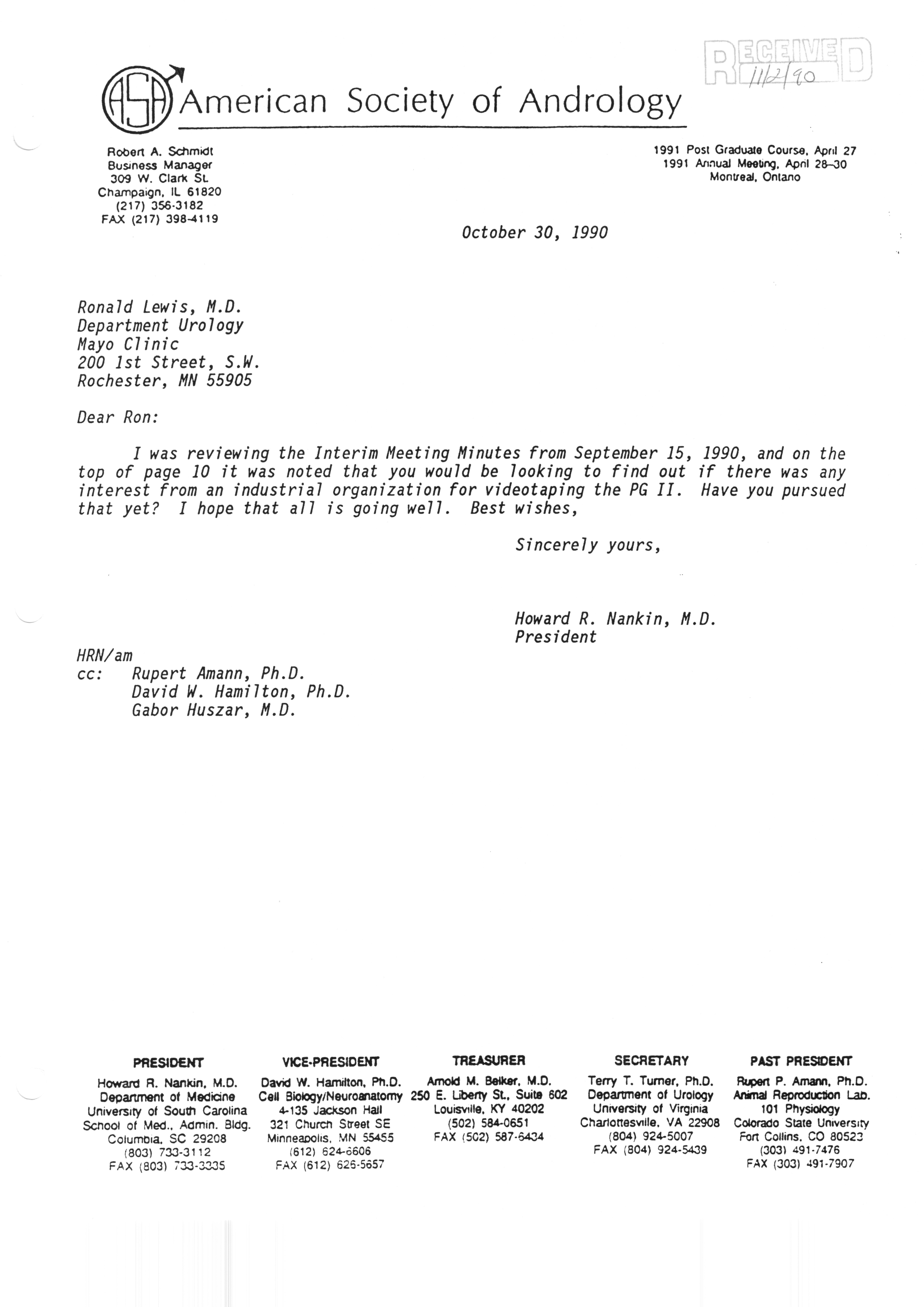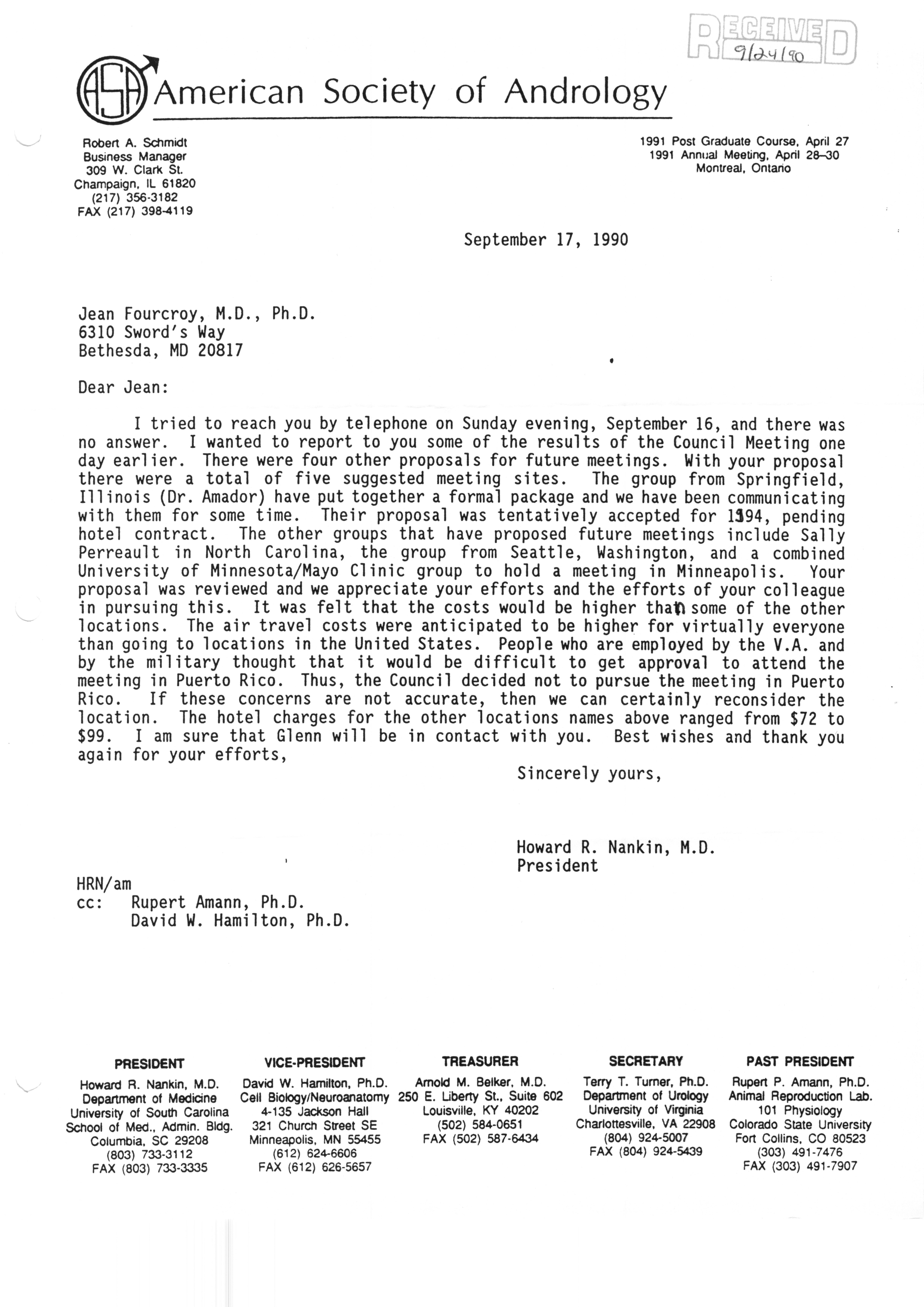 Executive Council Meetings correspondence of the American Society of Andrology, 1990