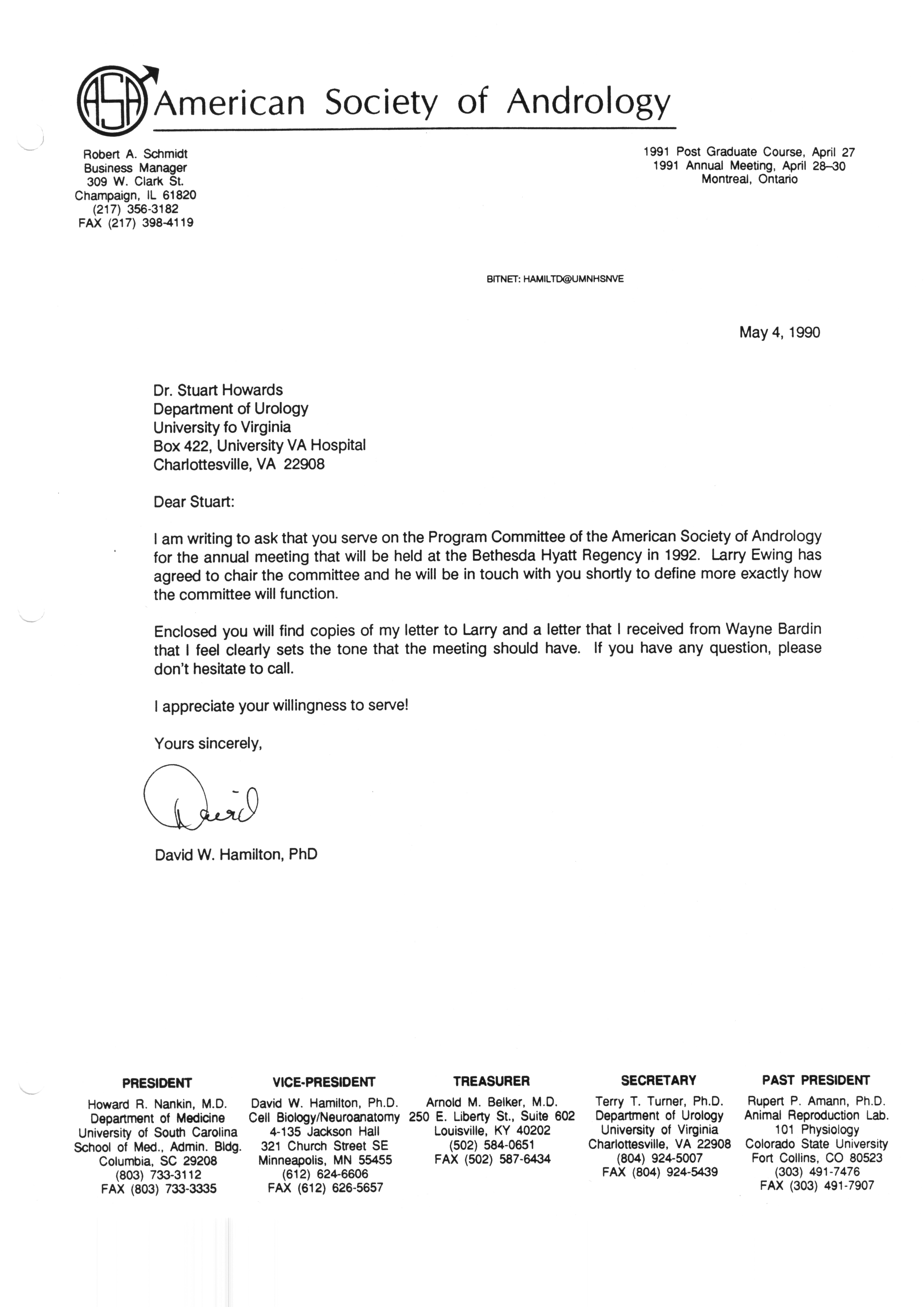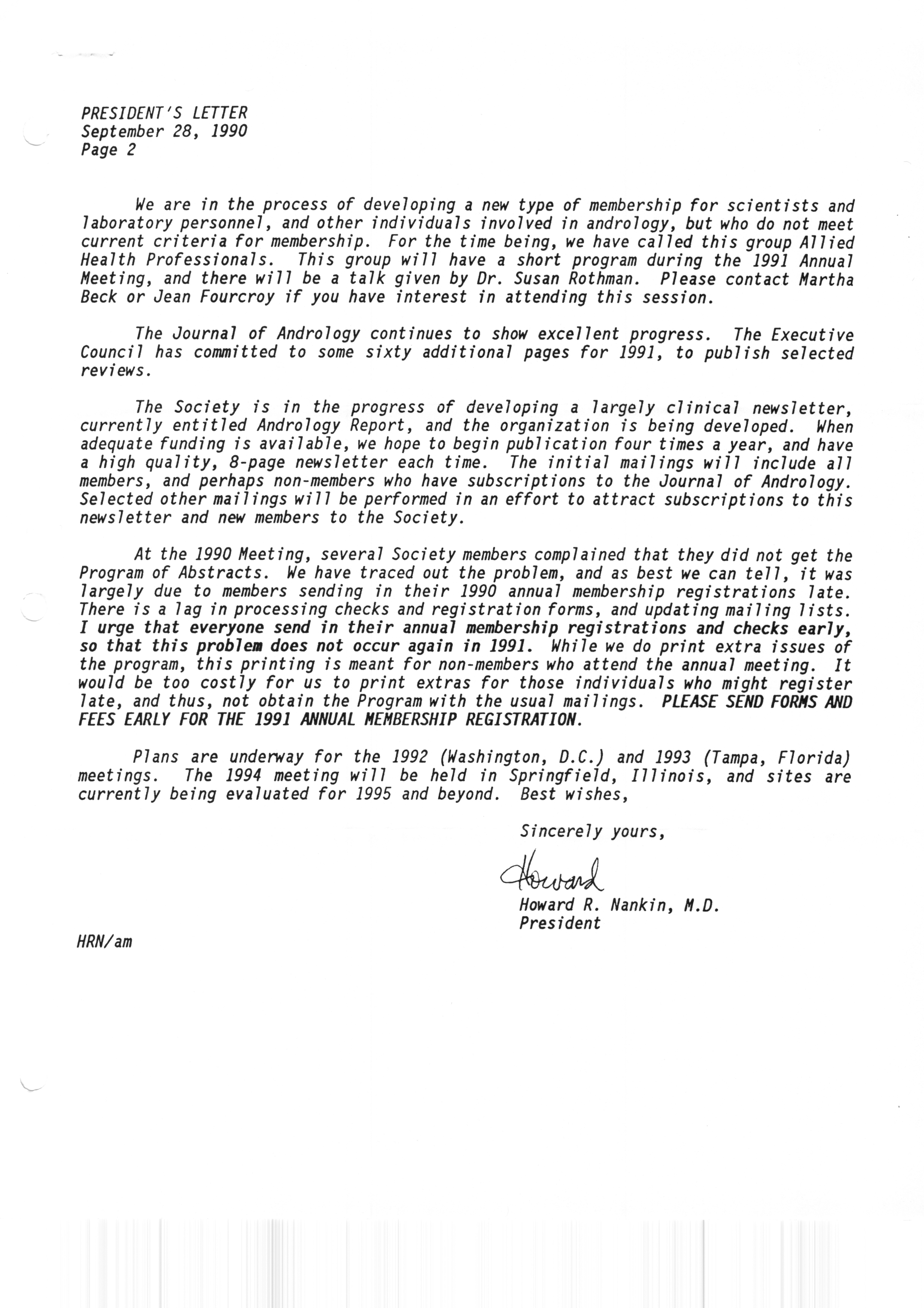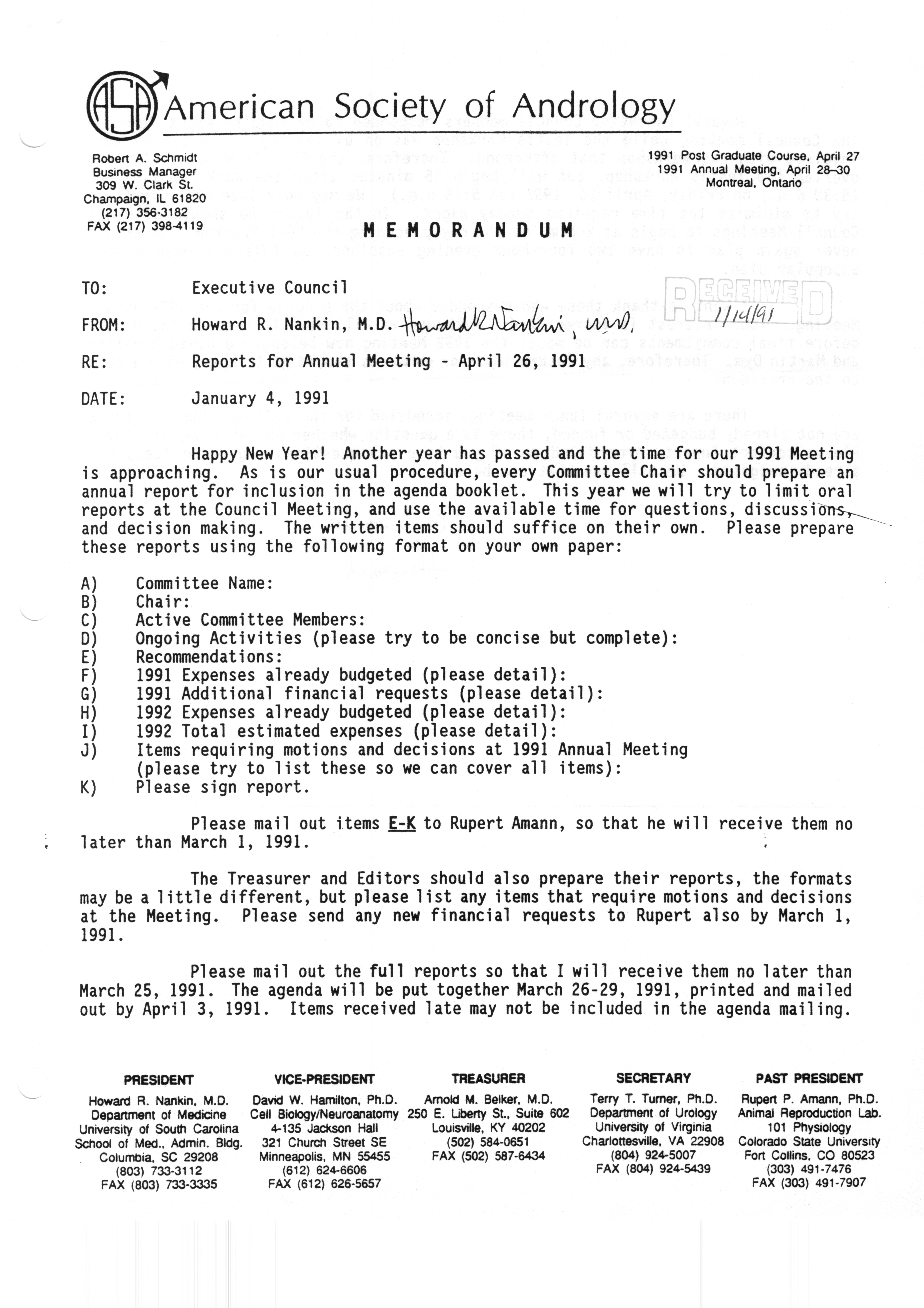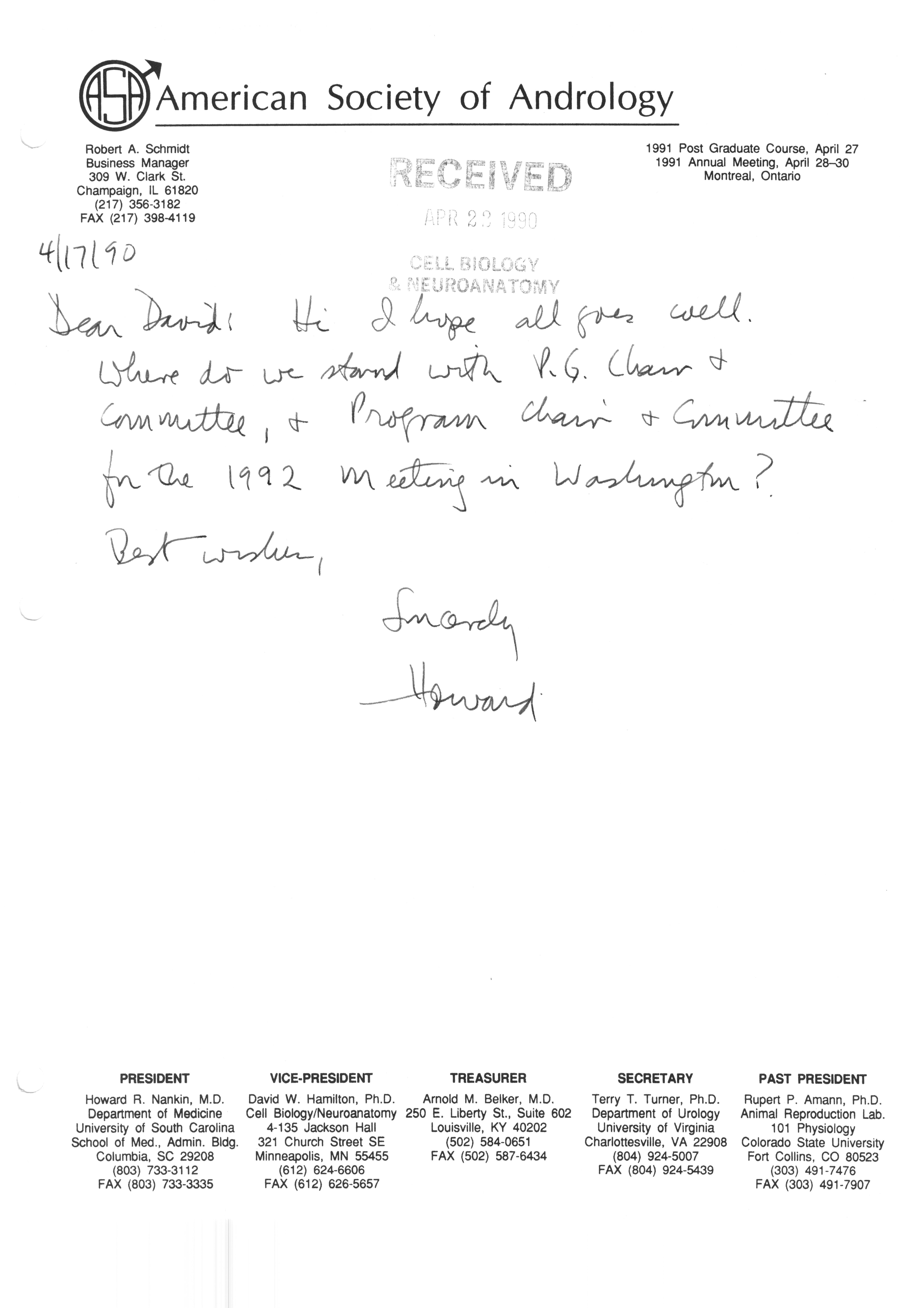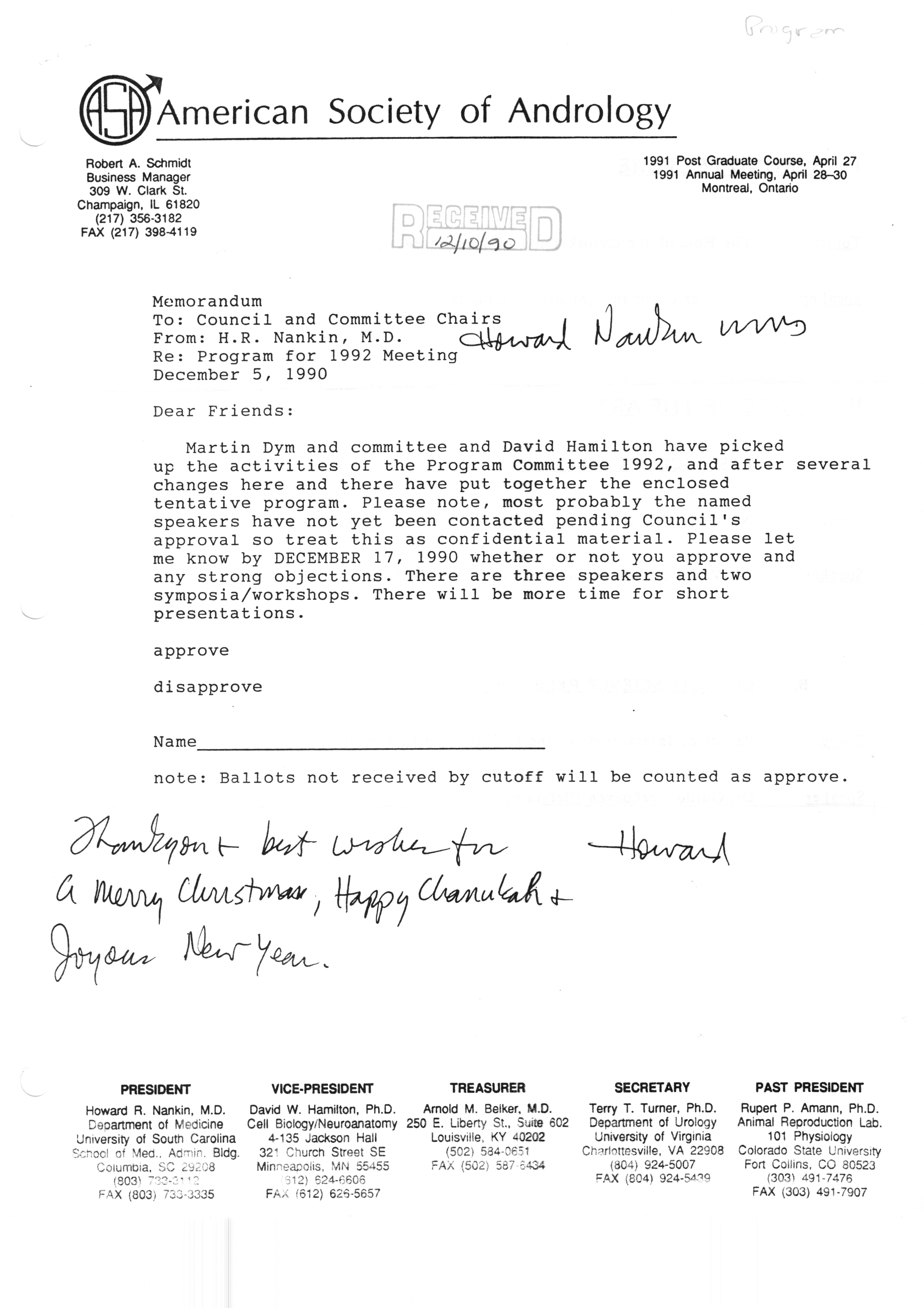 Executive Council Meetings correspondence of the American Society of Andrology, 1990