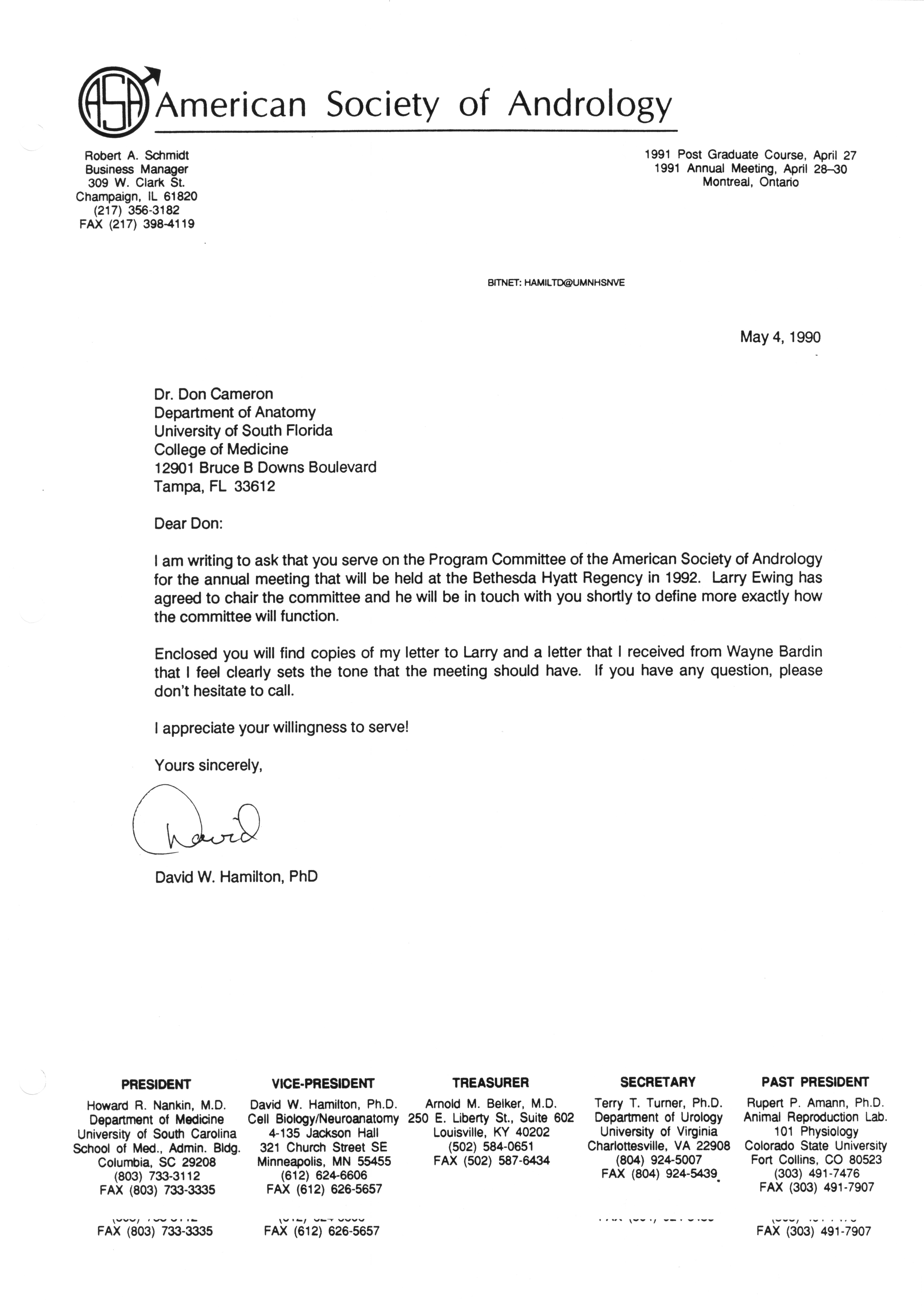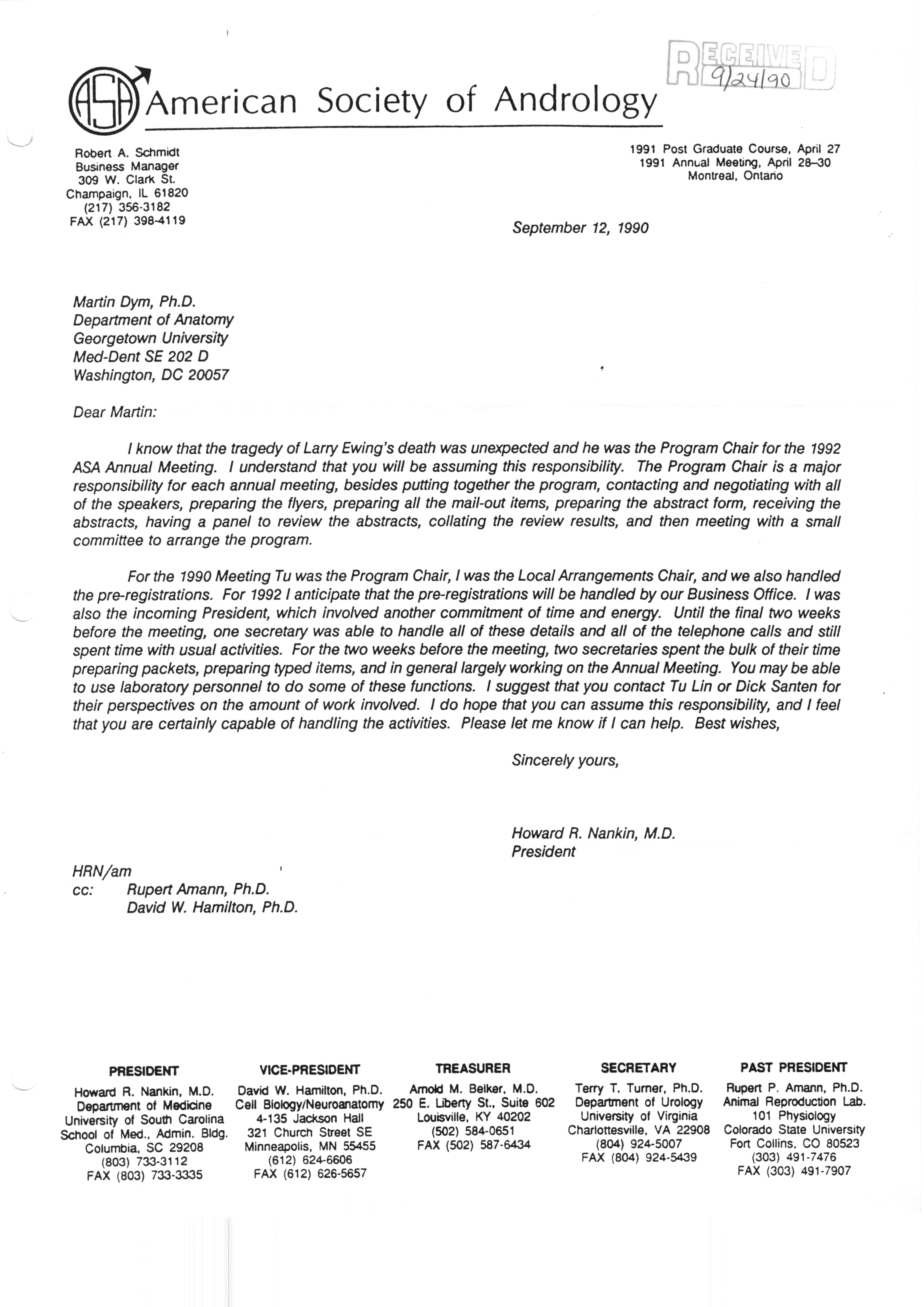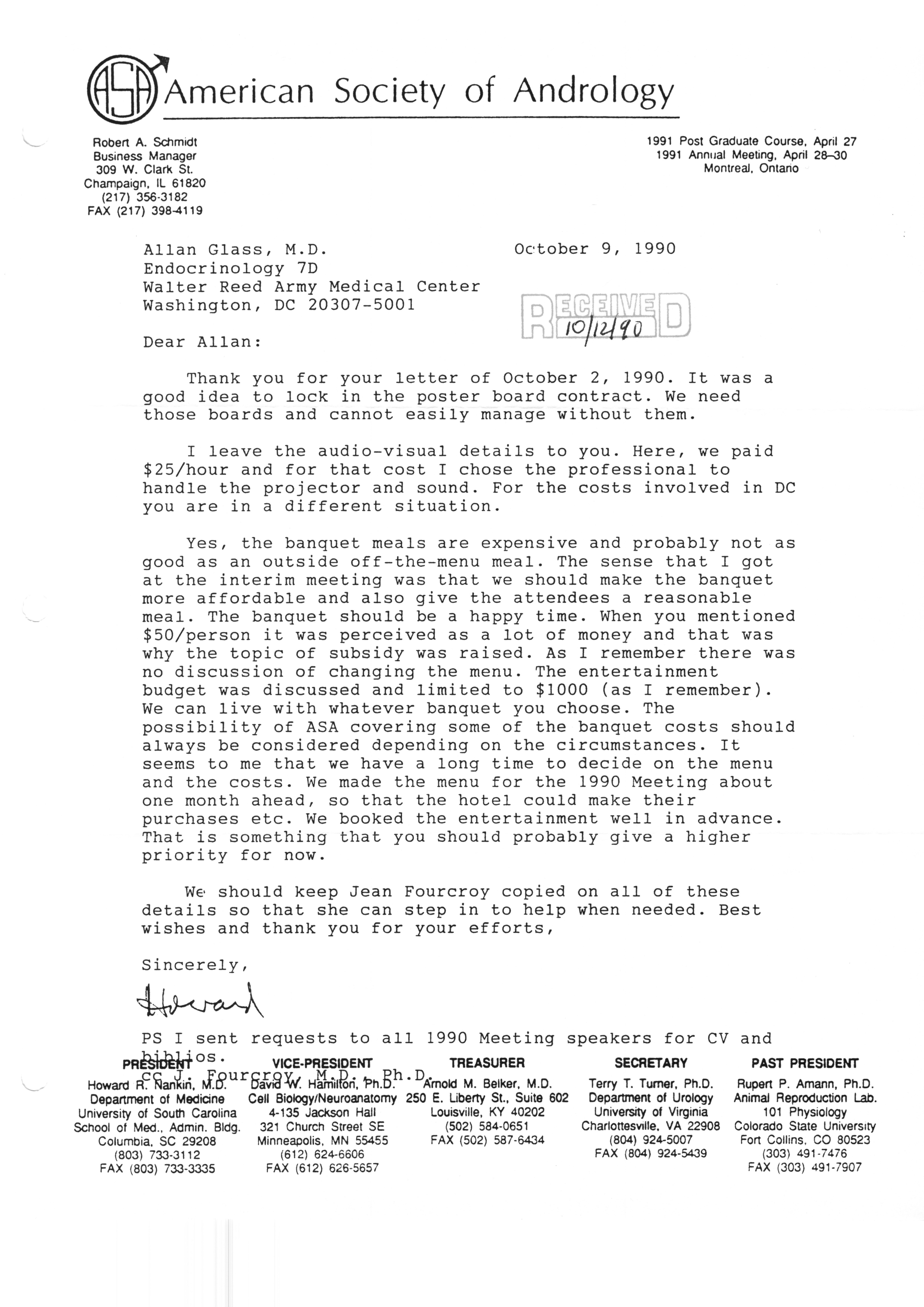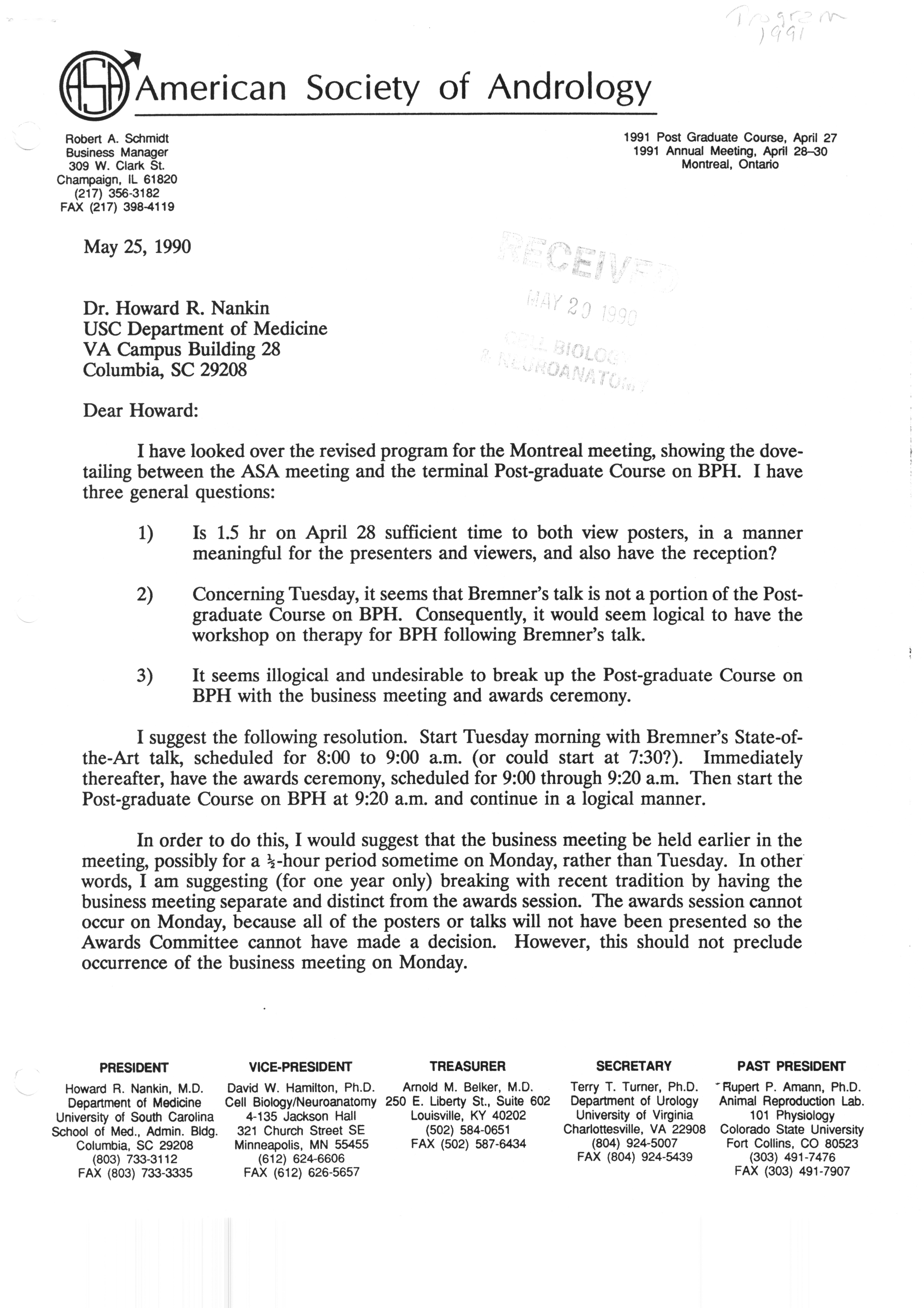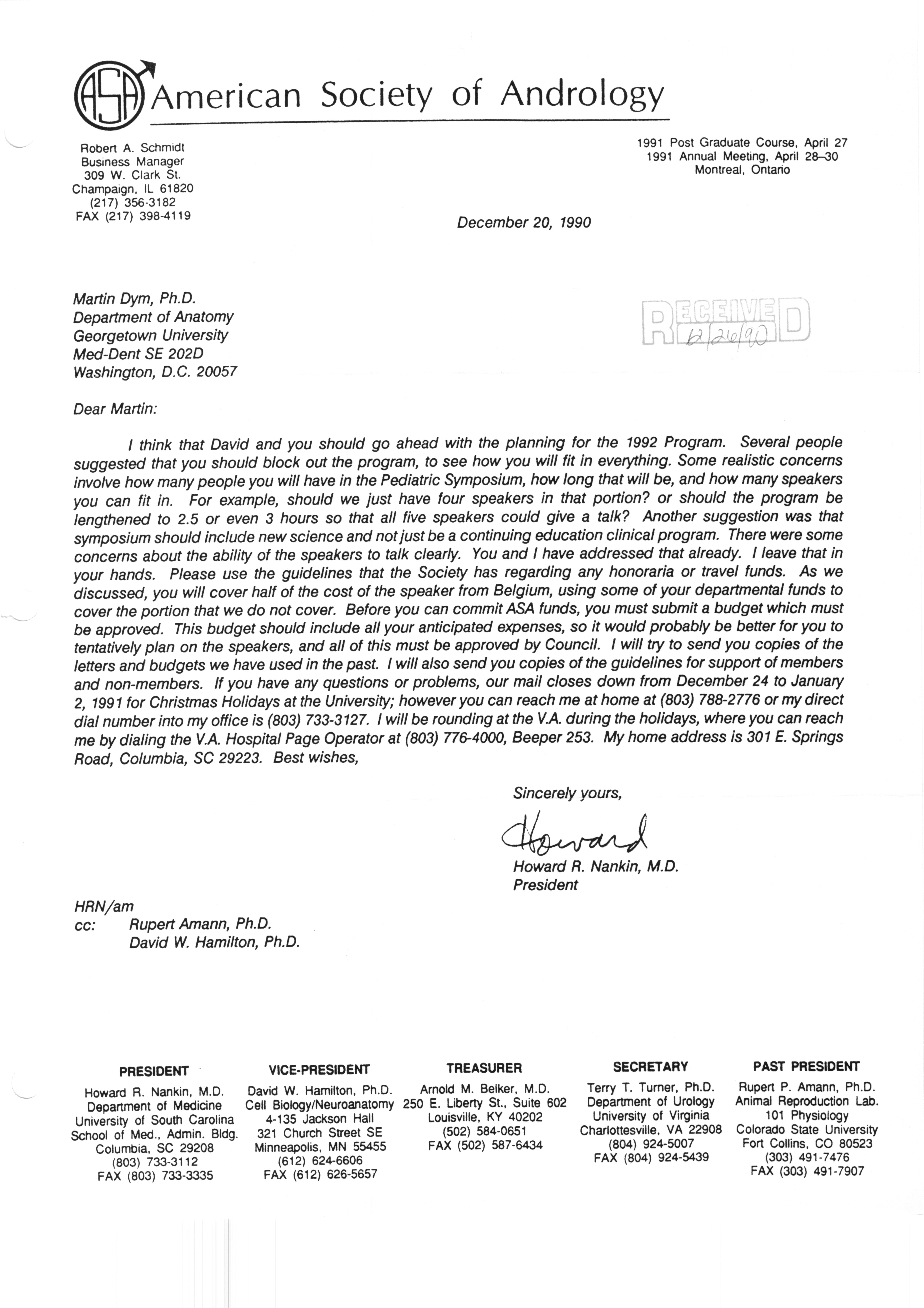 Executive Council Meetings correspondence of the American Society of Andrology, 1990