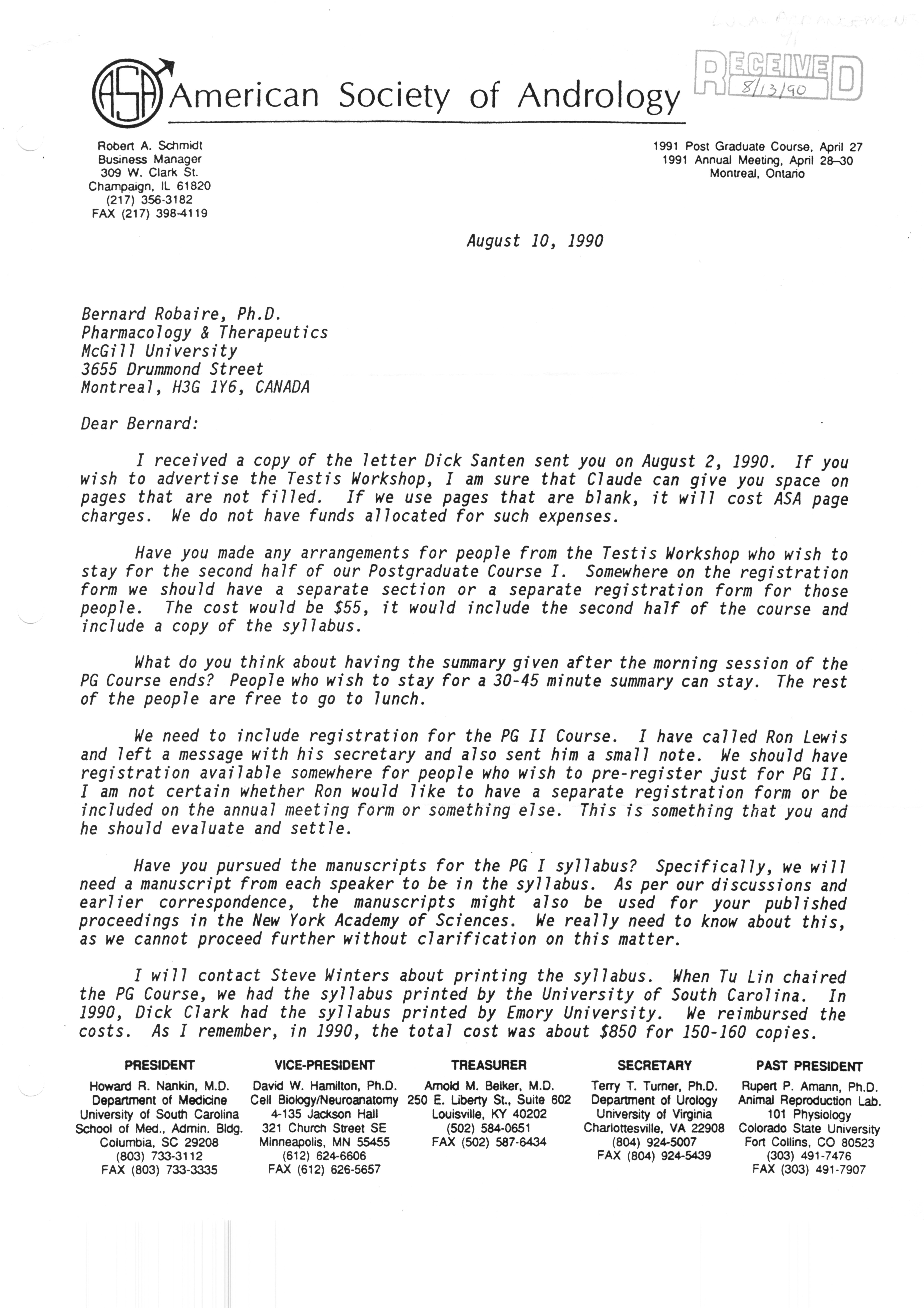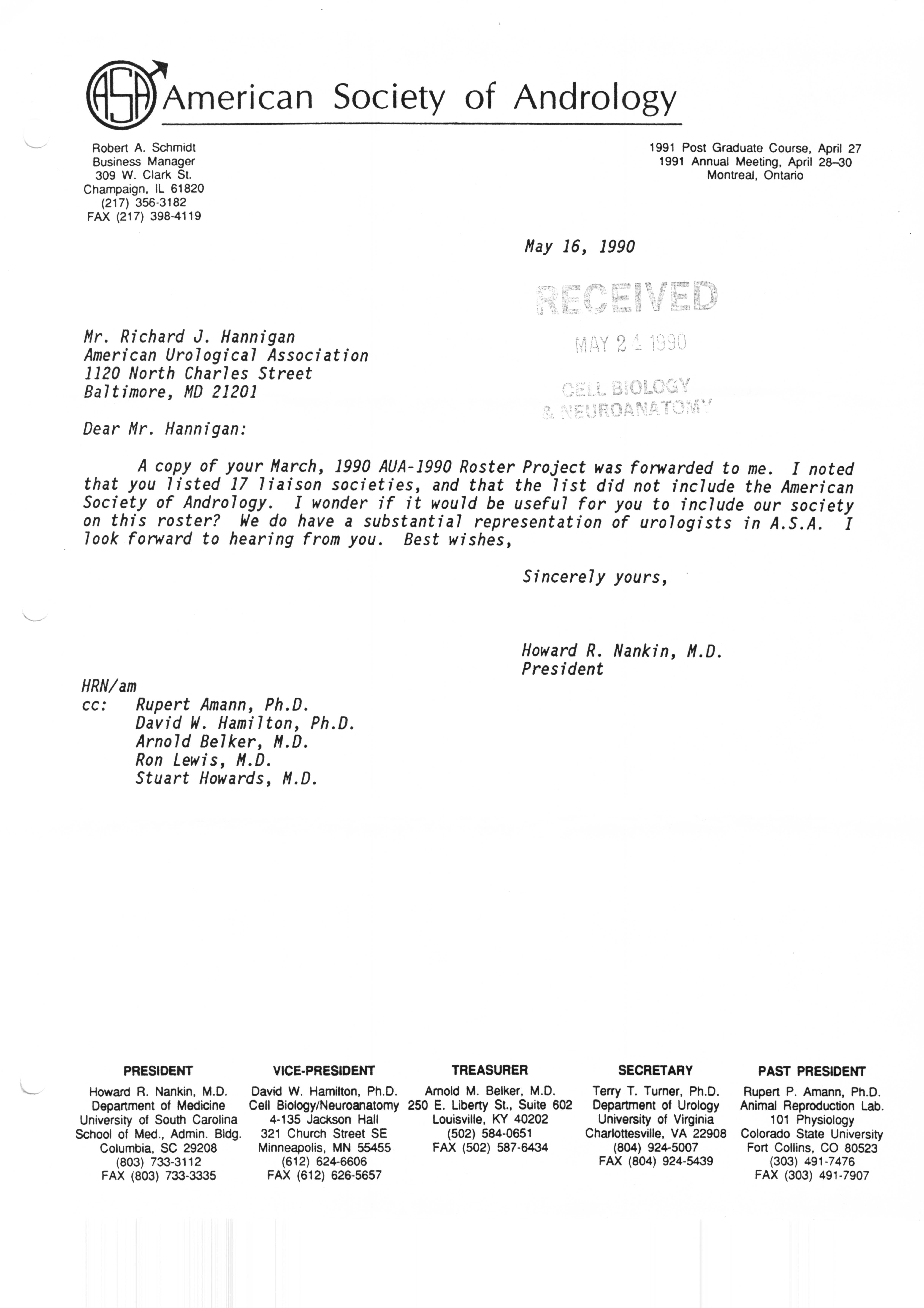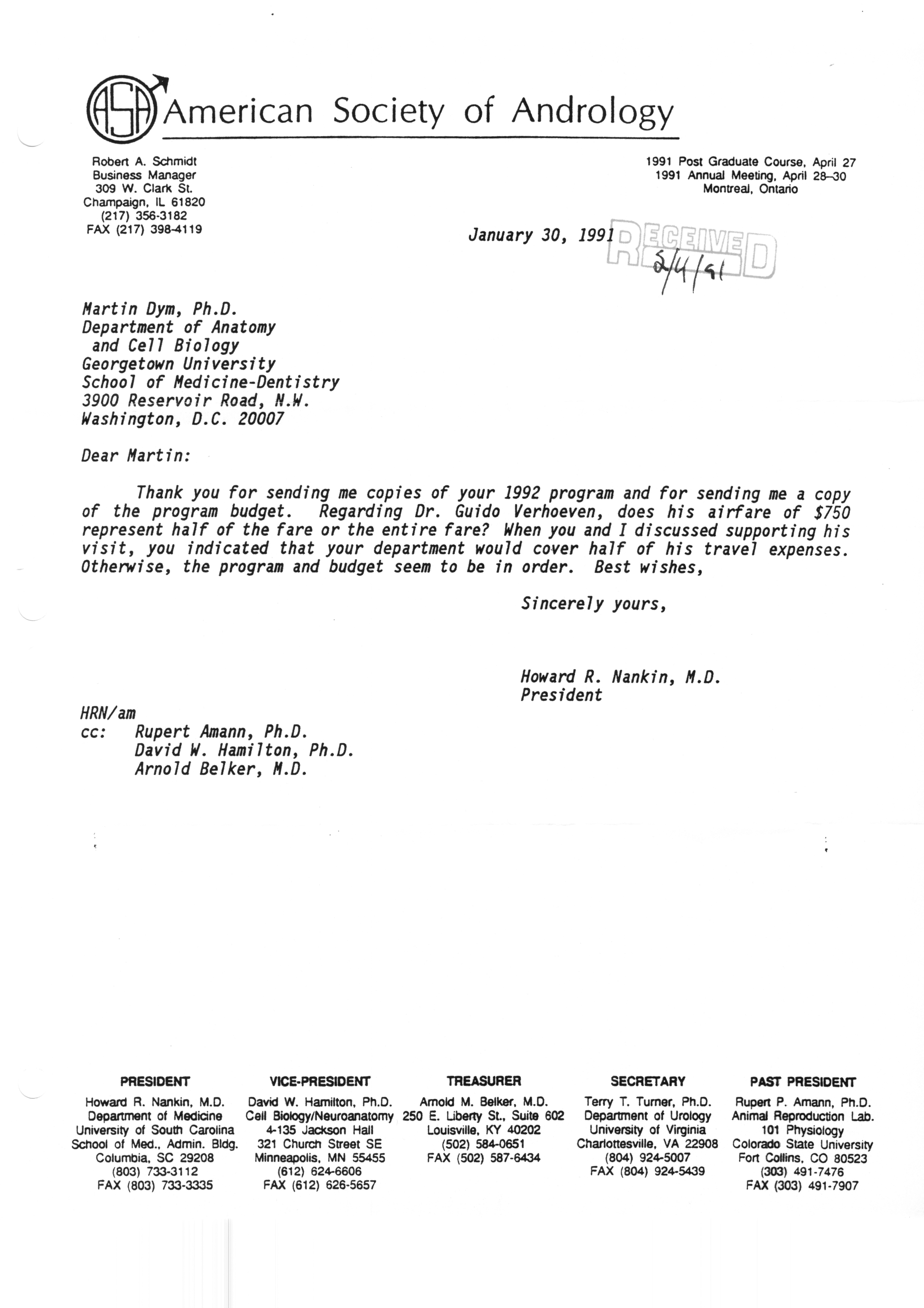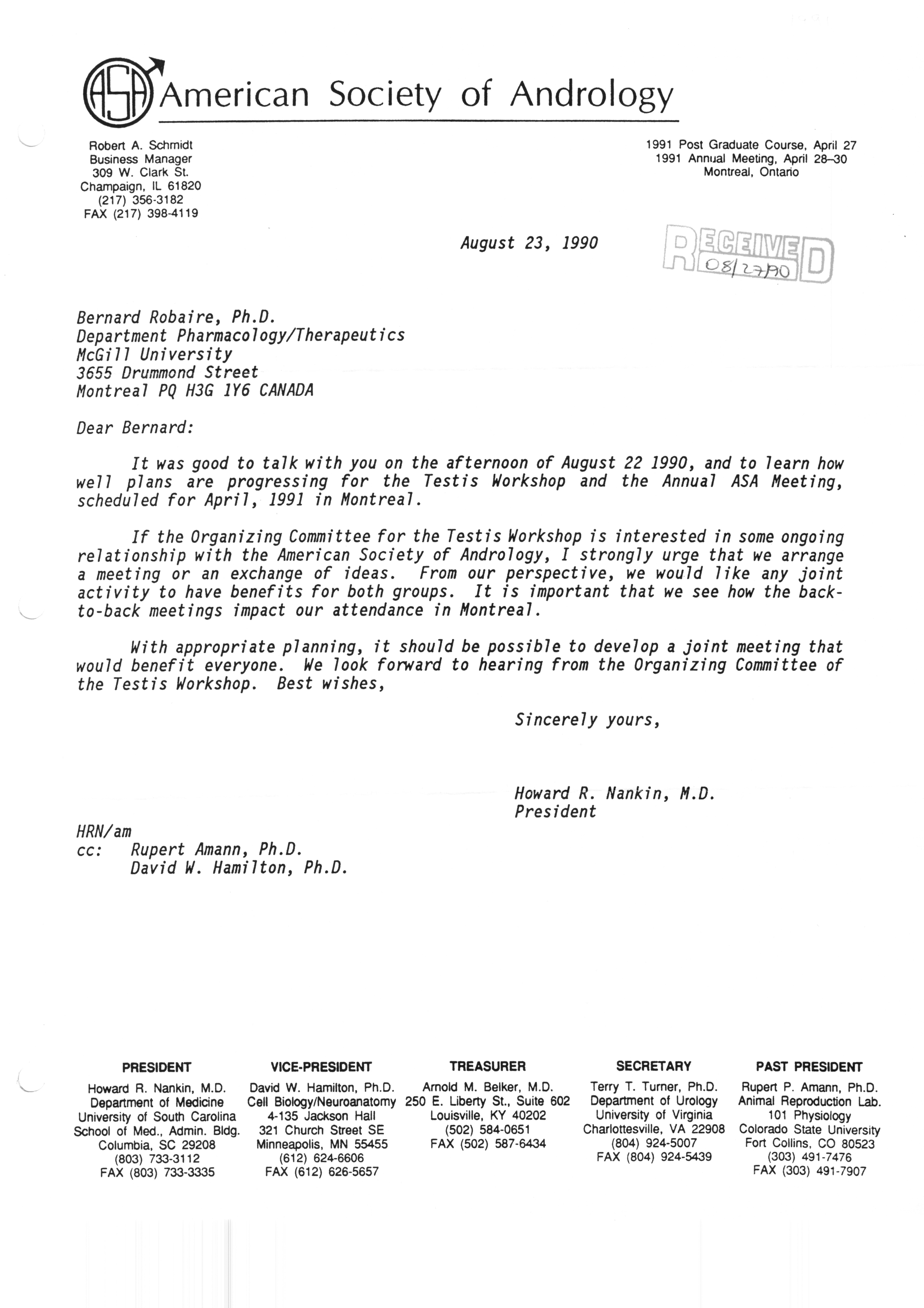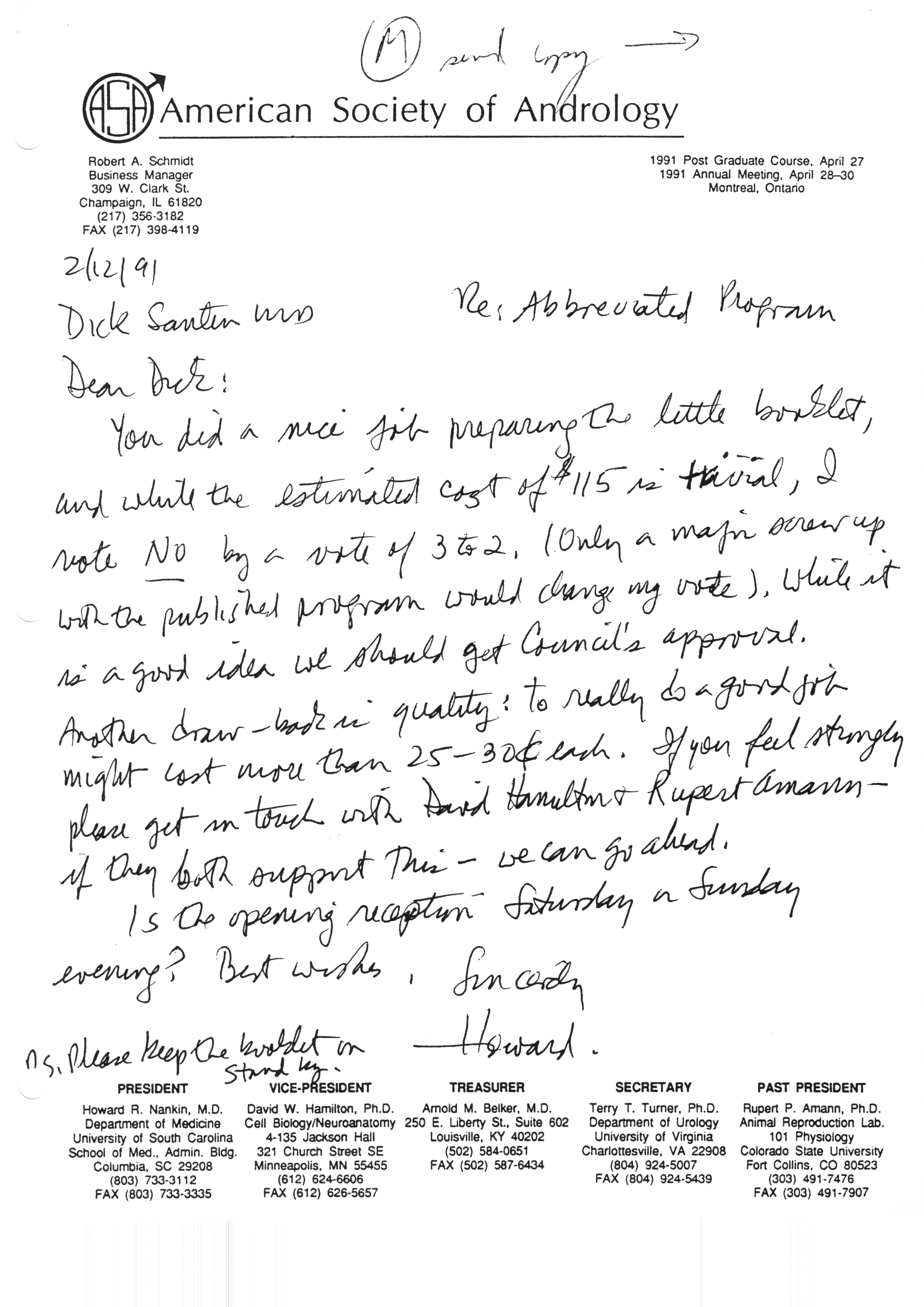 Executive Council Meetings correspondence of the American Society of Andrology, 1990