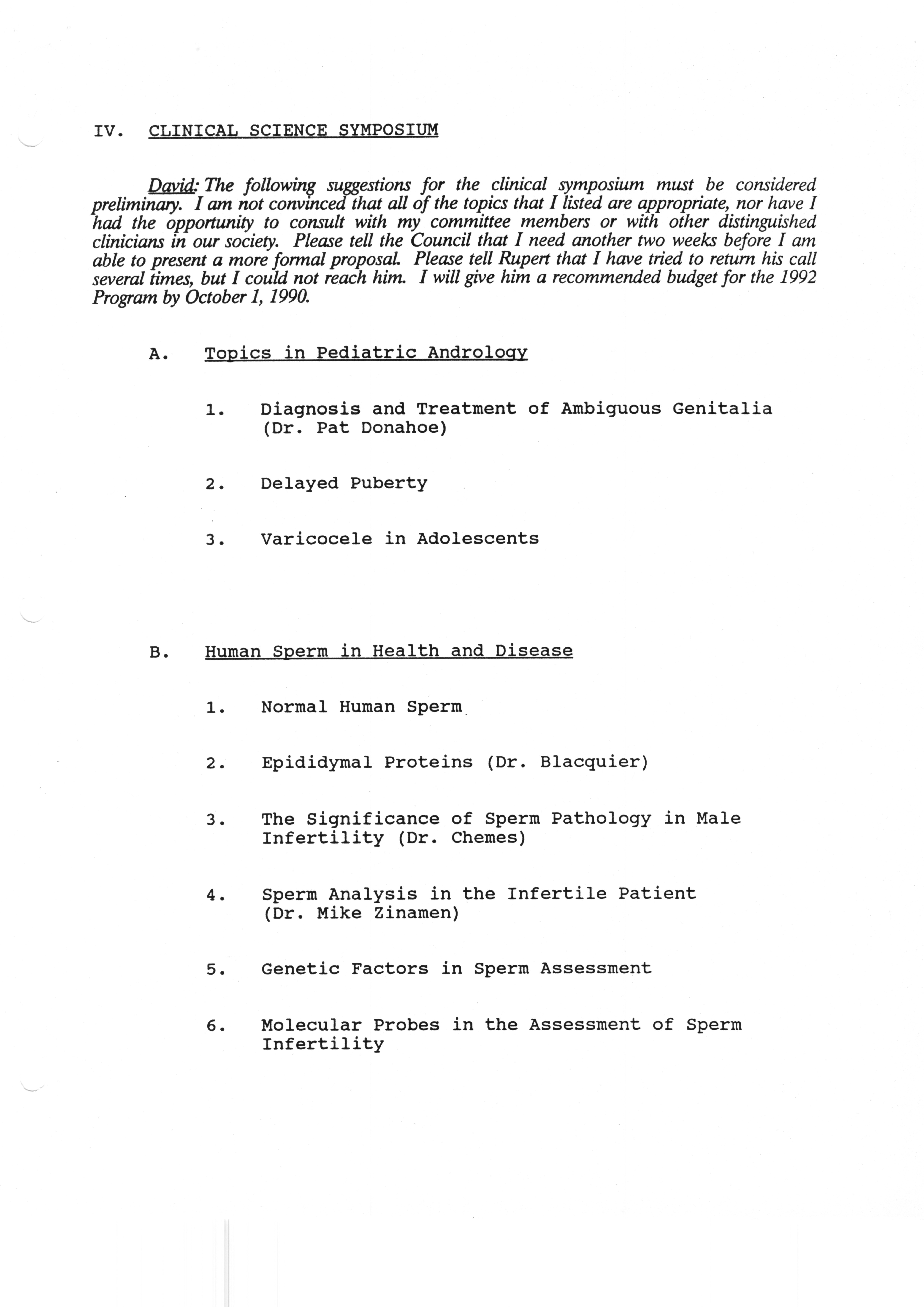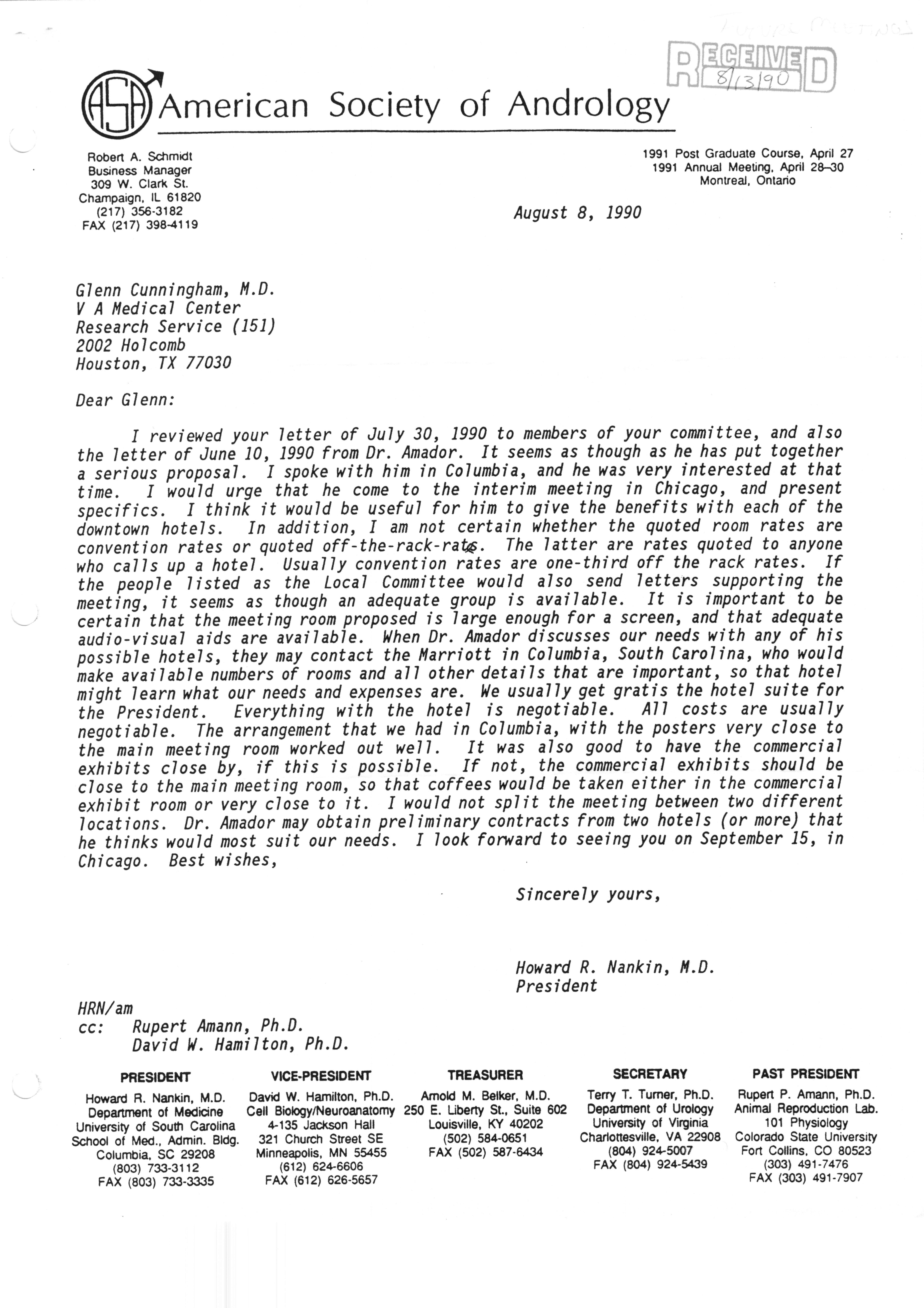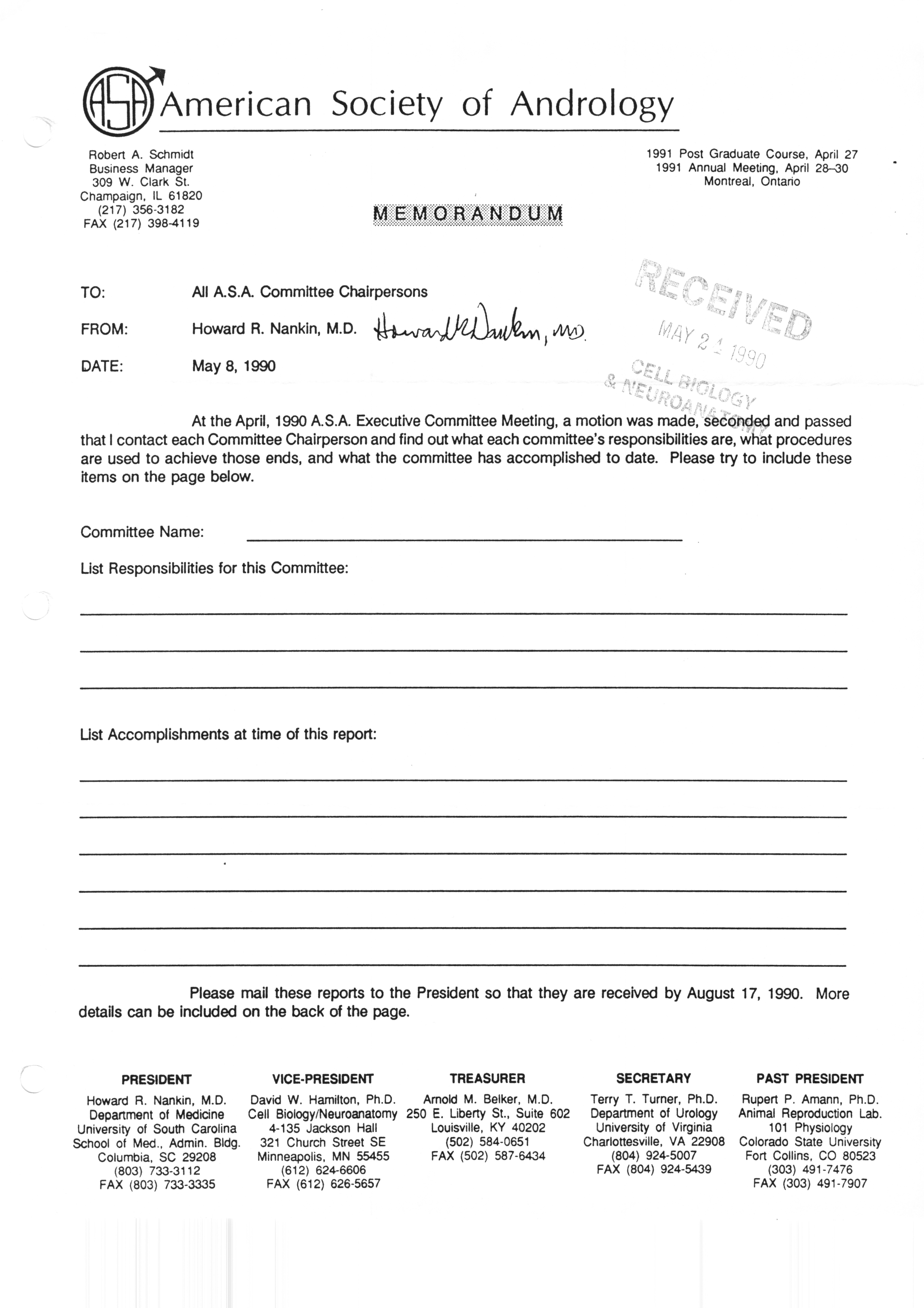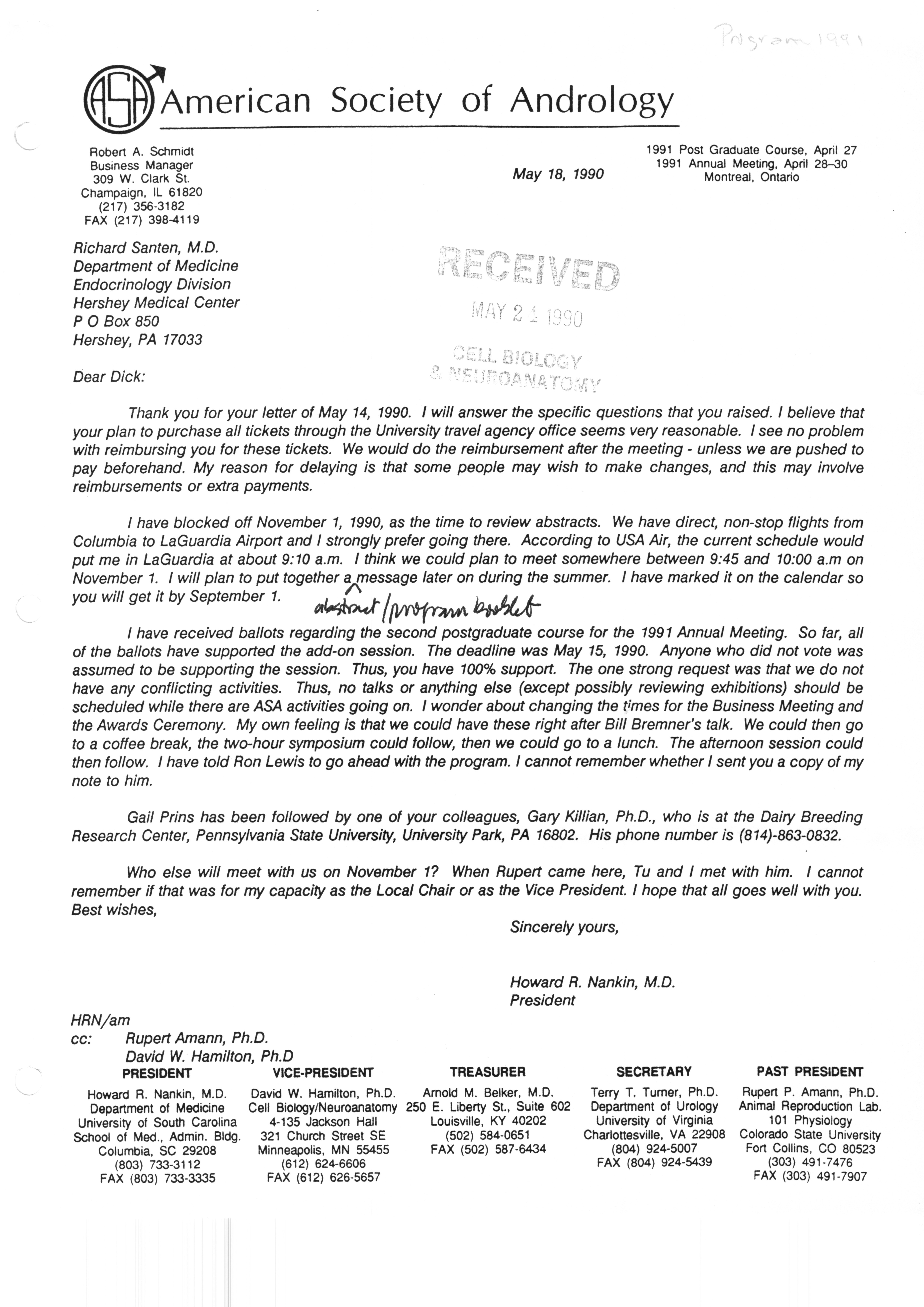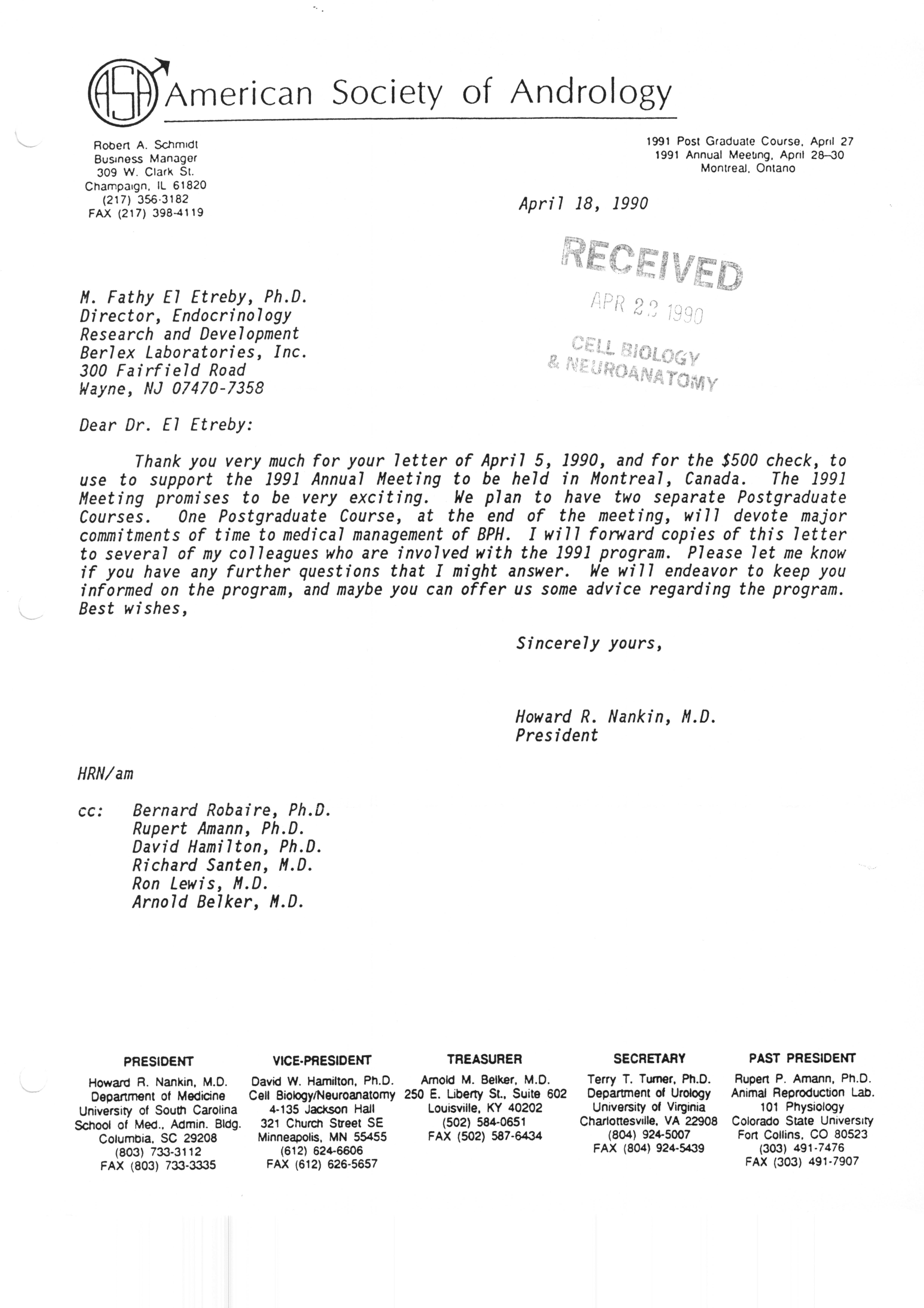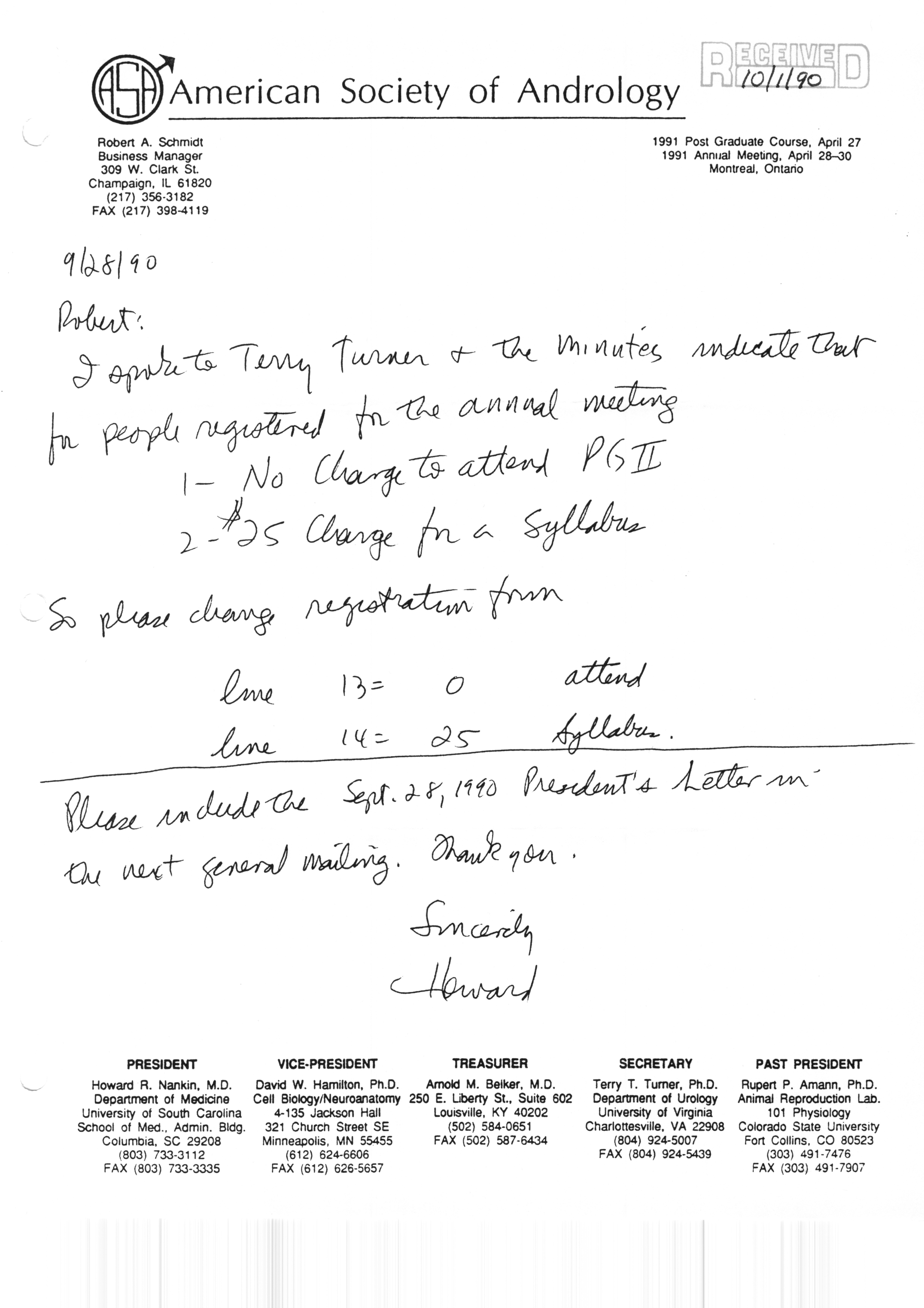 Executive Council Meetings correspondence of the American Society of Andrology, 1990