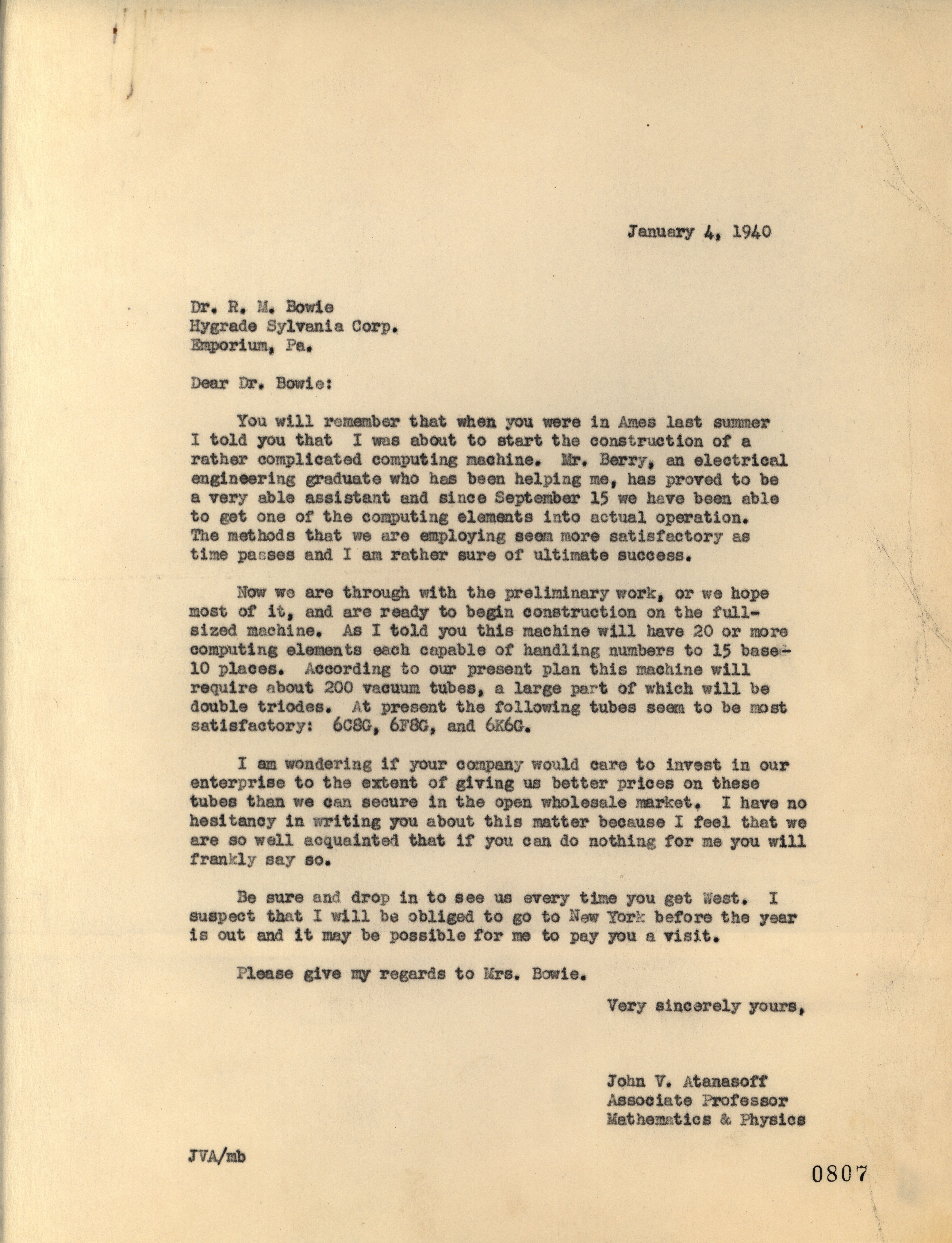 - Letter from John V. Atanasoff to R. M. Bowie of the Hygrade Sylvania Corporation regarding the purchase of vacuum tubes, January 4, 1940. The letter details the construction of a computing machine Atanasoff is building with the assistance of Mr. Berry and an inquiry about receiving a better price on vacuum tubes.