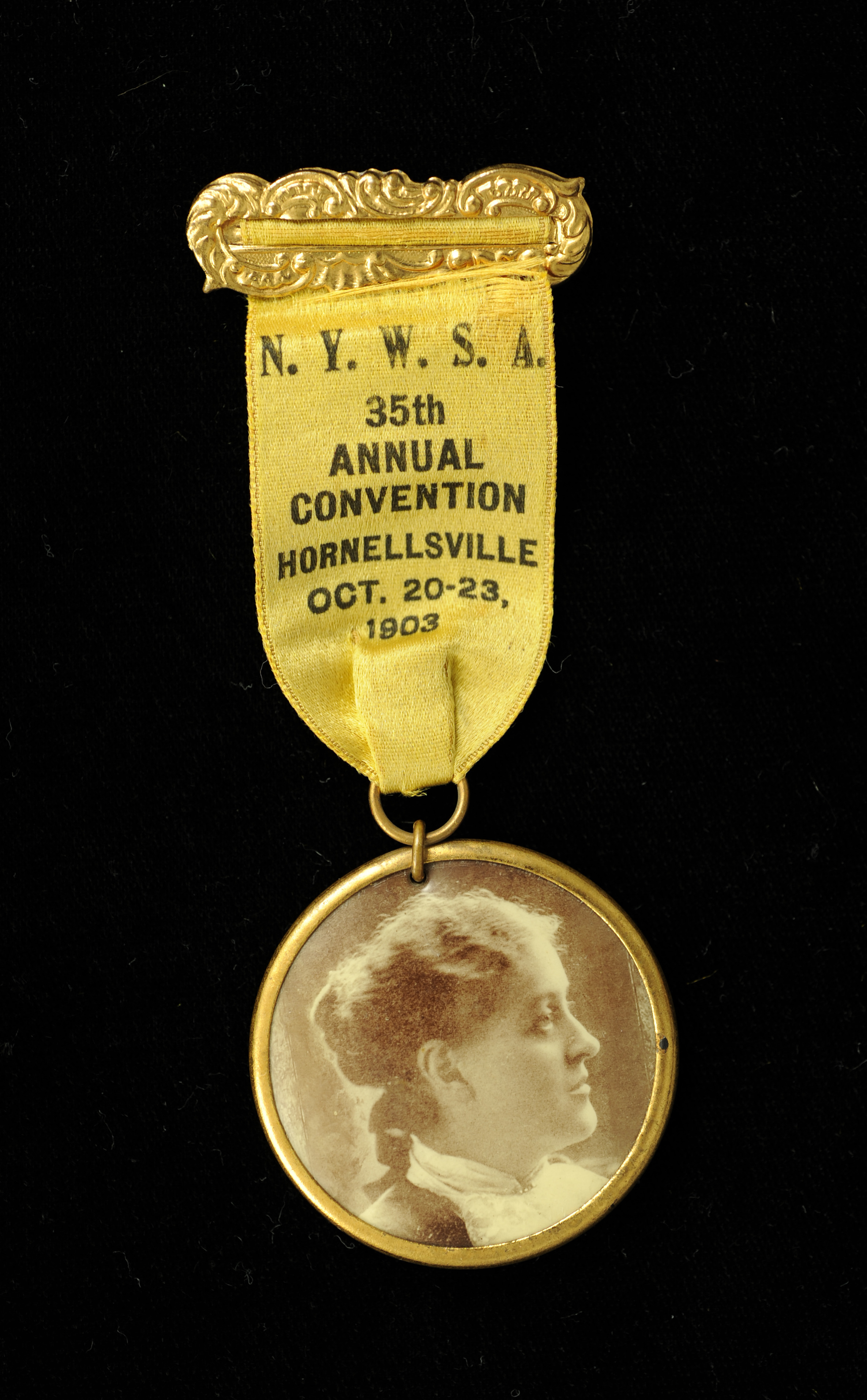 - Ribbon includes a small gold decorative rectangle that is at the top. Attached is a yellow ribbon with "N. Y. W. S. A. 35th Annual Convention Hornellsville Oct. 20-23, 1903" in black letter. Attached at the bottom of the ribbon is a round photograph of Carrie Chapman Catt framed by a gold ring. The back of the image has "PRESIDENT N.A.W.S.A. Carrie C. Catt" in blue lettering.