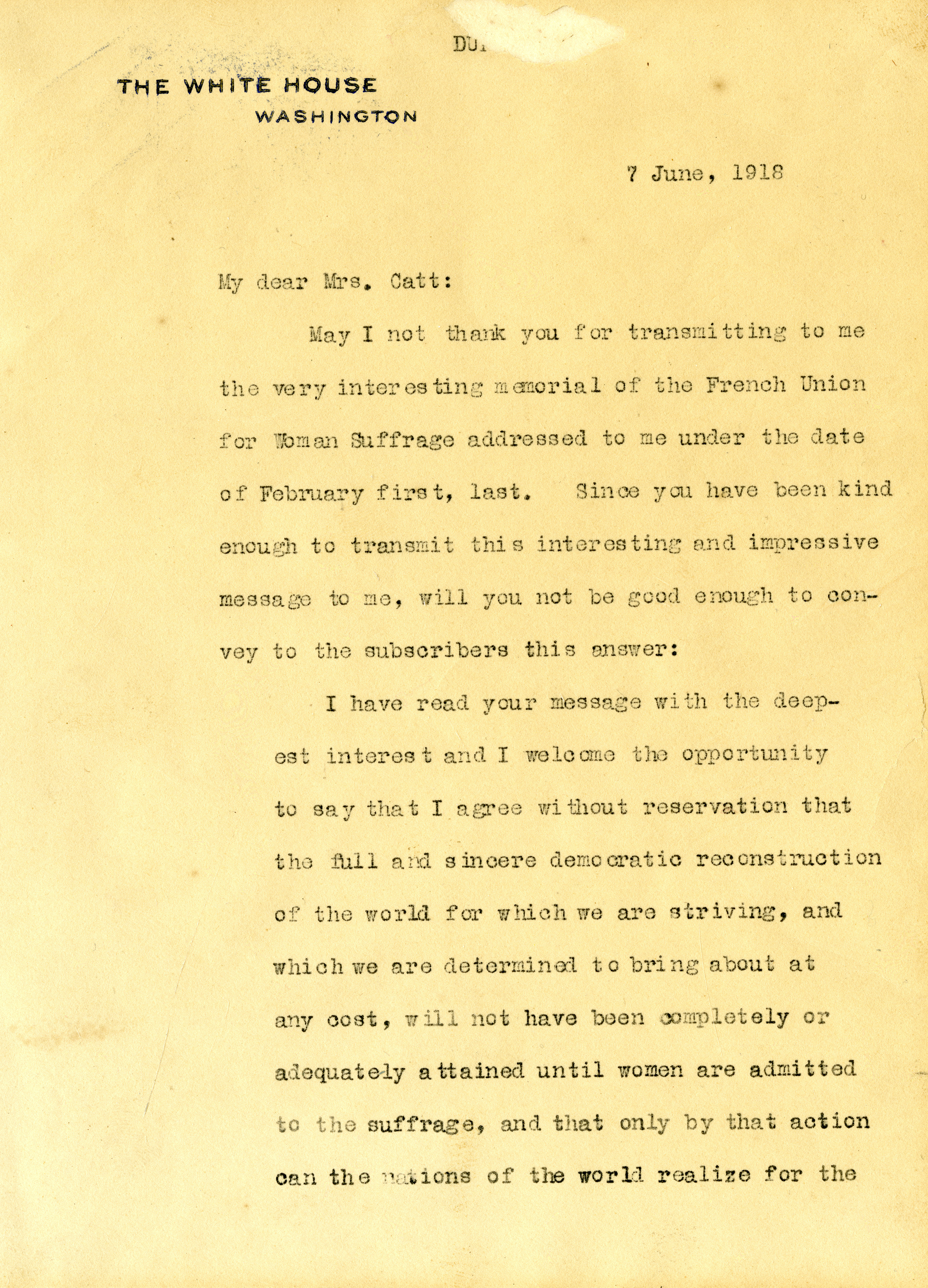 - Woodrow Wilson letter to Carrie Chapman Catt, June 7, 1918