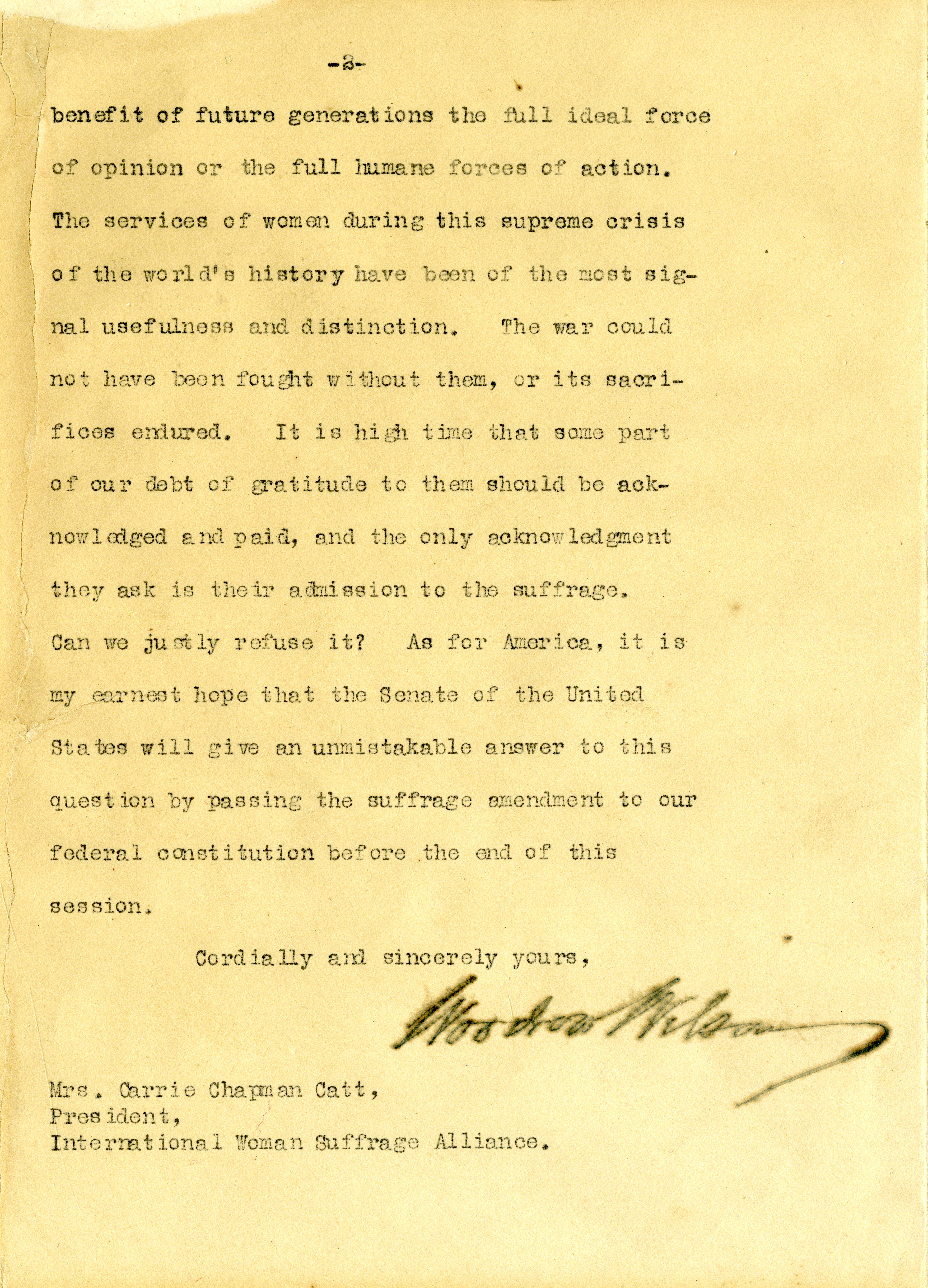 - Letter from President Woodrow Wilson to Carrie Chapman Catt in which he expresses support for women's suffrage.