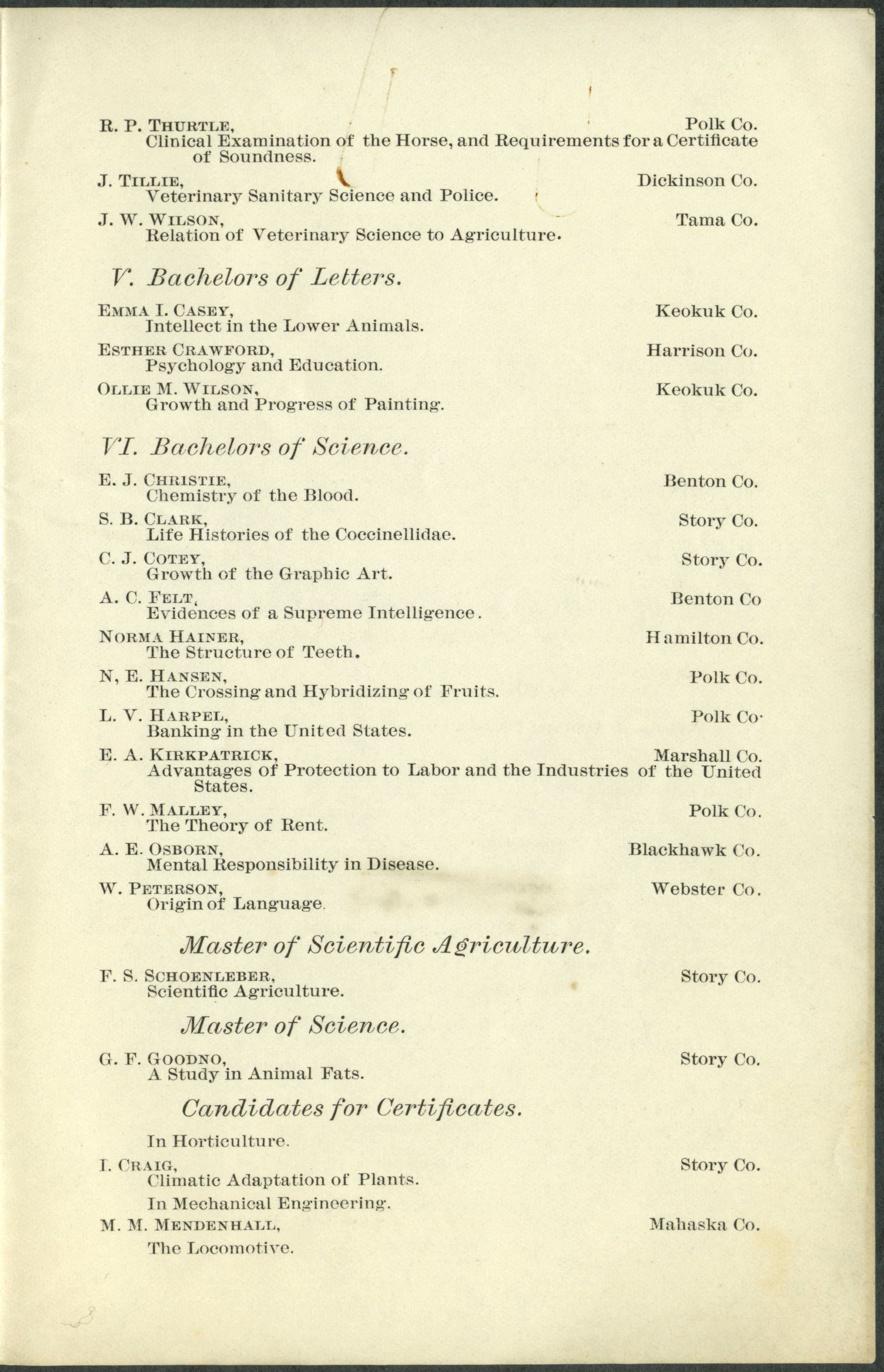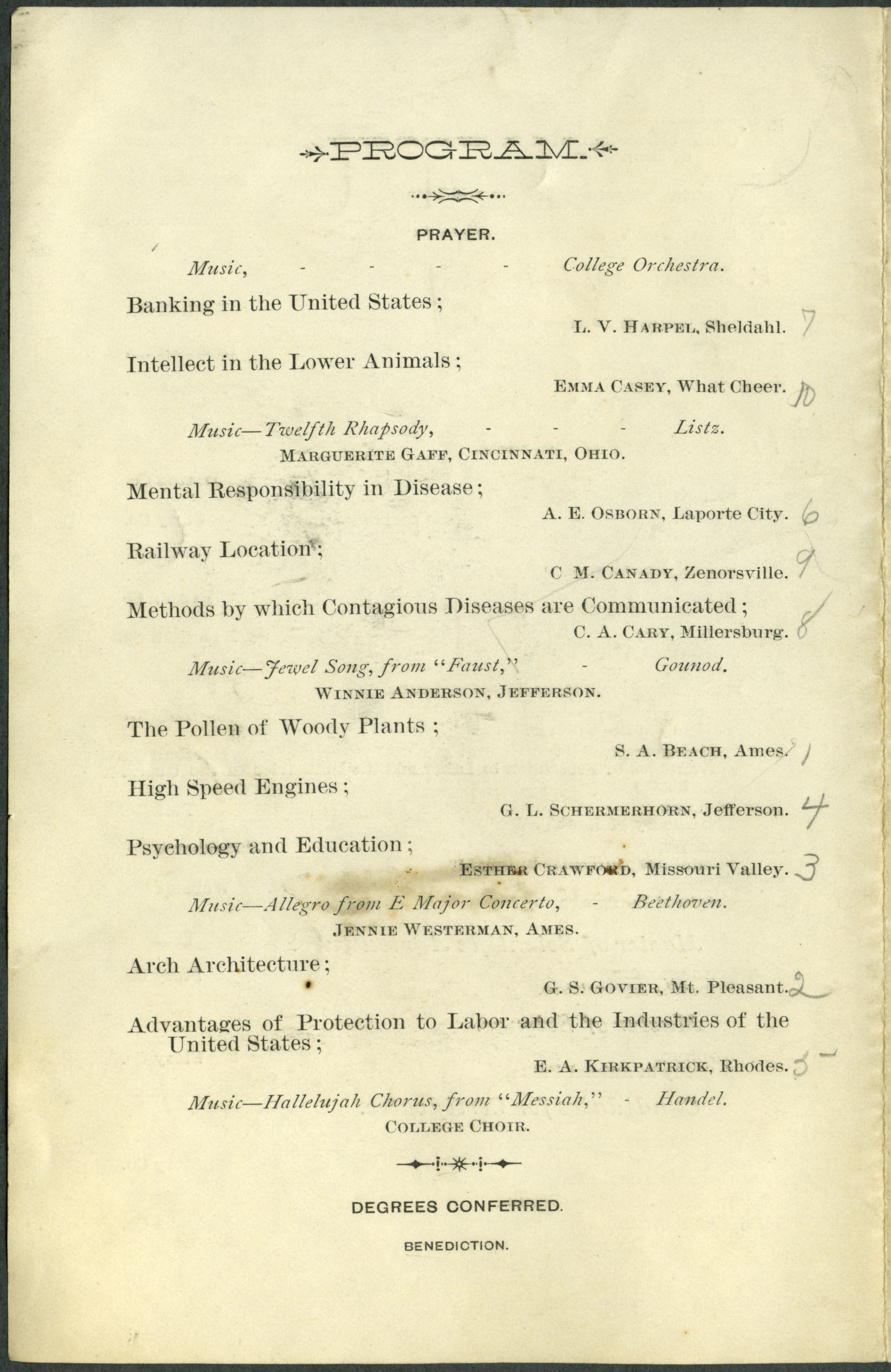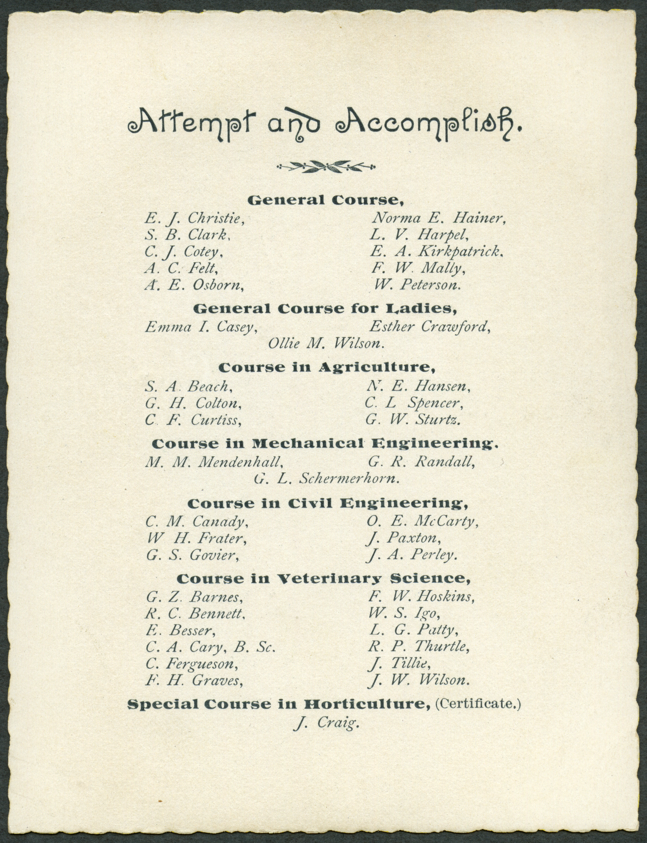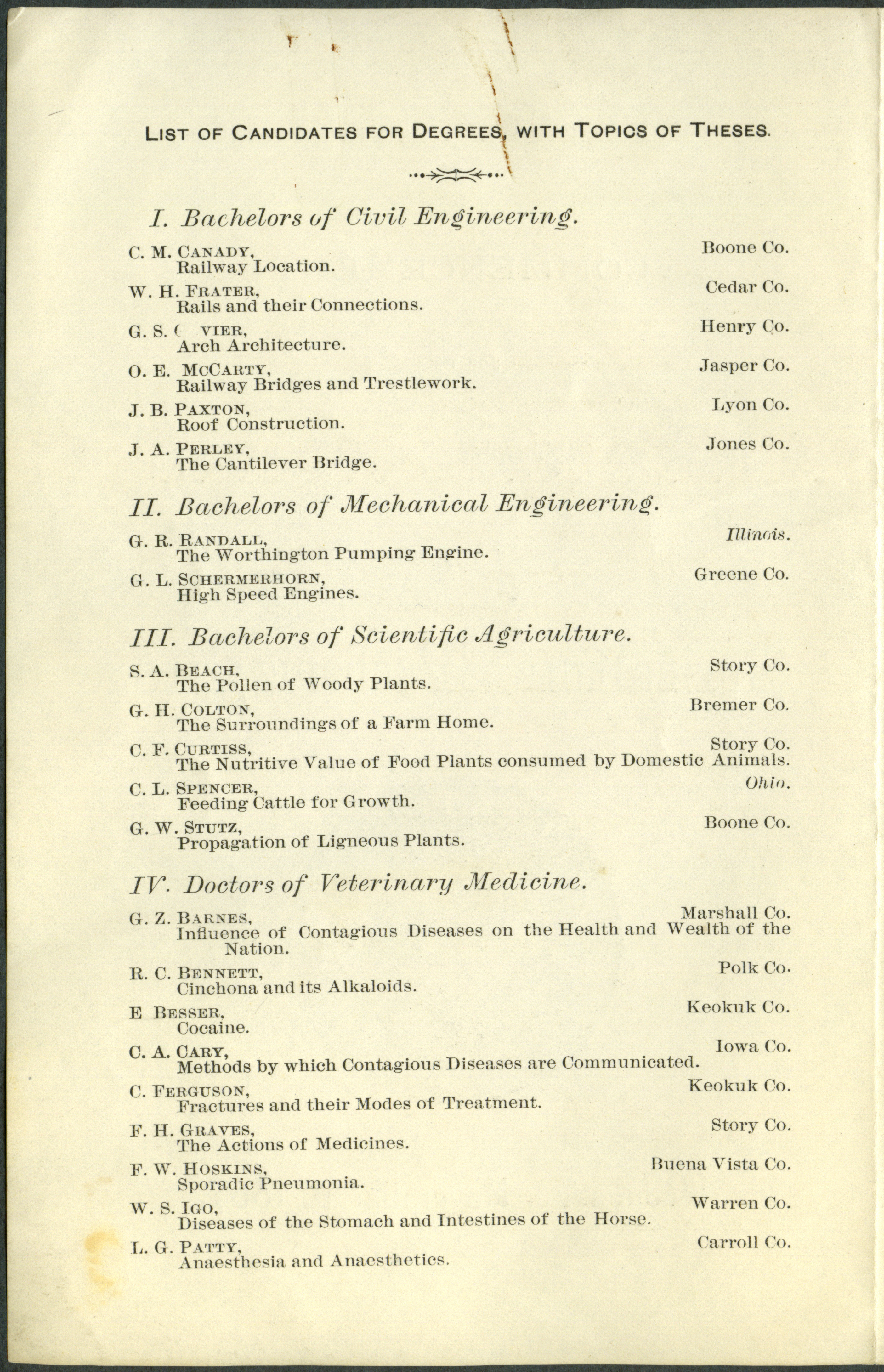 - "Commencement of the Iowa State College of Agriculture and Mechanic Arts, 1887", Iowa State University Commencement Programs, Iowa State University Library Digital Collections