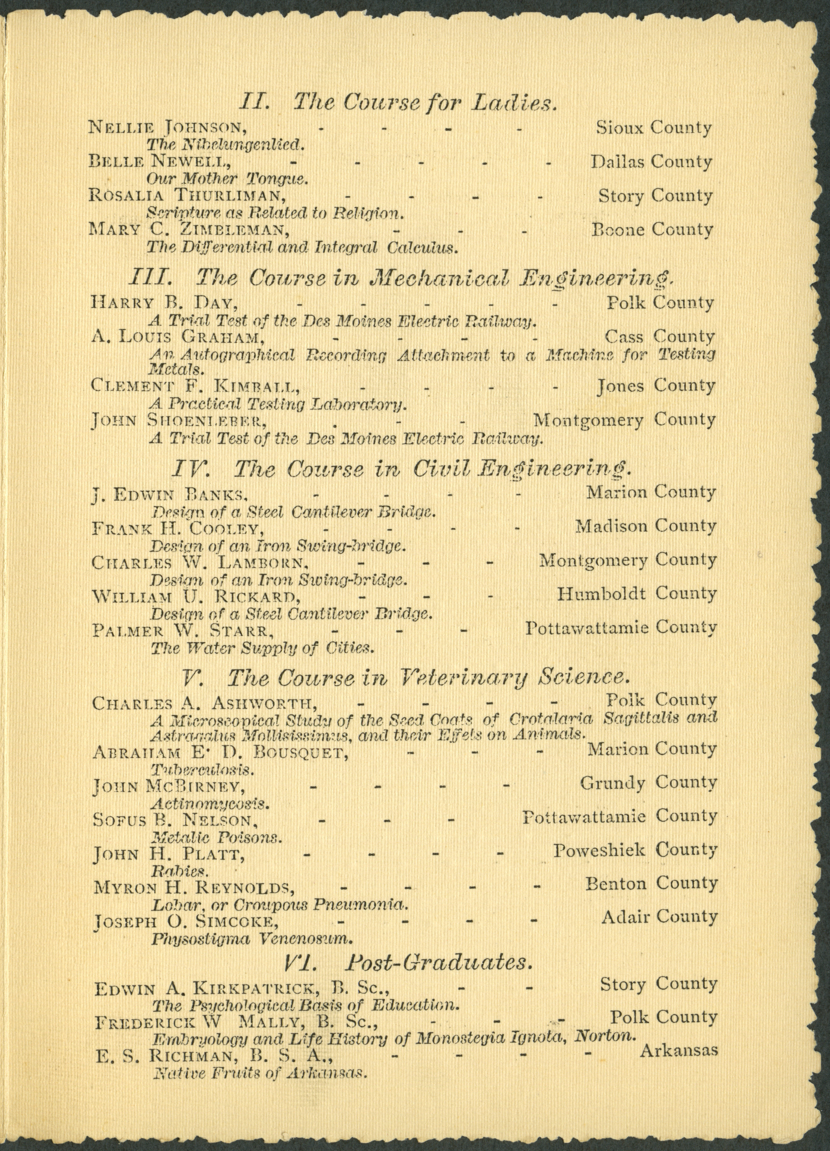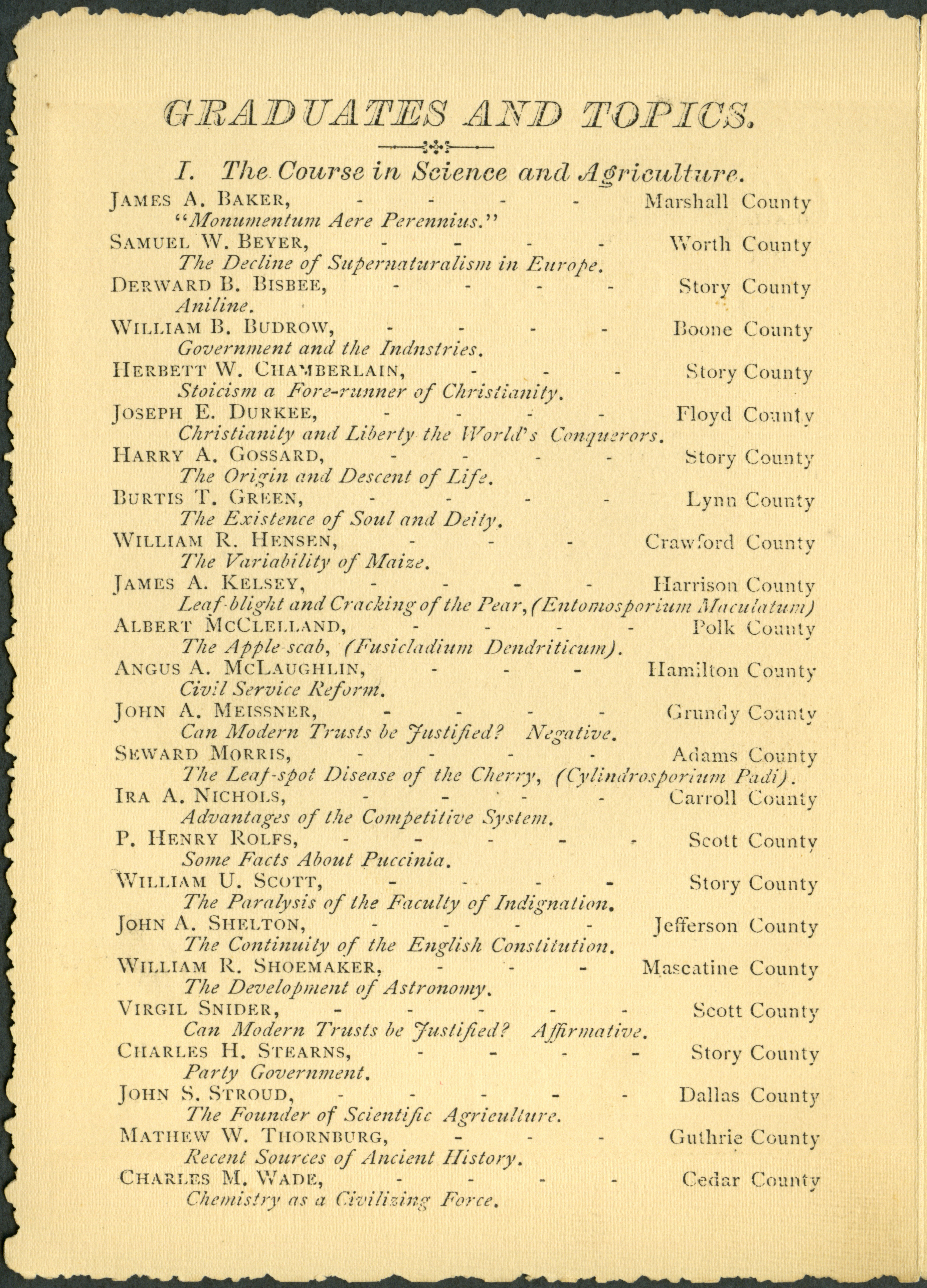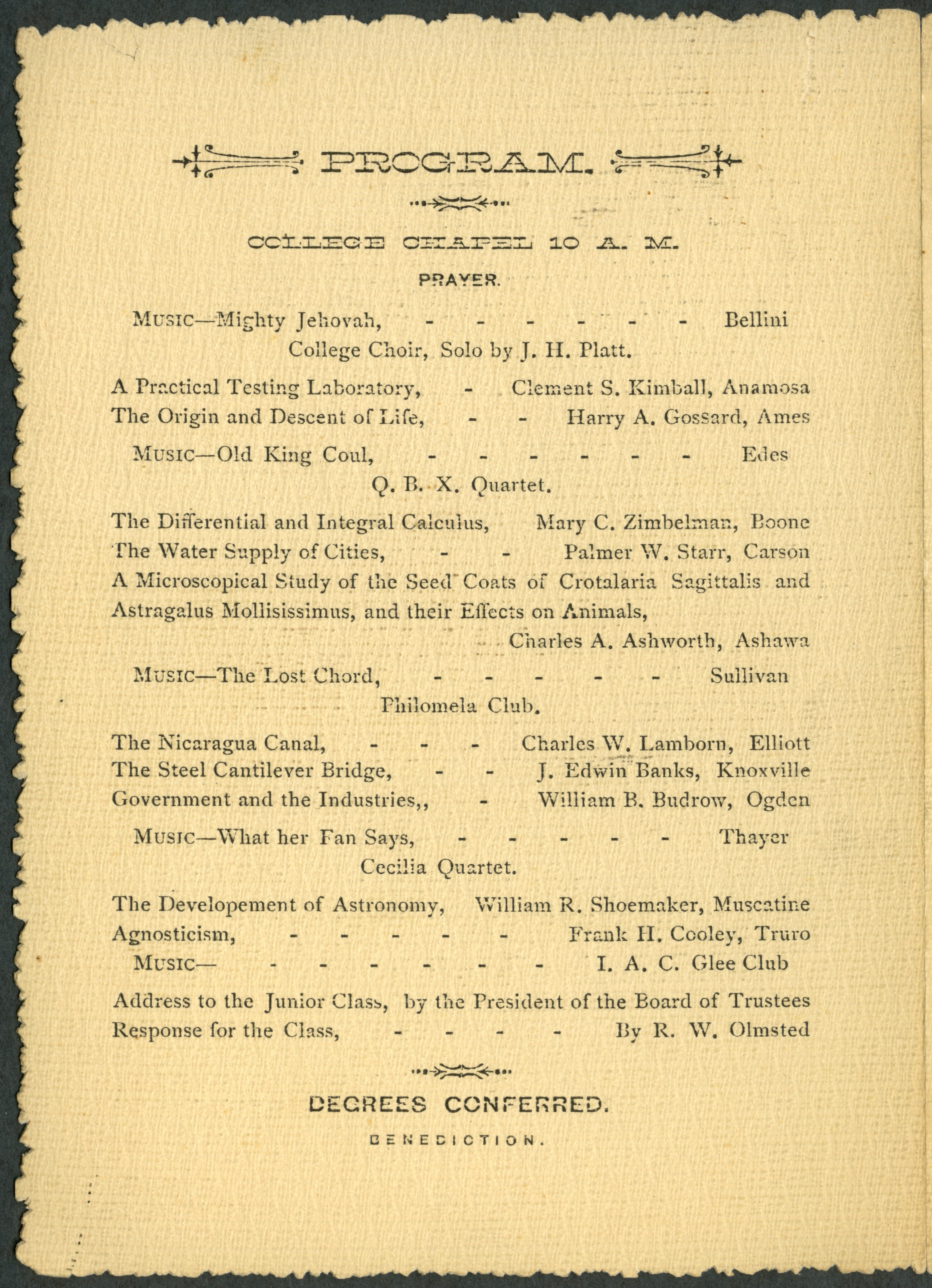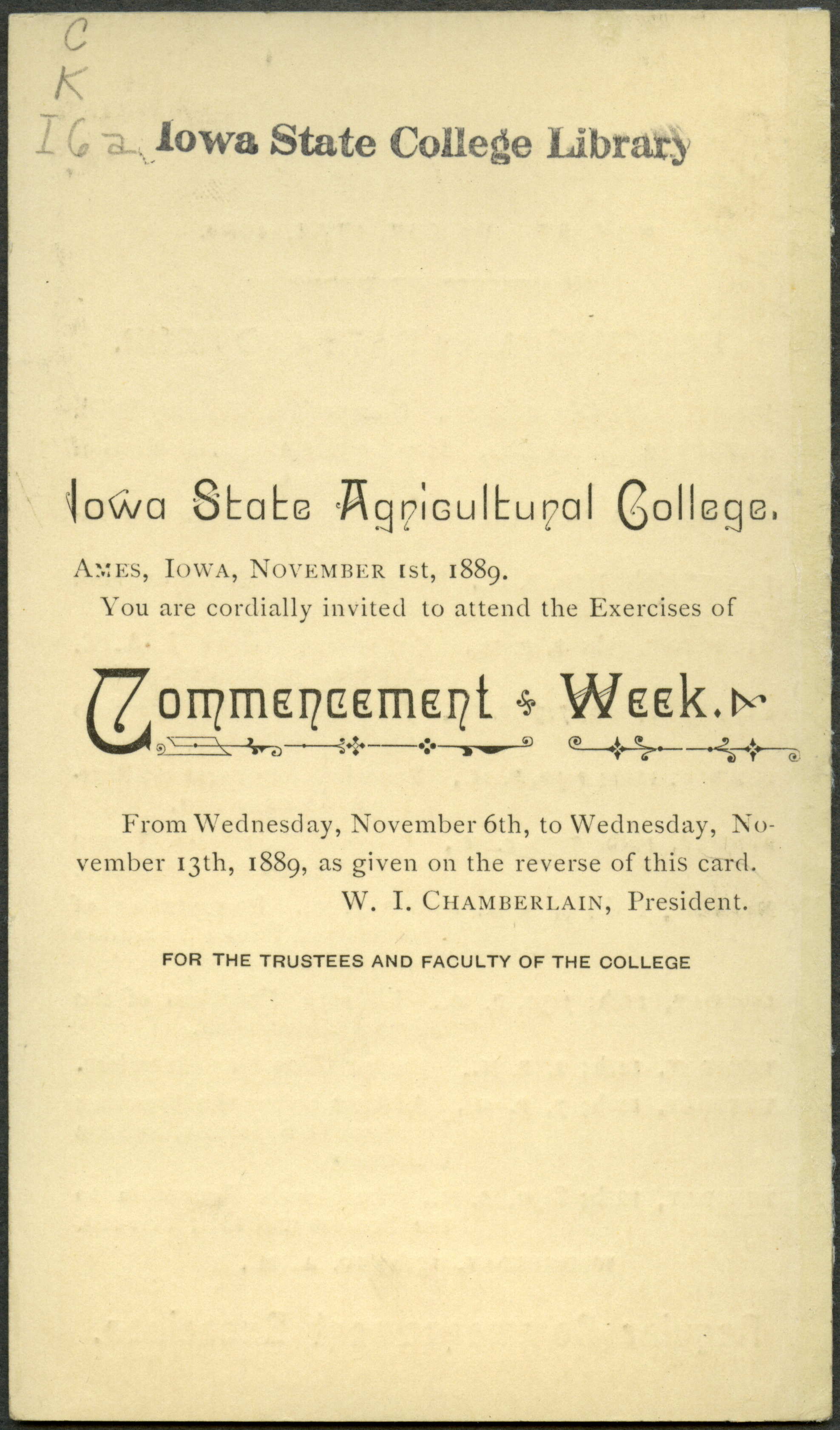 - "Commencement, State Agricultural College, 1889", Iowa State University Commencement Programs, Iowa State University Library Digital Collections
