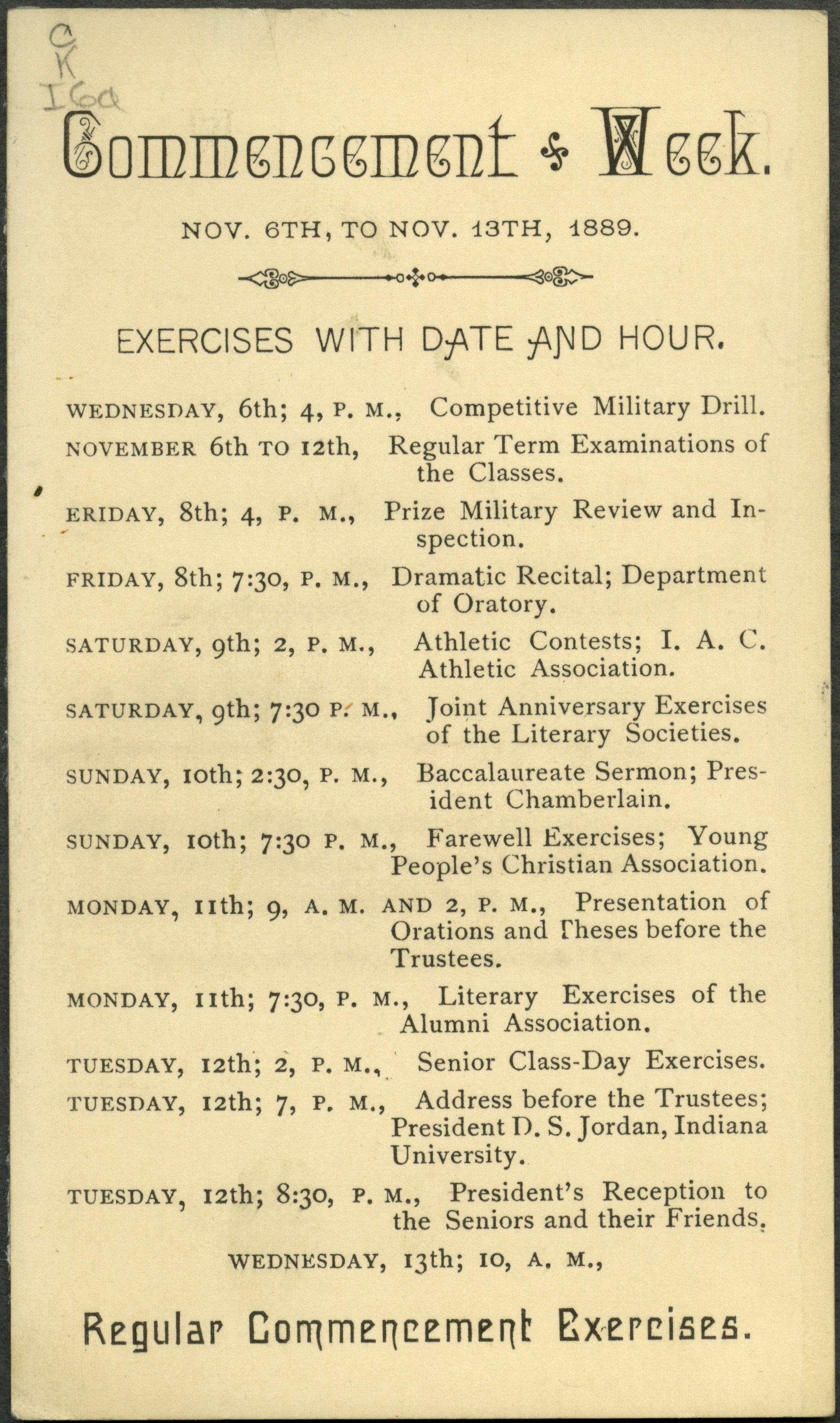 - Includes commencement program, invitation and list of commencement week activities, held November 6th-13th, 1889.
