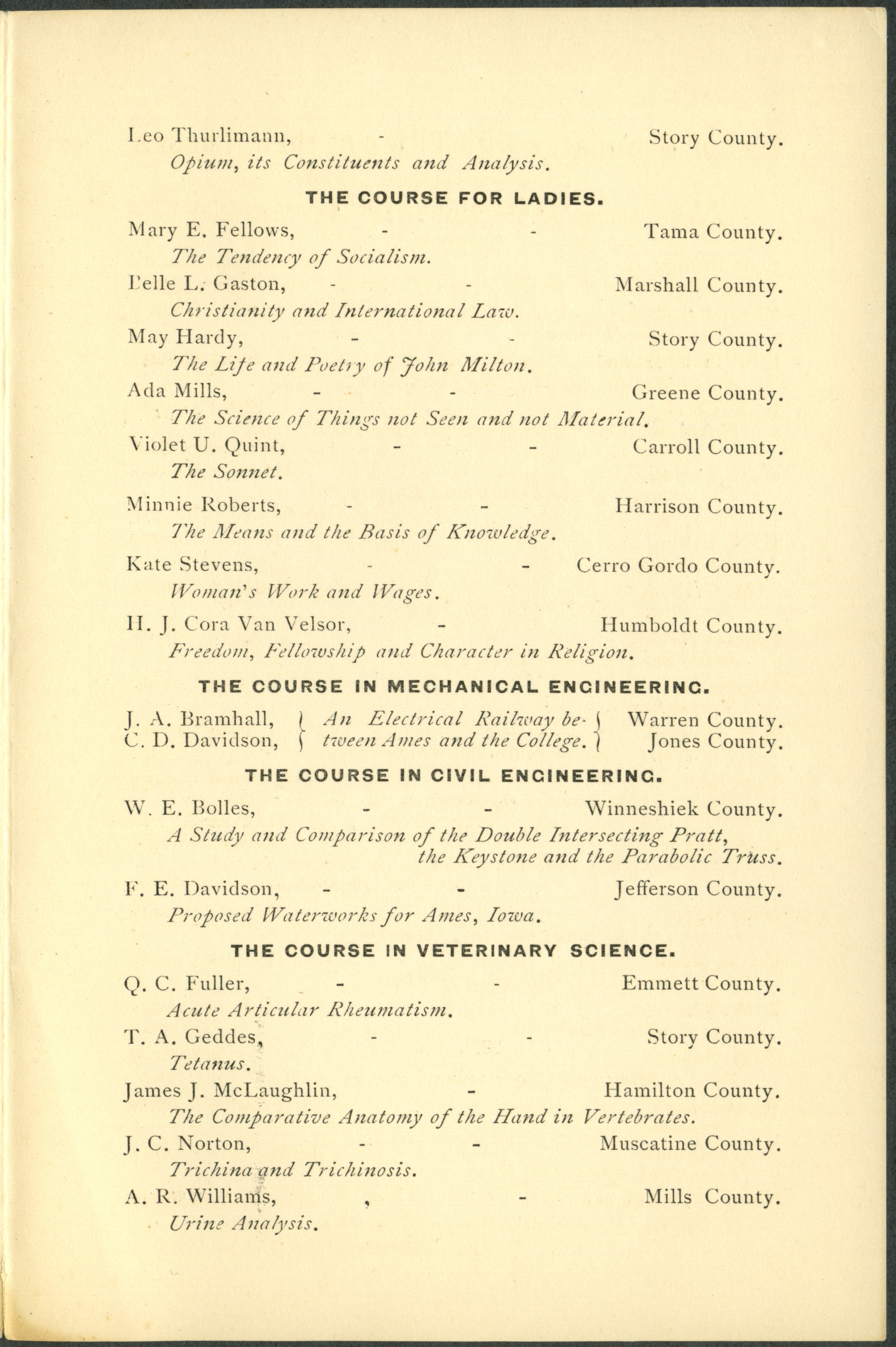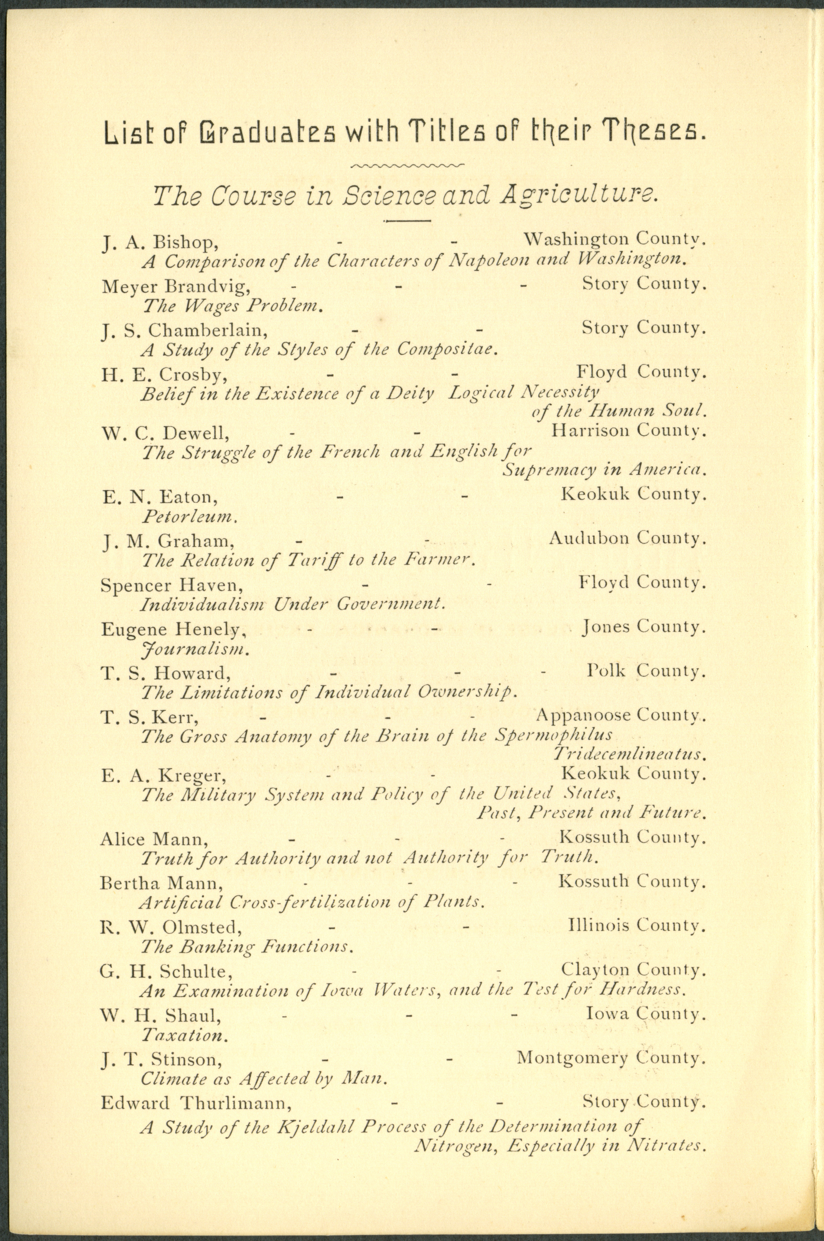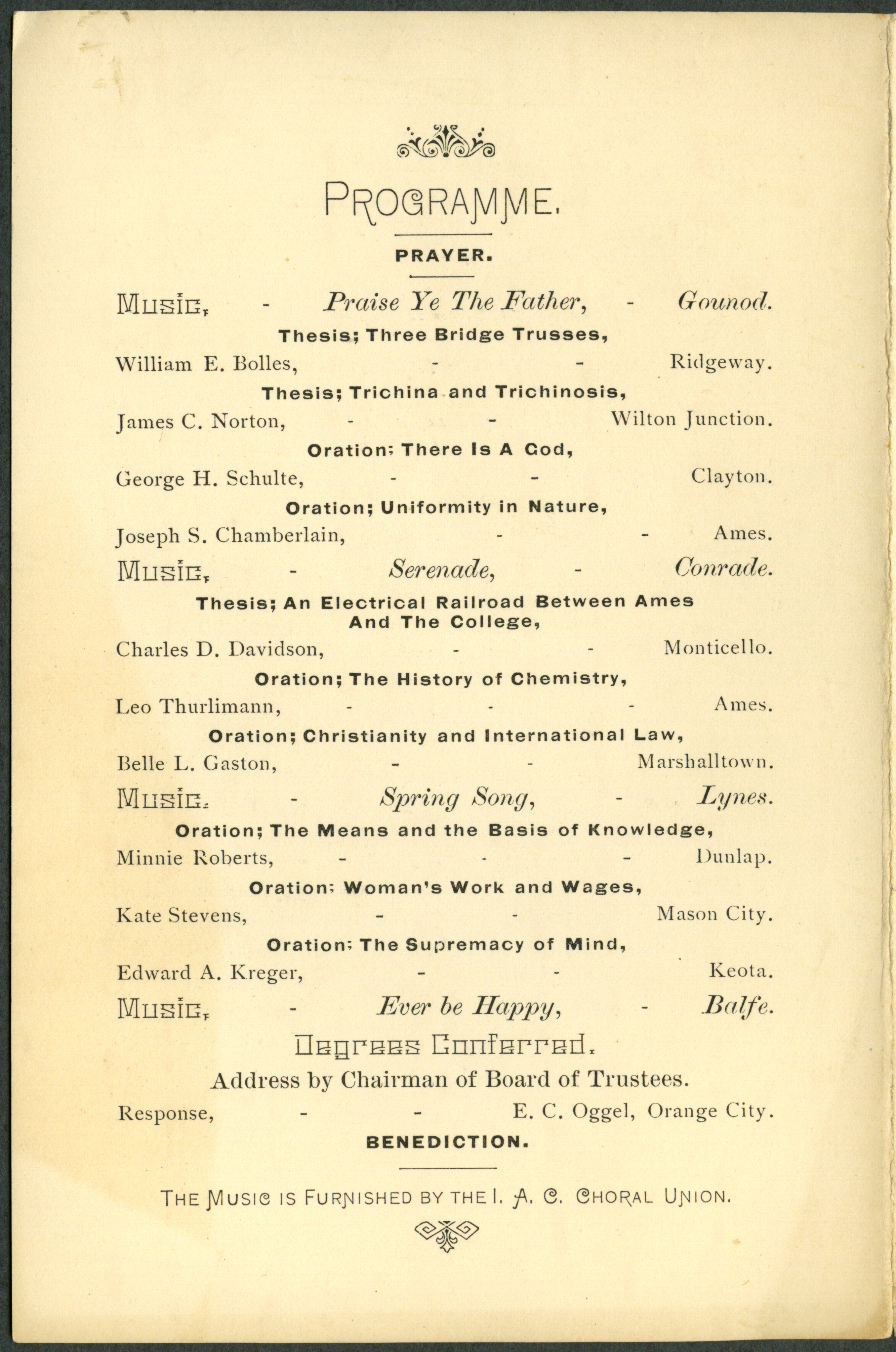 - "Nineteenth annual commencement, Iowa Agricultural College, 1890", Iowa State University Commencement Programs, Iowa State University Library Digital Collections