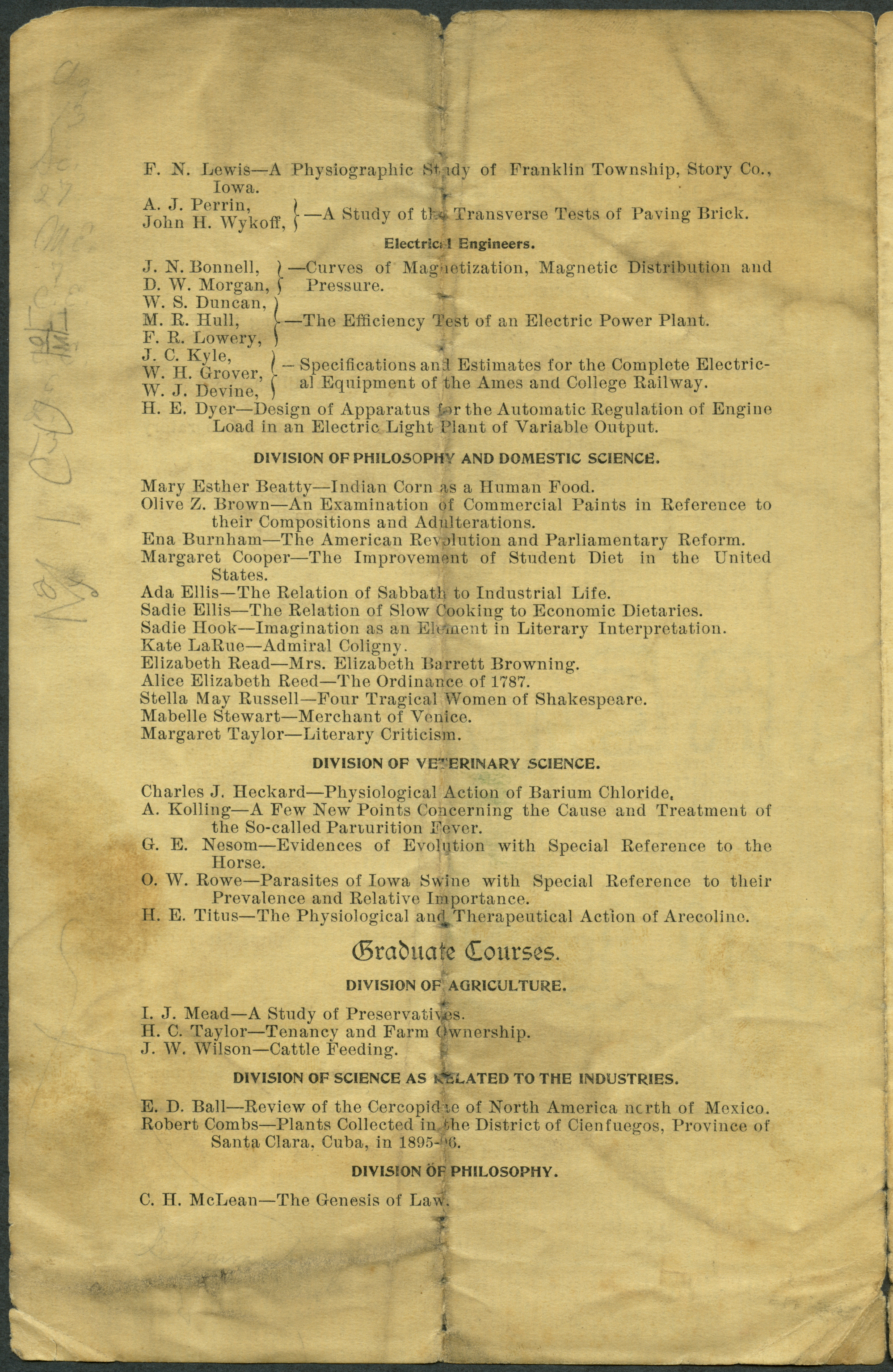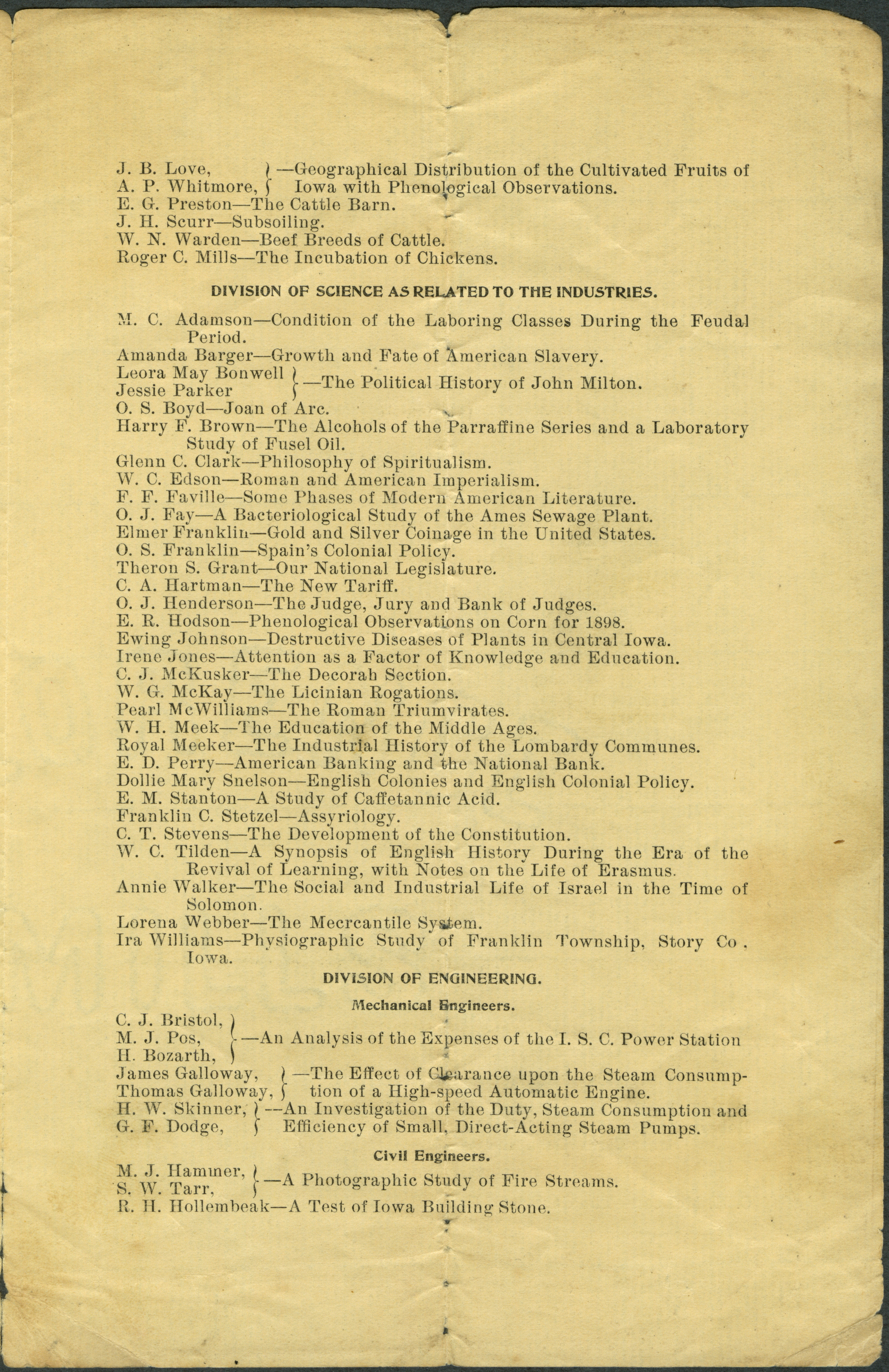 - "Annual commencement, Iowa State College of Agriculture and Mechanic Arts, 1898", Iowa State University Commencement Programs, Iowa State University Library Digital Collections