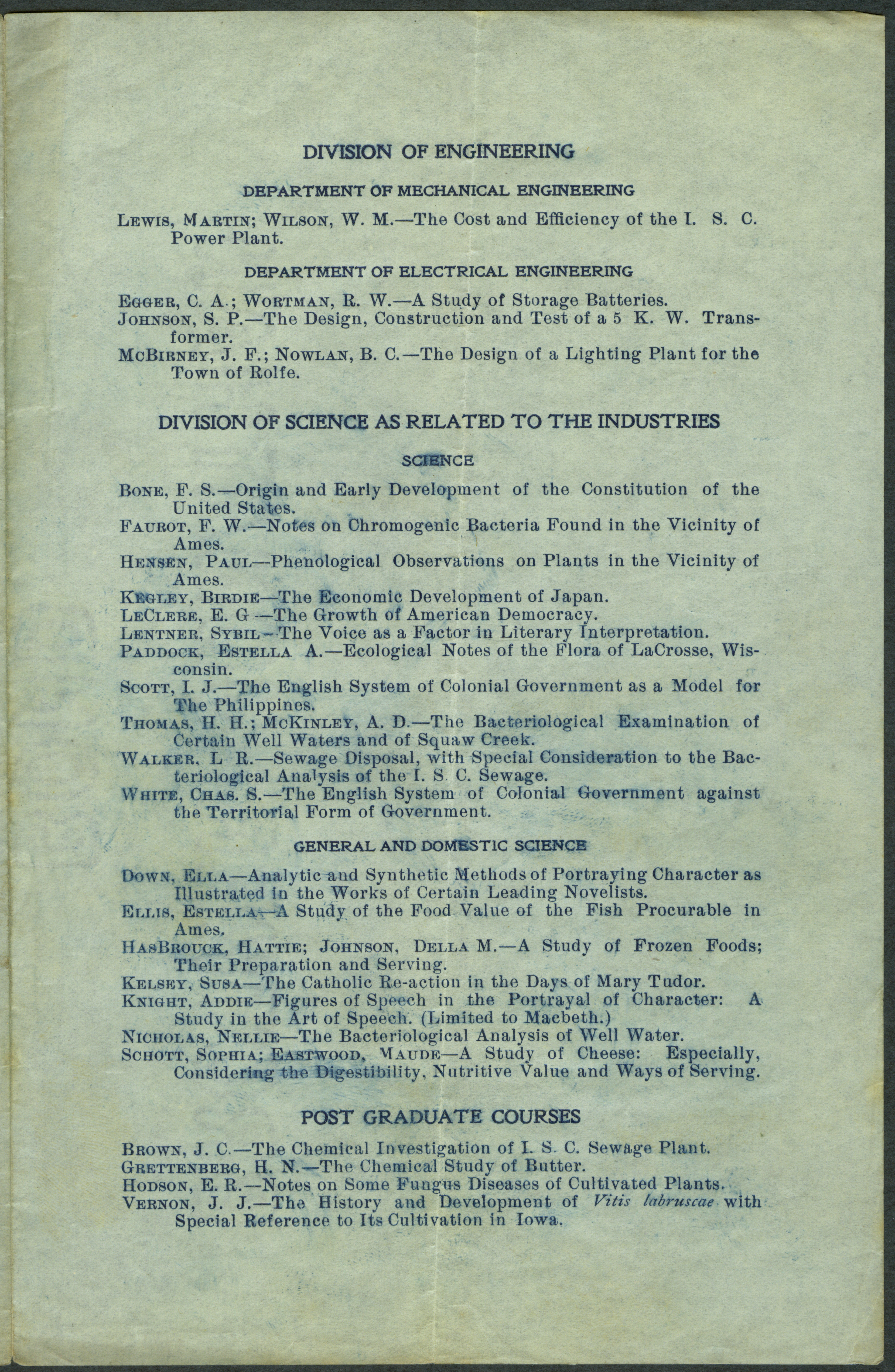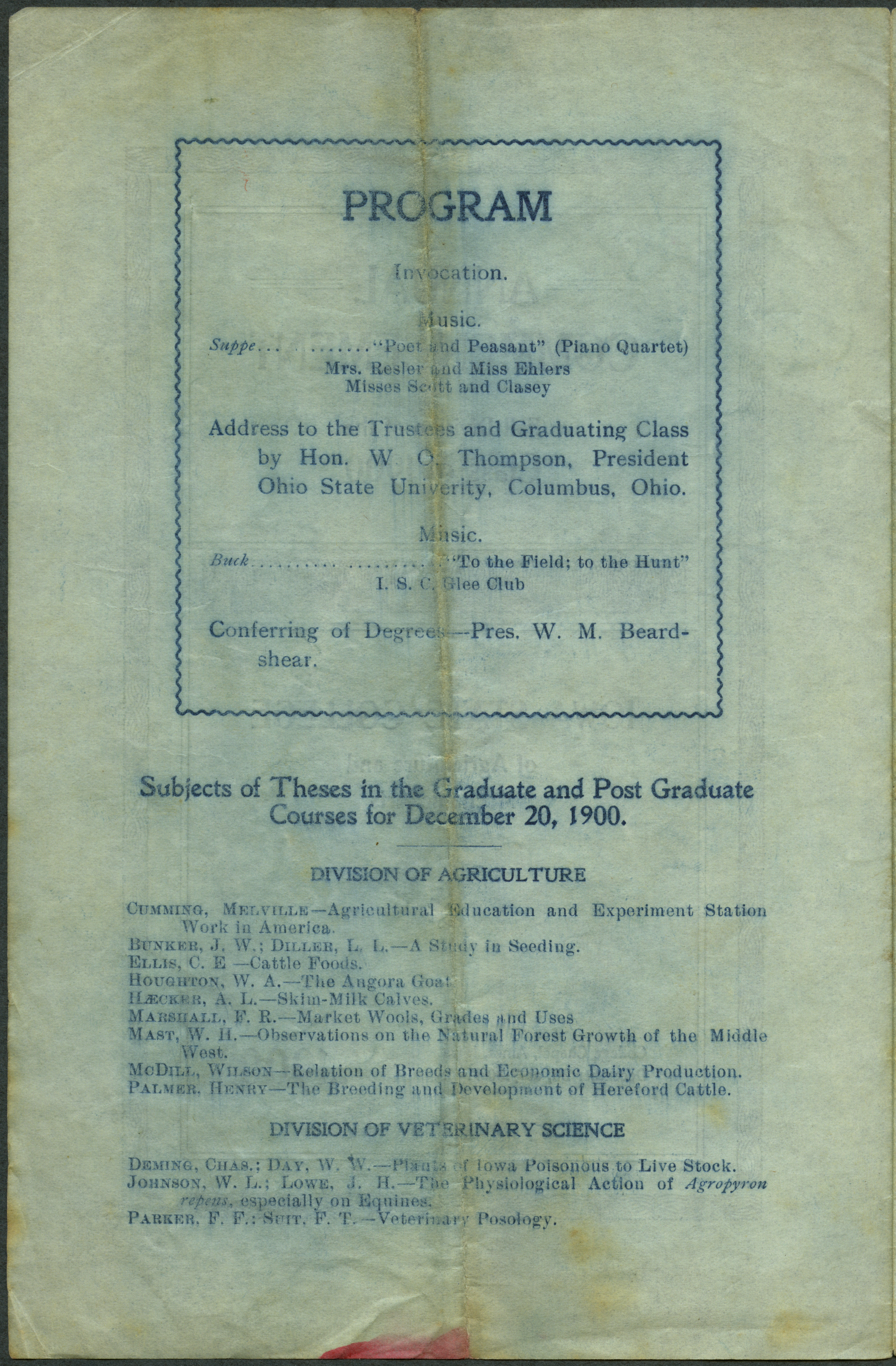 - "Annual commencement, fall division of the class of 1900, Iowa State College of Agriculture and Mechanic Arts, 1900", Iowa State University Commencement Programs, Iowa State University Library Digital Collections
