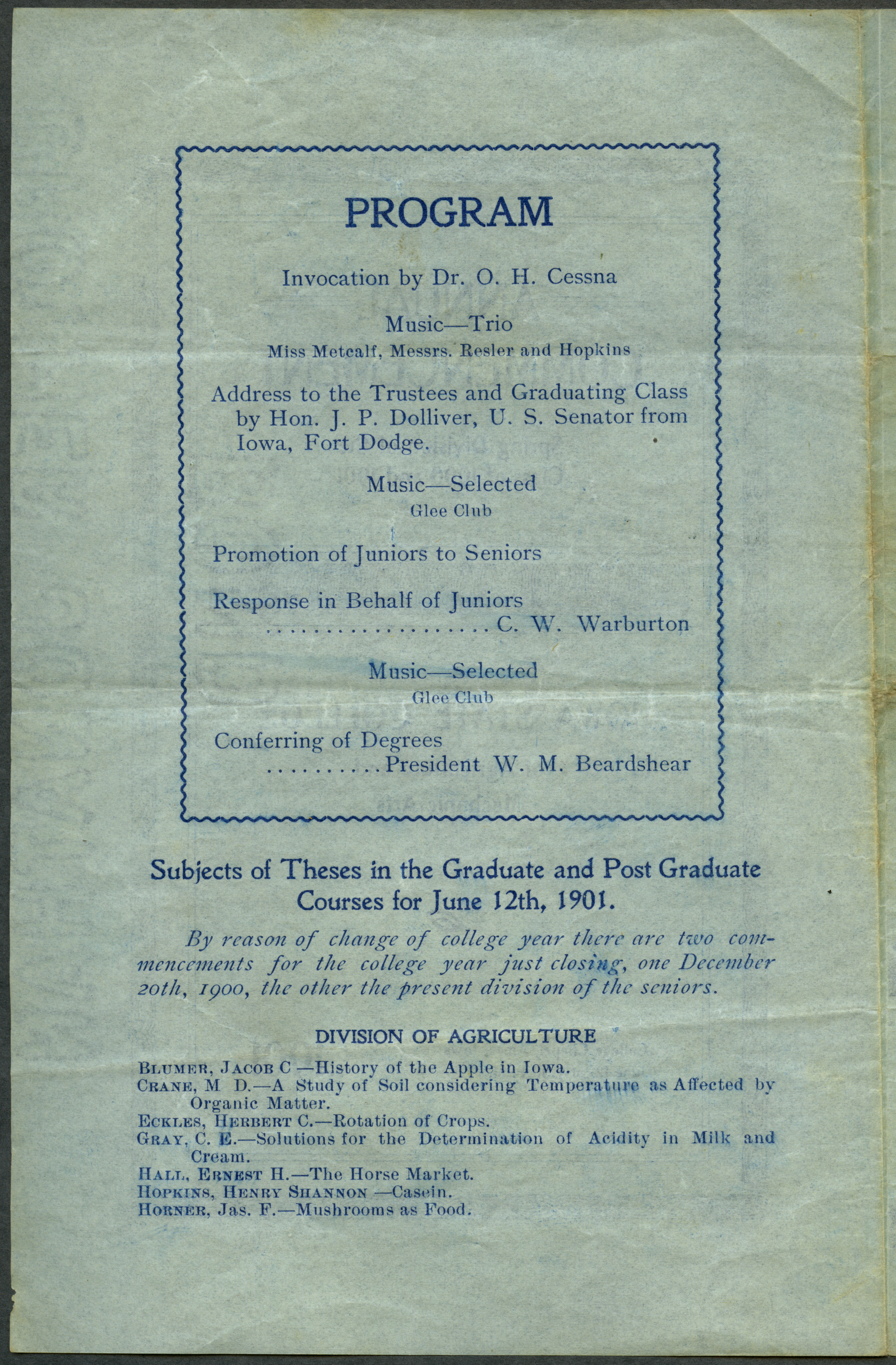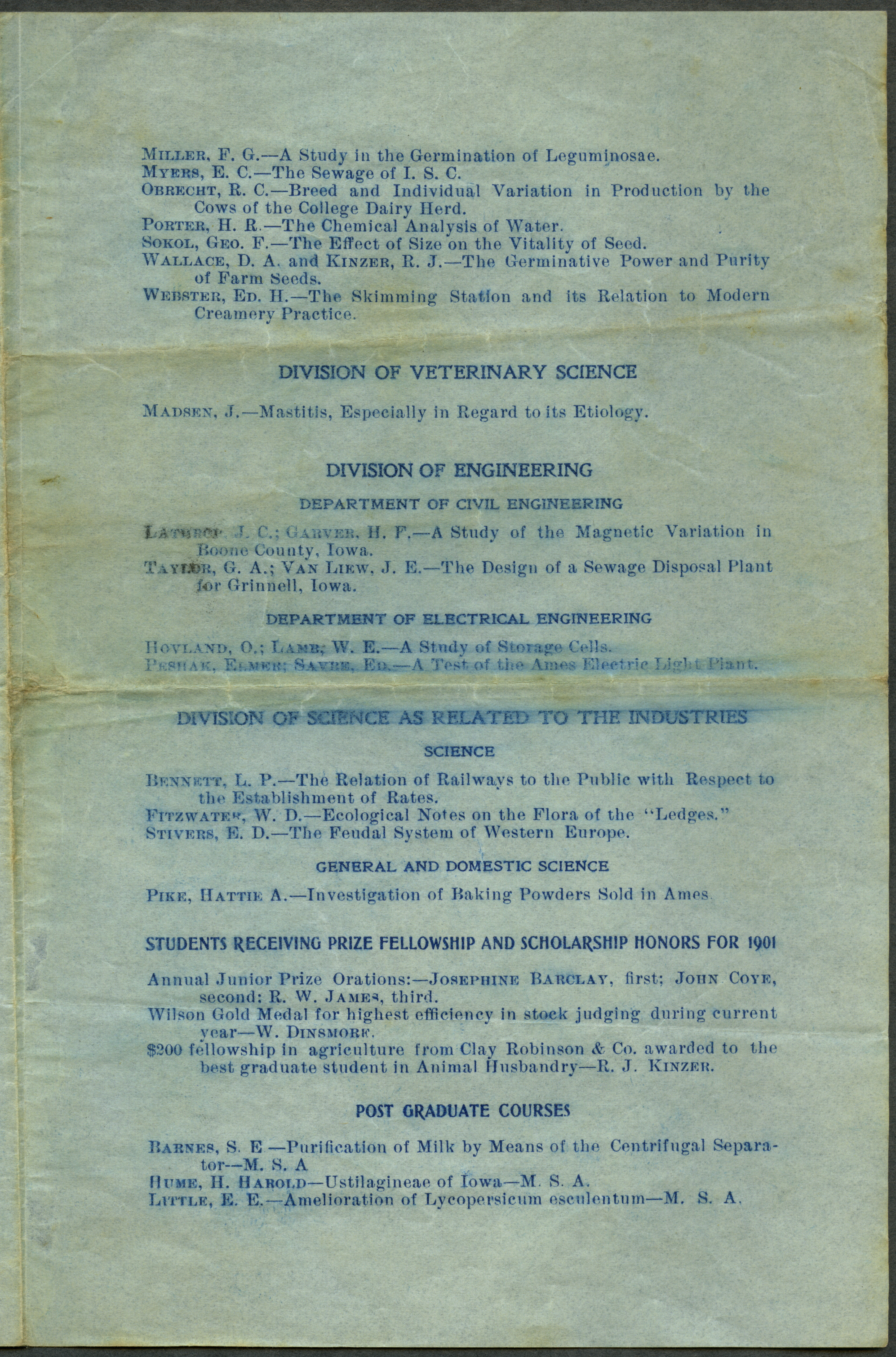 - "Annual commencement, spring division of the class of 1900 and 1901, Iowa State College of Agriculture and Mechanic Arts, 1901", Iowa State University Commencement Programs, Iowa State University Library Digital Collections
