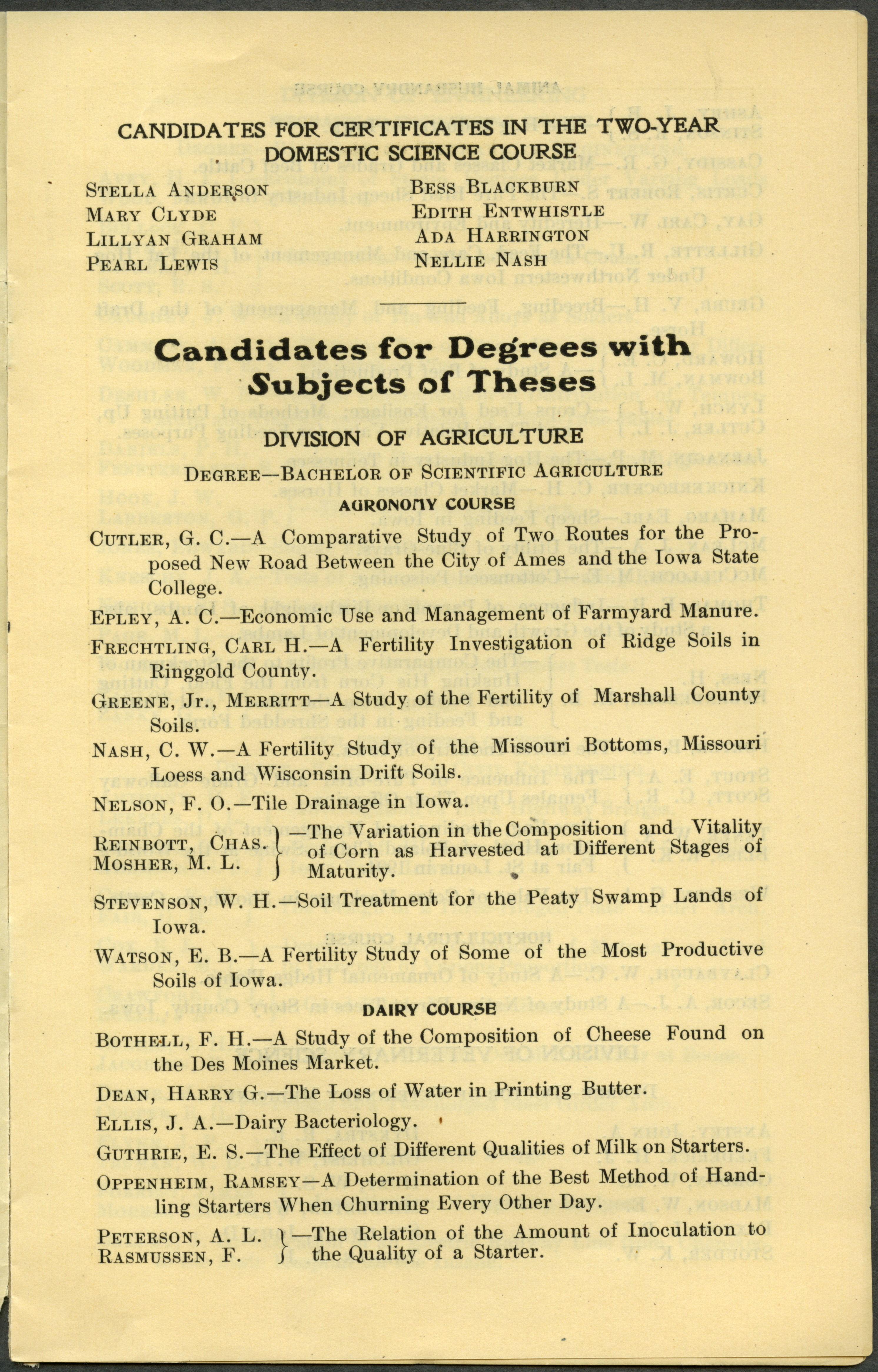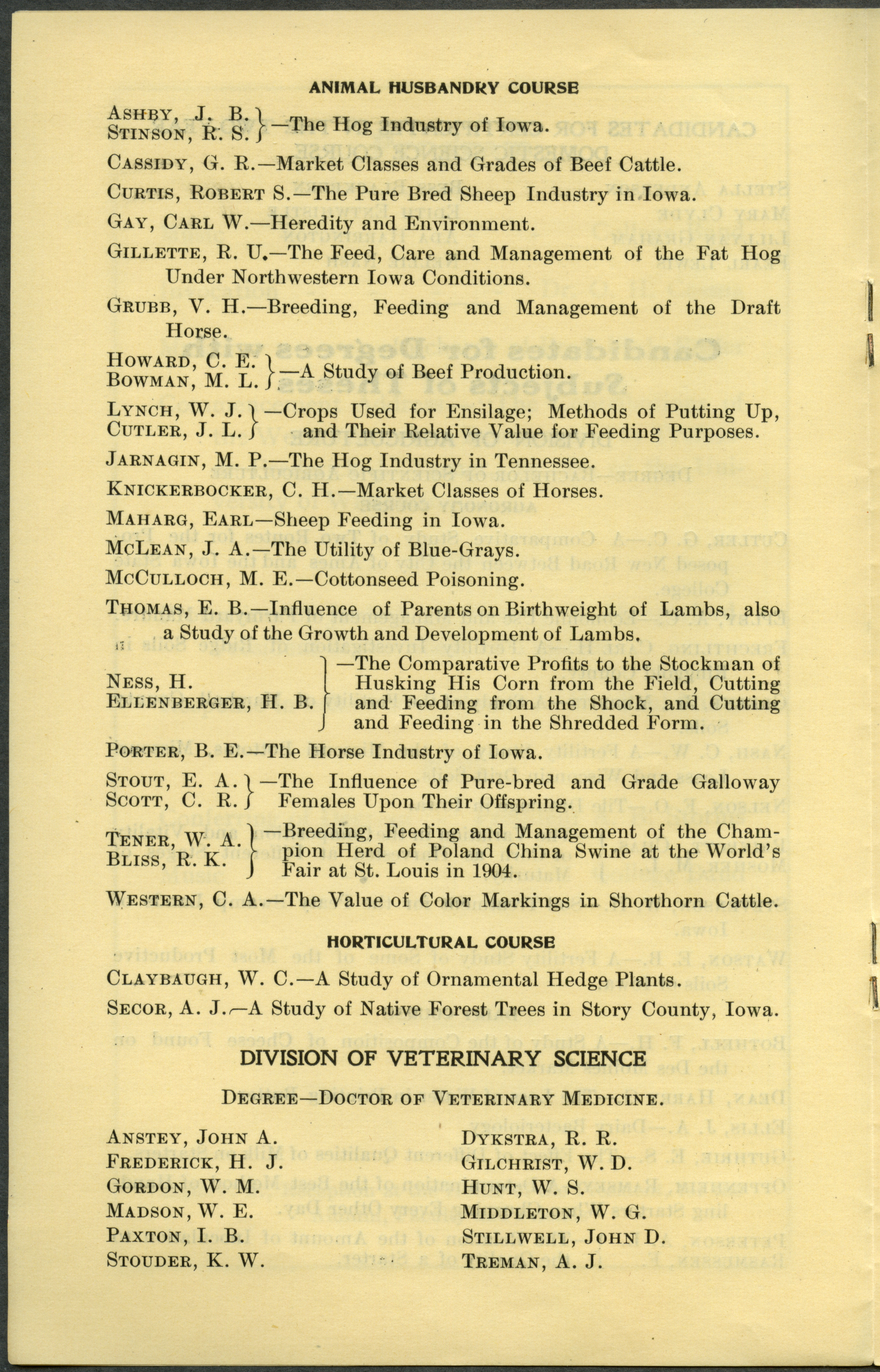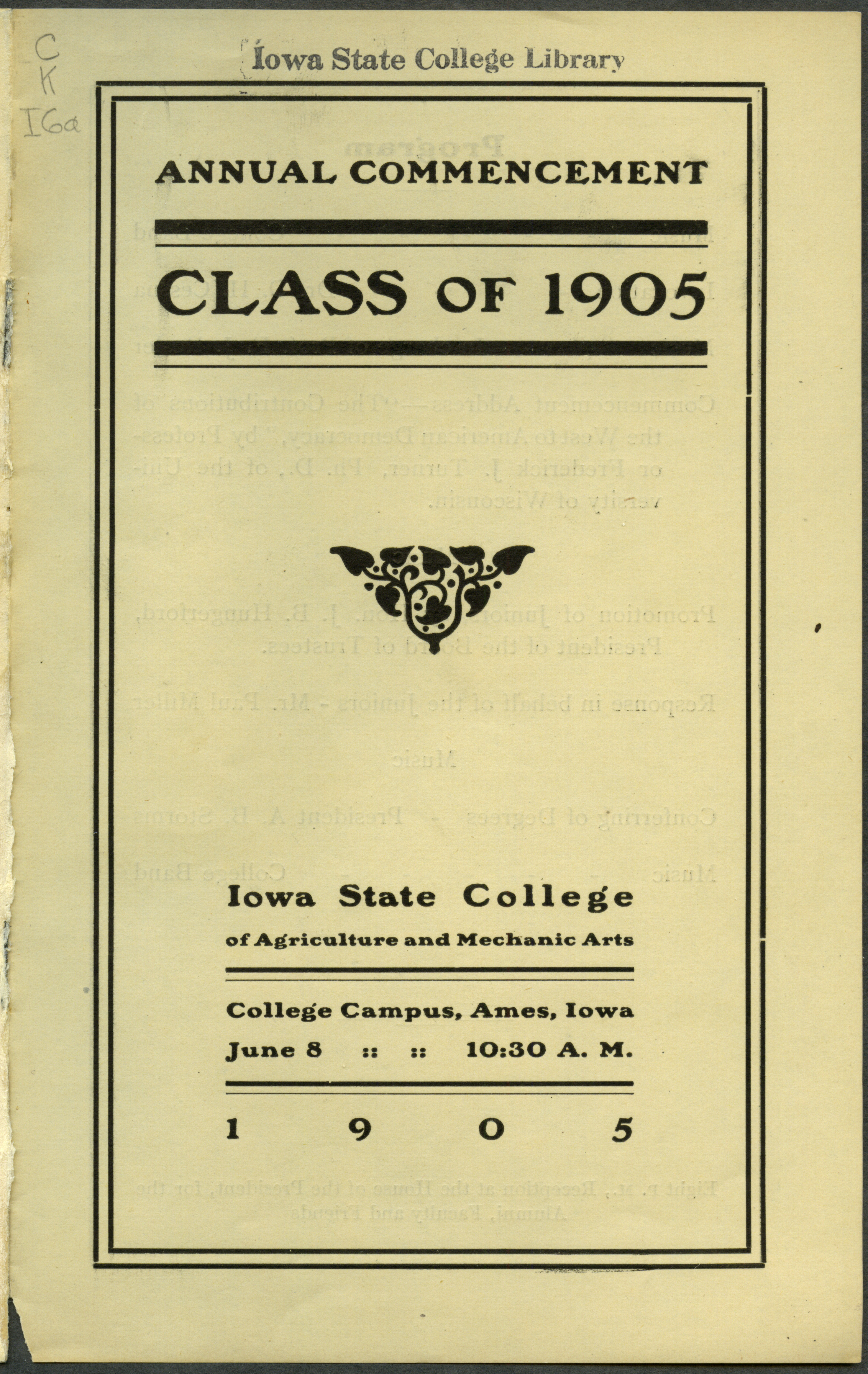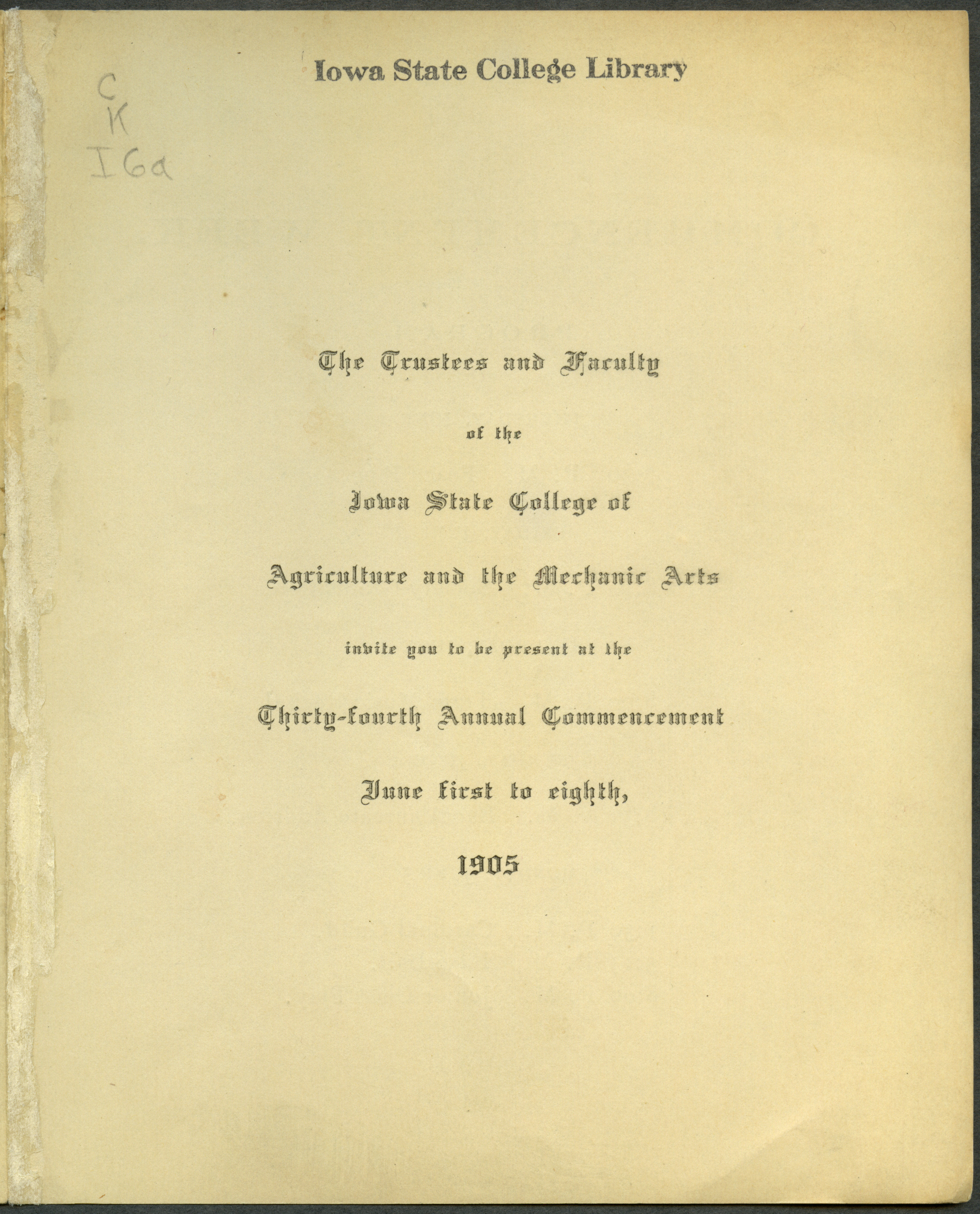 - "Annual commencement, class of 1905, Iowa State College of Agriculture and Mechanic Arts, 1905", Iowa State University Commencement Programs, Iowa State University Library Digital Collections