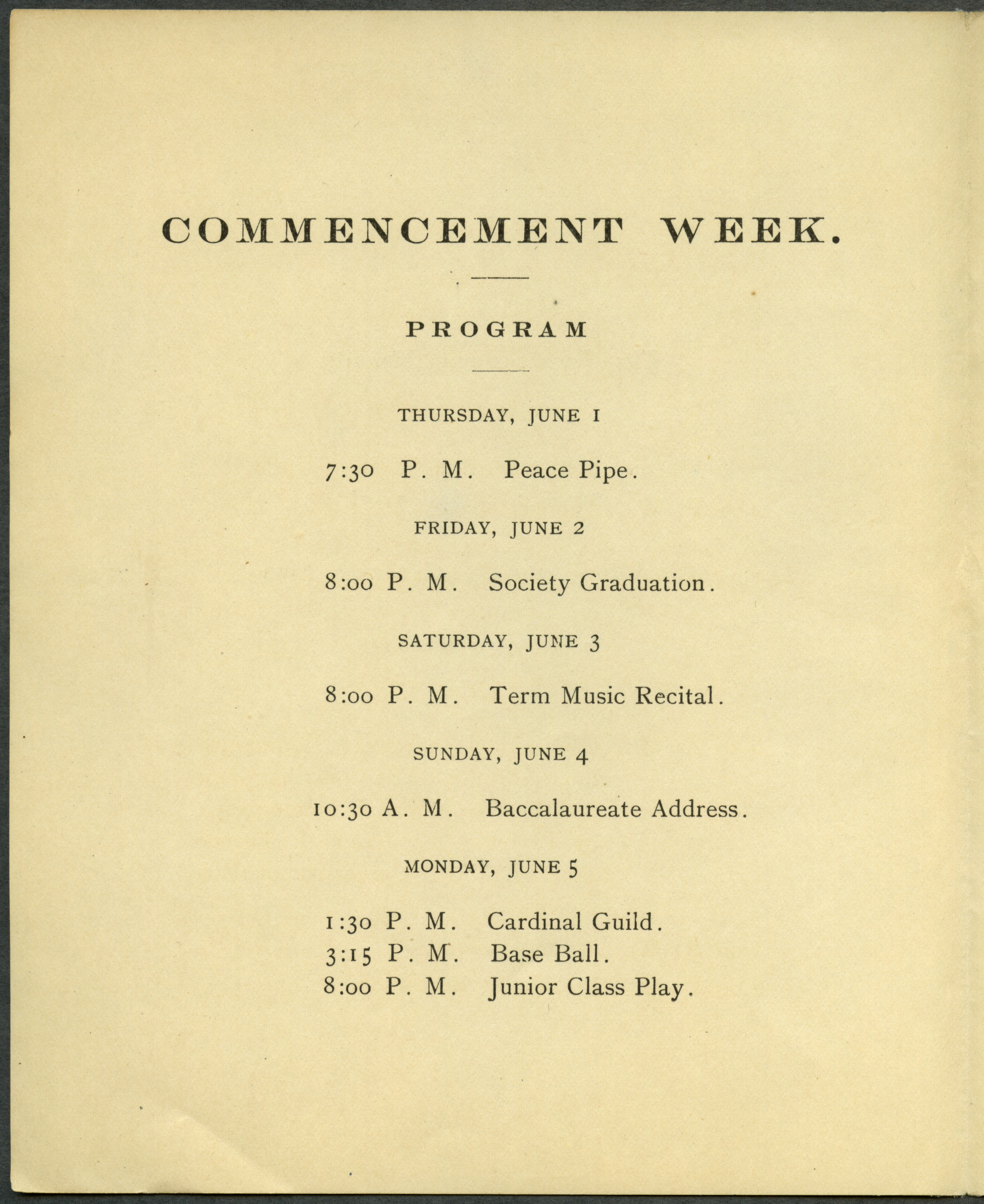 - Includes commencement program, invitation and list of commencement week activities, held June 1st-8th, 1905.