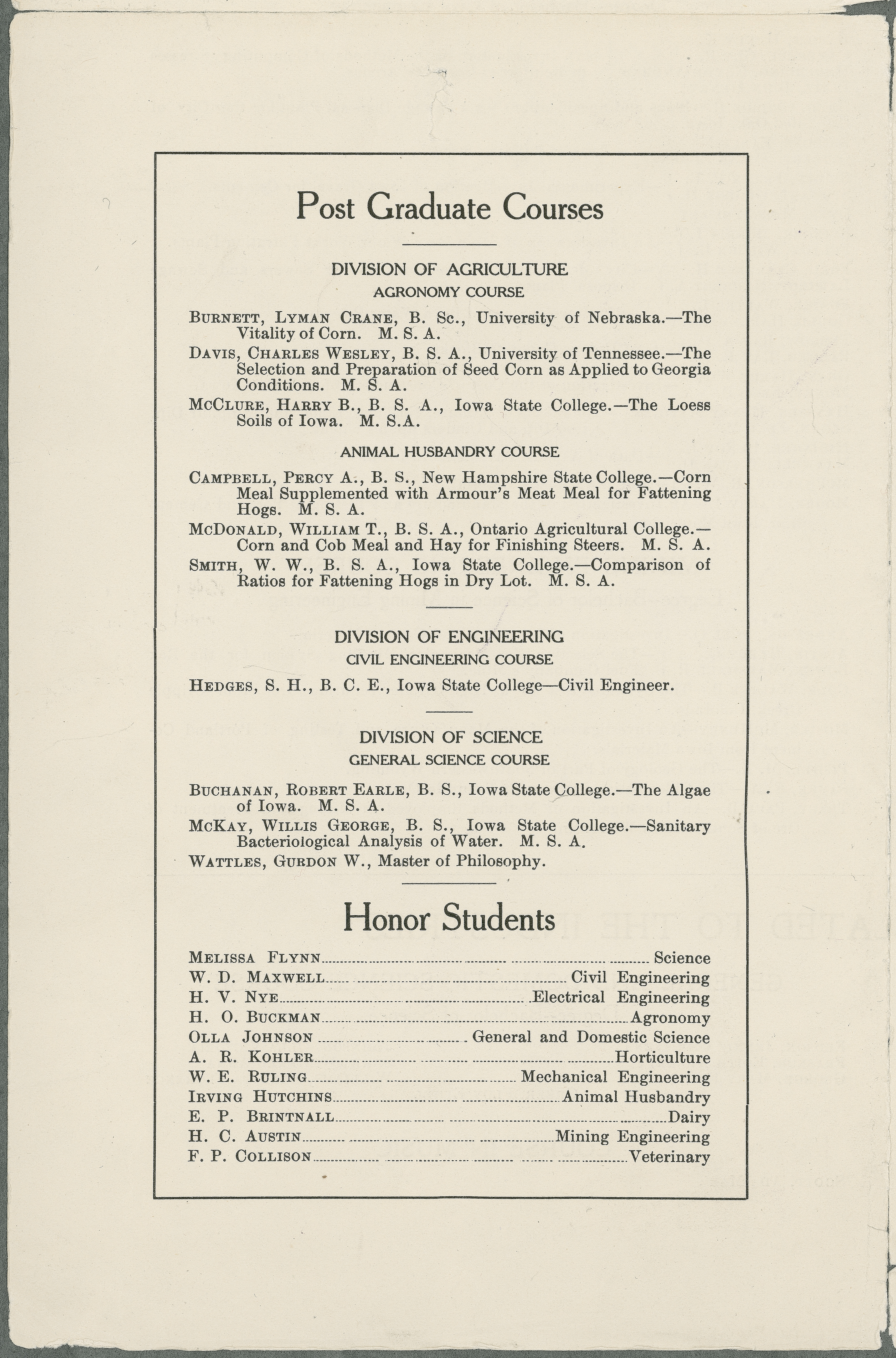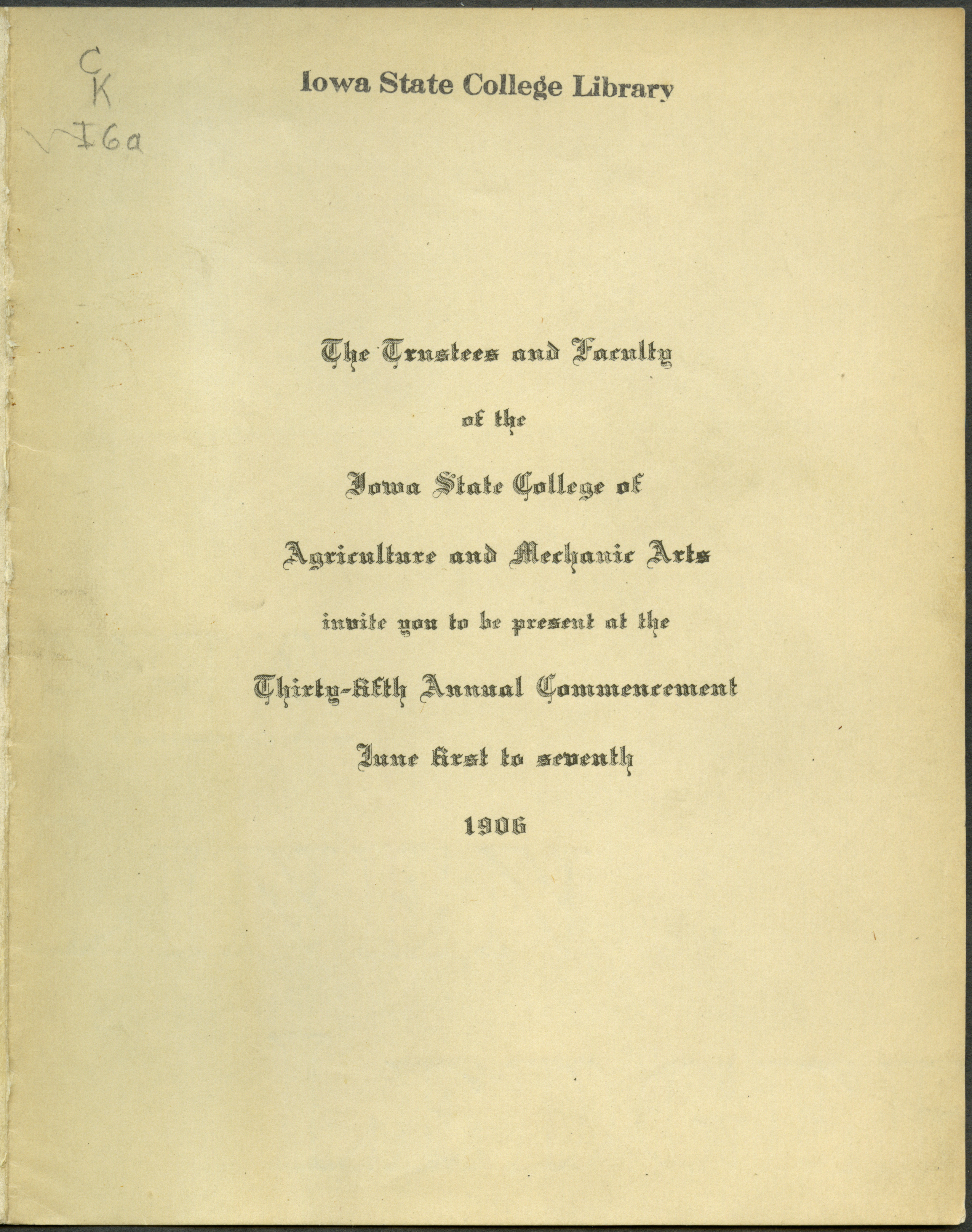 - "Annual commencement of the class of 1906 and dedication of the Central Building, Iowa State College of Agriculture and Mechanic Arts, 1906", Iowa State University Commencement Programs, Iowa State University Library Digital Collections