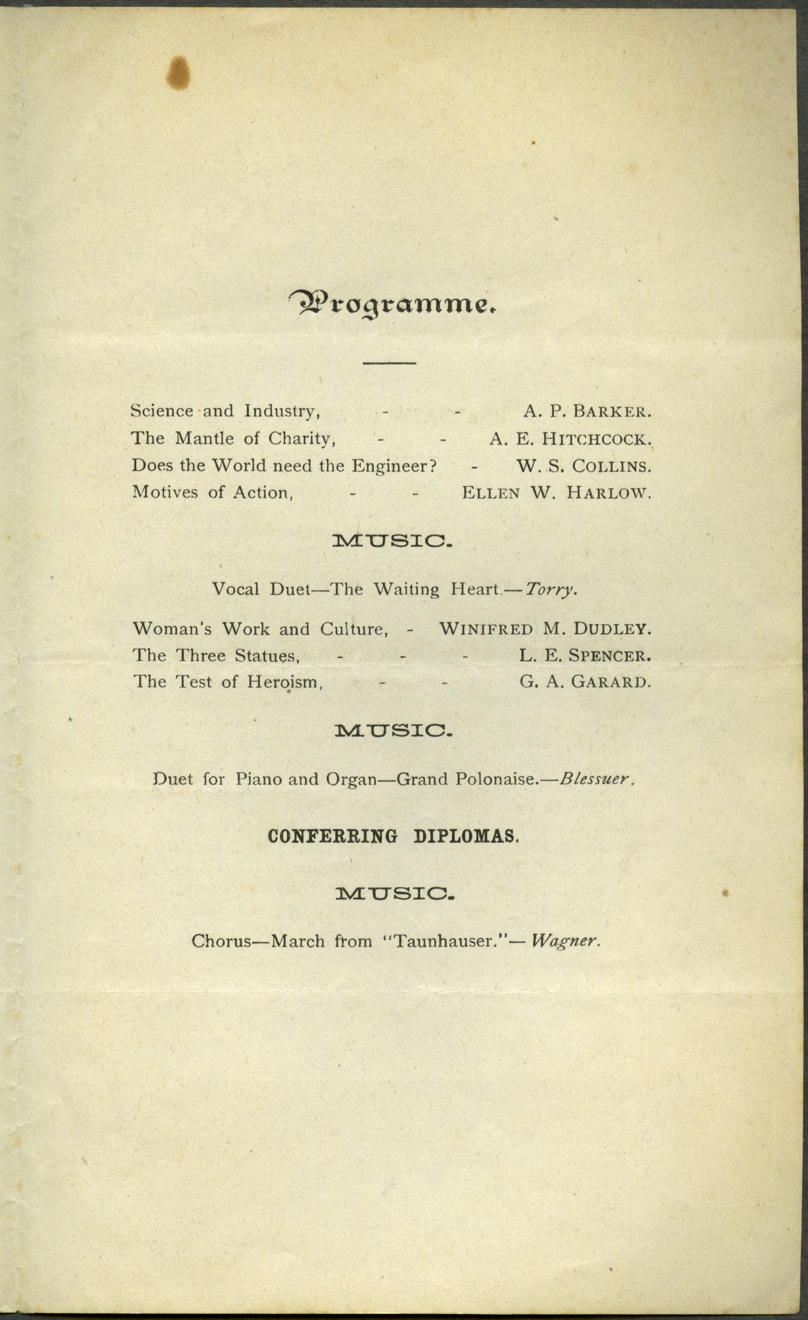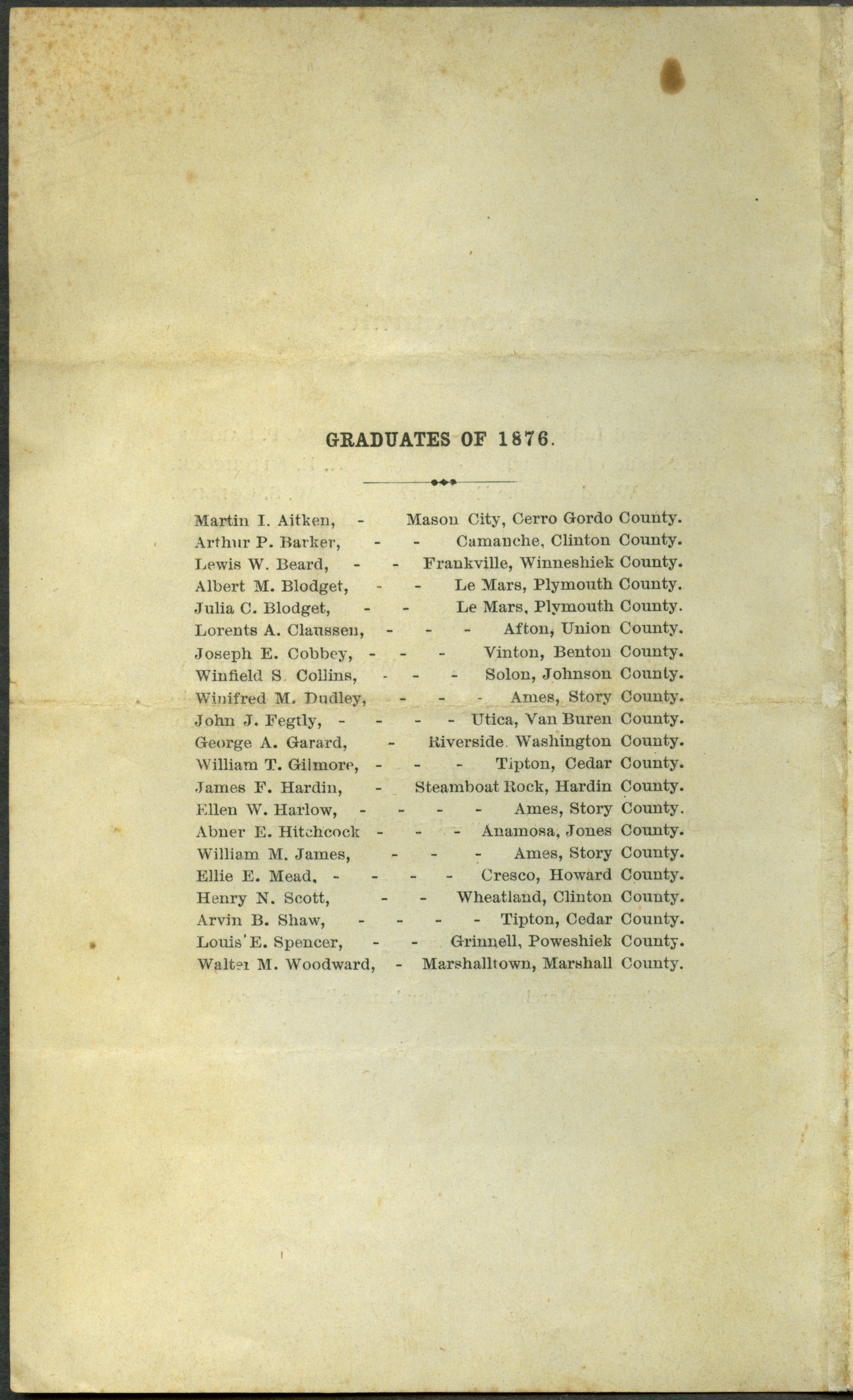 - "Fifth annual commencement exercises of the Iowa State Agricultural College, 1876", Iowa State University Commencement Programs, Iowa State University Library Digital Collections
