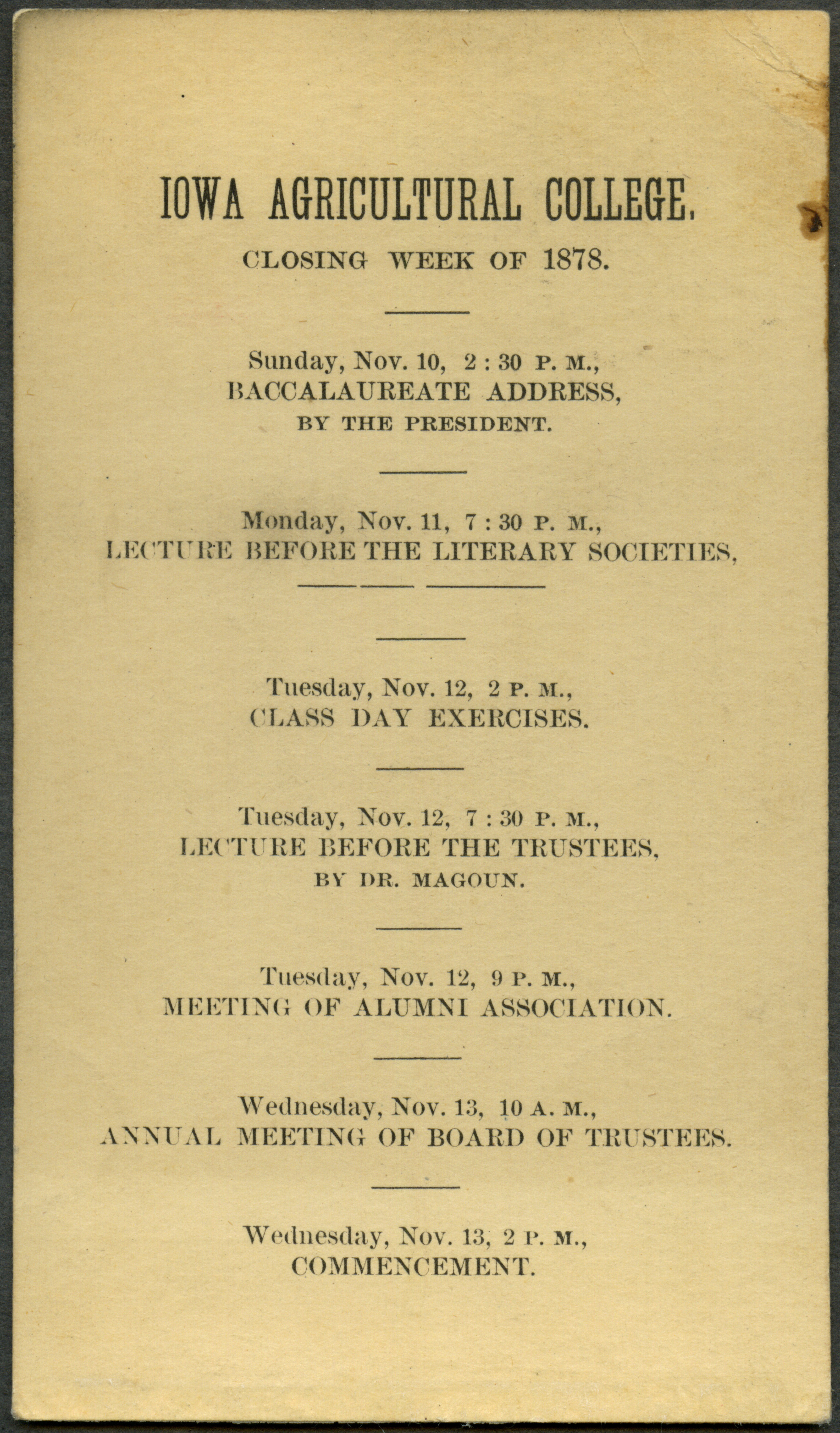 - "Iowa Agricultural College, closing week of 1878", Iowa State University Commencement Programs, Iowa State University Library Digital Collections