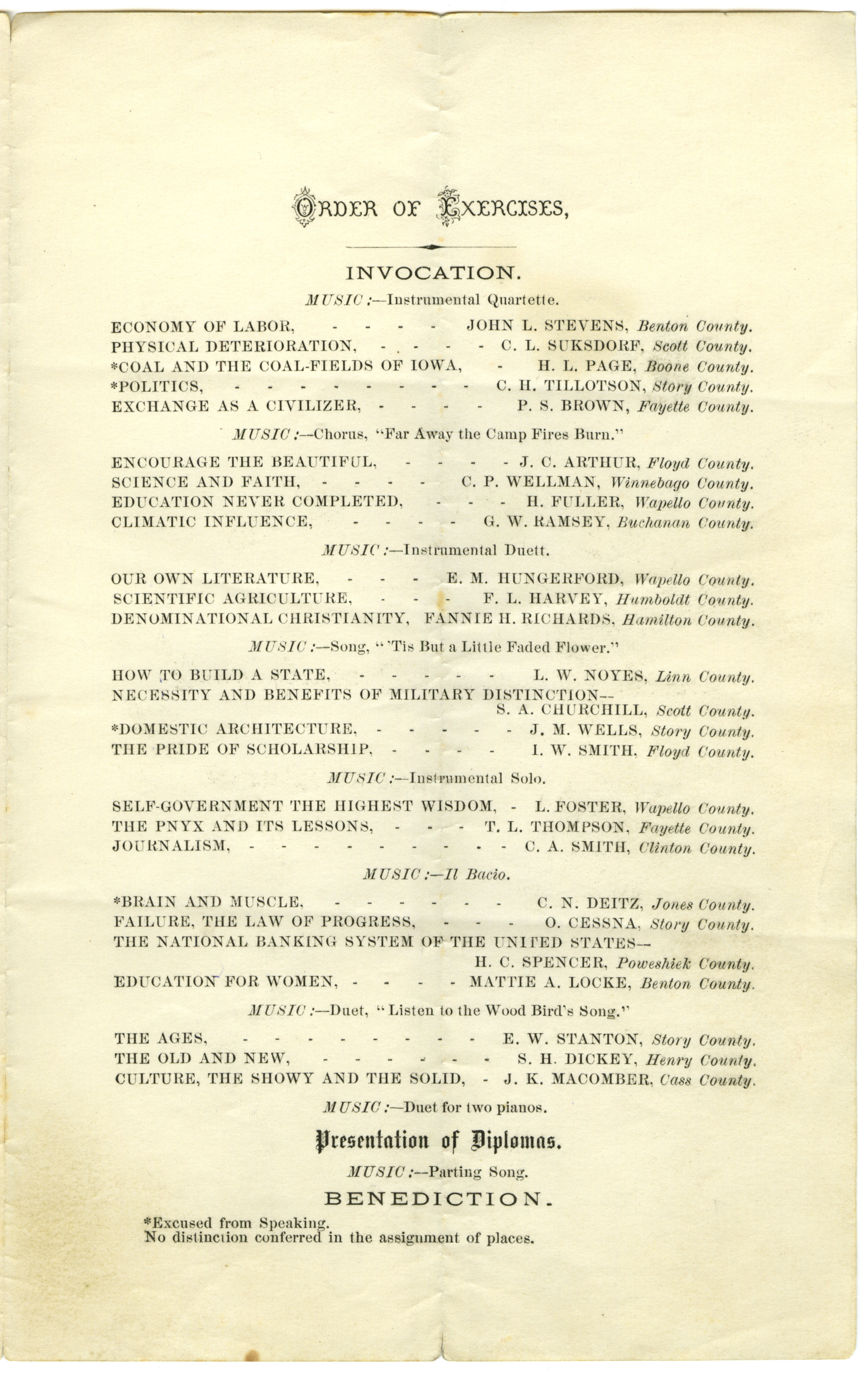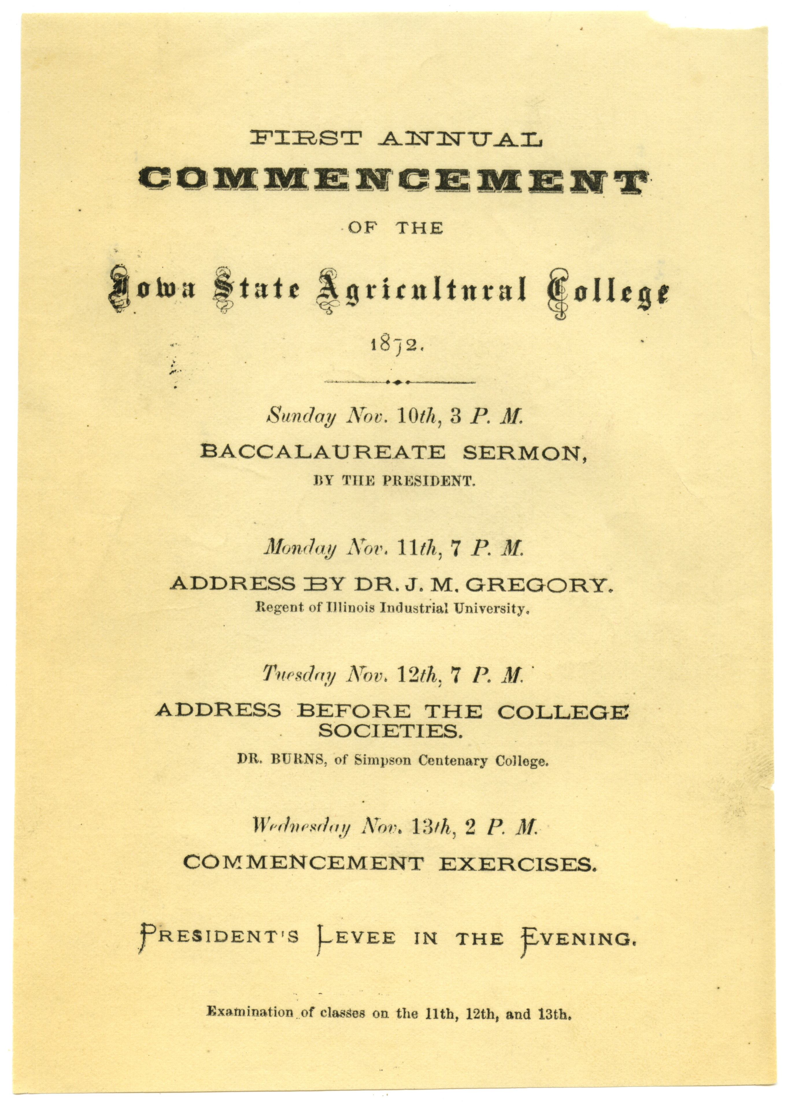 - "Commencement exercises. Iowa State Agricultural College, 1872", Iowa State University Commencement Programs, Iowa State University Library Digital Collections