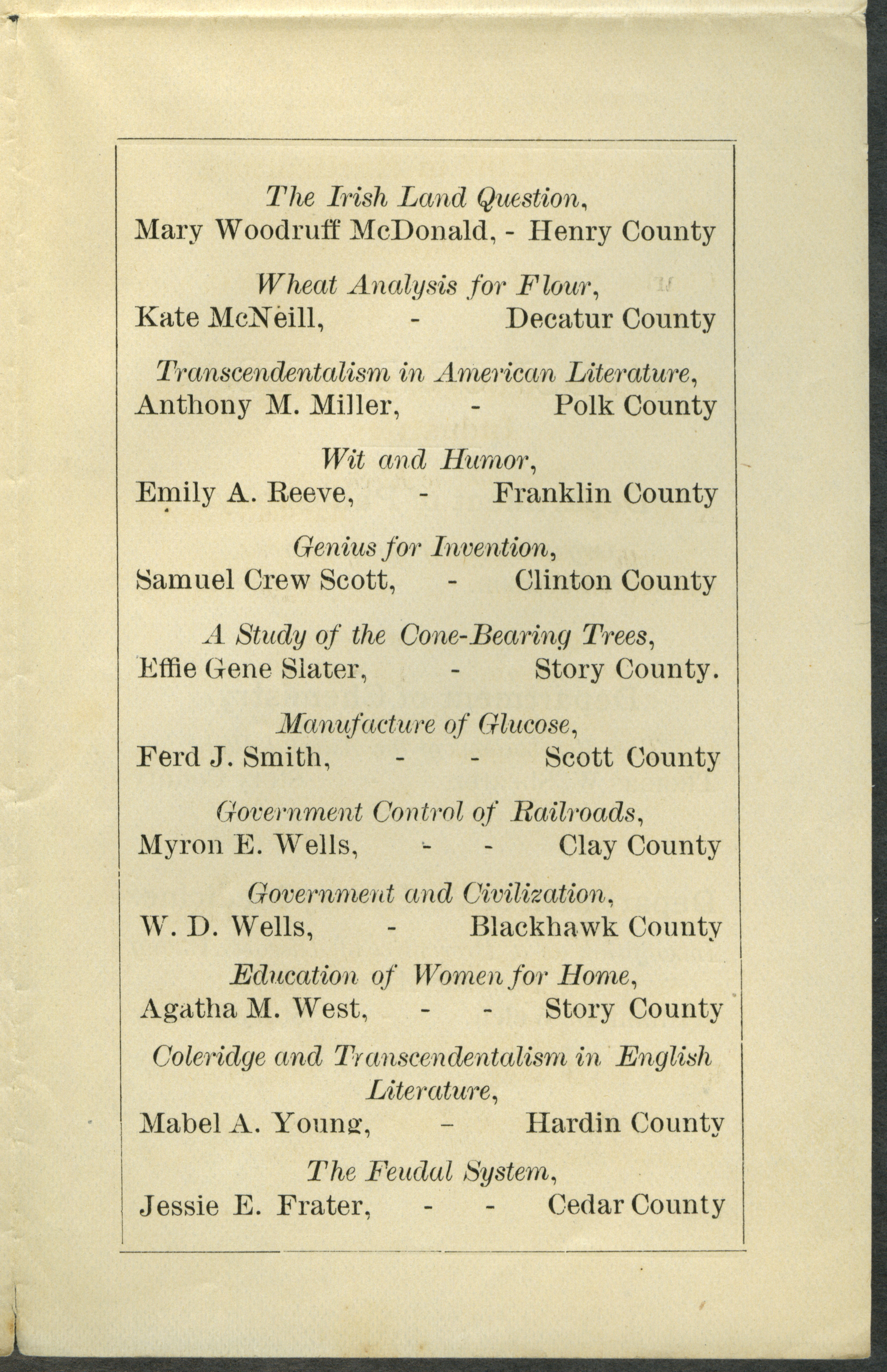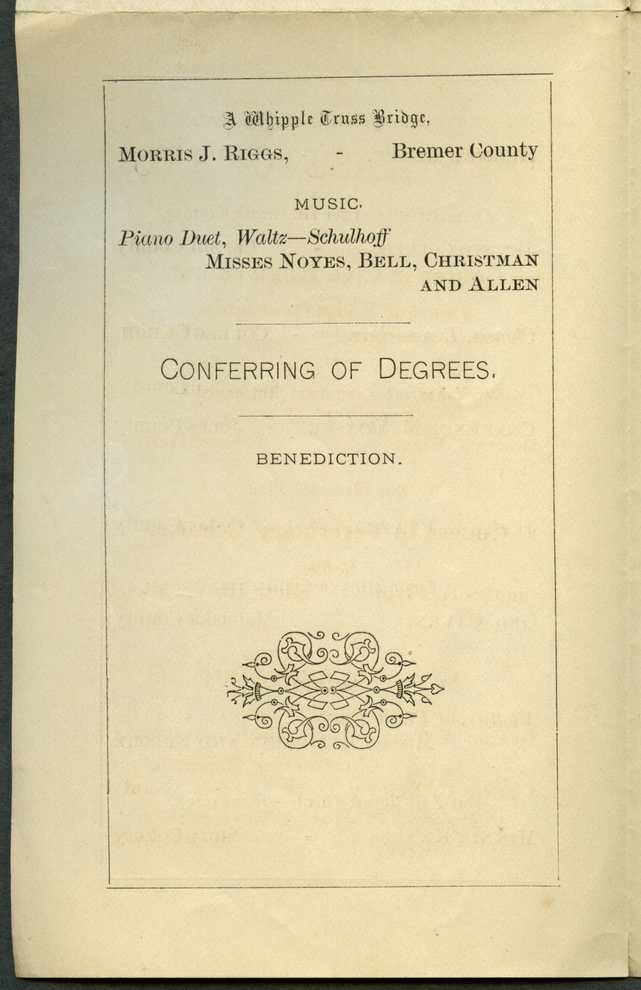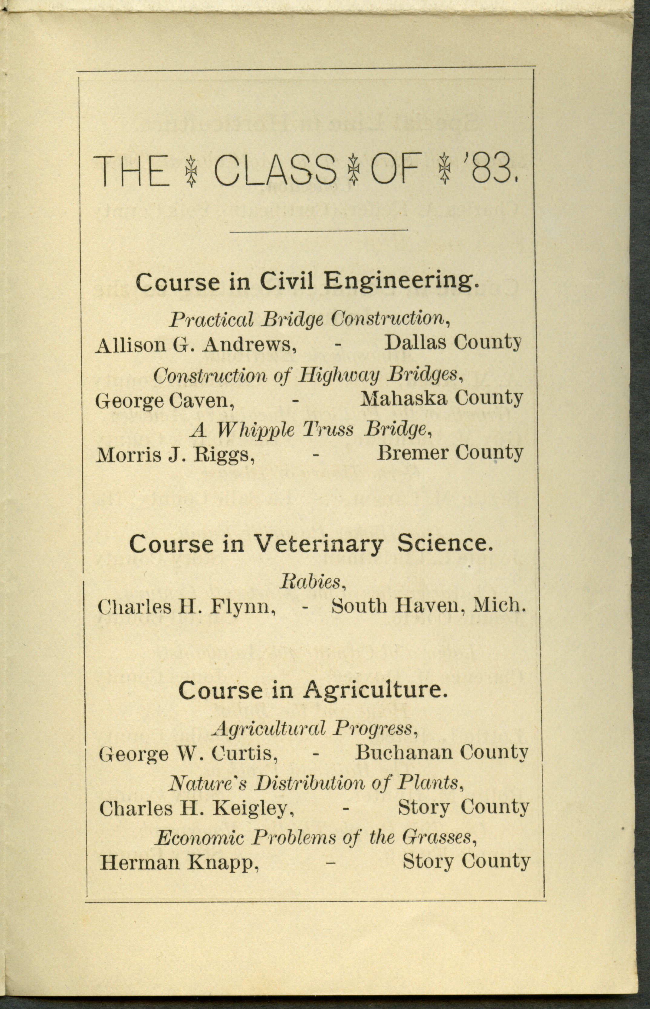- "Twelfth annual commencement, Iowa State College of Agriculture and Mechanic Arts, 1883", Iowa State University Commencement Programs, Iowa State University Library Digital Collections
