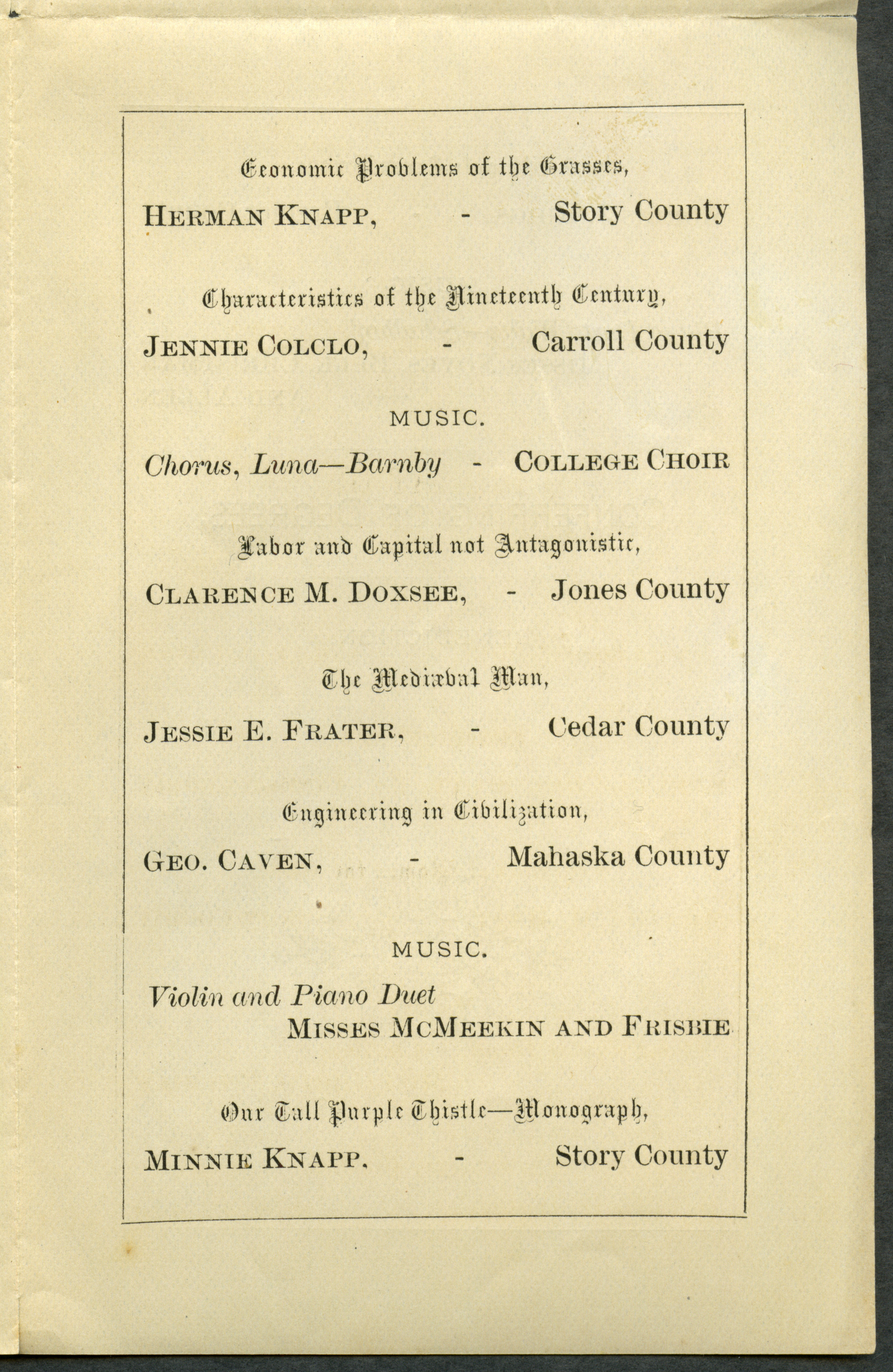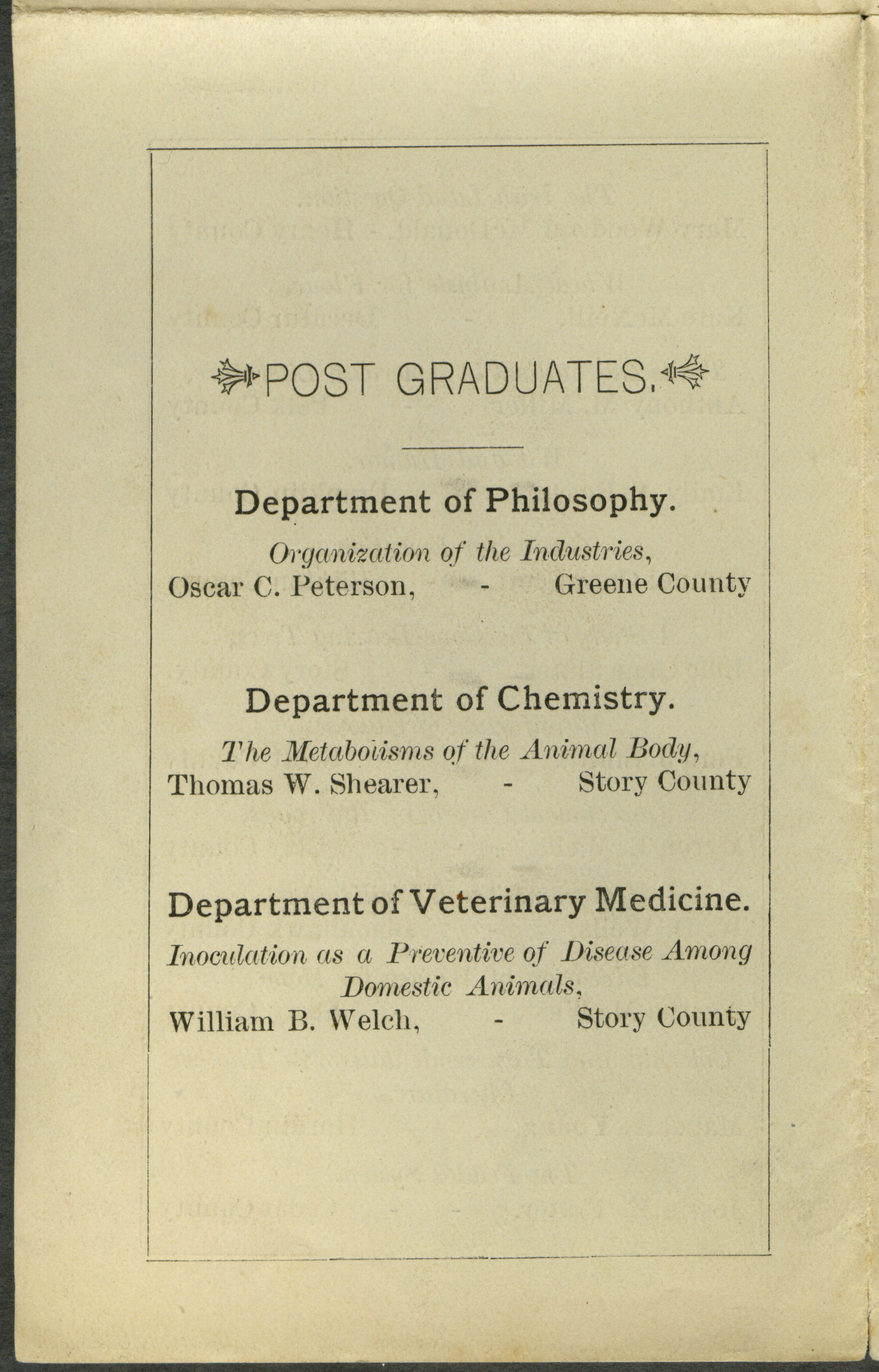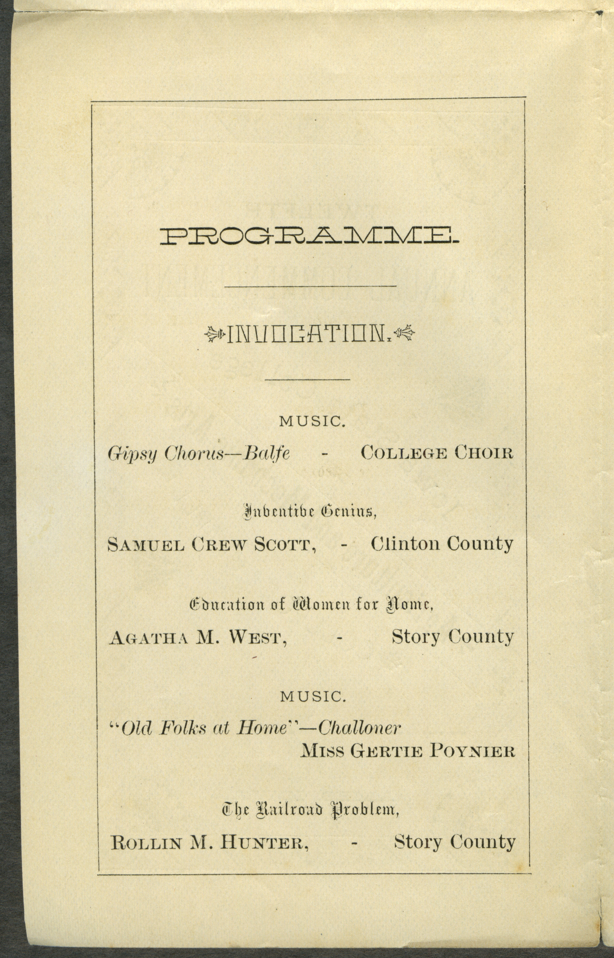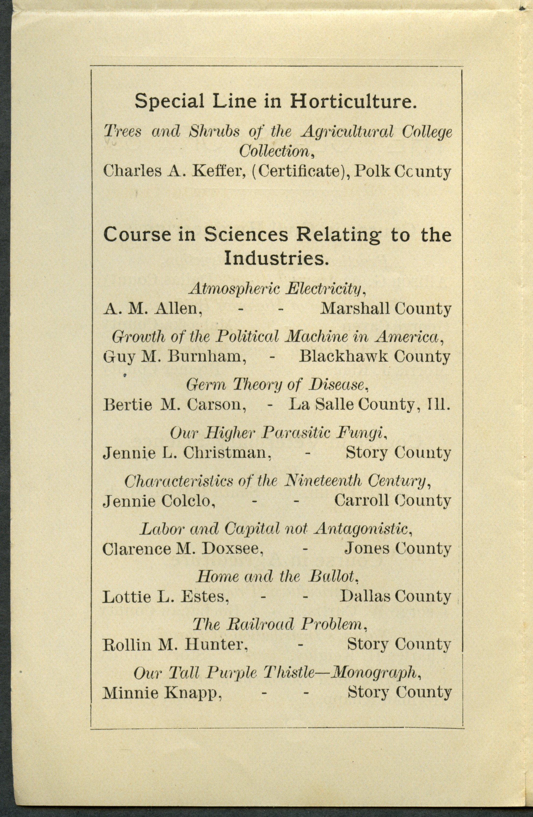 - "Twelfth annual commencement, Iowa State College of Agriculture and Mechanic Arts, 1883", Iowa State University Commencement Programs, Iowa State University Library Digital Collections