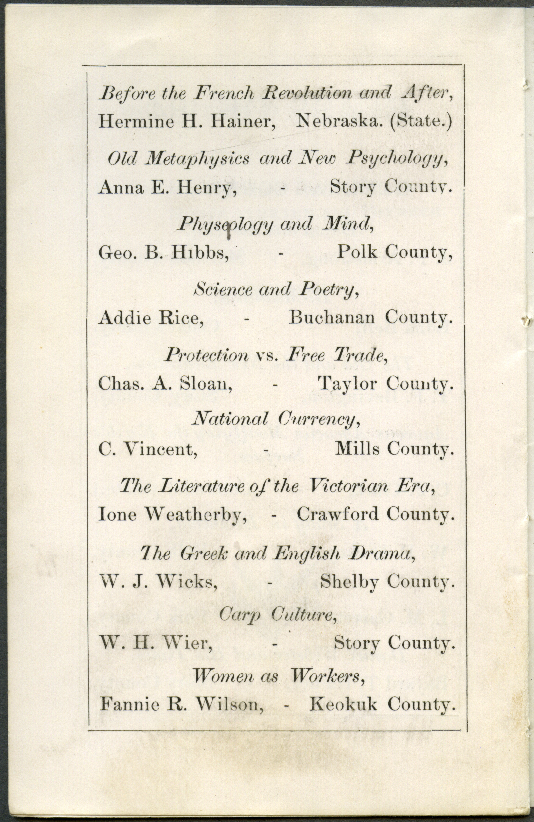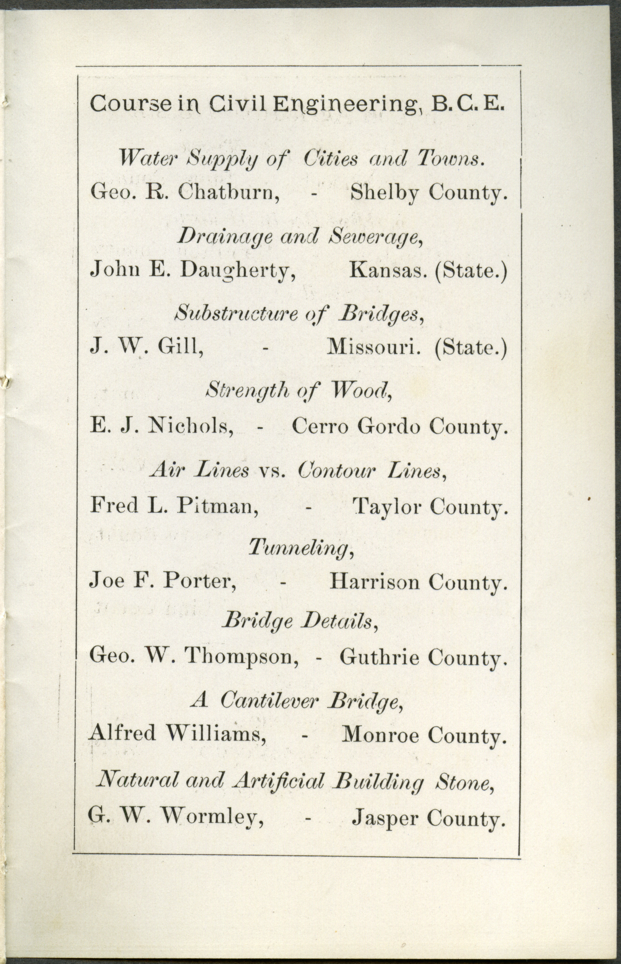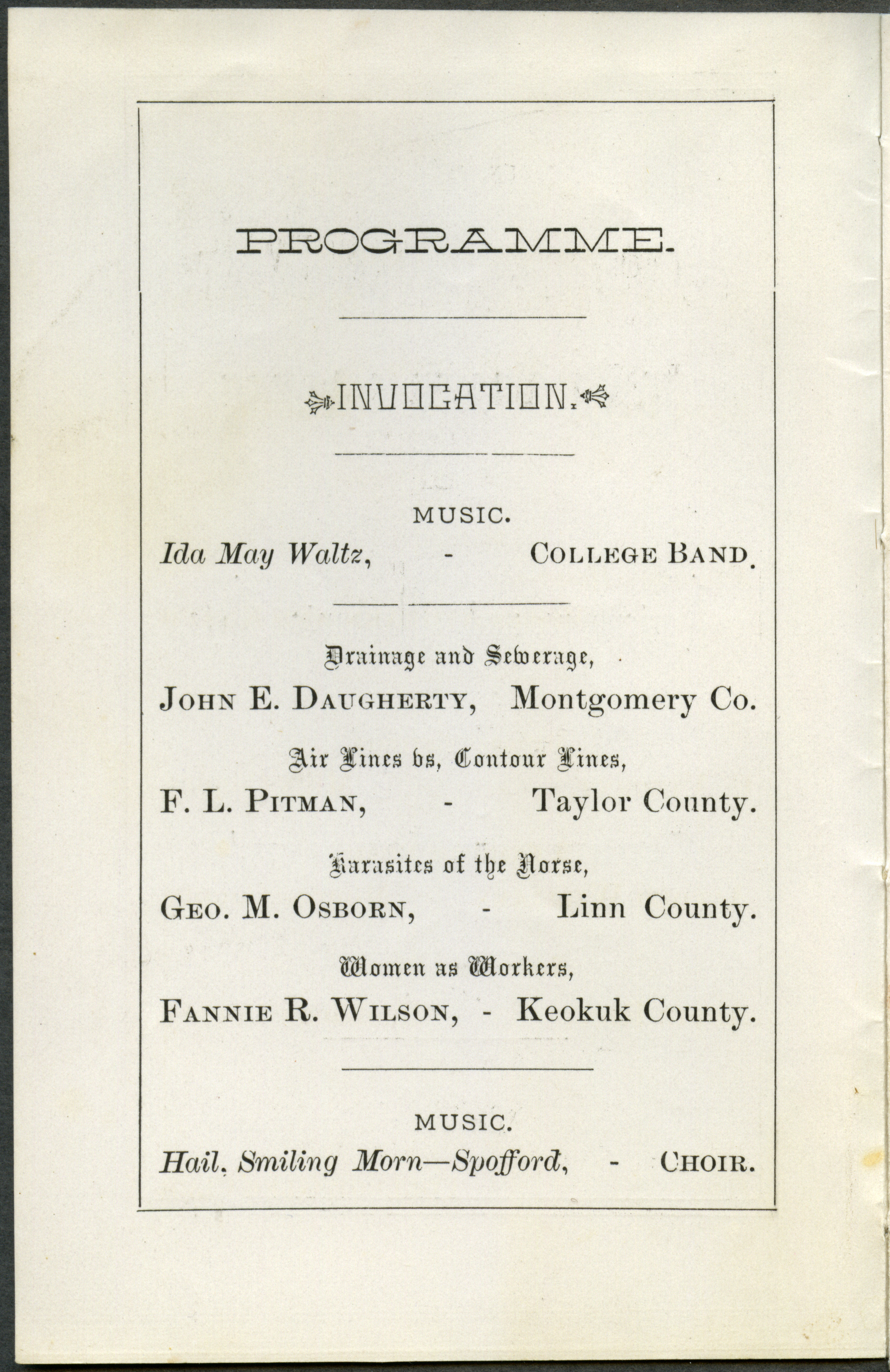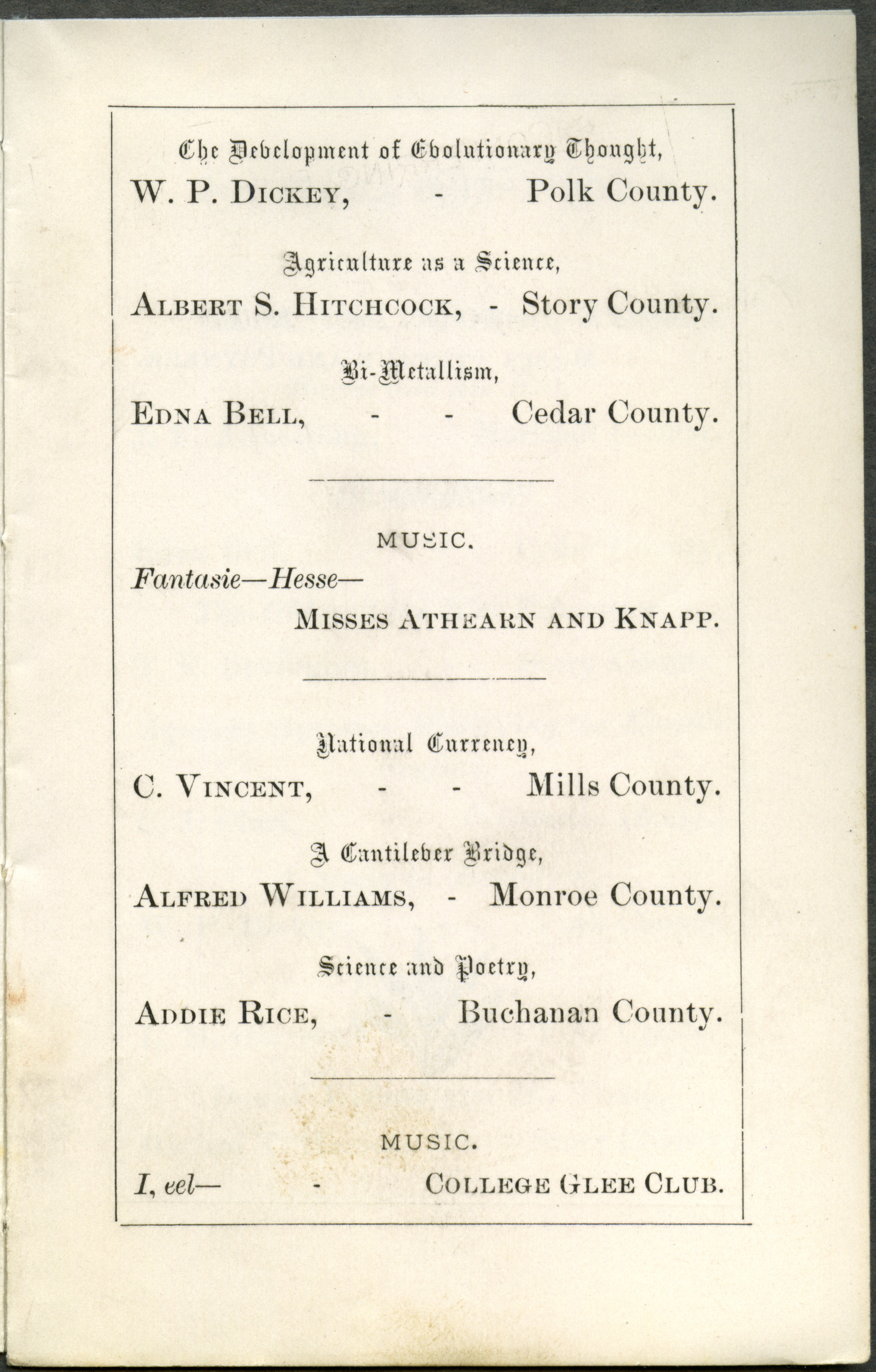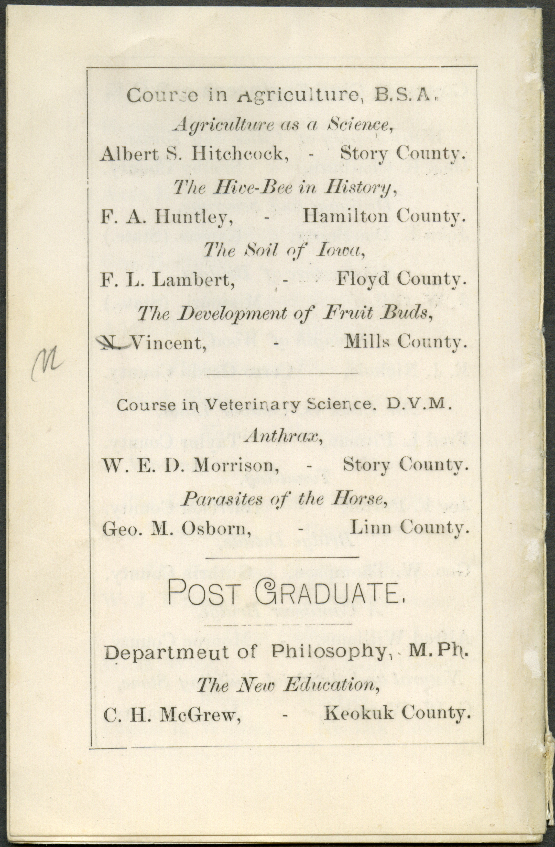 - "Thirteenth annual commencement, Iowa State College of Agriculture and Mechanic Arts, 1884", Iowa State University Commencement Programs, Iowa State University Library Digital Collections