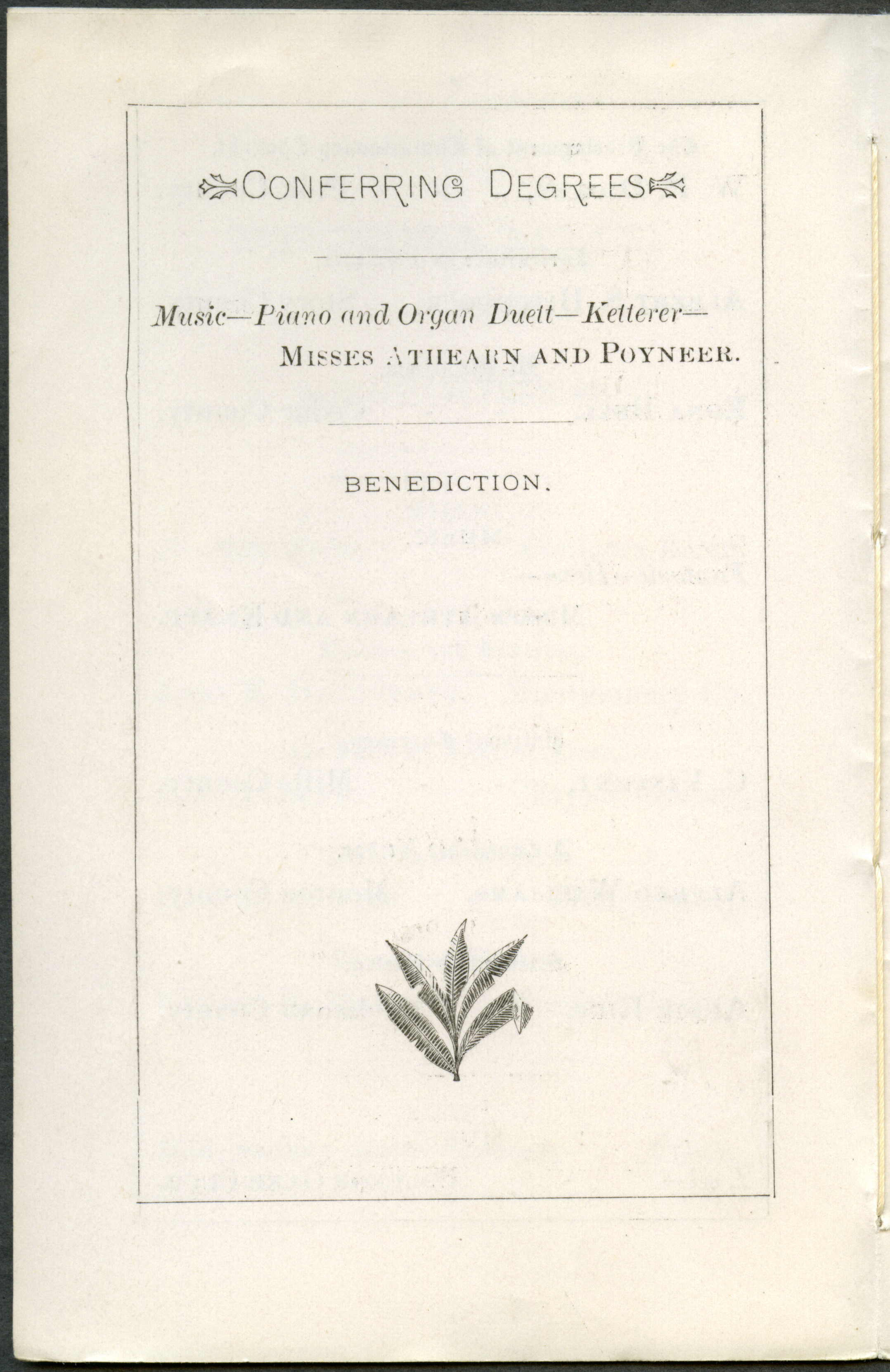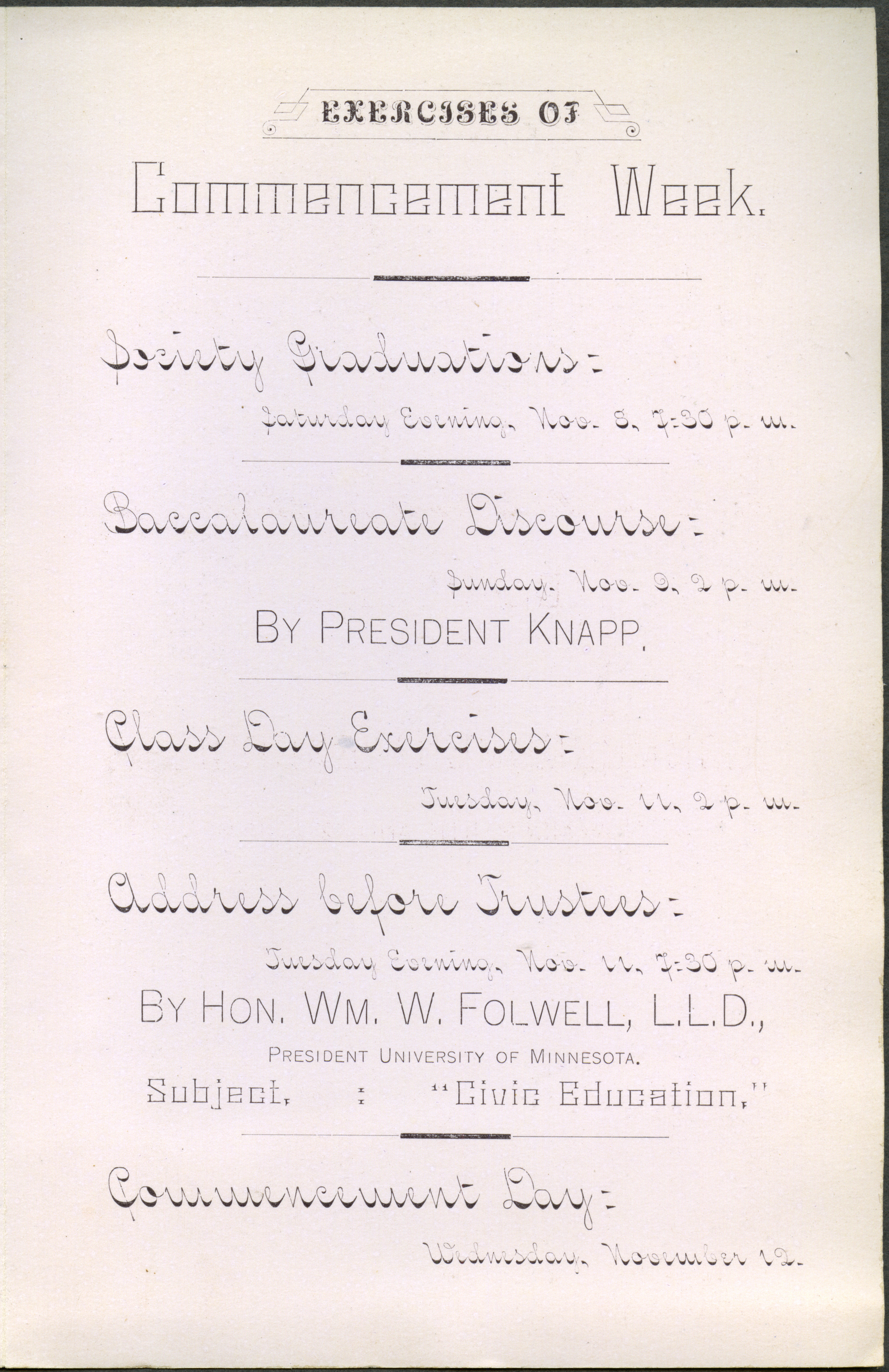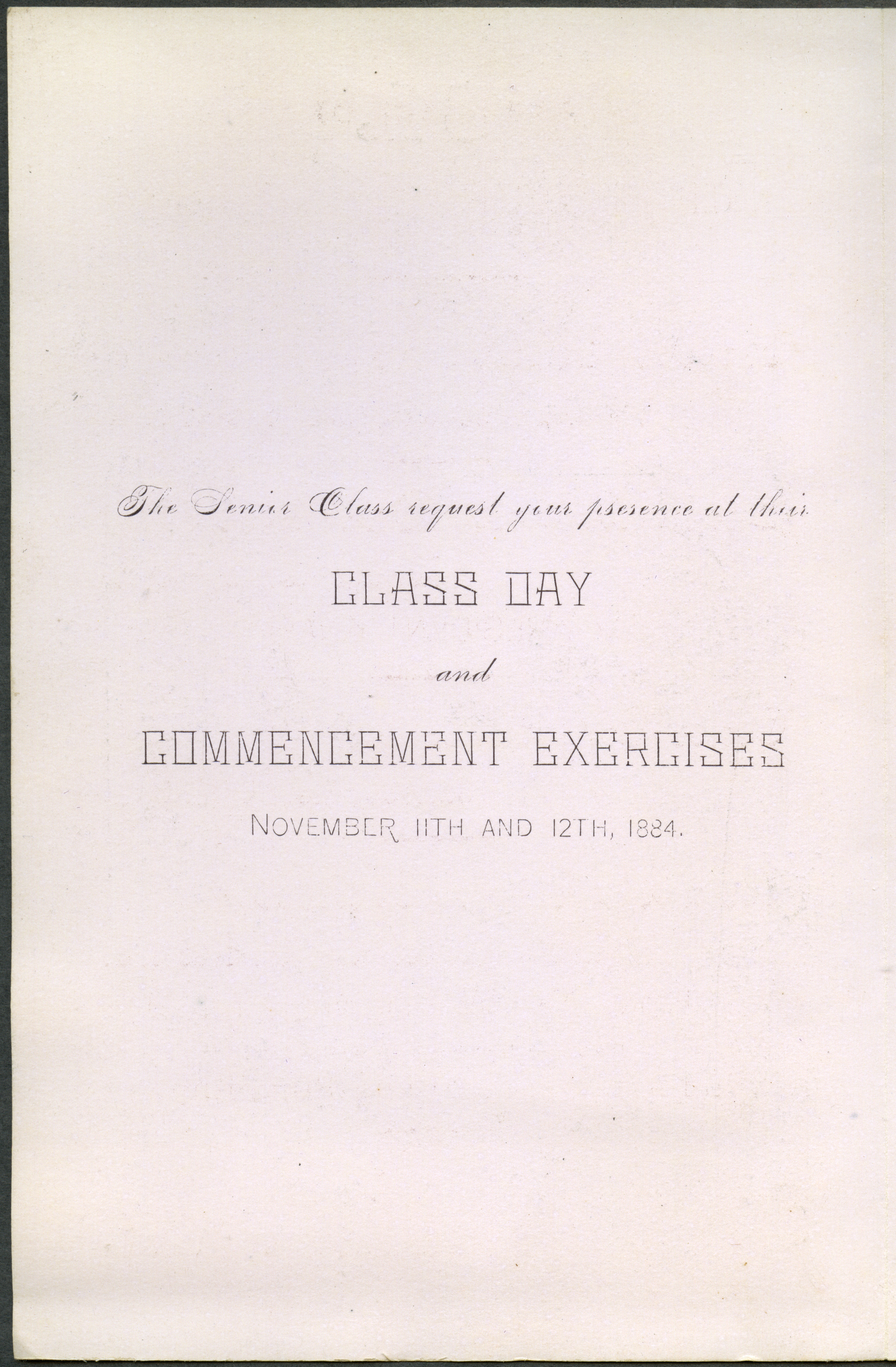 - Includes commencement program, invitation and list of commencement week activities, held November 8th-12th, 1884.