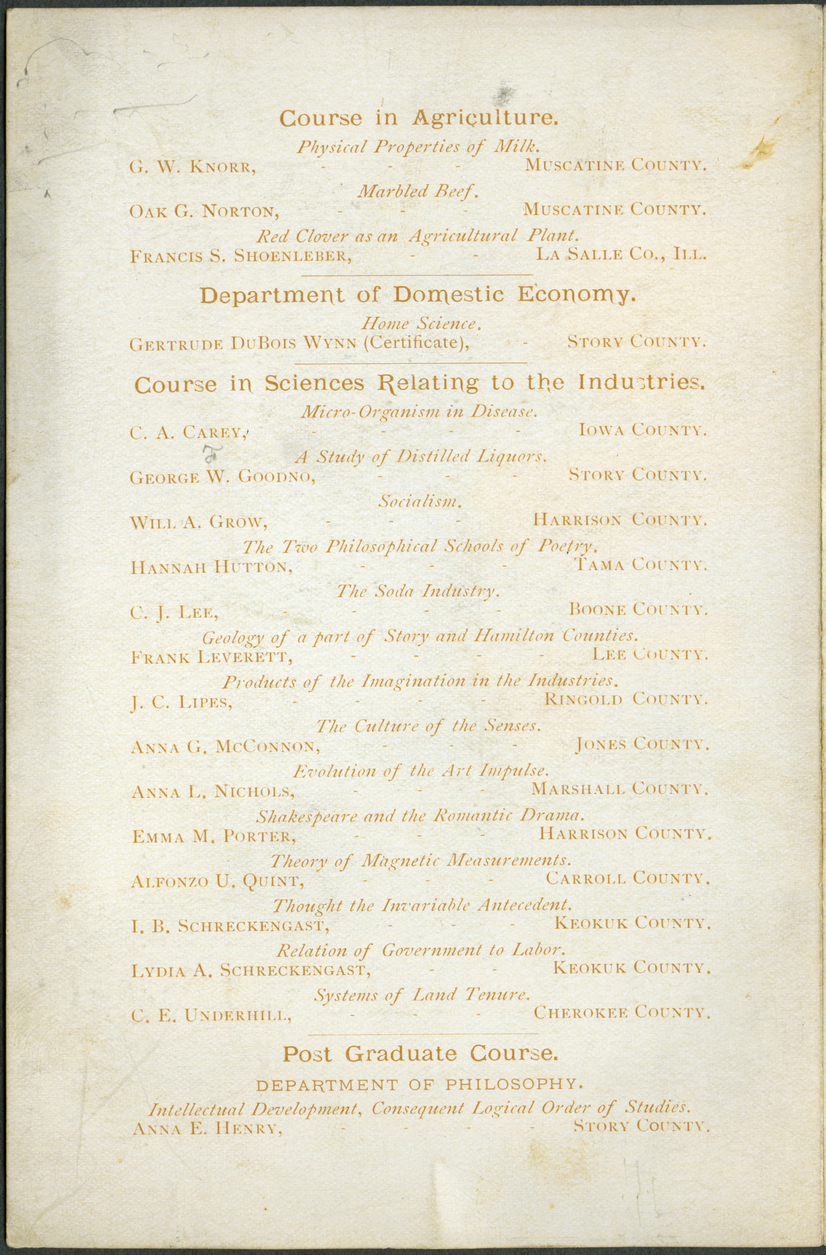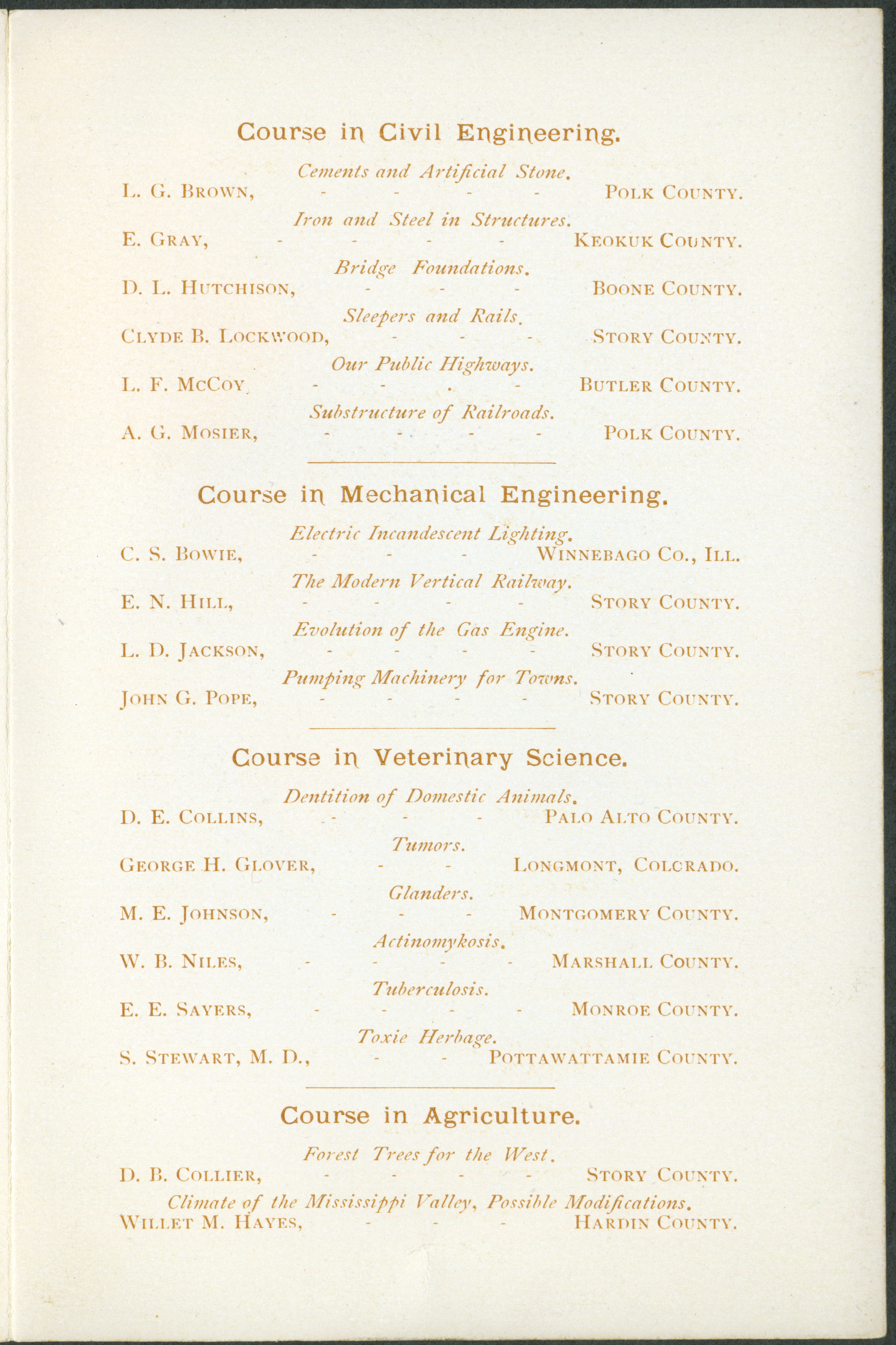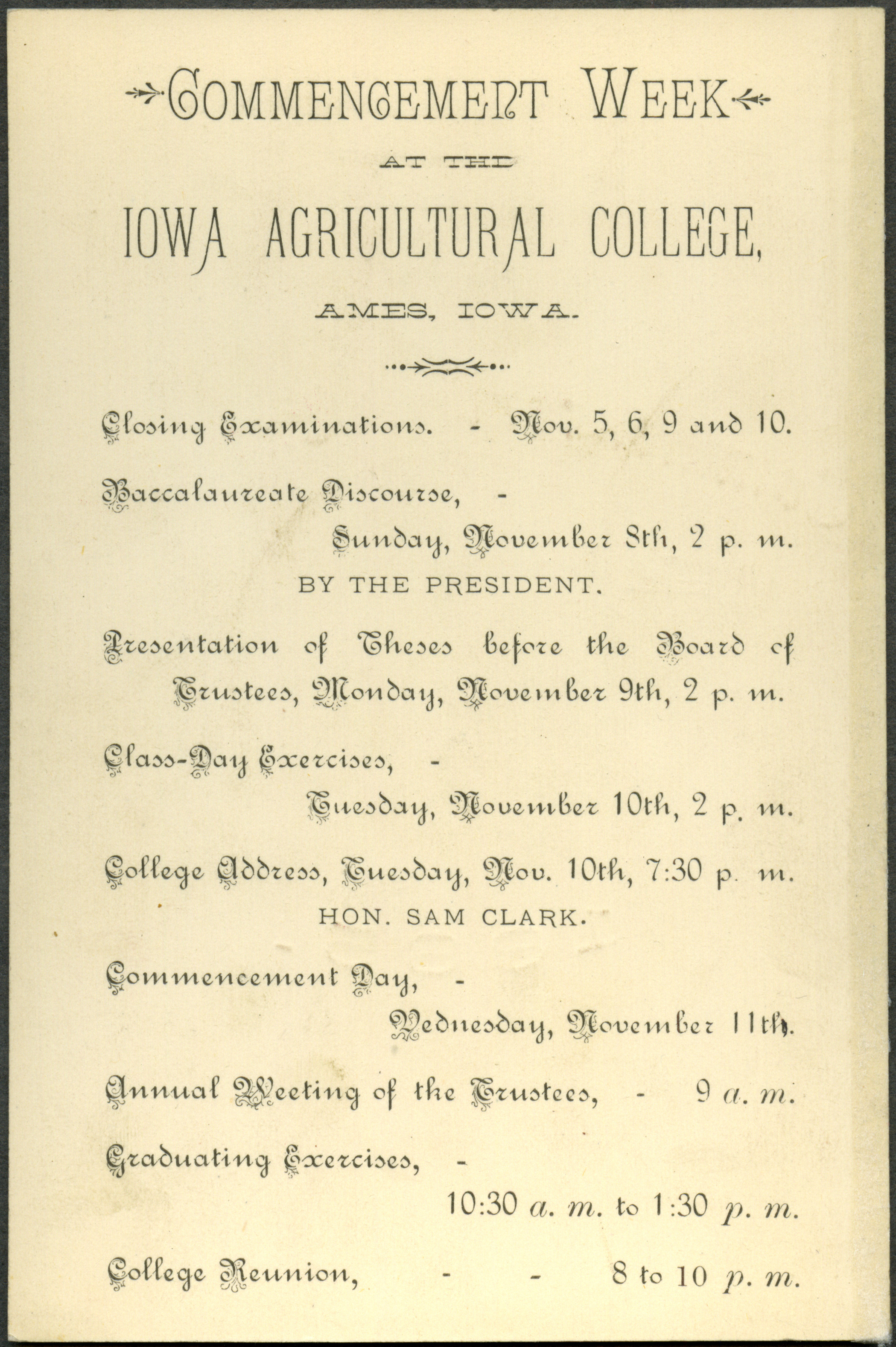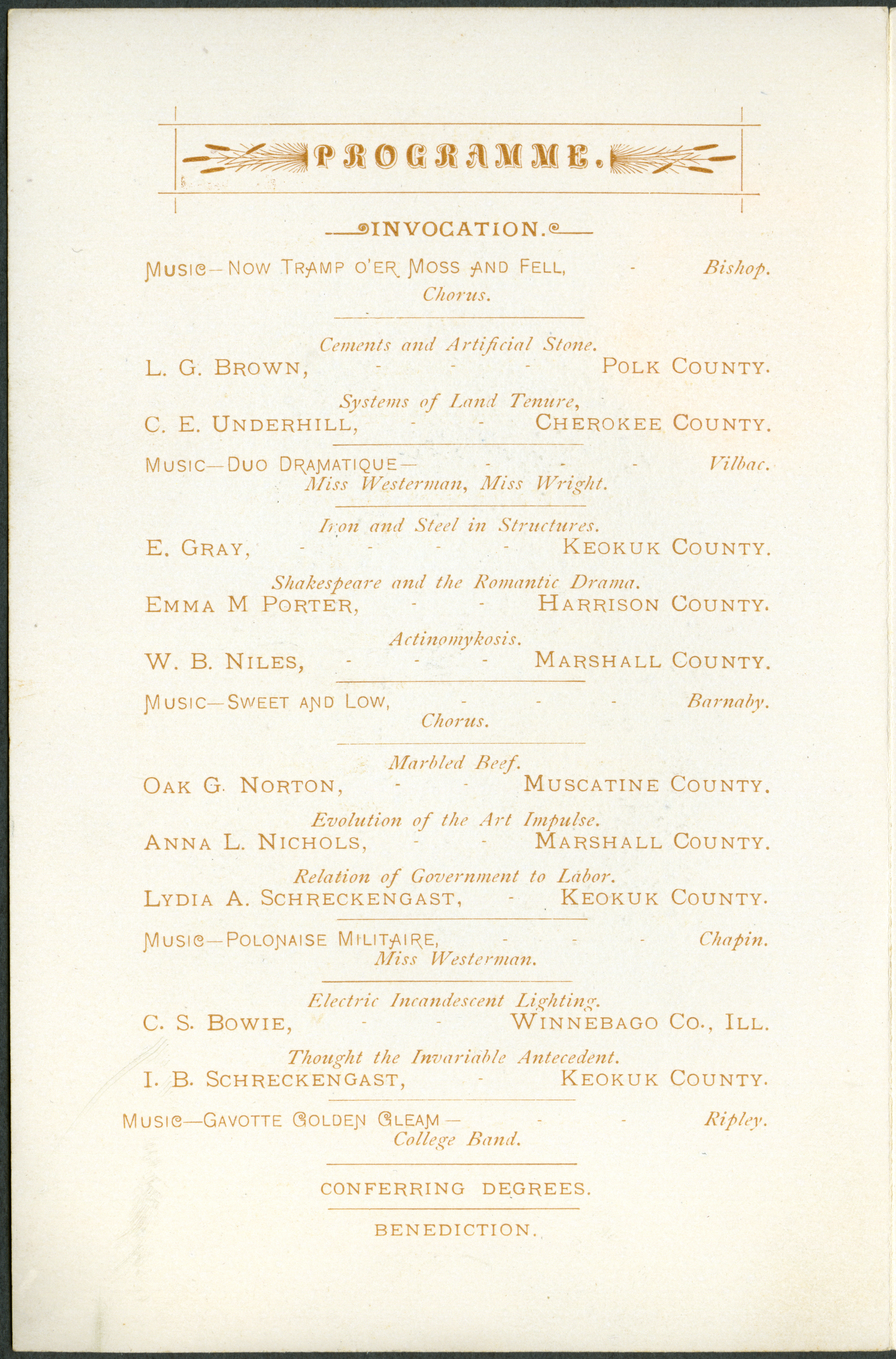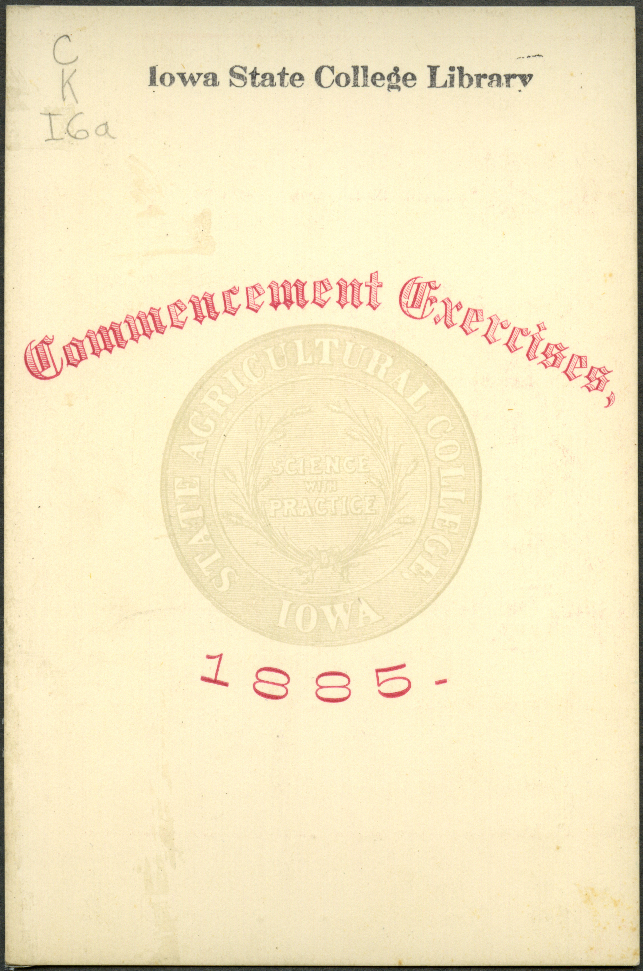 - "Fourteenth annual commencement, Iowa State College Agriculture and Mechanic Arts, 1885", Iowa State University Commencement Programs, Iowa State University Library Digital Collections