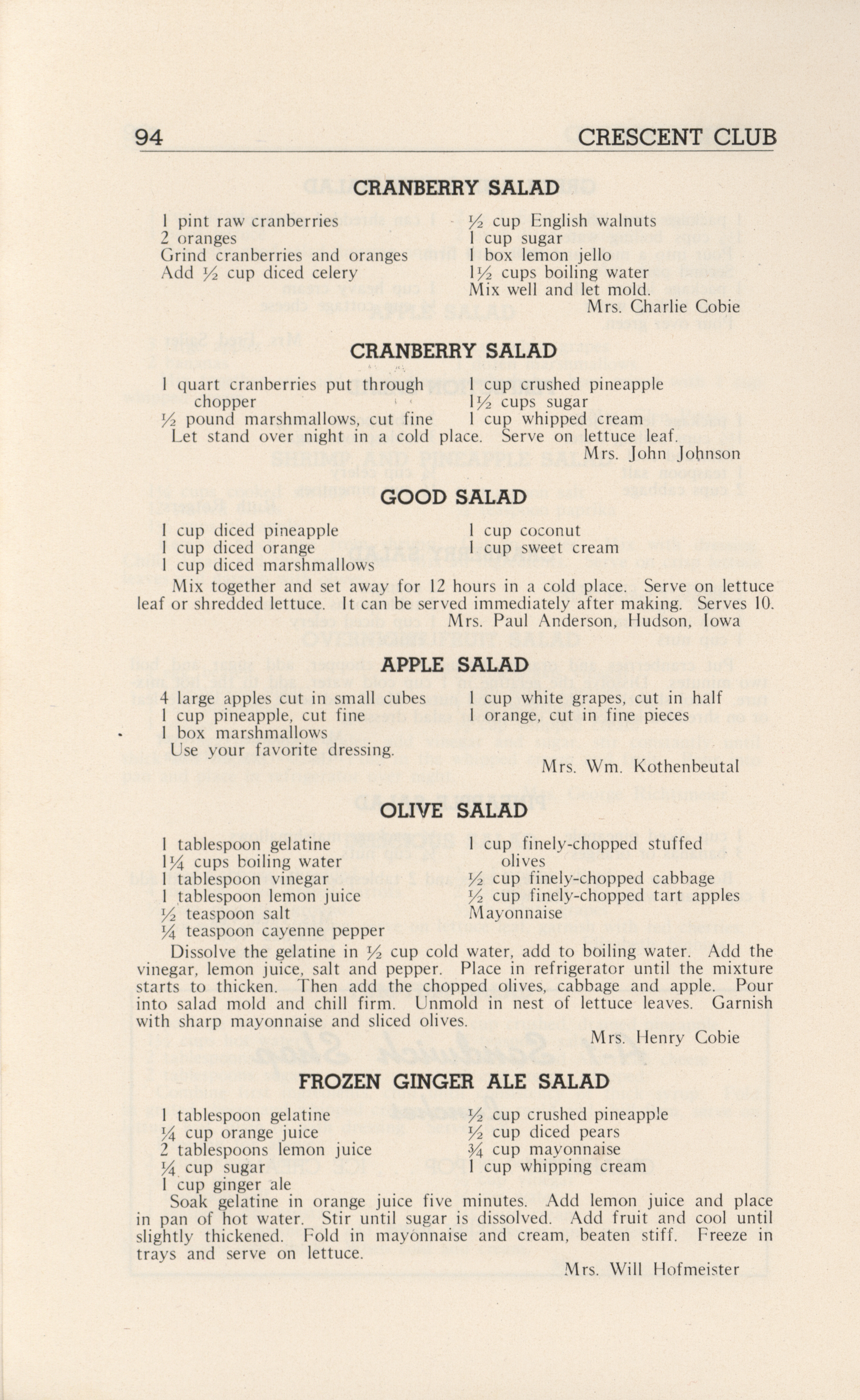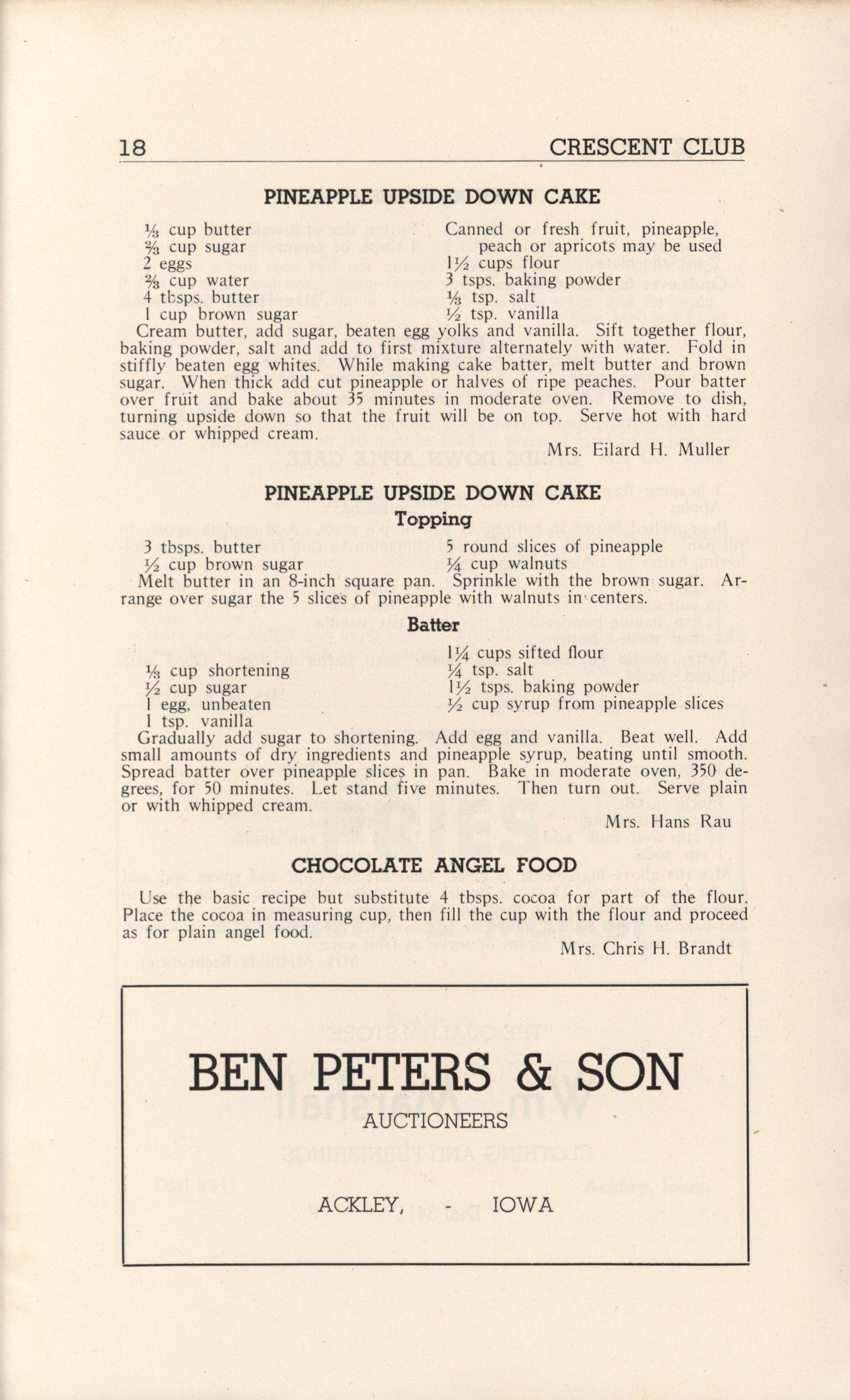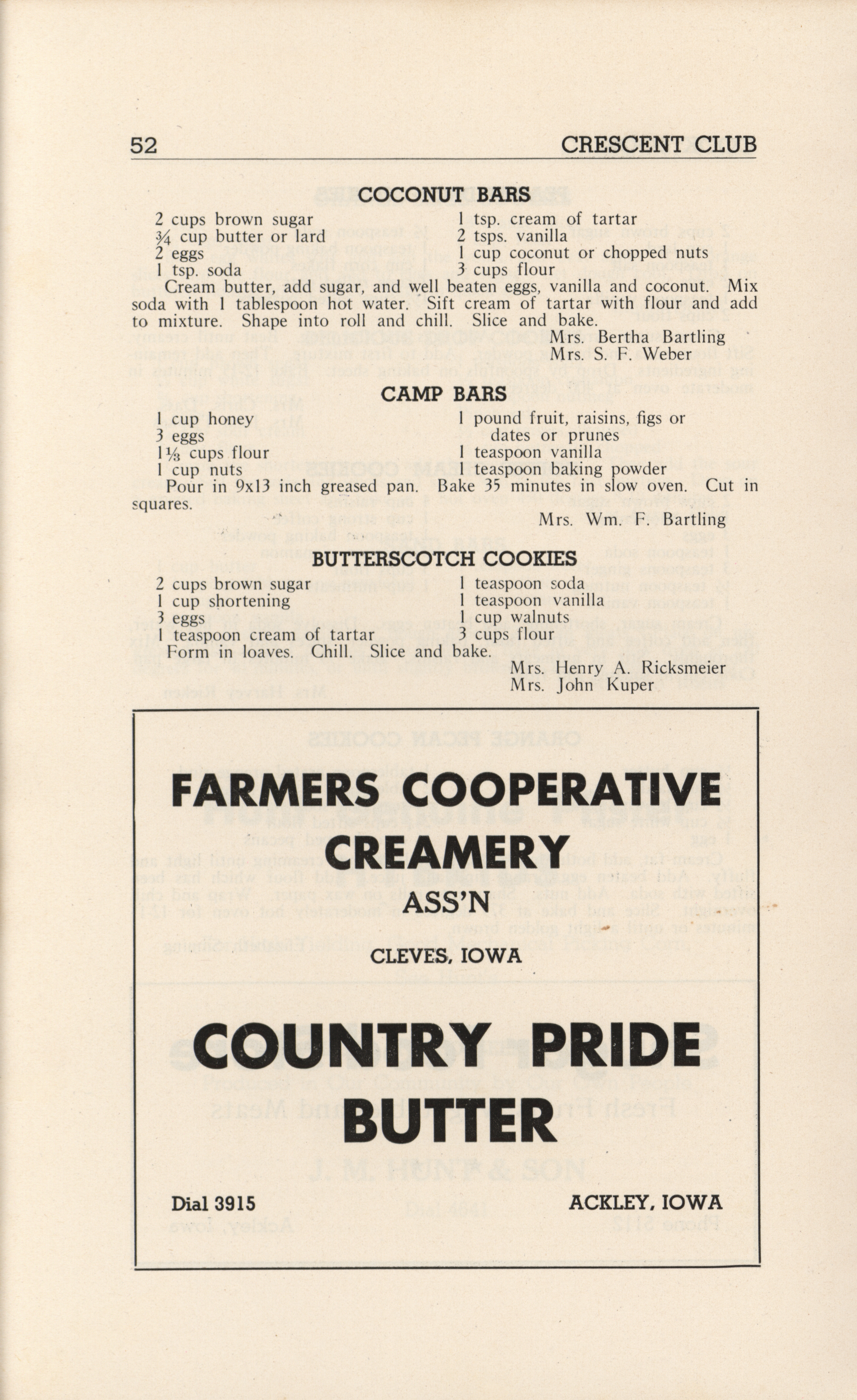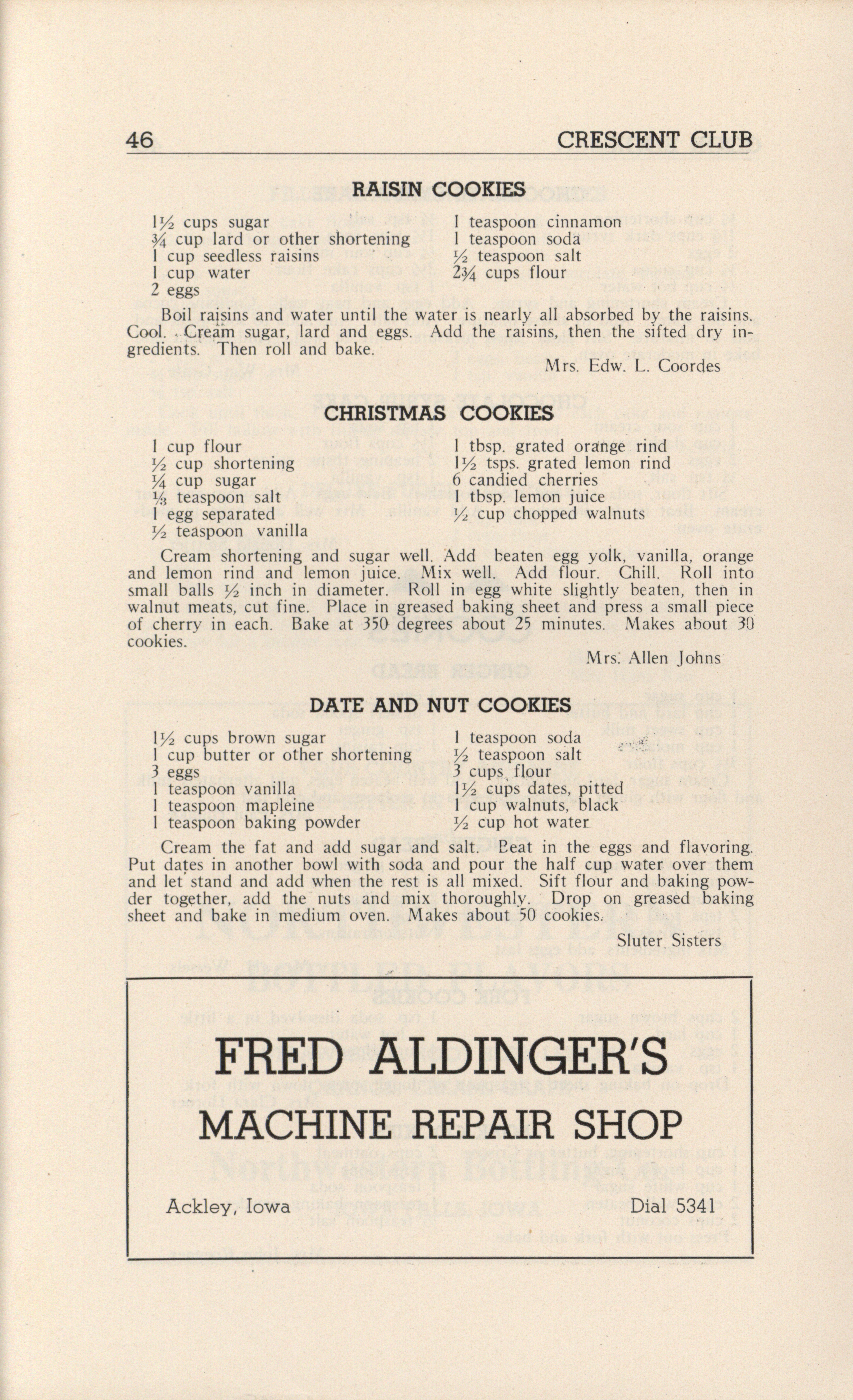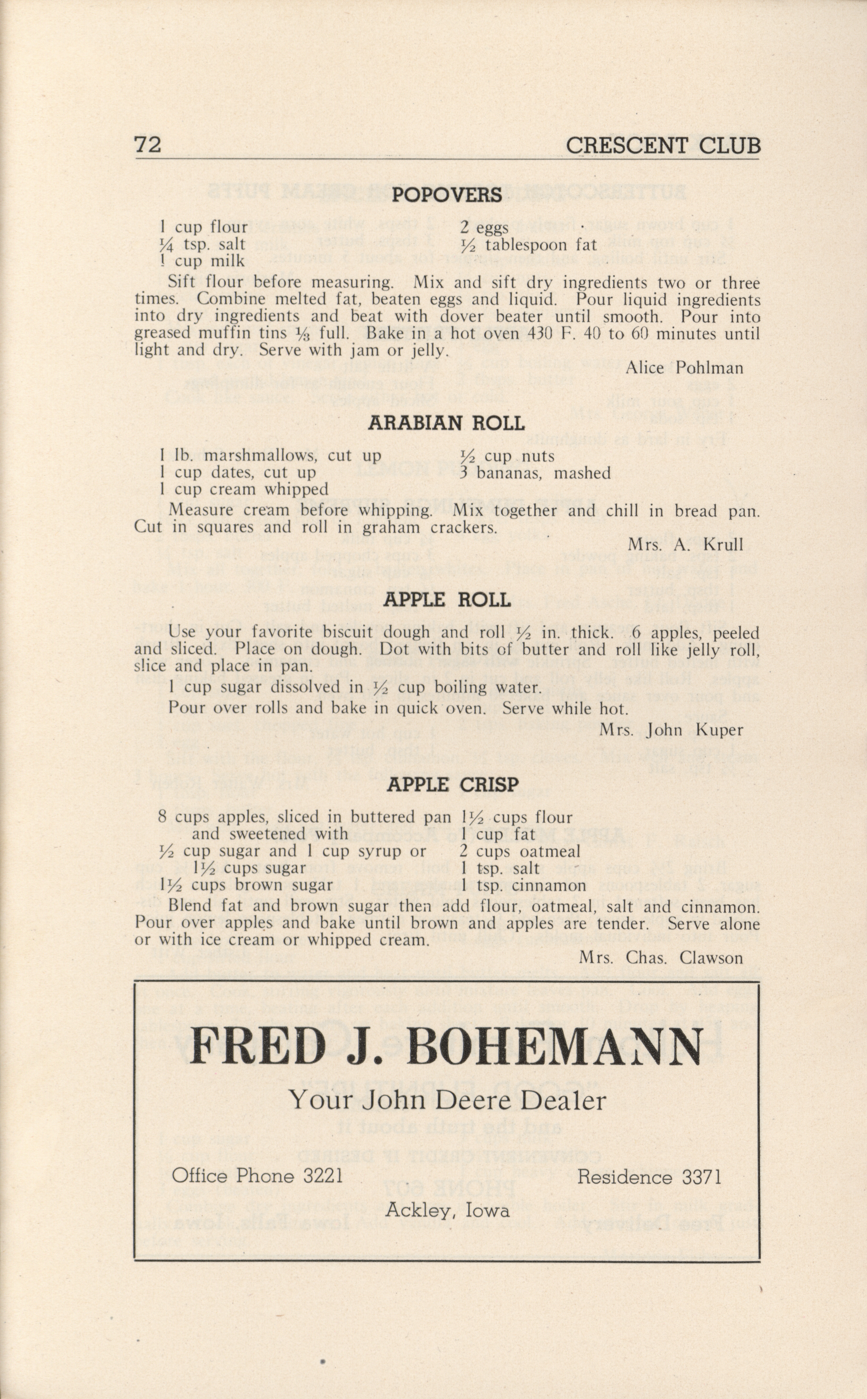 - A community cookbook compiled in 1946 by the Crescent Club of St. John’s Evangelical and Reformed Church in Ackley, Iowa. The book includes recipes contributed by club members and advertisements from local businesses.