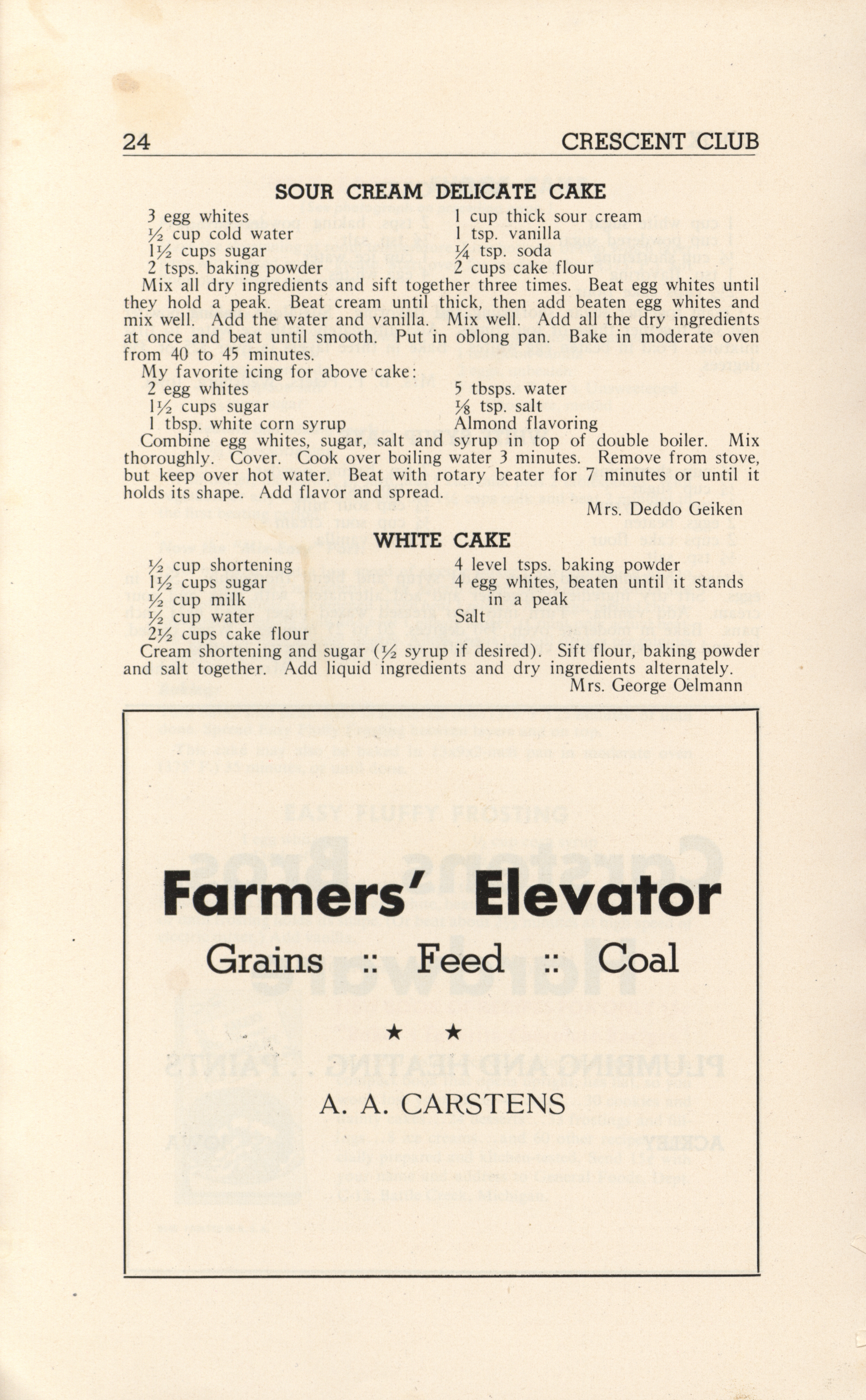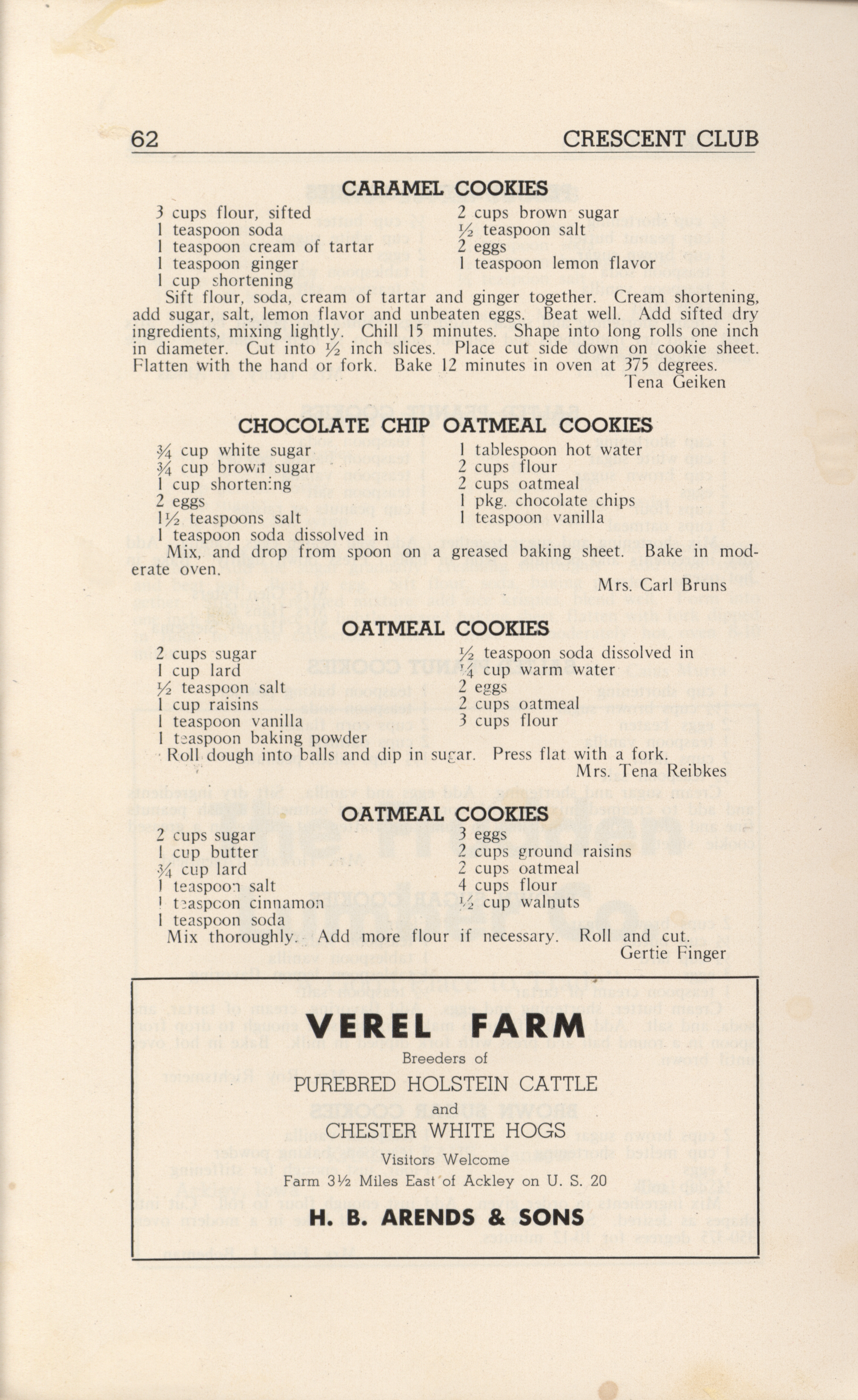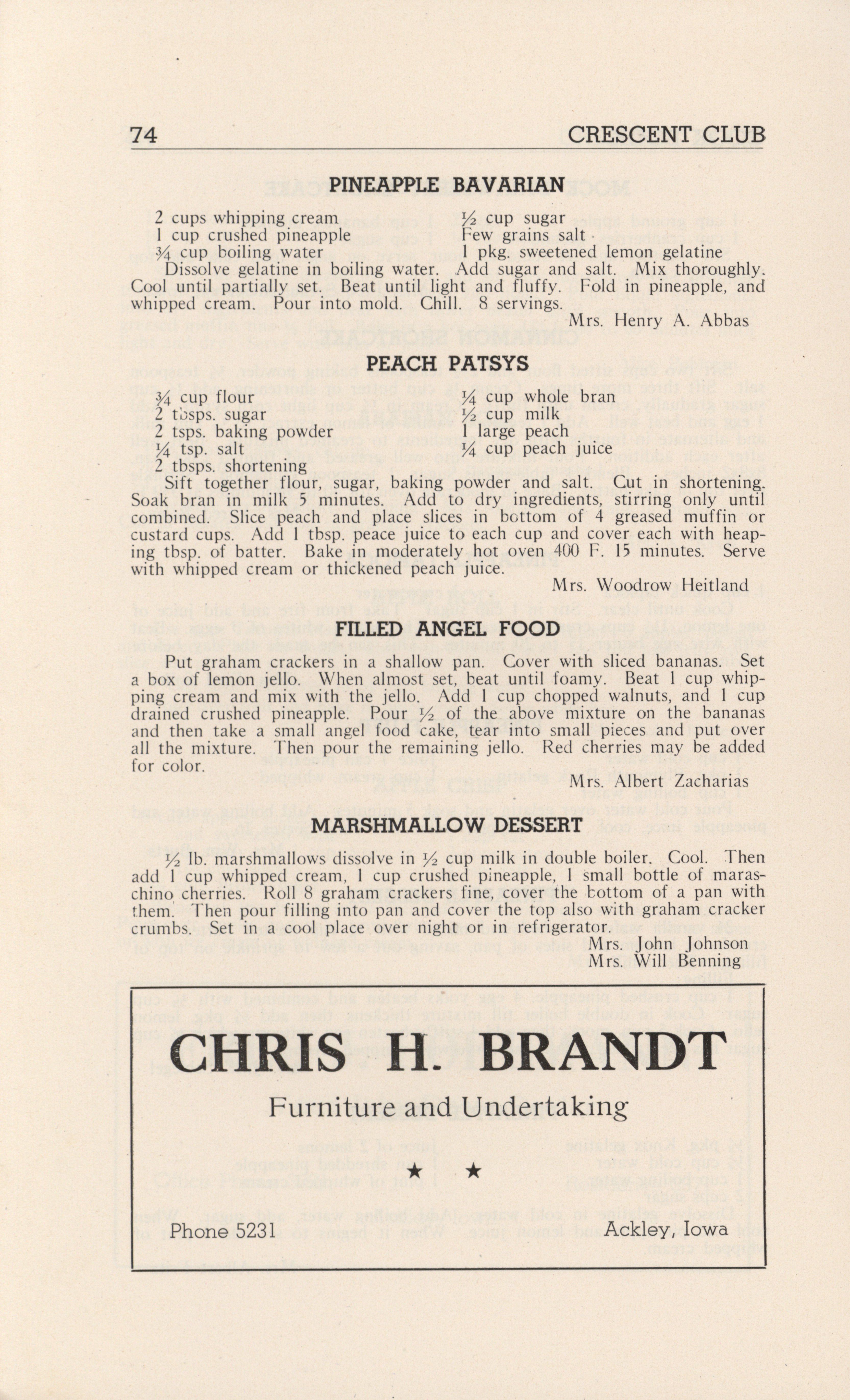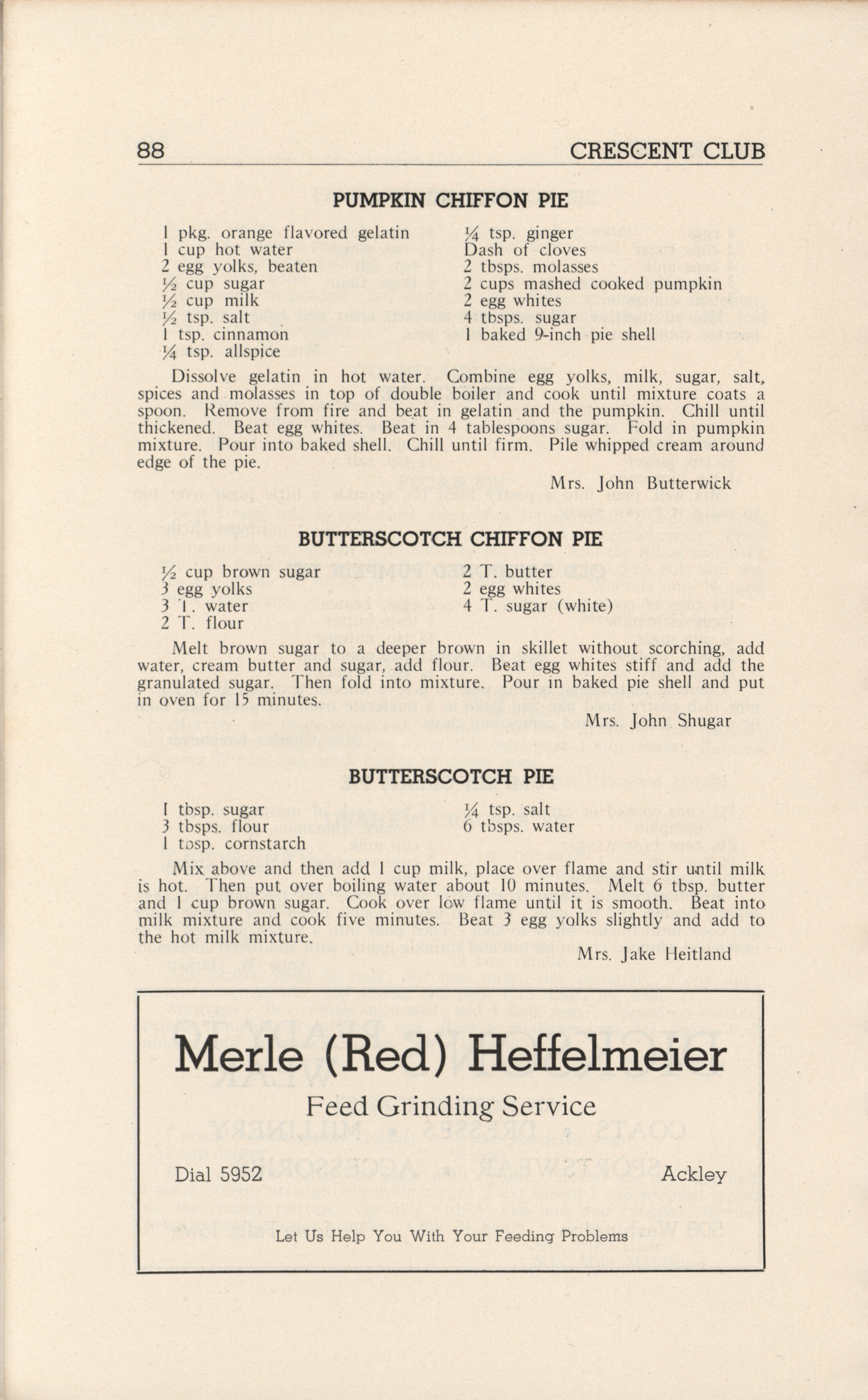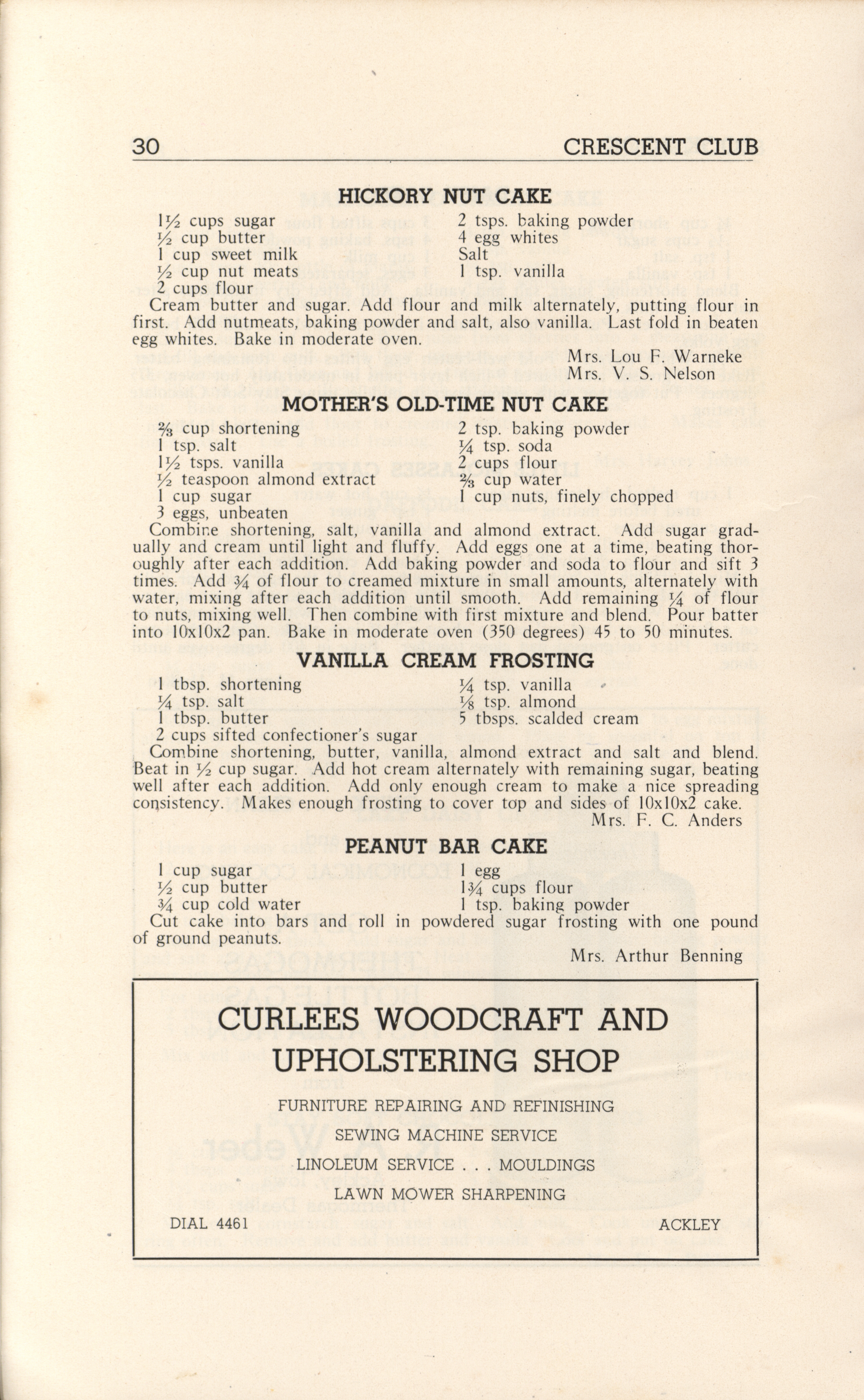 - A community cookbook compiled in 1946 by the Crescent Club of St. John’s Evangelical and Reformed Church in Ackley, Iowa. The book includes recipes contributed by club members and advertisements from local businesses.