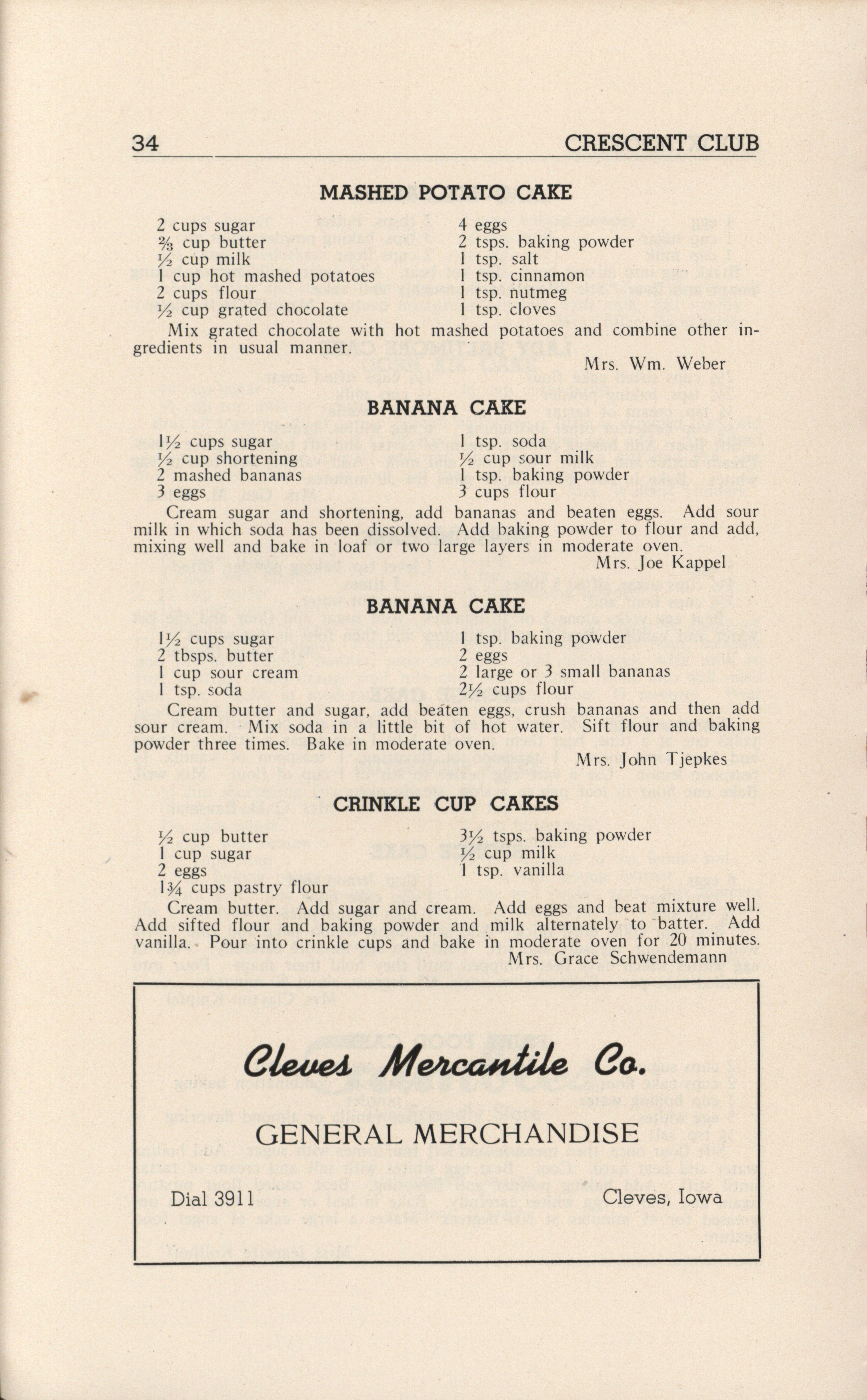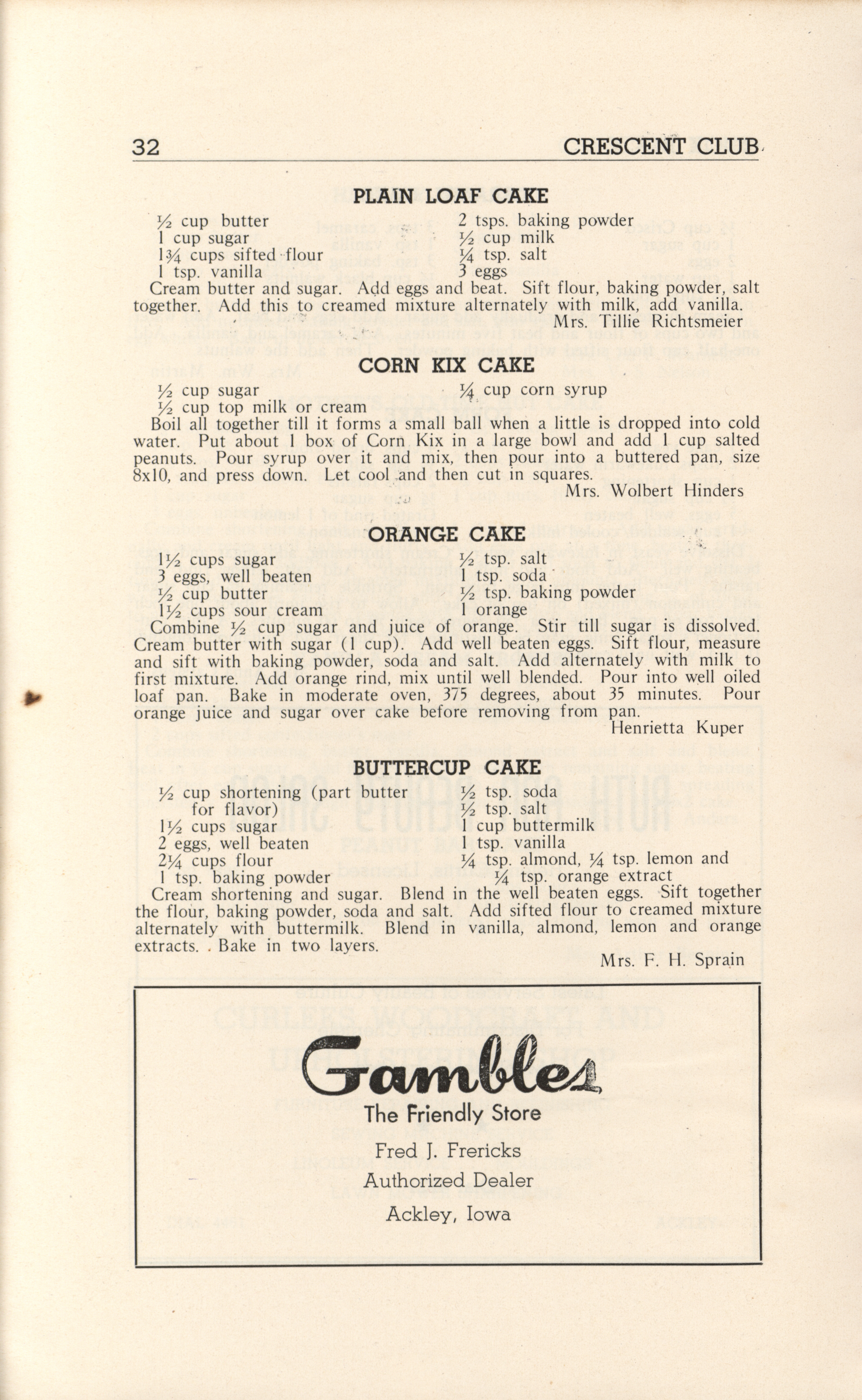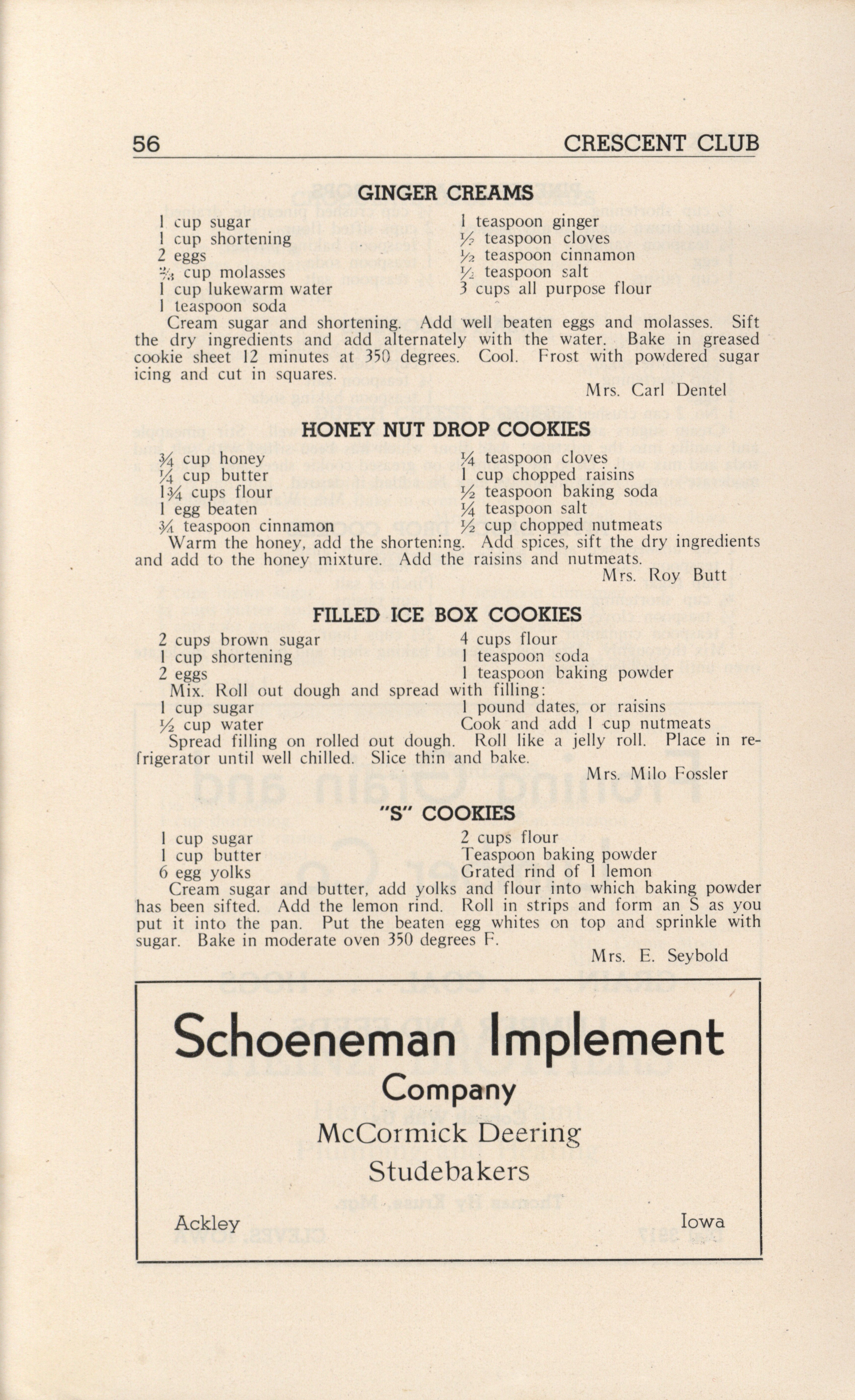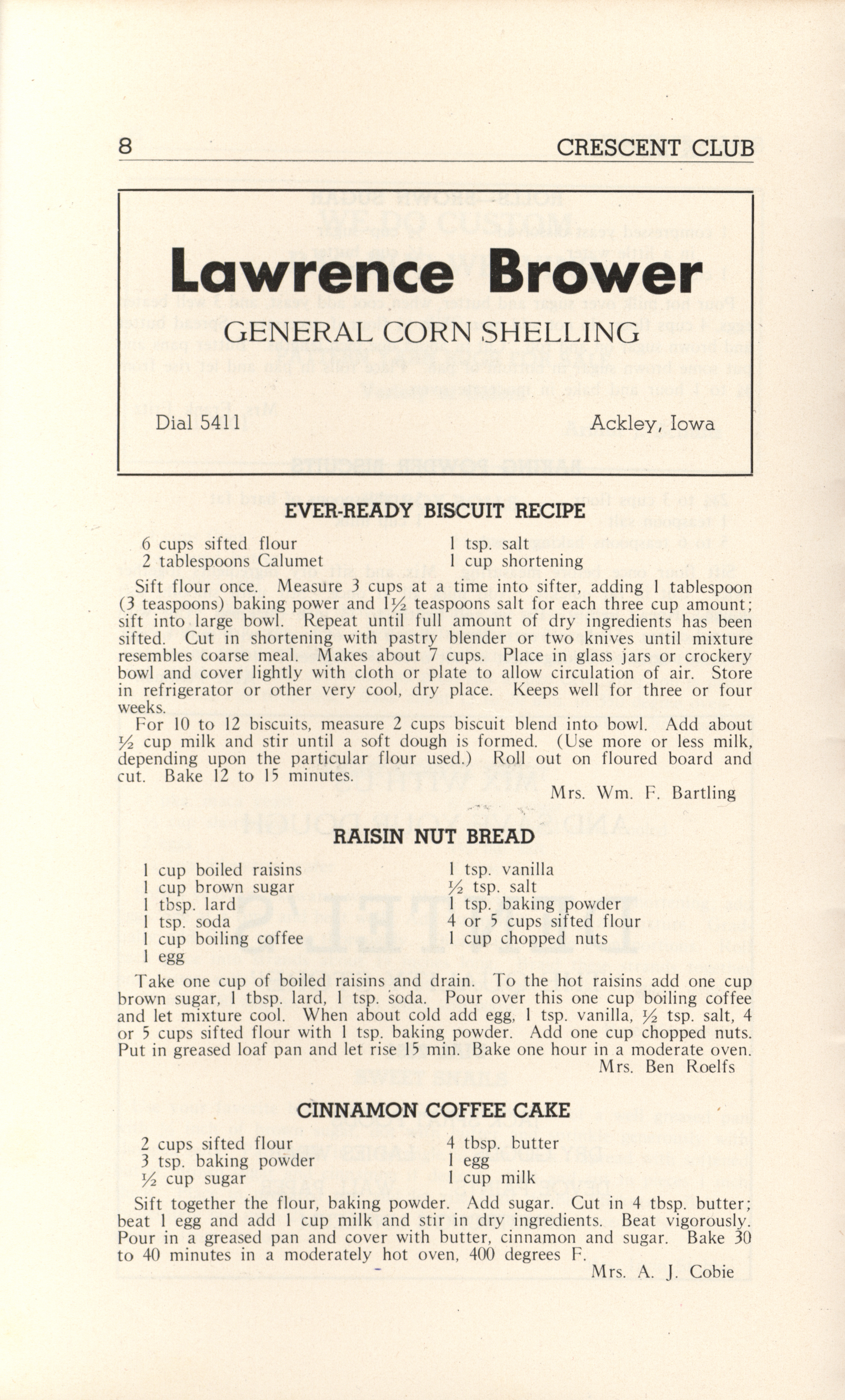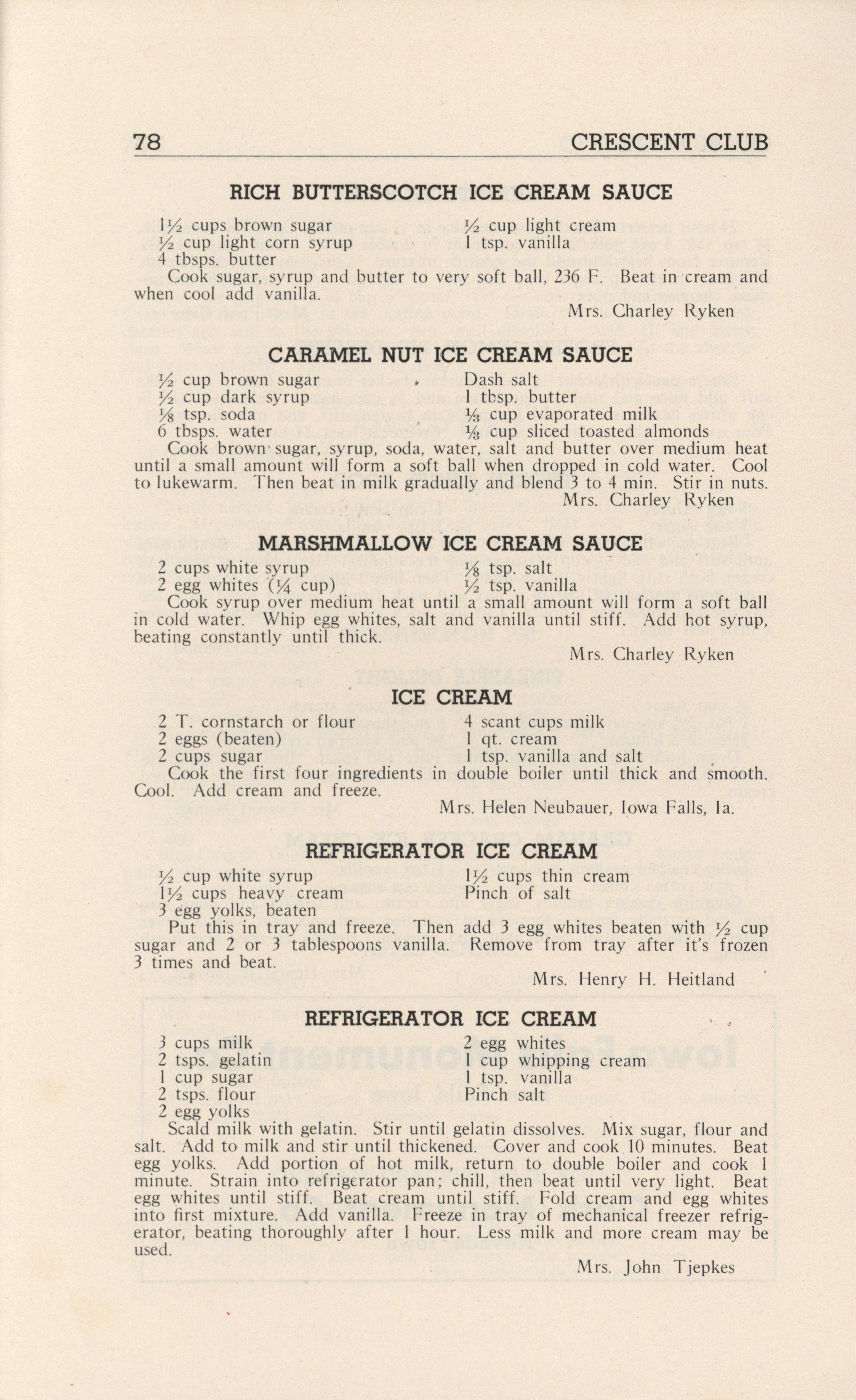 - A community cookbook compiled in 1946 by the Crescent Club of St. John’s Evangelical and Reformed Church in Ackley, Iowa. The book includes recipes contributed by club members and advertisements from local businesses.