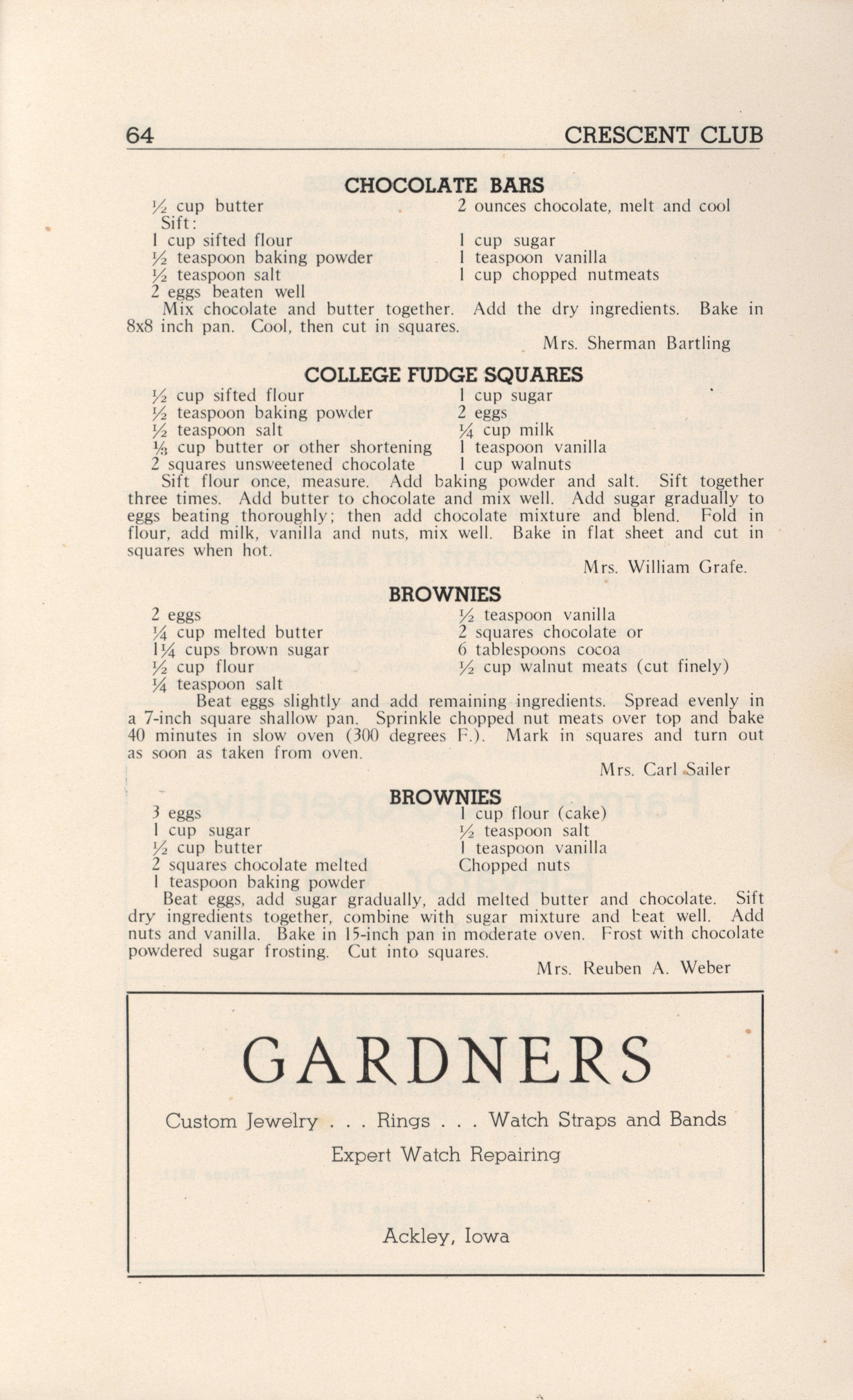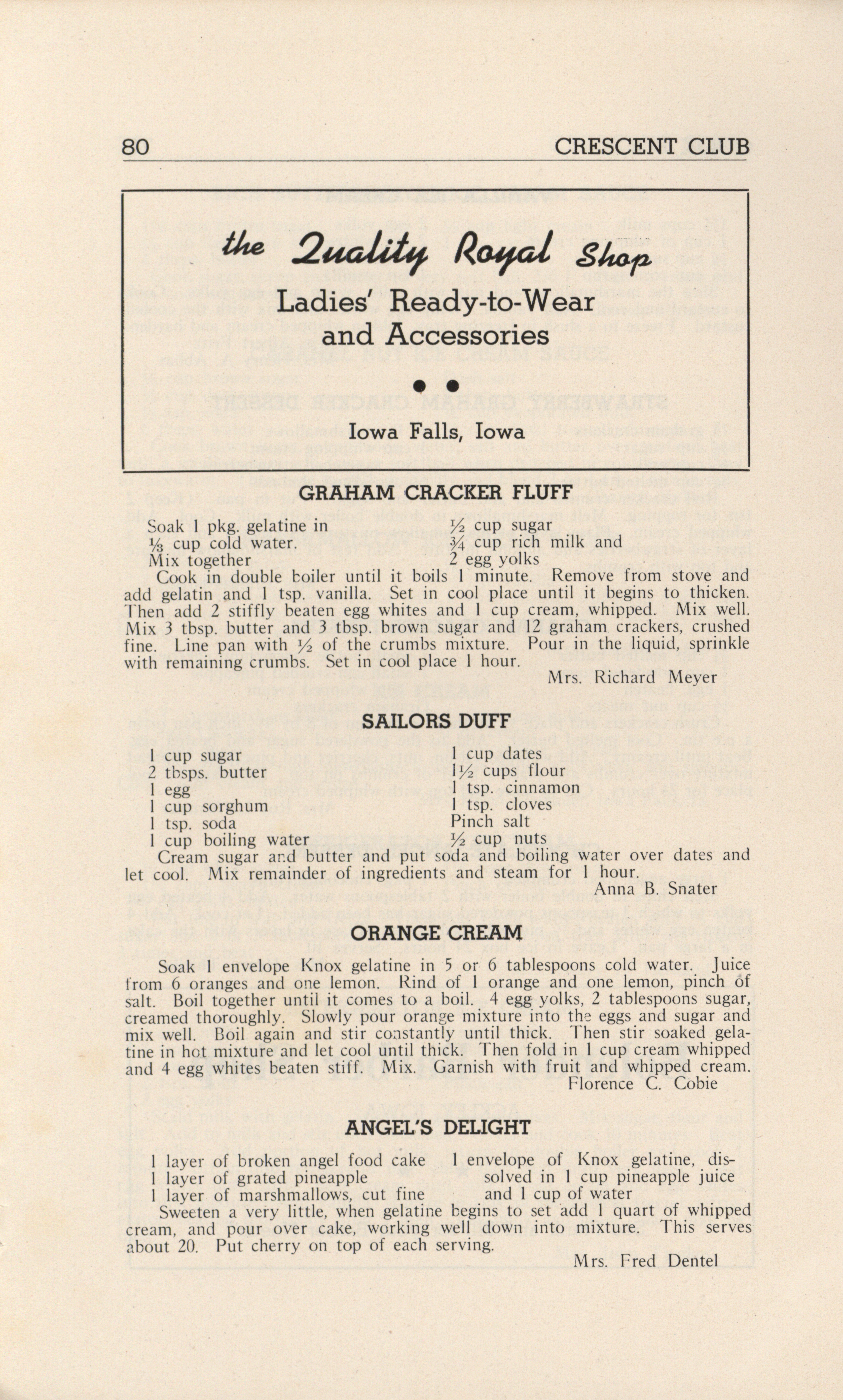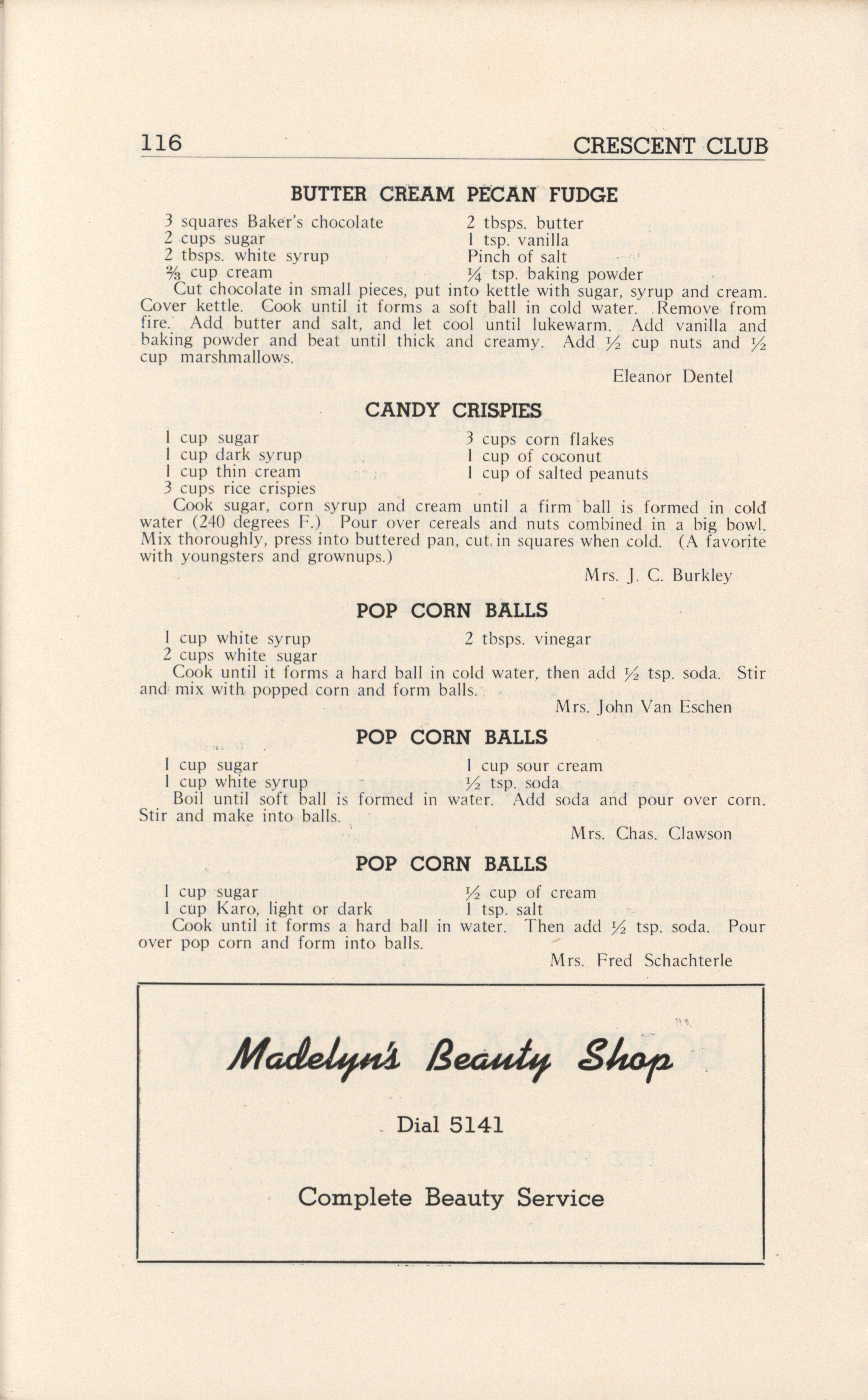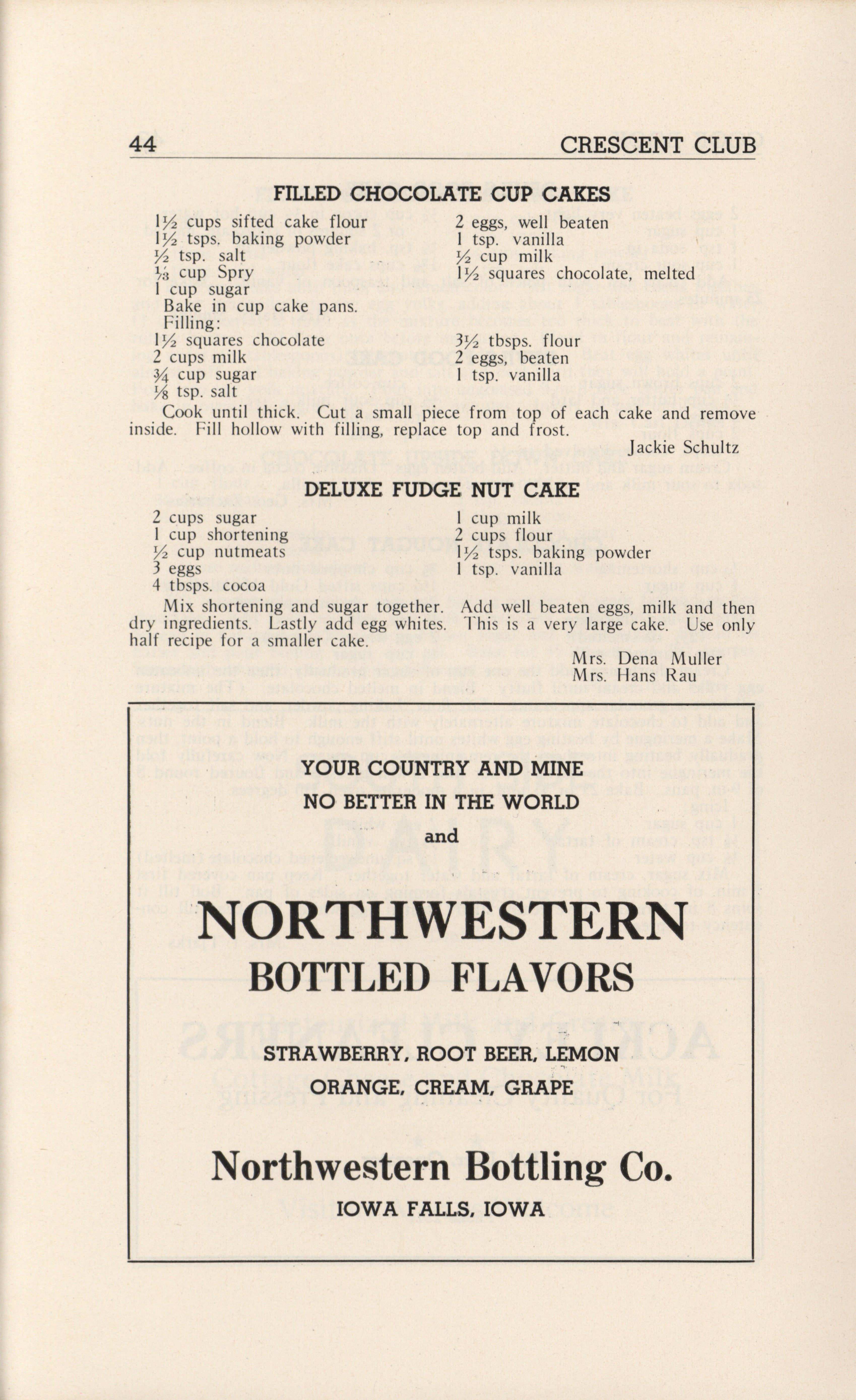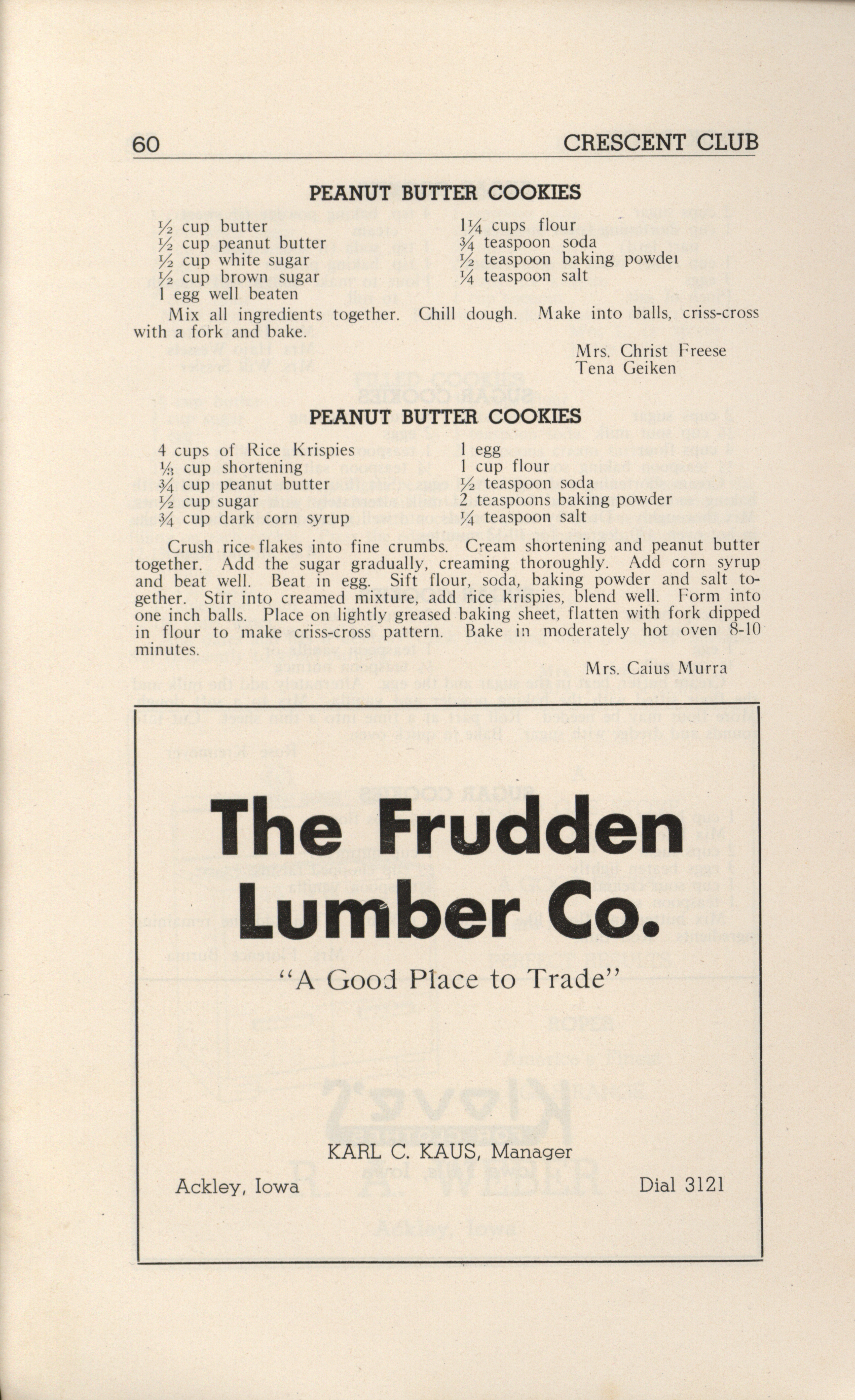 - A community cookbook compiled in 1946 by the Crescent Club of St. John’s Evangelical and Reformed Church in Ackley, Iowa. The book includes recipes contributed by club members and advertisements from local businesses.