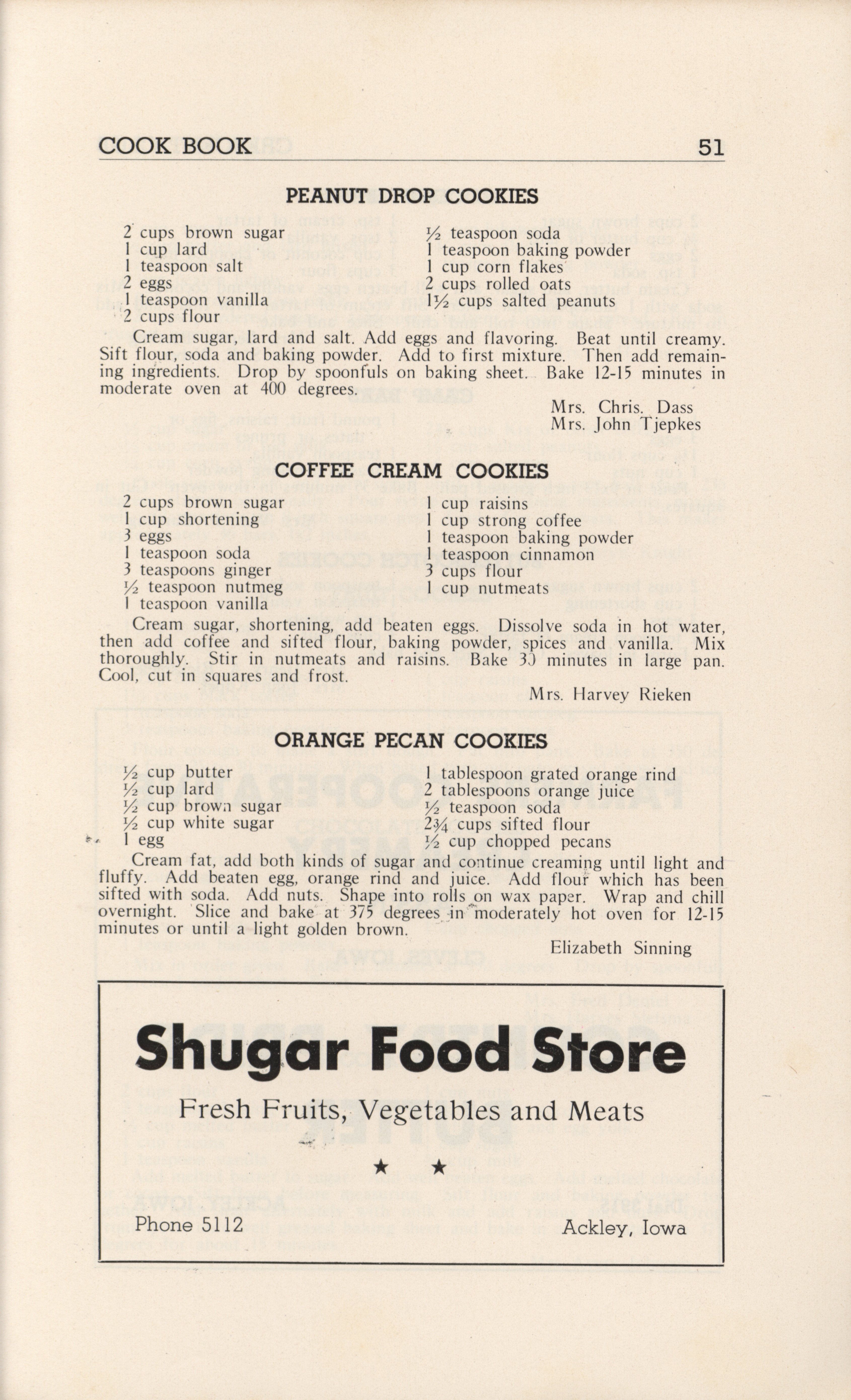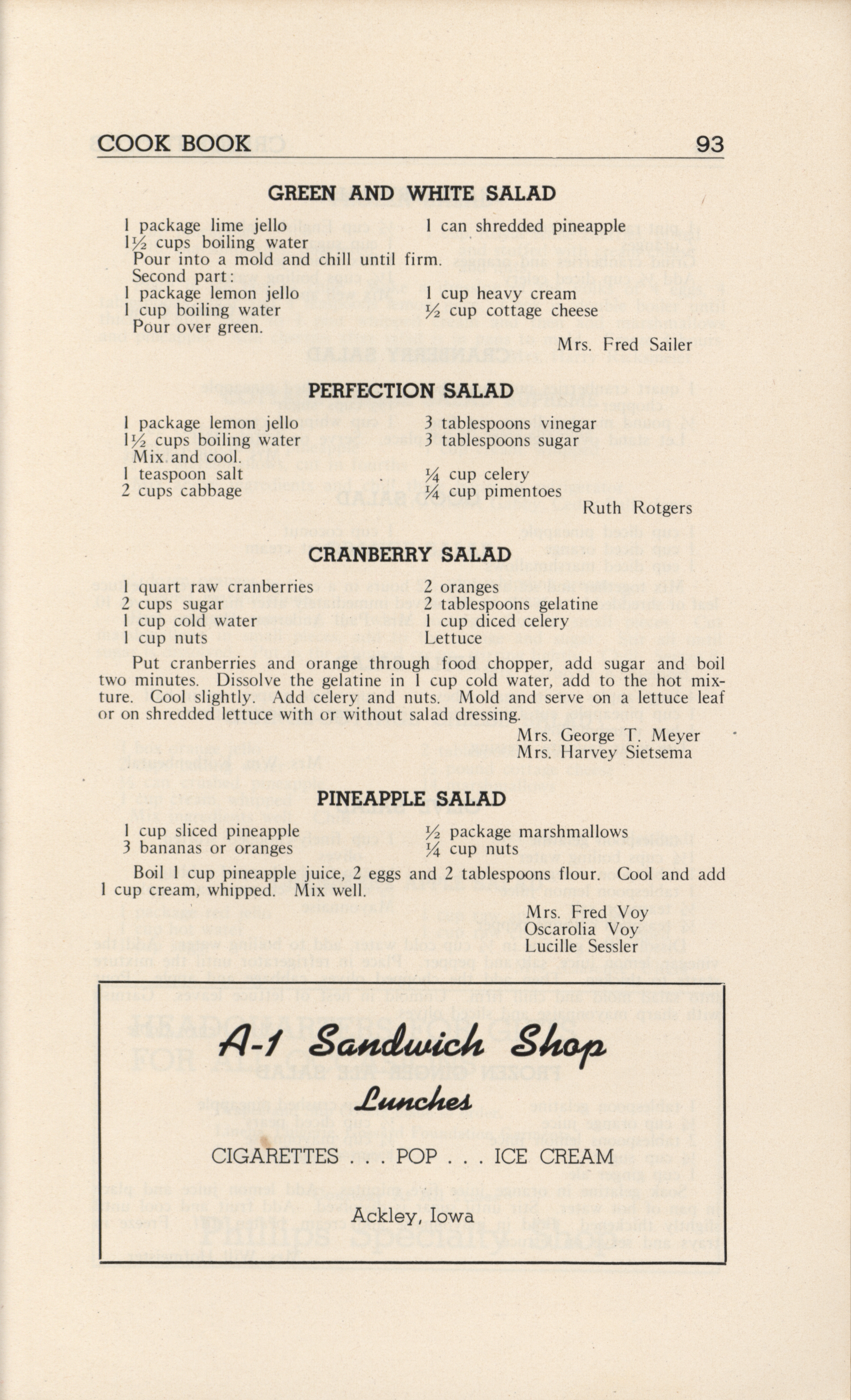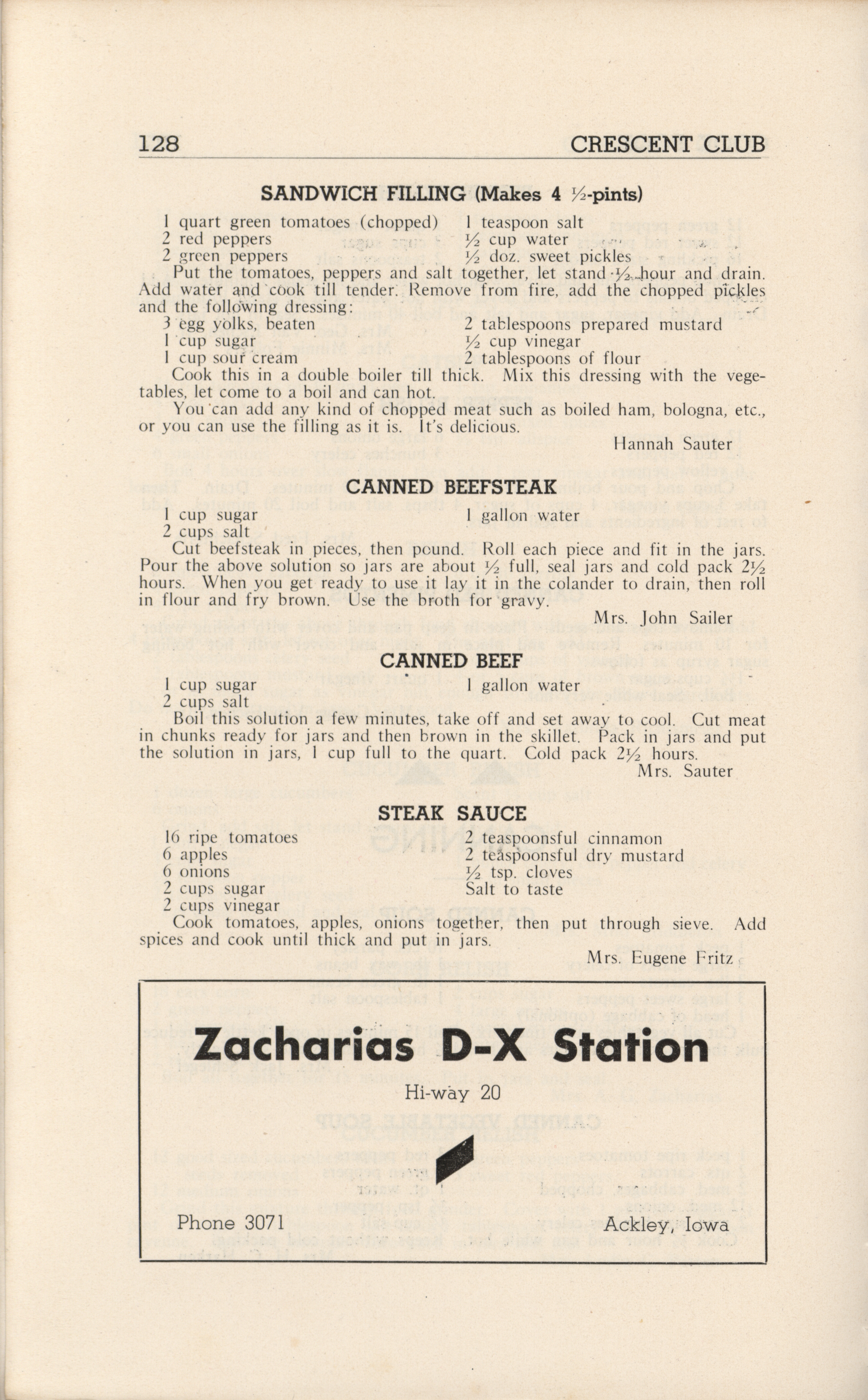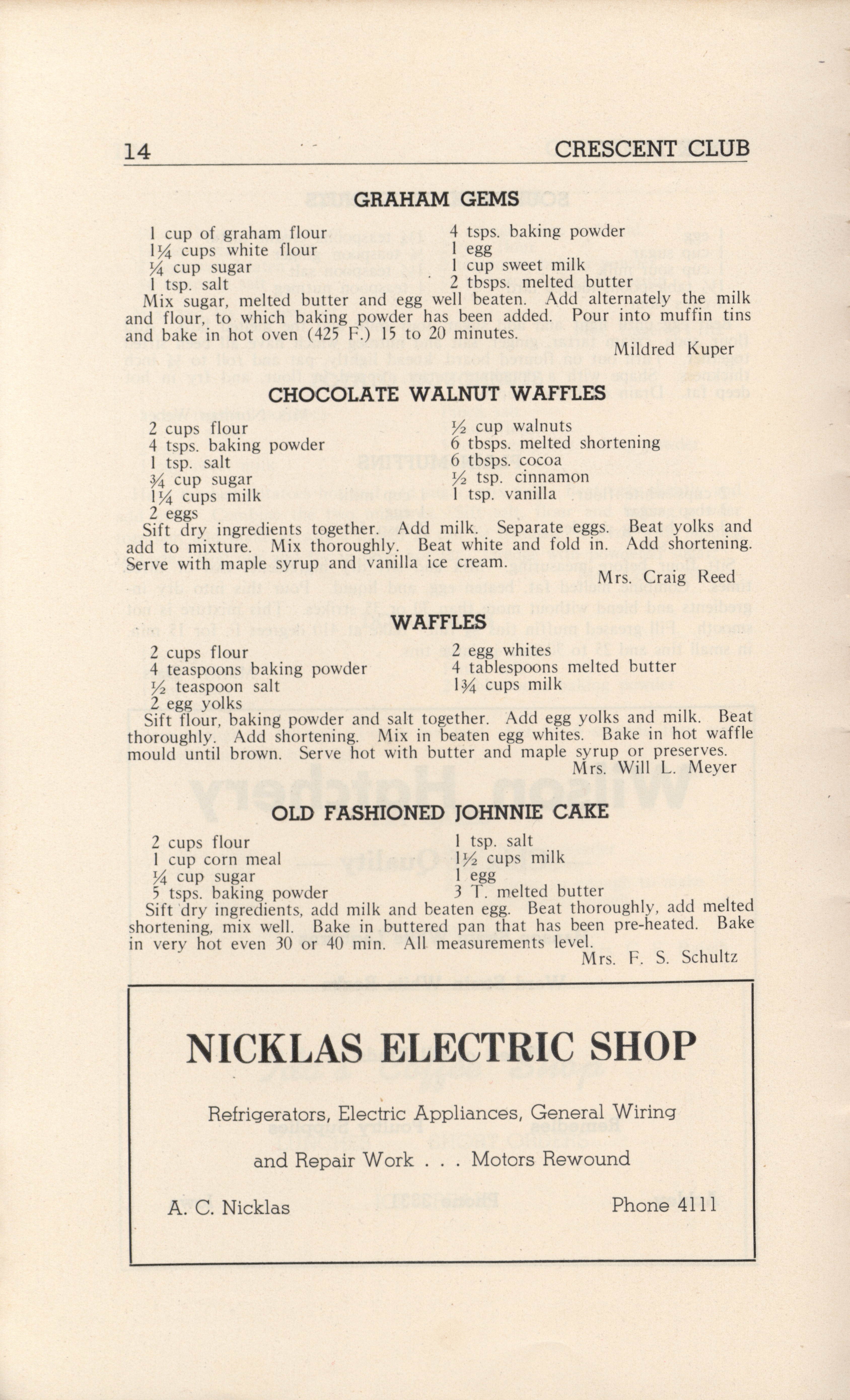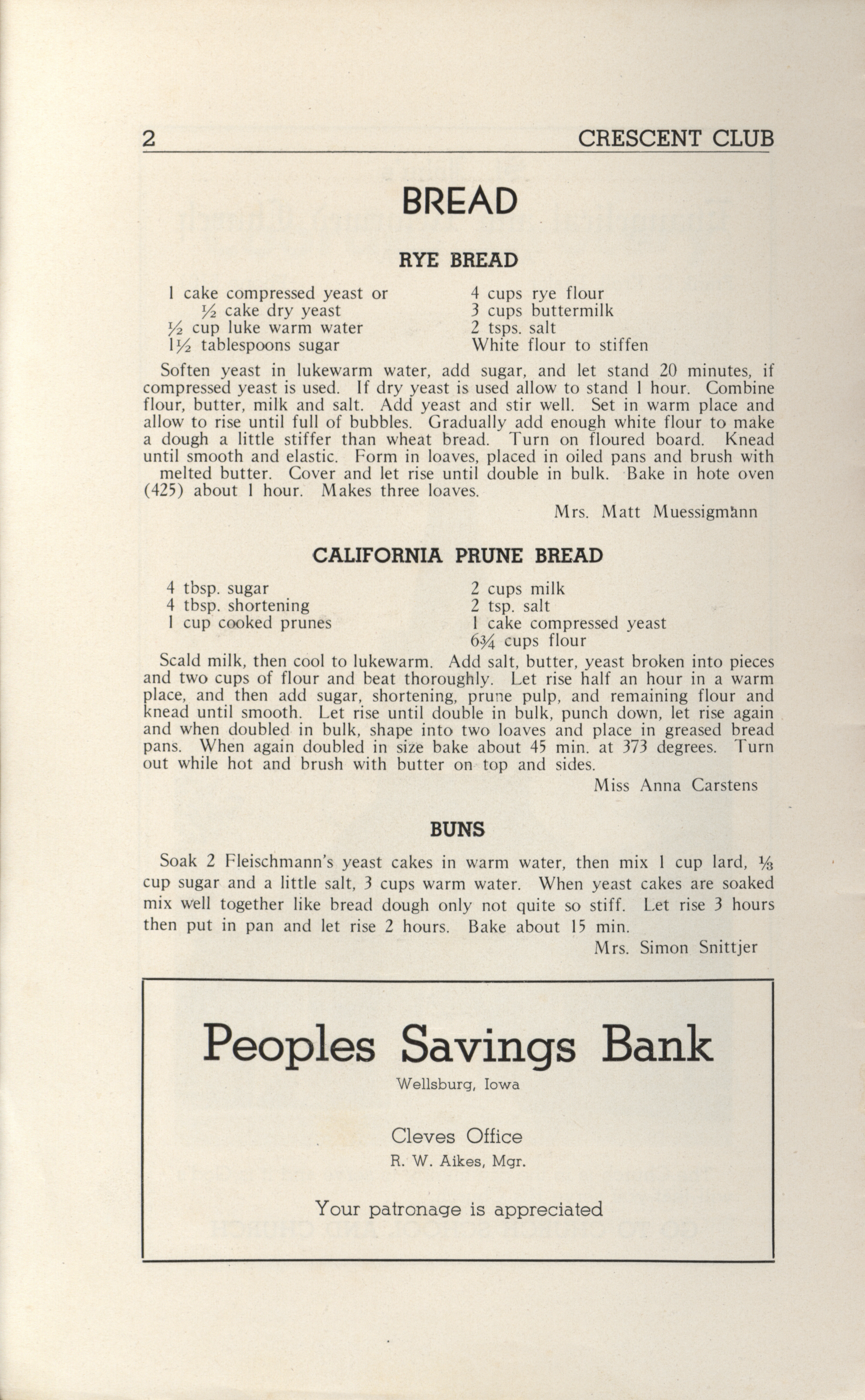 - A community cookbook compiled in 1946 by the Crescent Club of St. John’s Evangelical and Reformed Church in Ackley, Iowa. The book includes recipes contributed by club members and advertisements from local businesses.