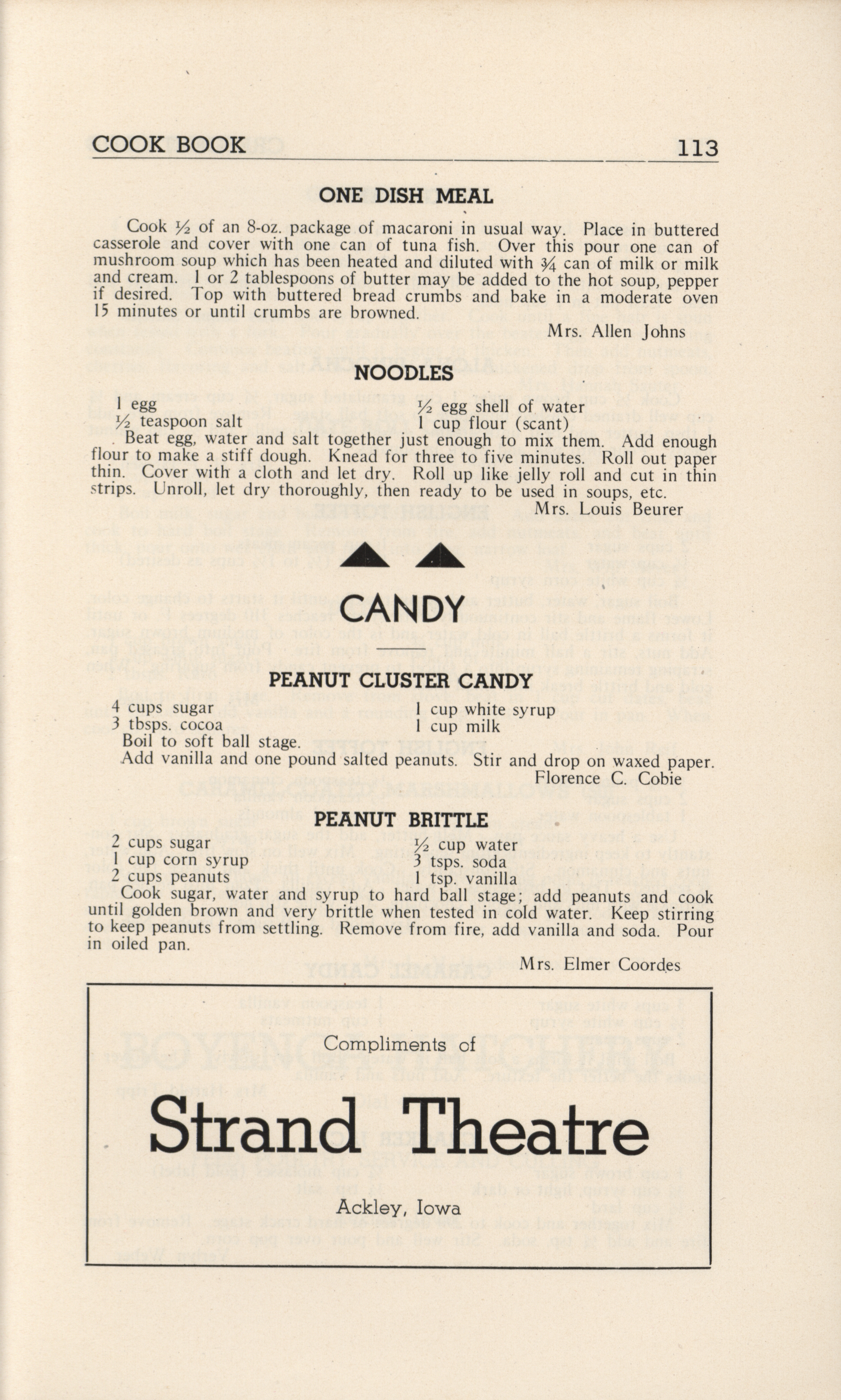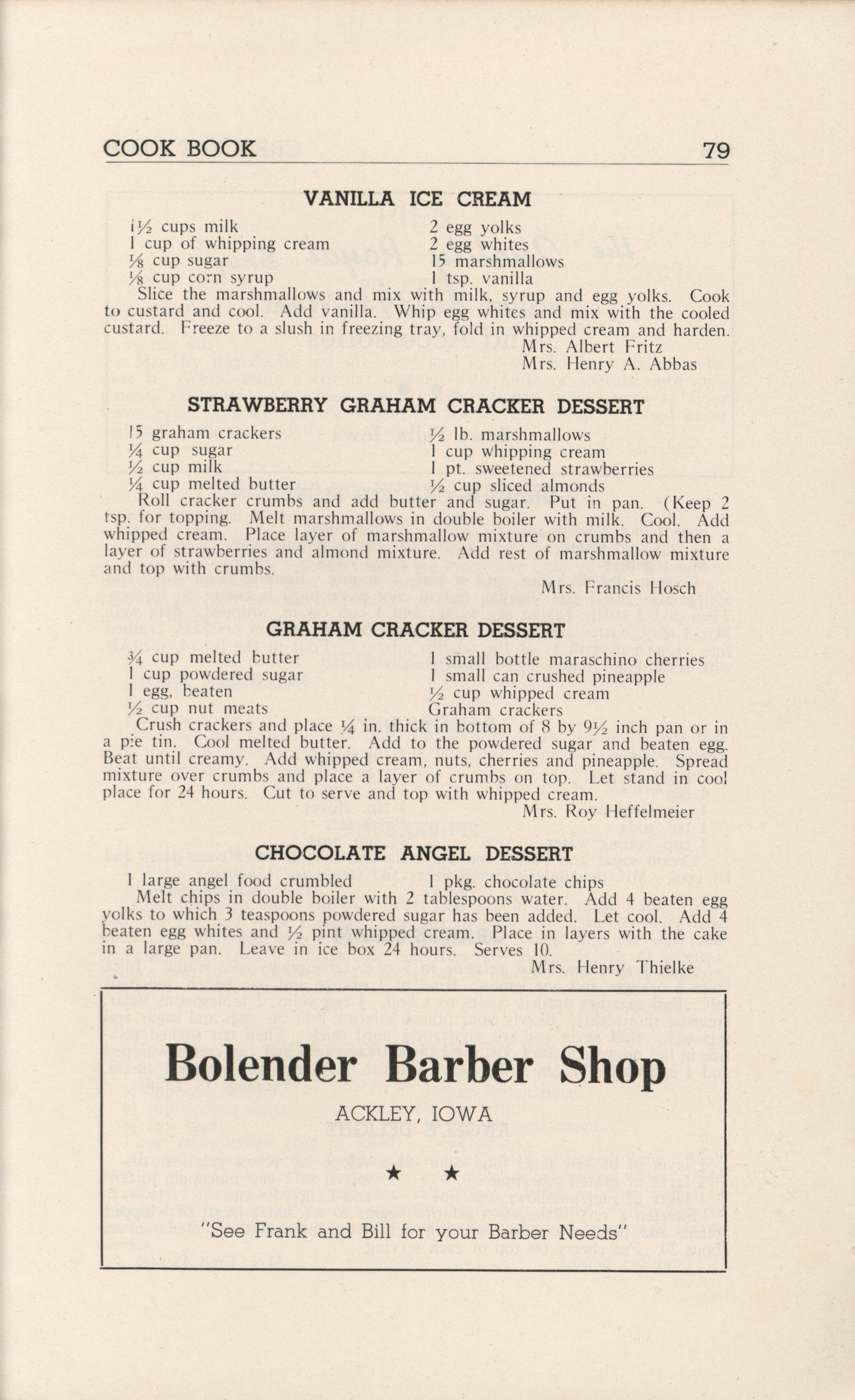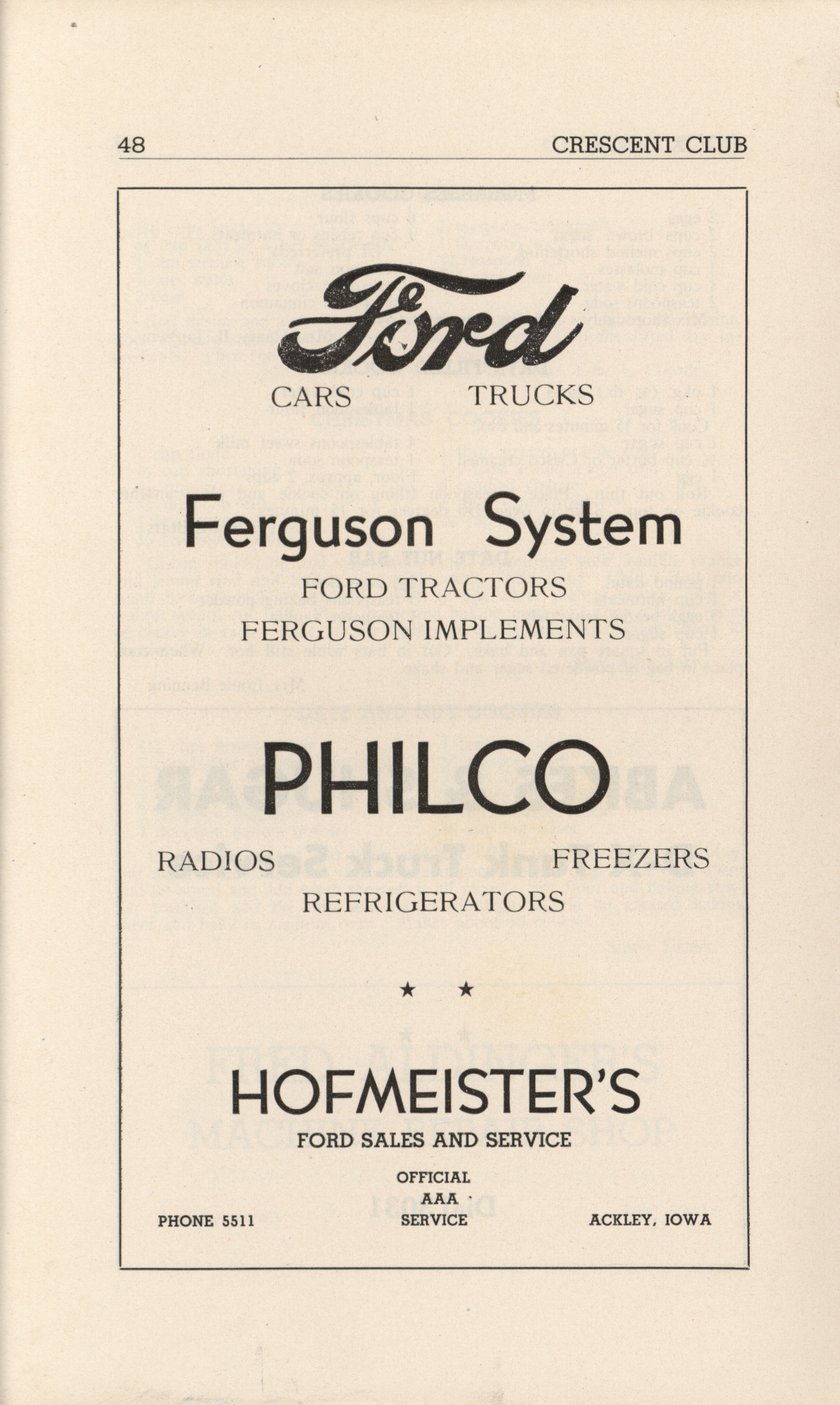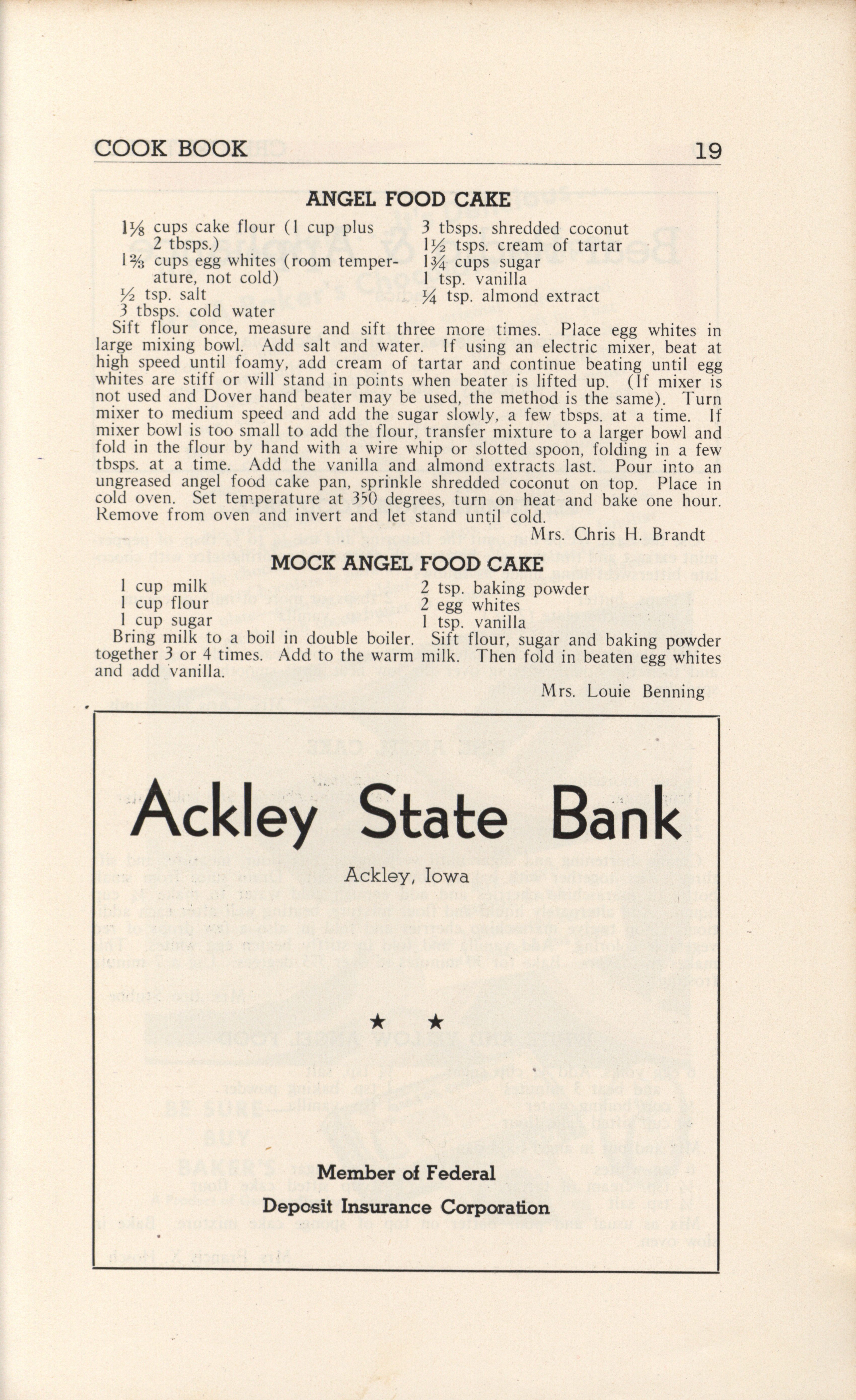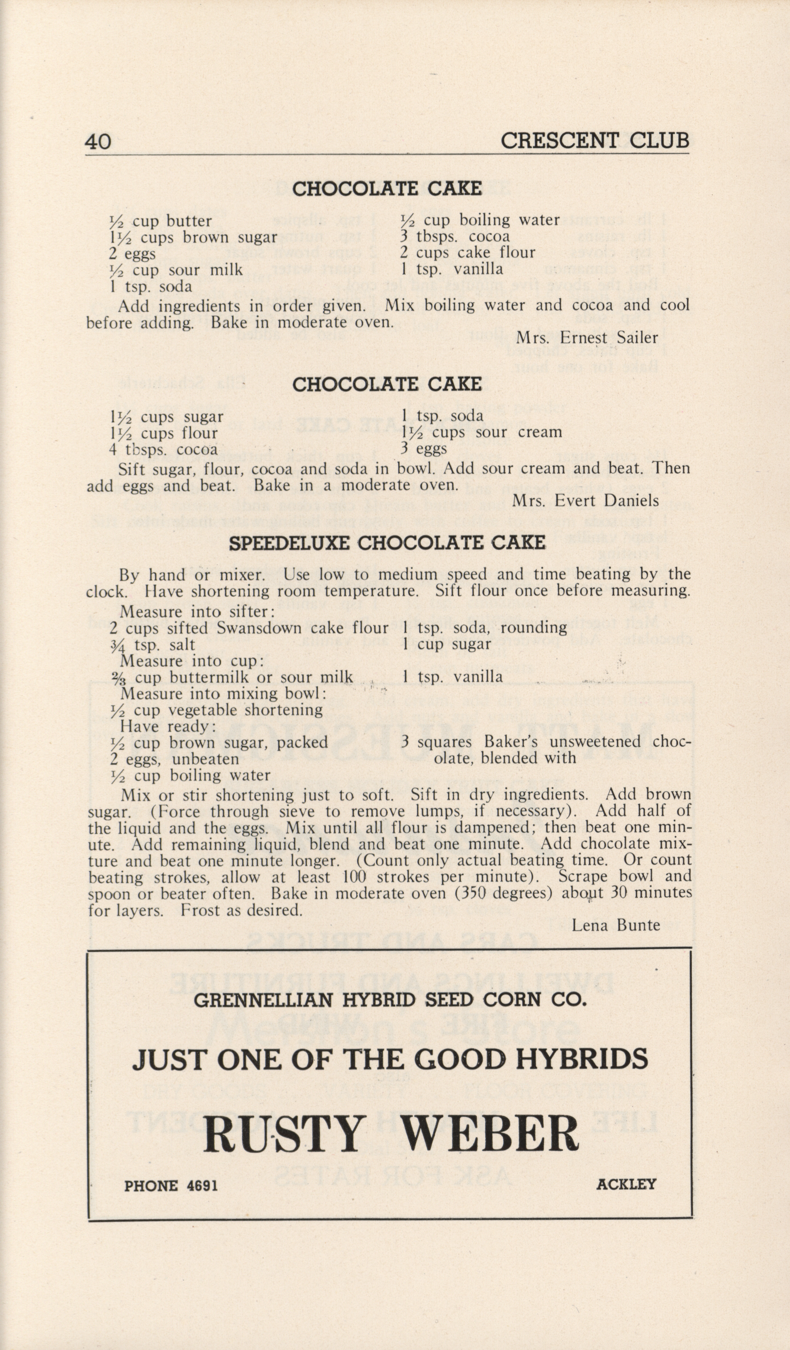 - A community cookbook compiled in 1946 by the Crescent Club of St. John’s Evangelical and Reformed Church in Ackley, Iowa. The book includes recipes contributed by club members and advertisements from local businesses.