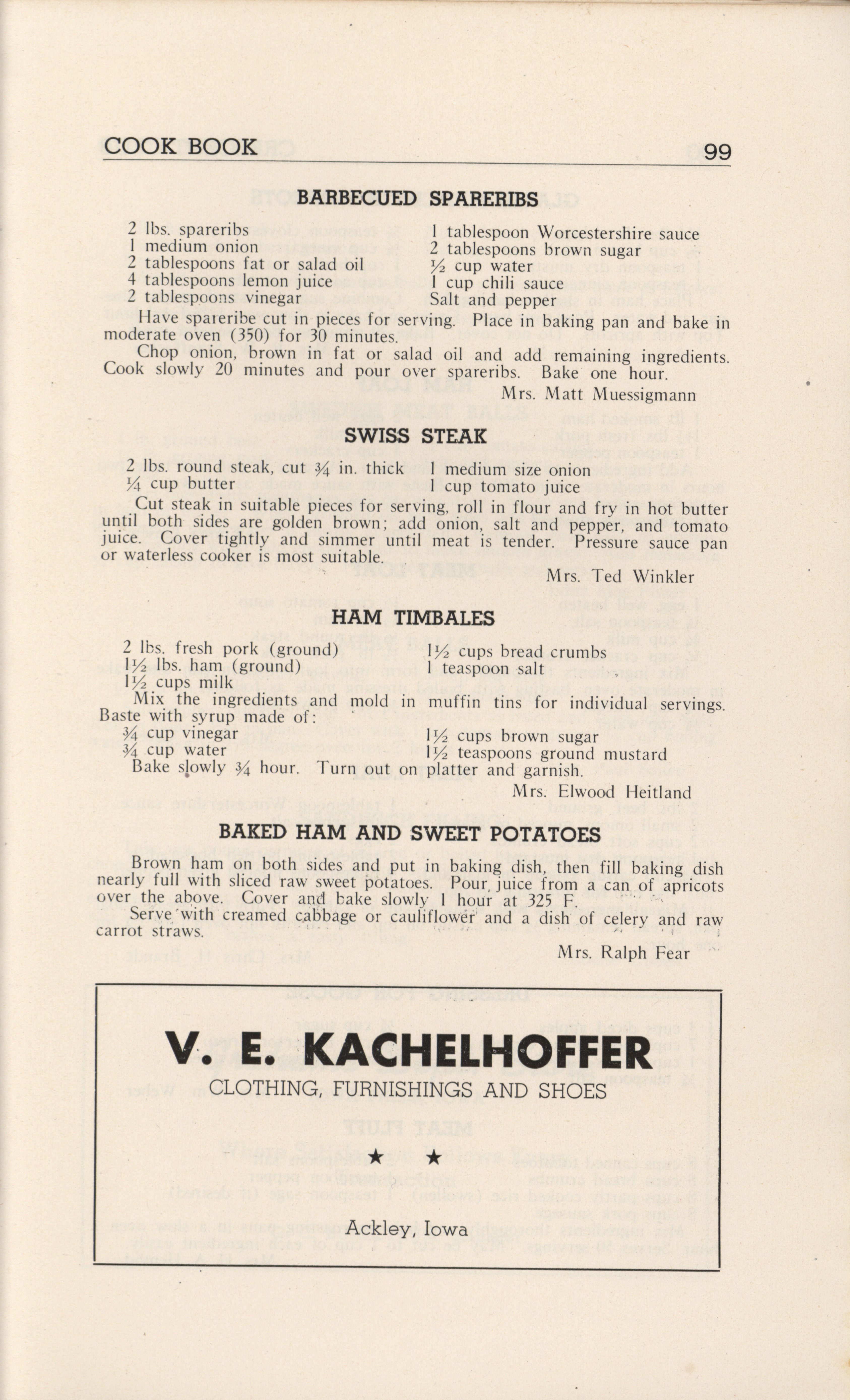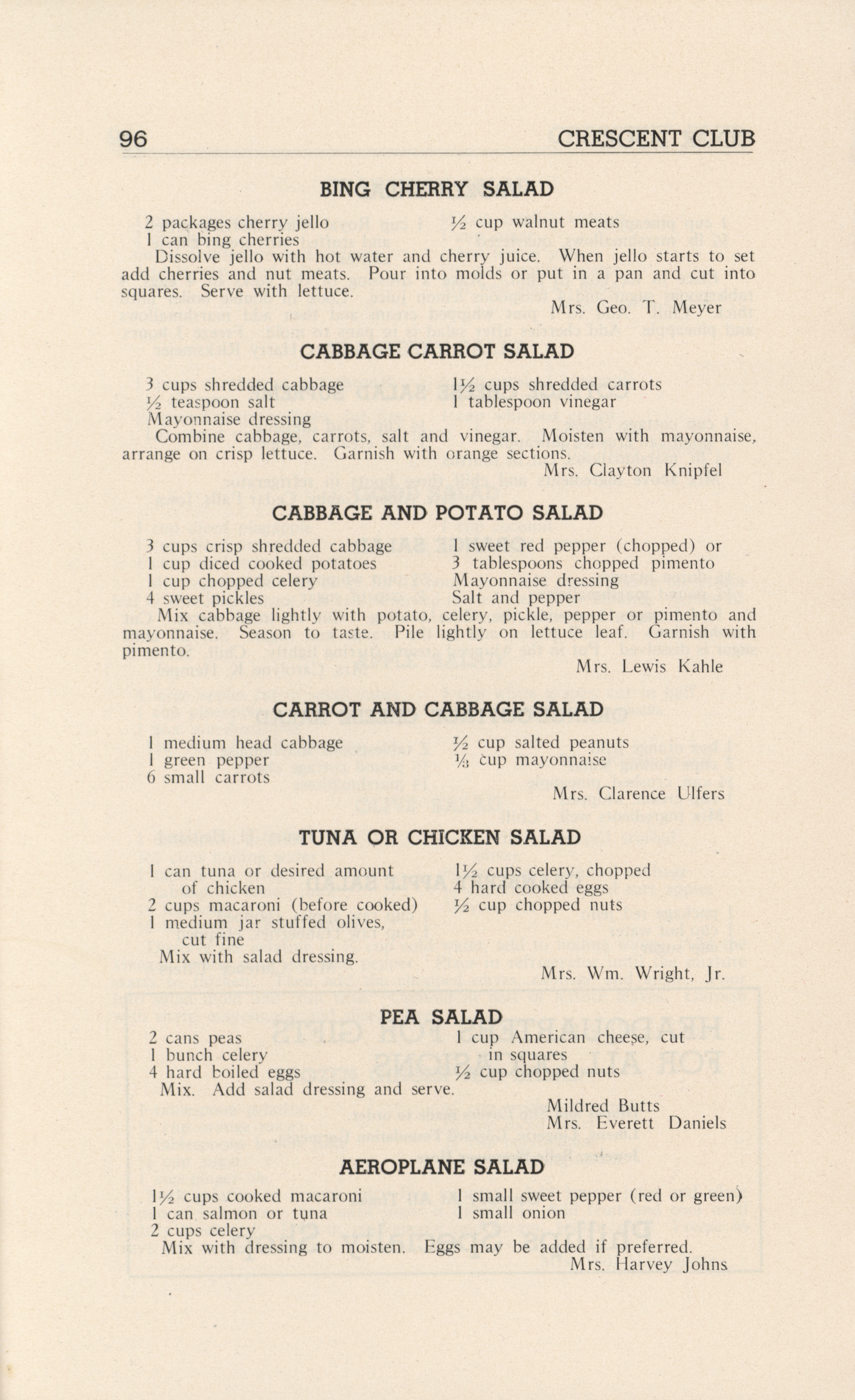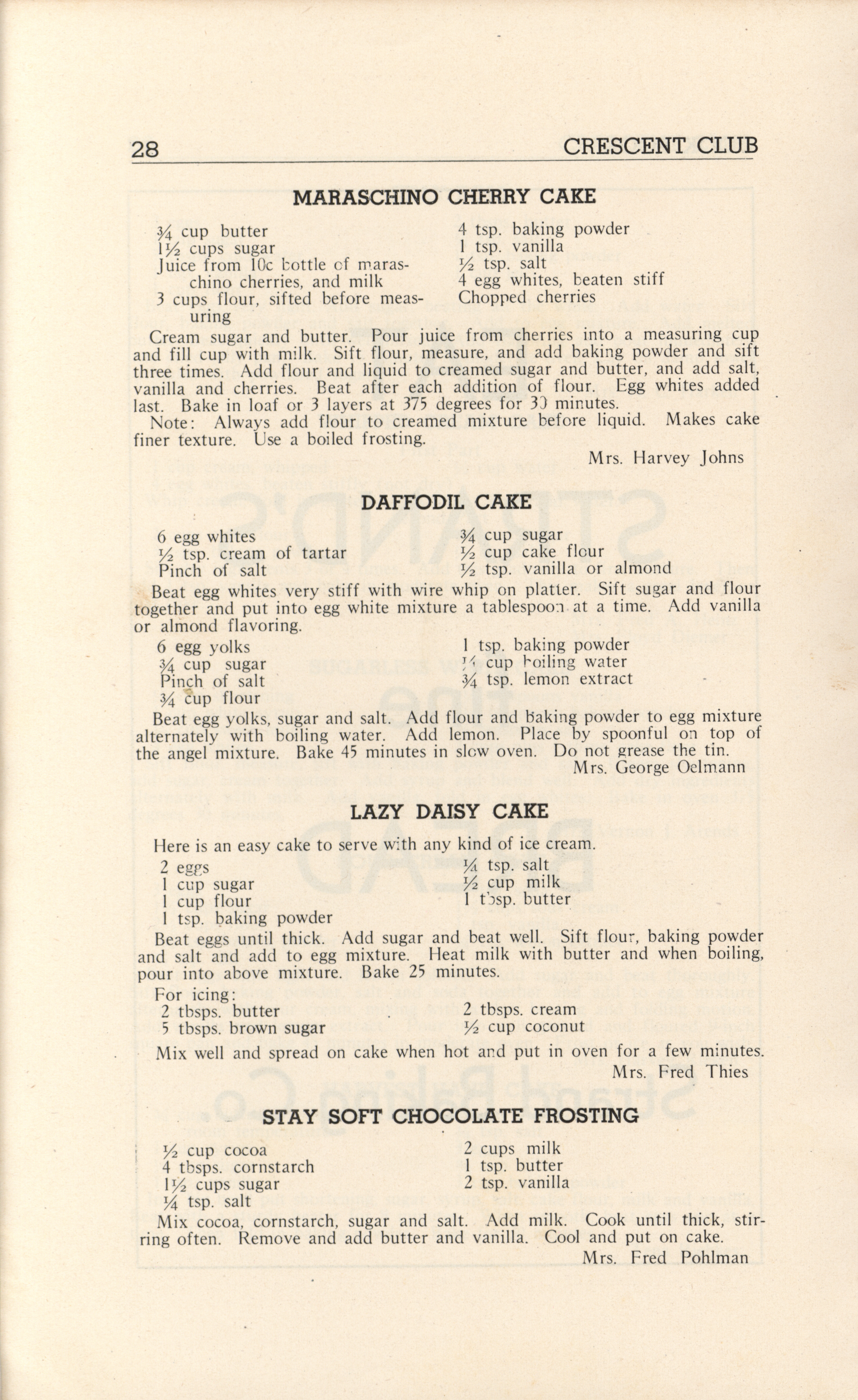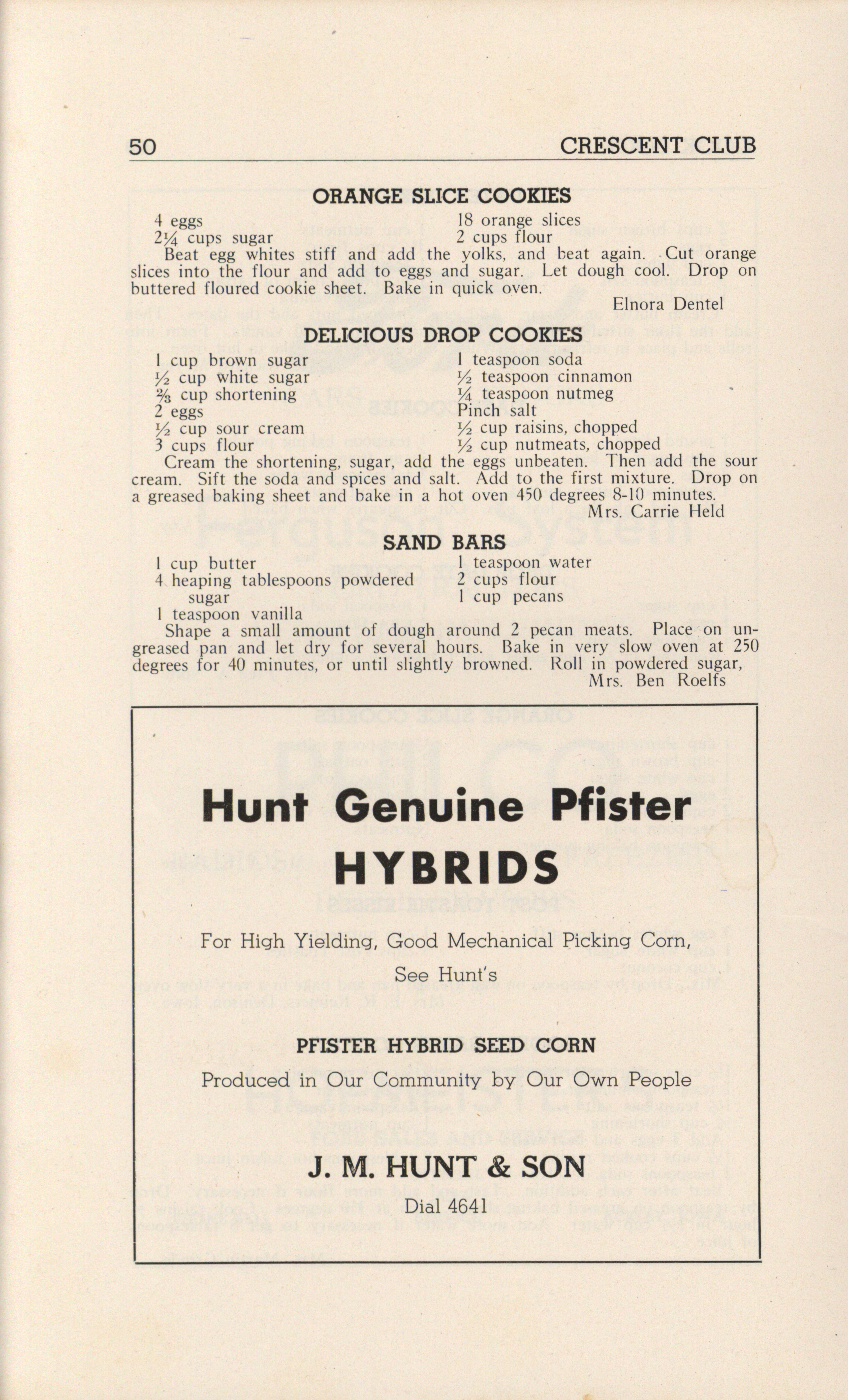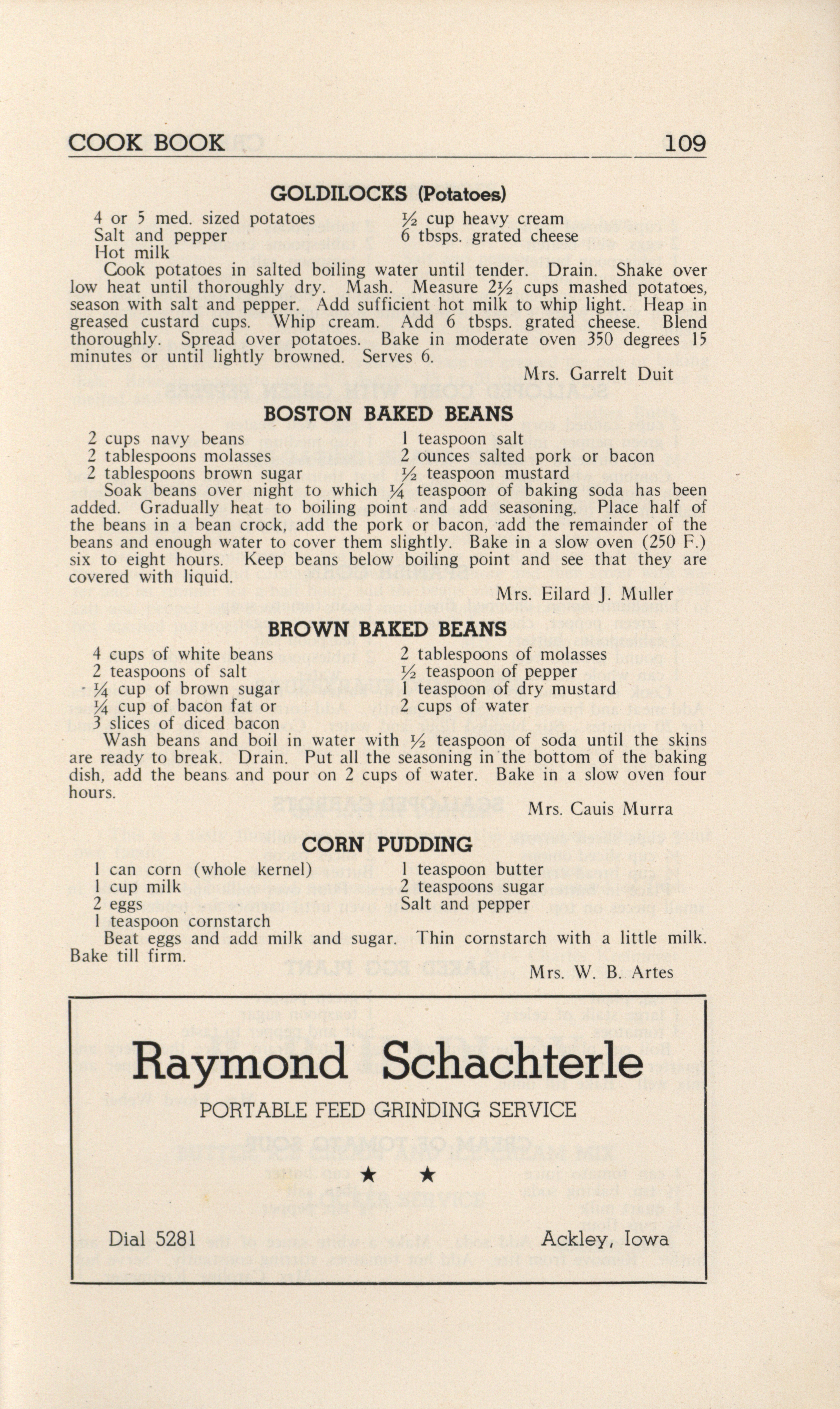 - A community cookbook compiled in 1946 by the Crescent Club of St. John’s Evangelical and Reformed Church in Ackley, Iowa. The book includes recipes contributed by club members and advertisements from local businesses.