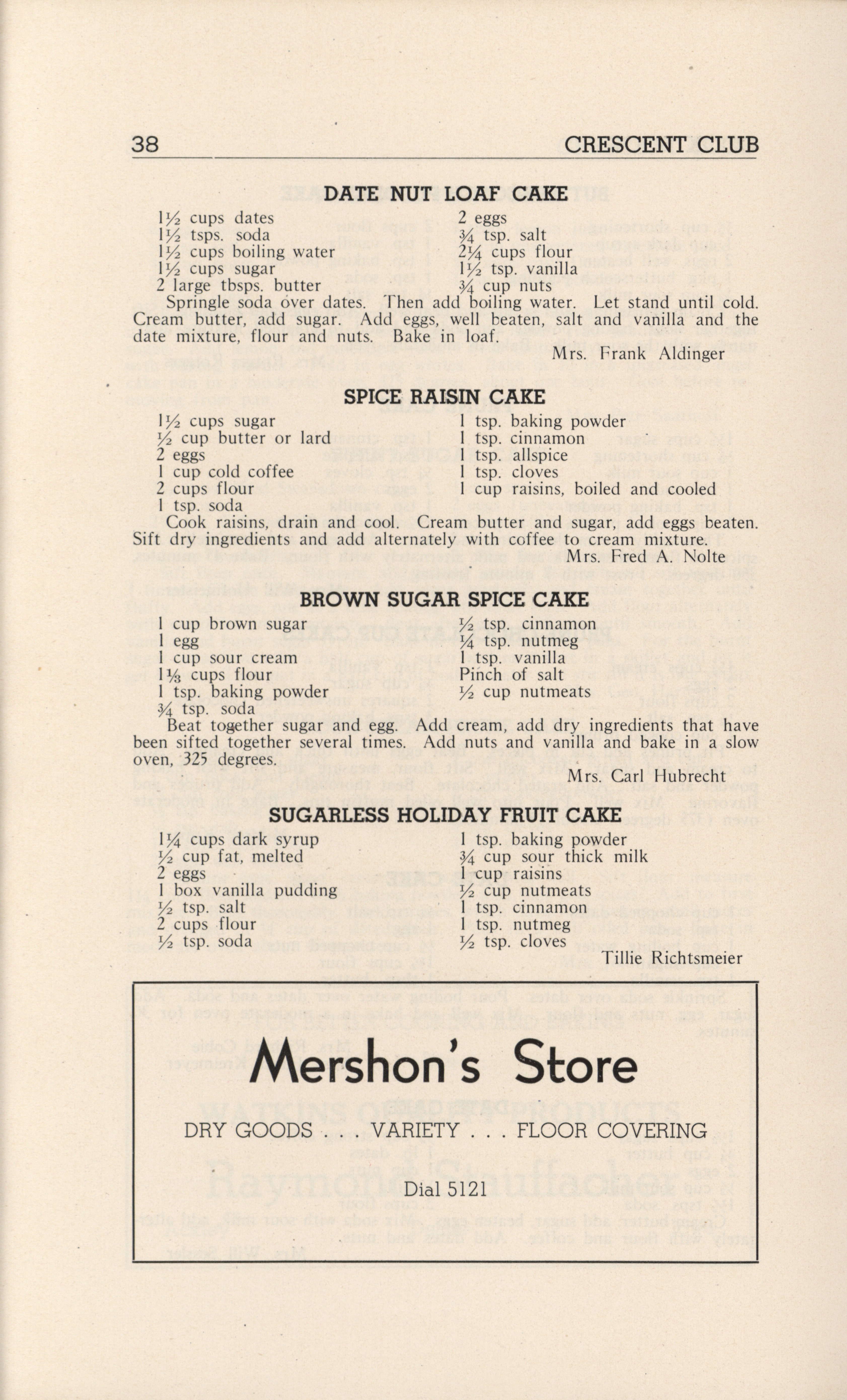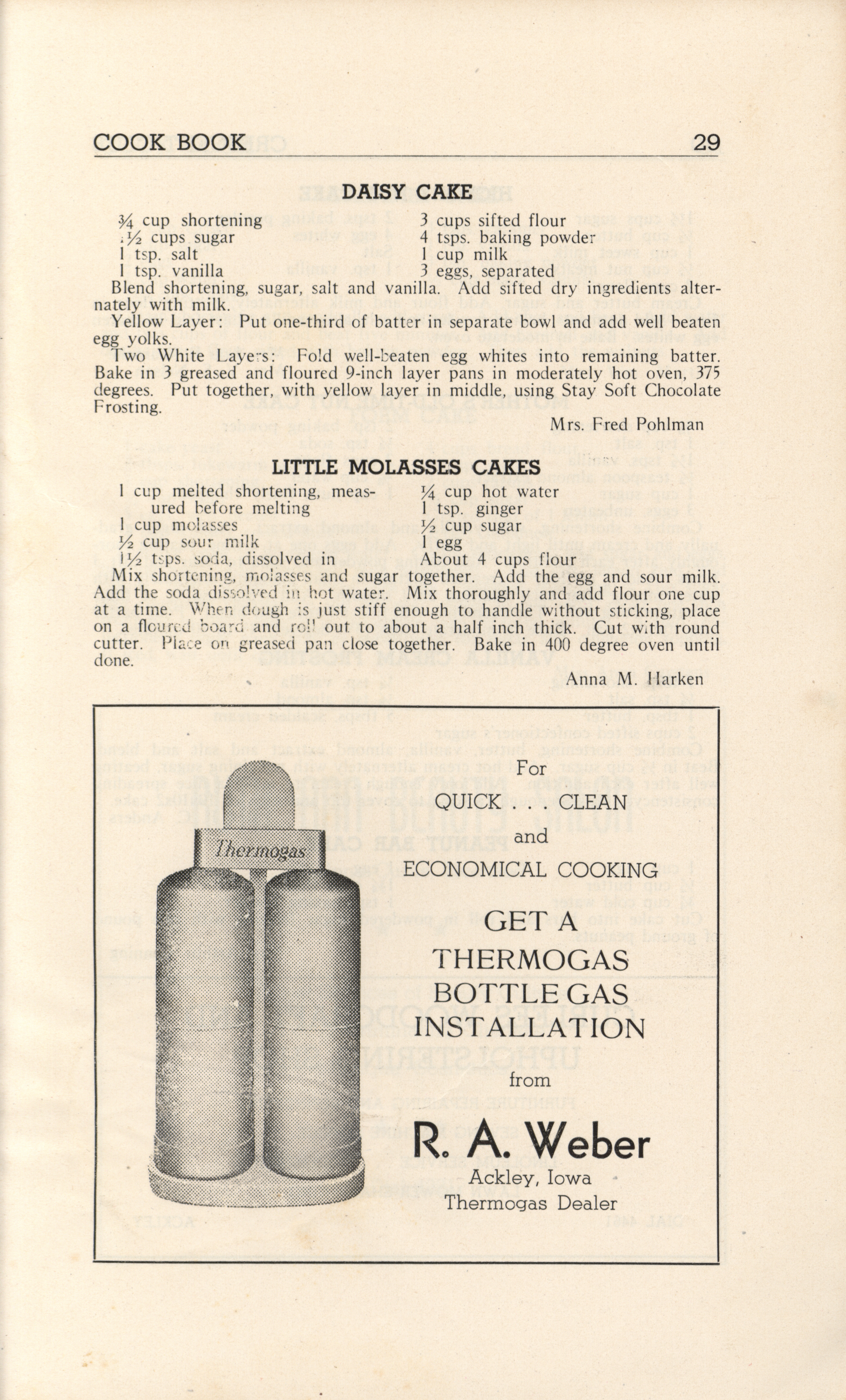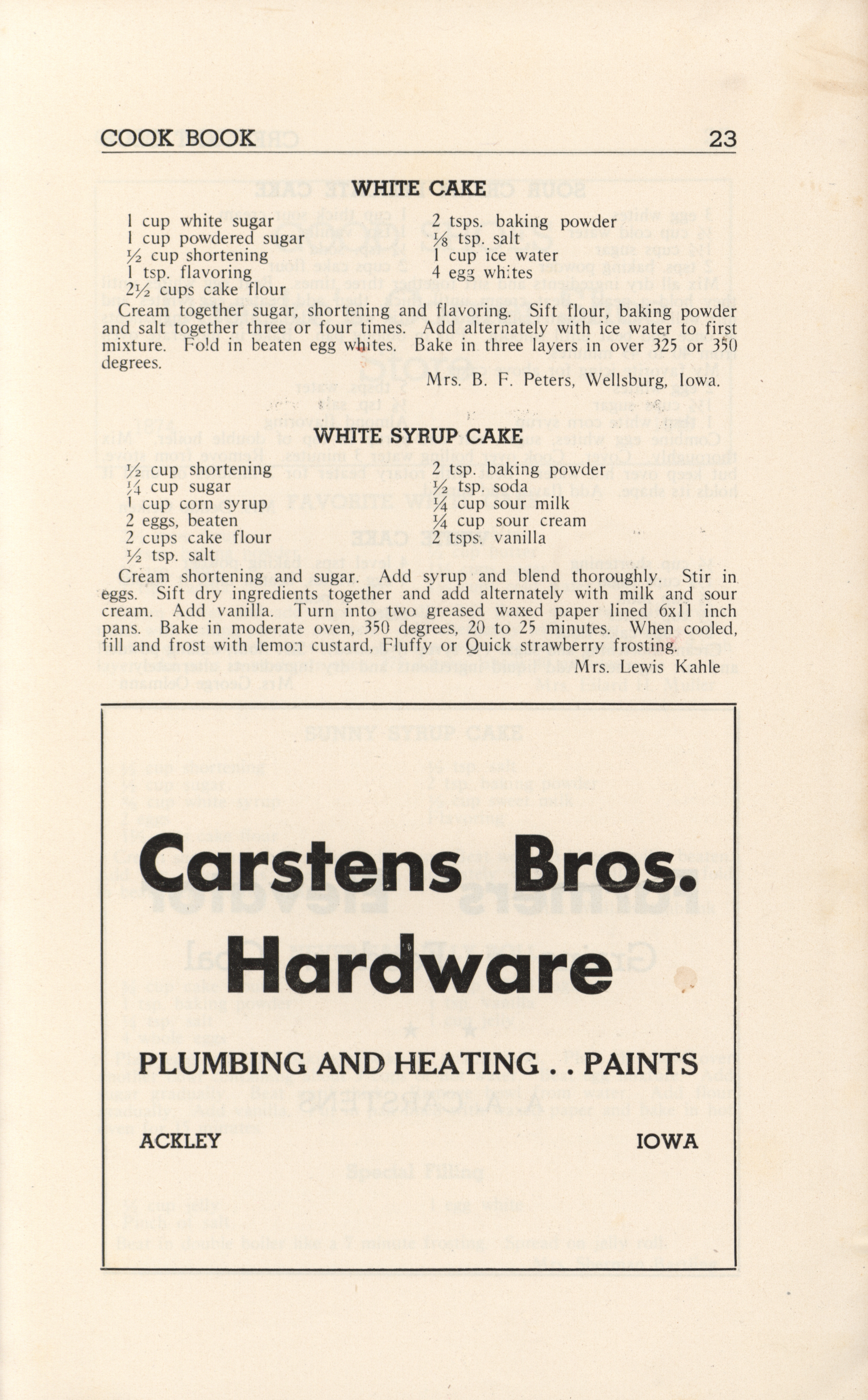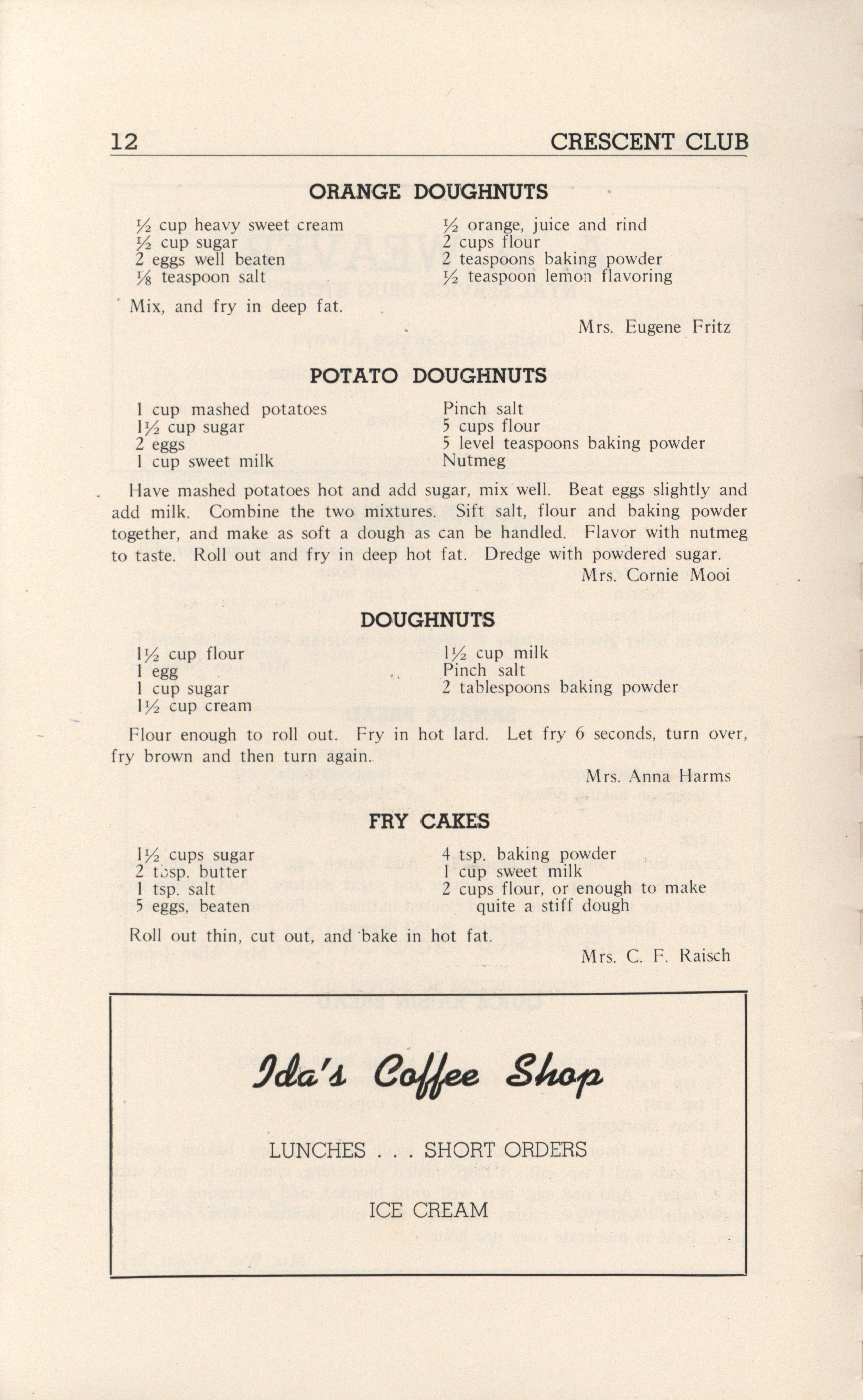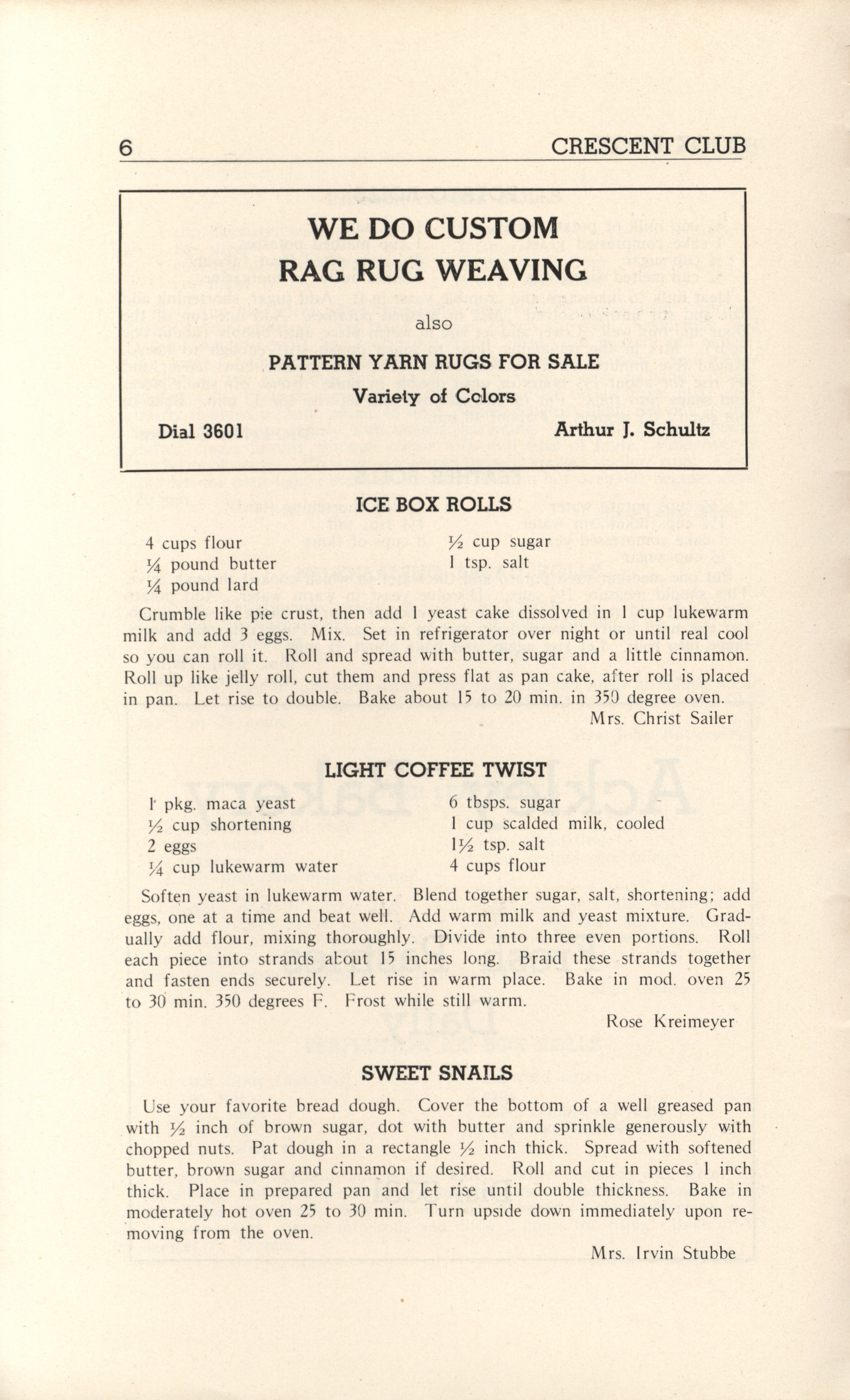 - A community cookbook compiled in 1946 by the Crescent Club of St. John’s Evangelical and Reformed Church in Ackley, Iowa. The book includes recipes contributed by club members and advertisements from local businesses.