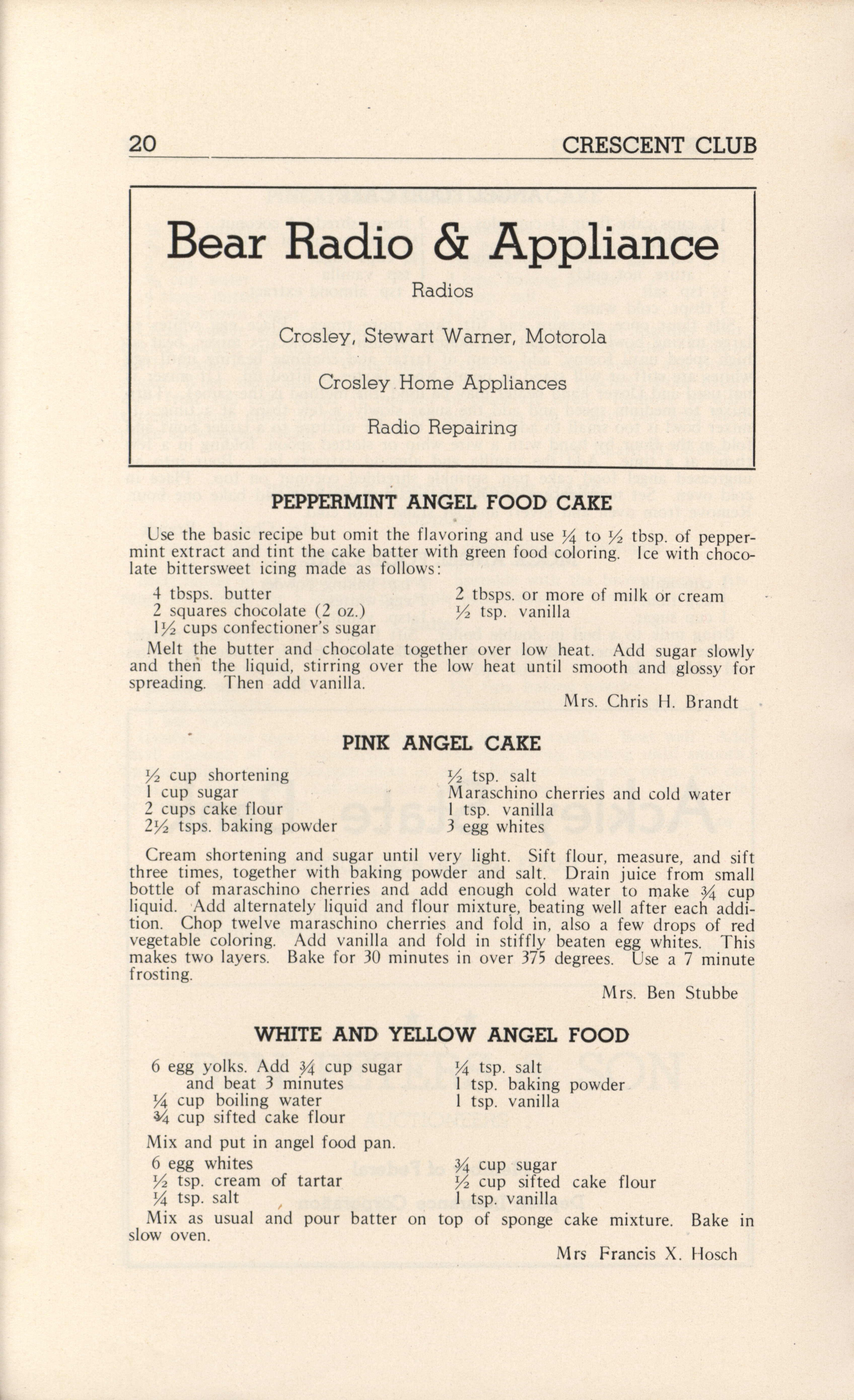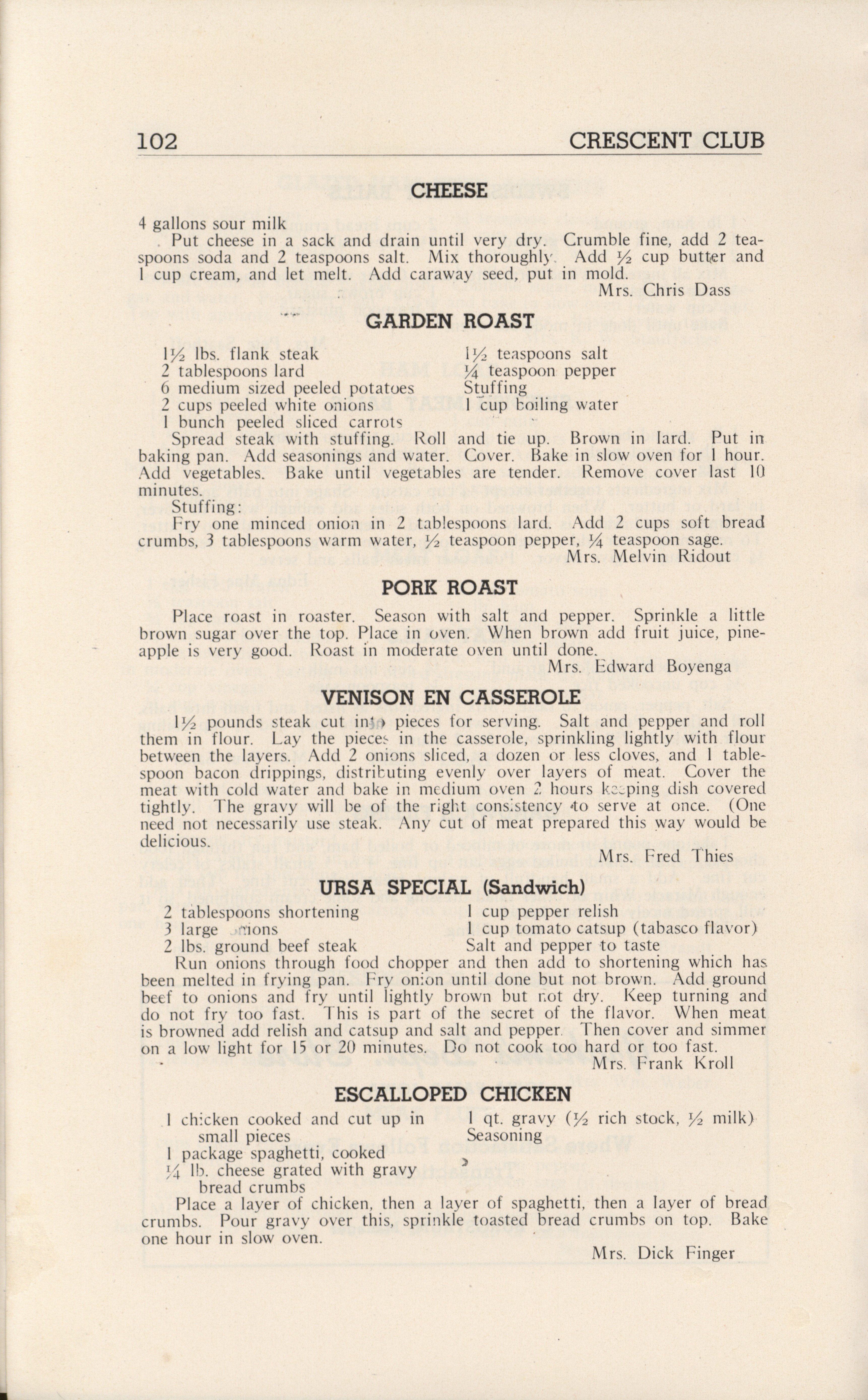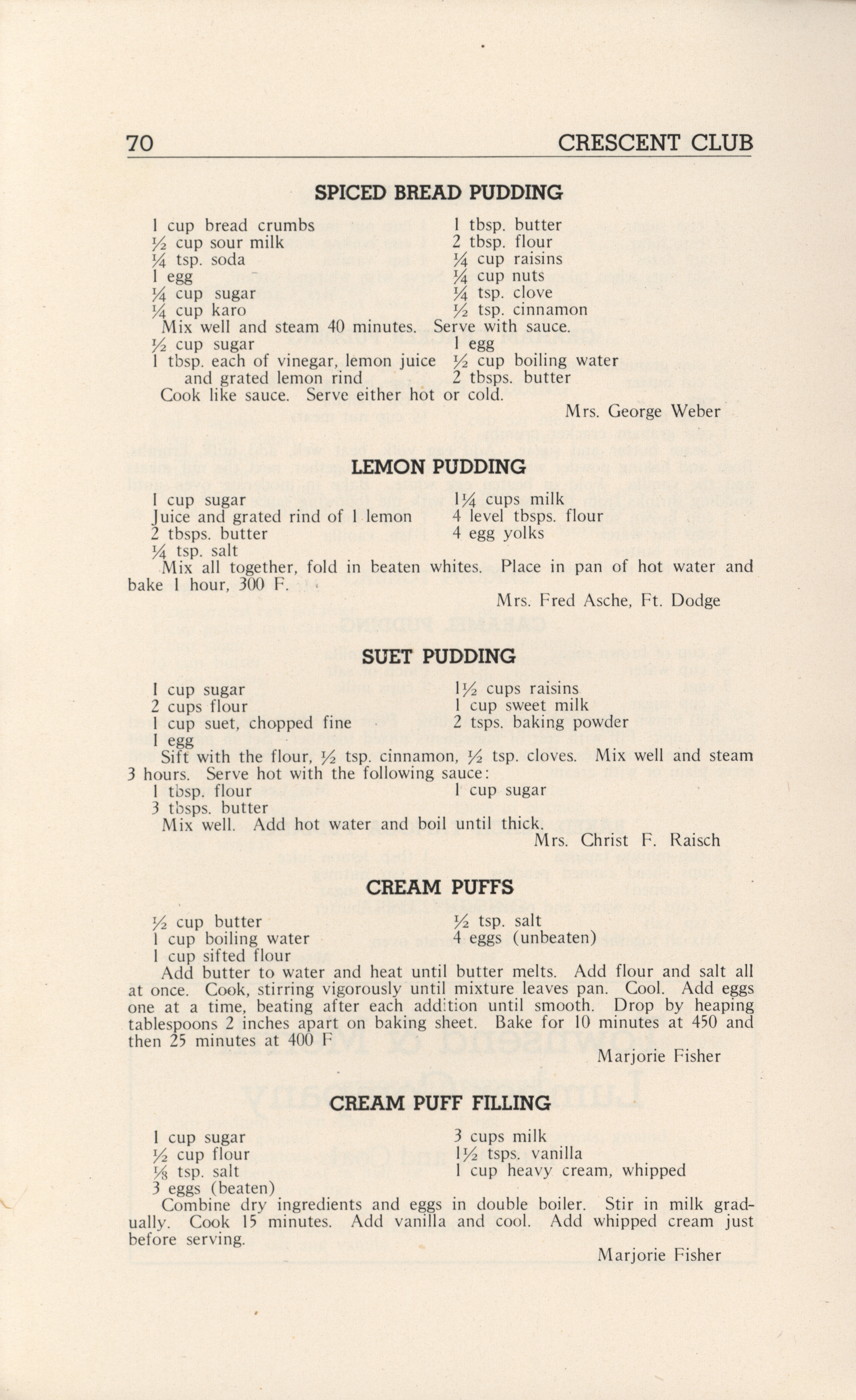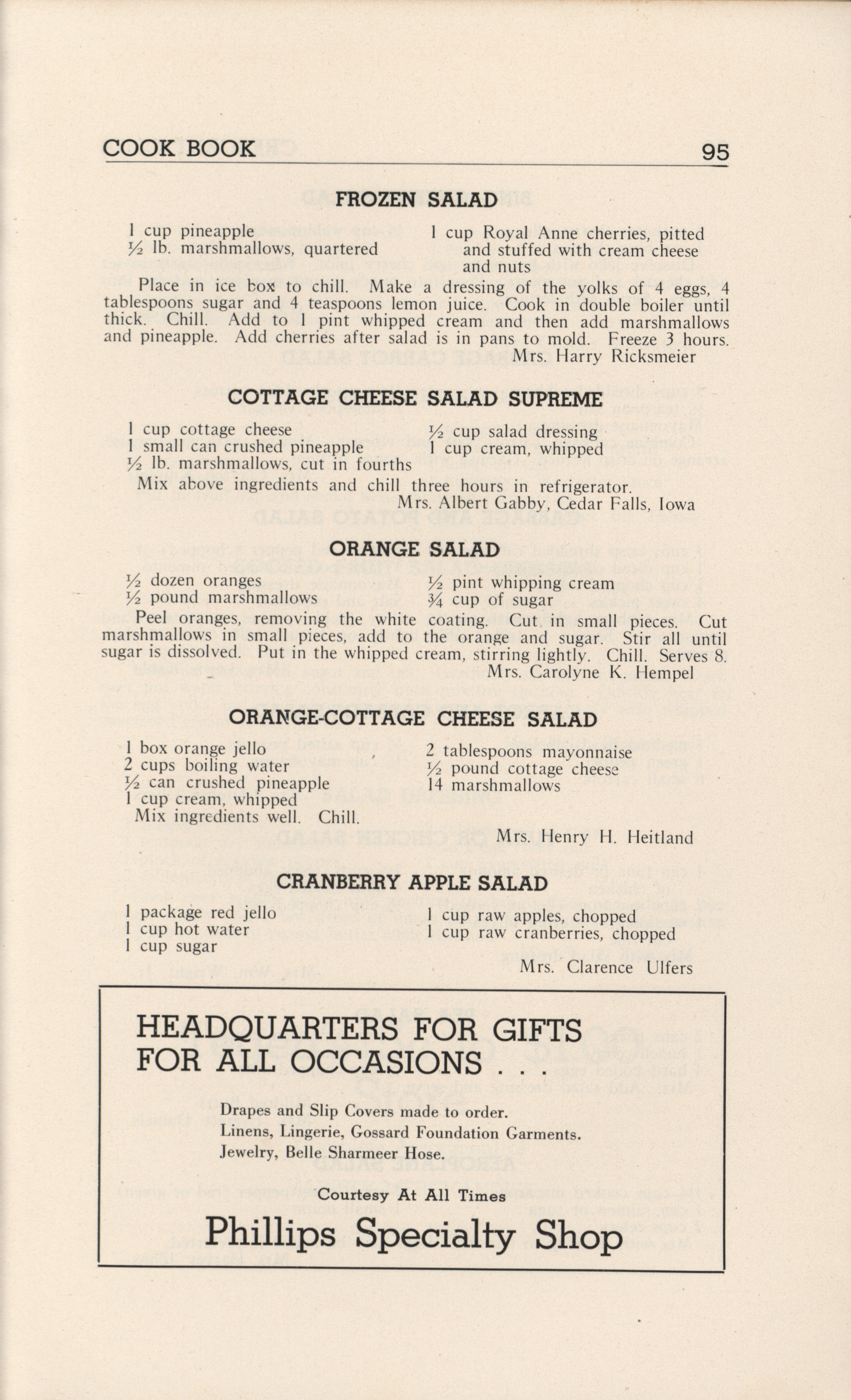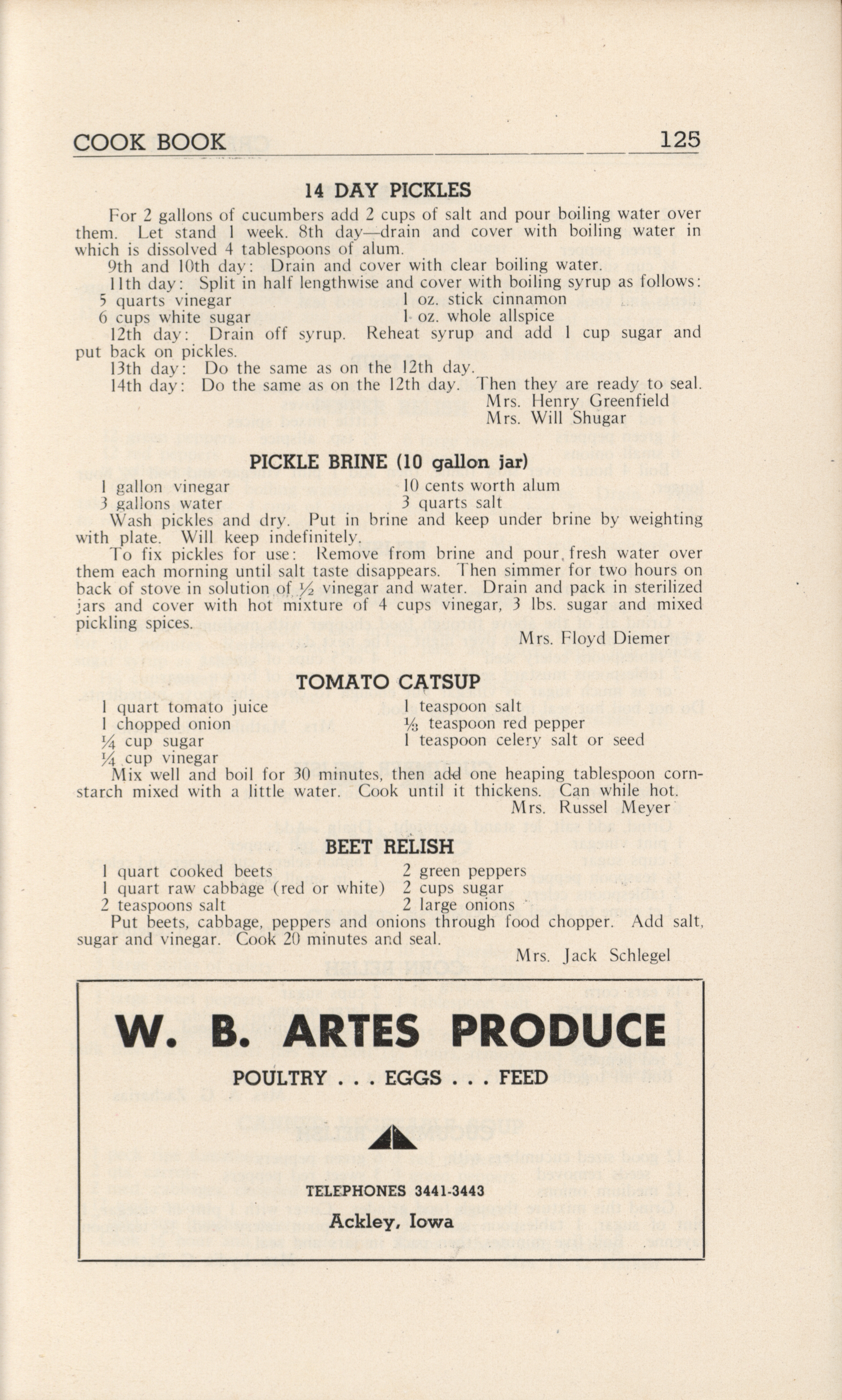 - A community cookbook compiled in 1946 by the Crescent Club of St. John’s Evangelical and Reformed Church in Ackley, Iowa. The book includes recipes contributed by club members and advertisements from local businesses.