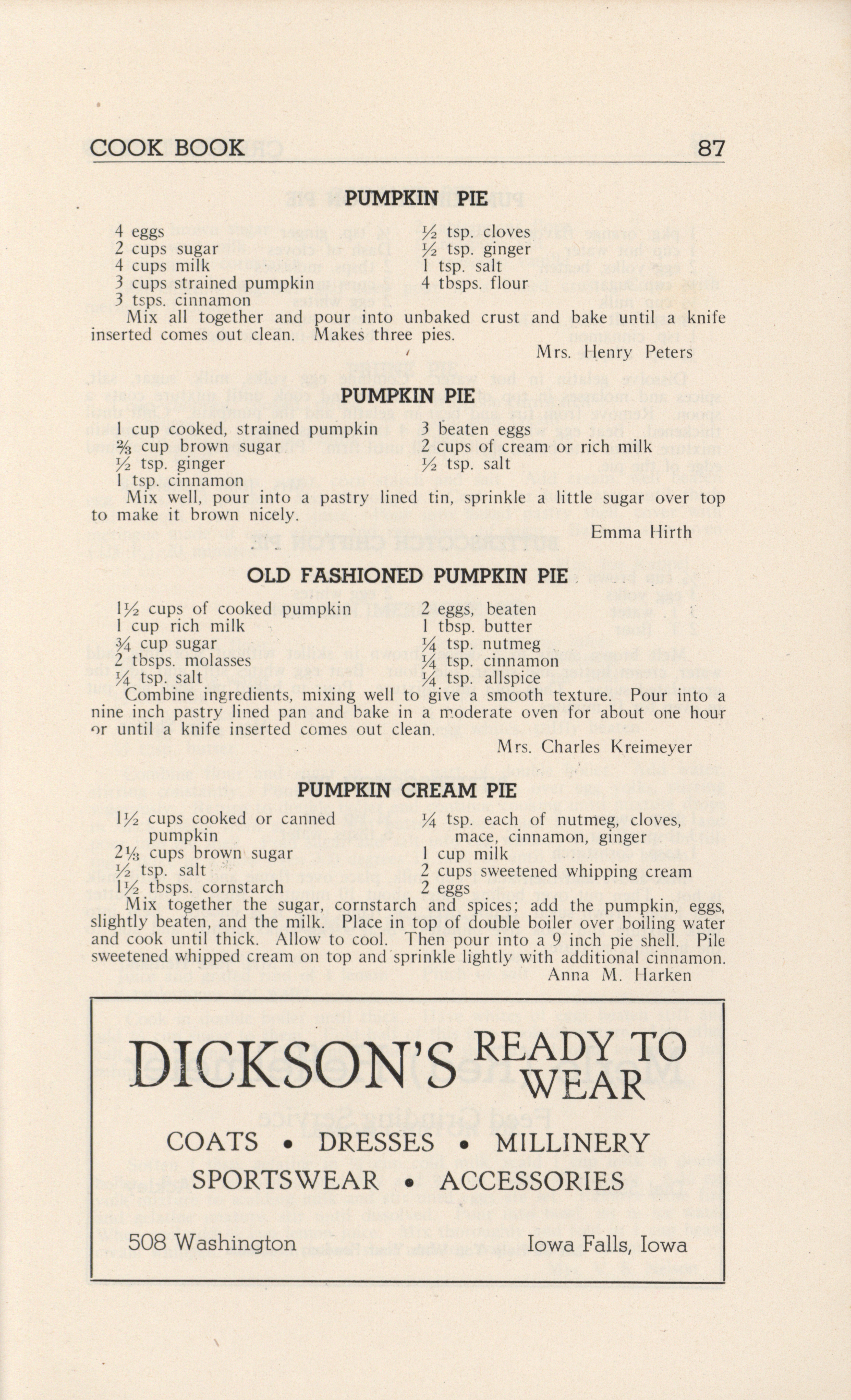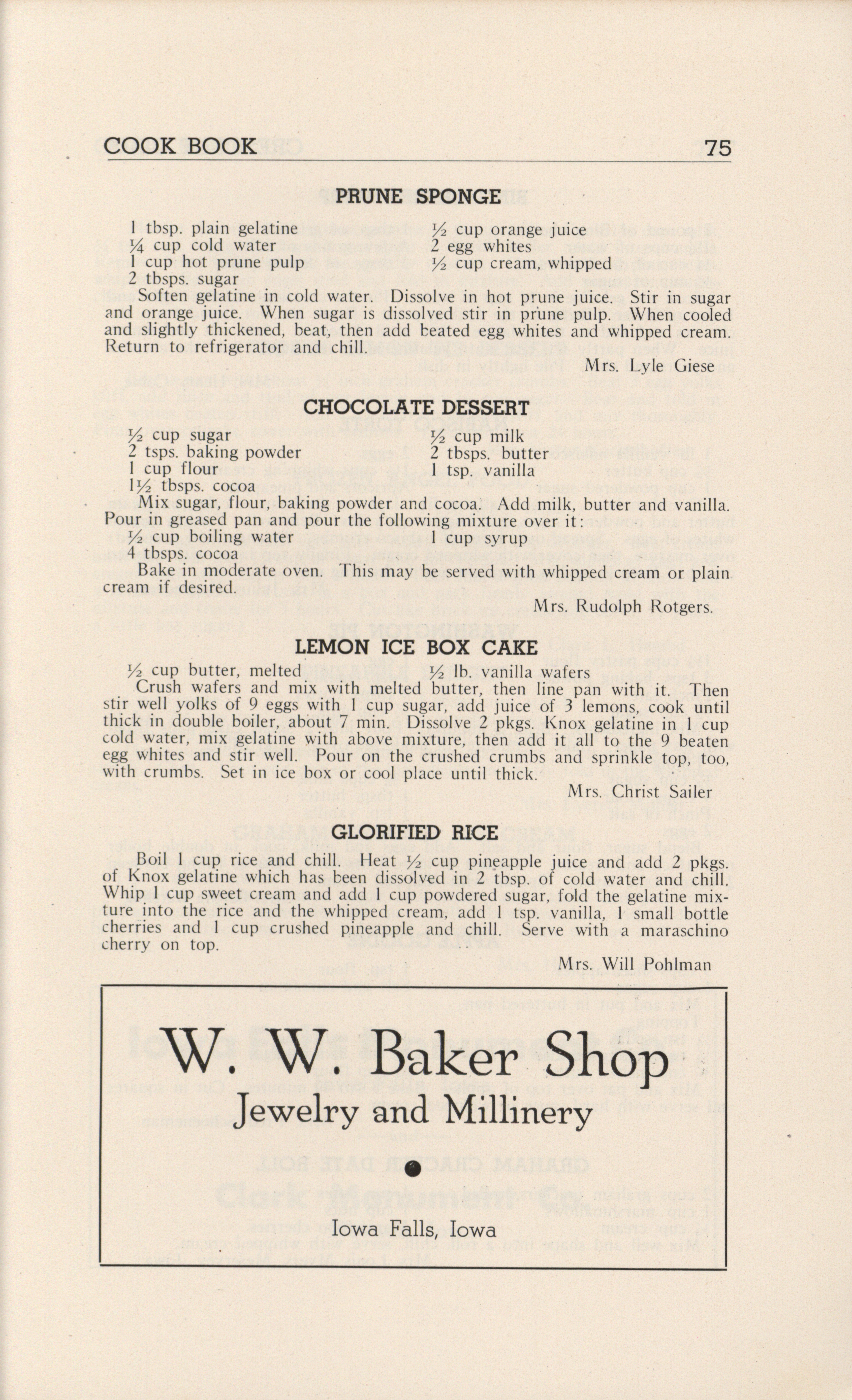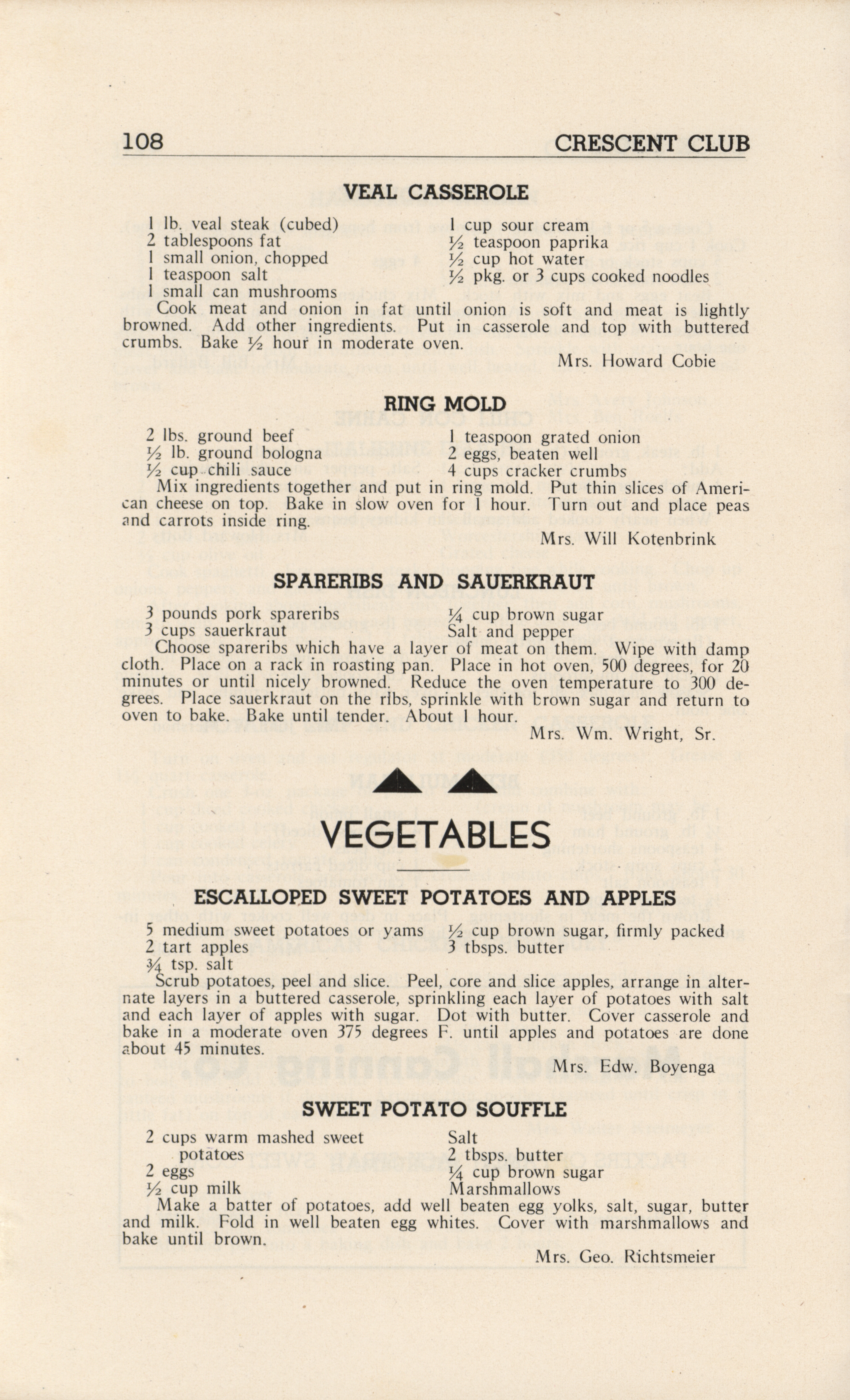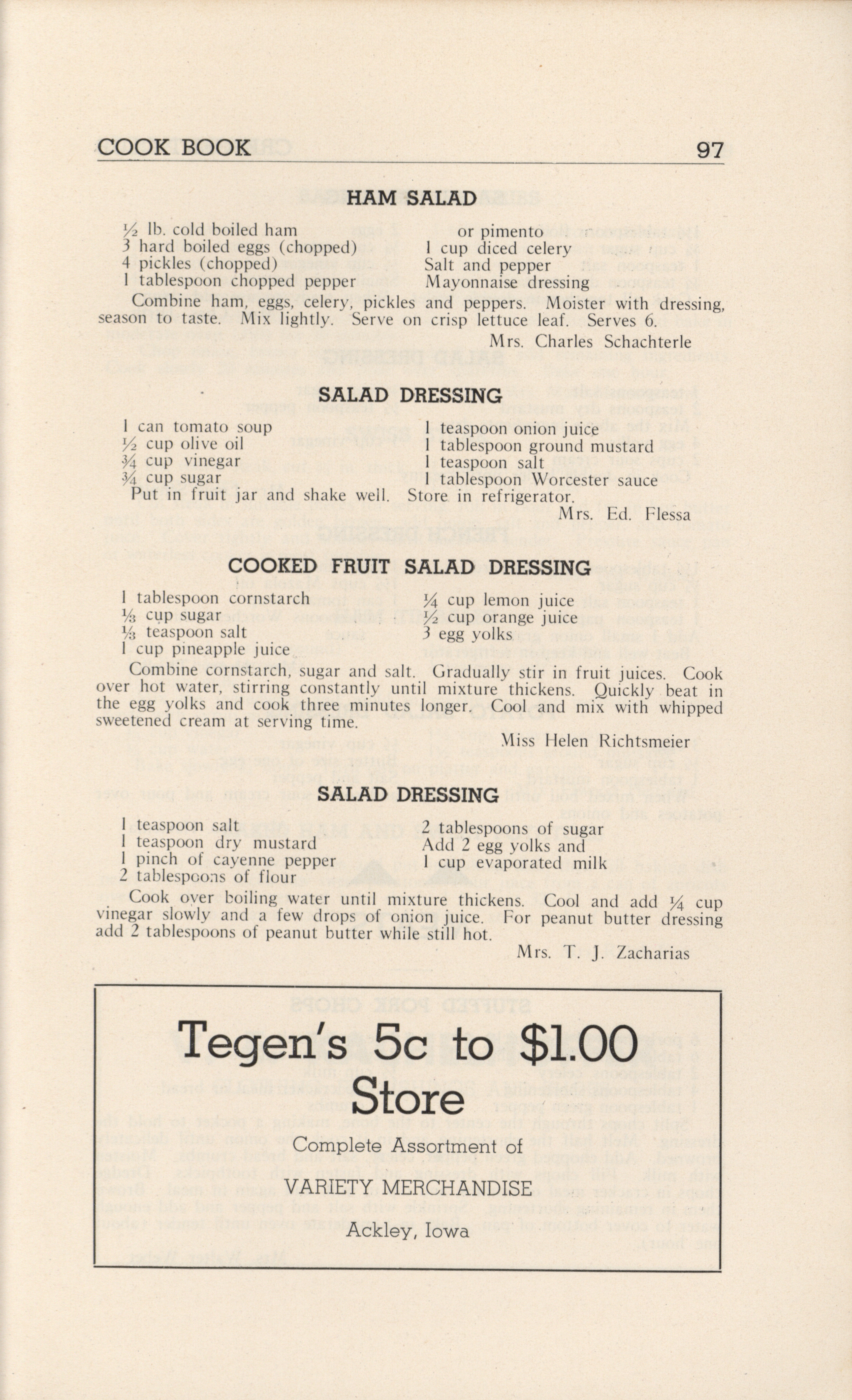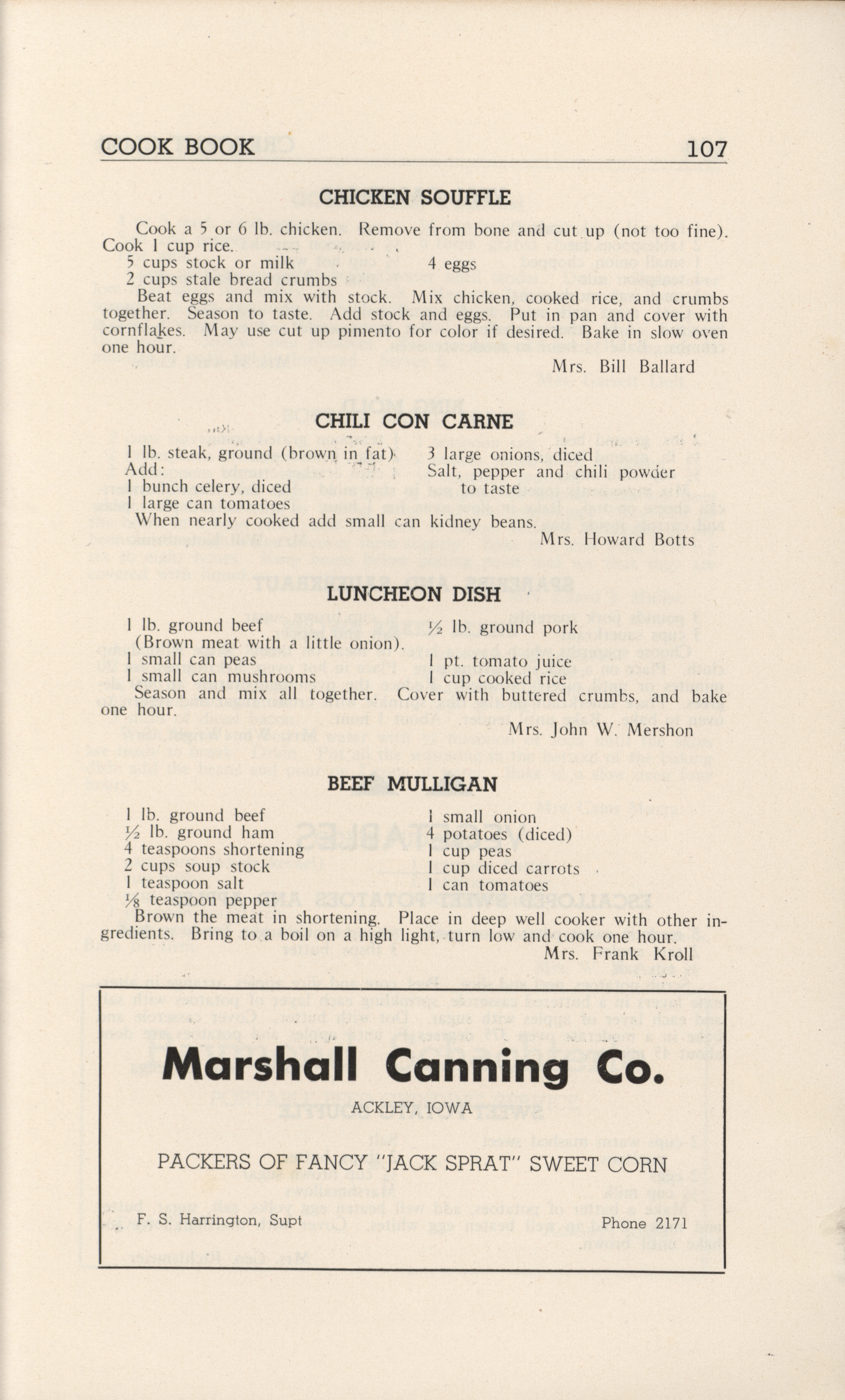 - A community cookbook compiled in 1946 by the Crescent Club of St. John’s Evangelical and Reformed Church in Ackley, Iowa. The book includes recipes contributed by club members and advertisements from local businesses.