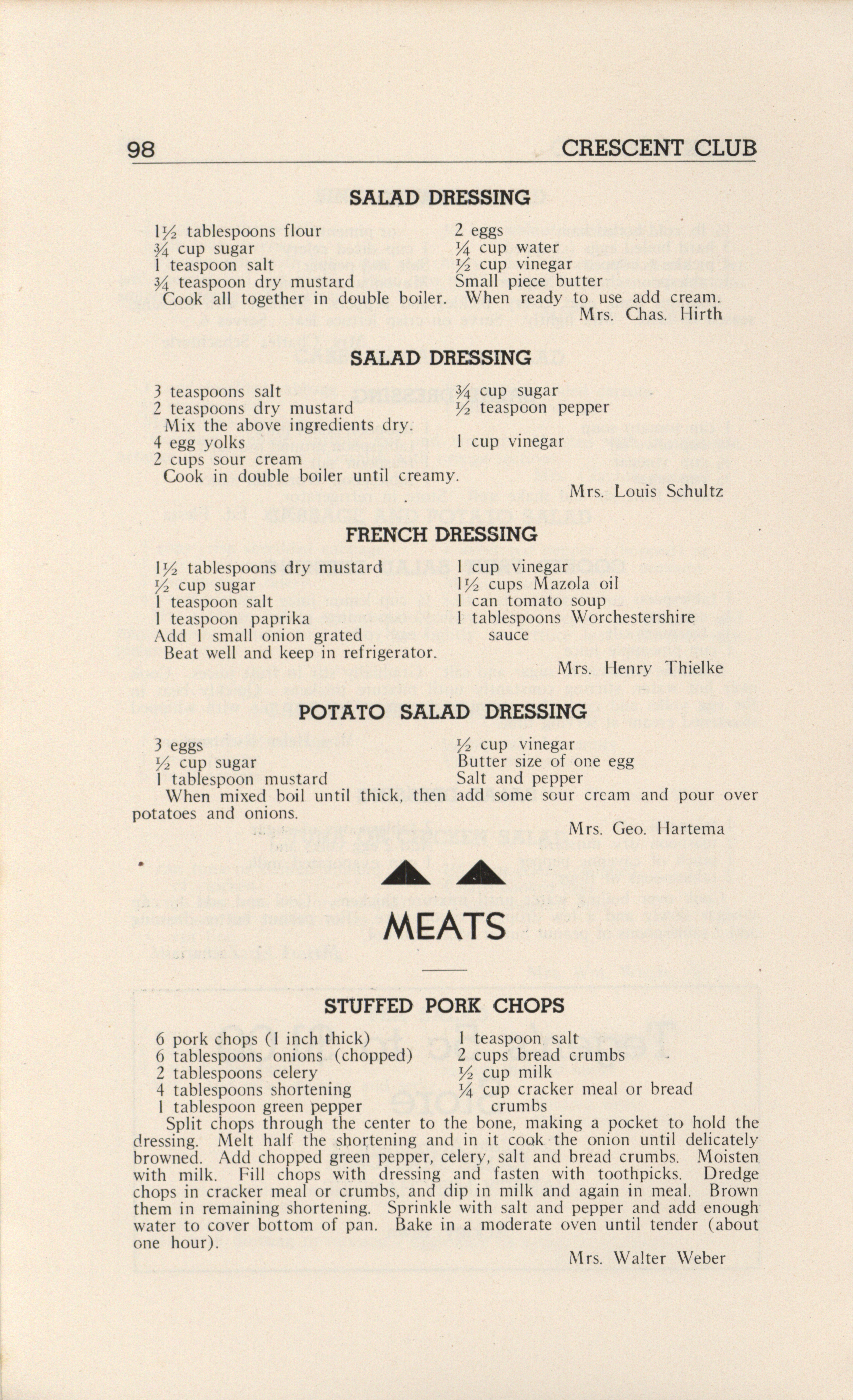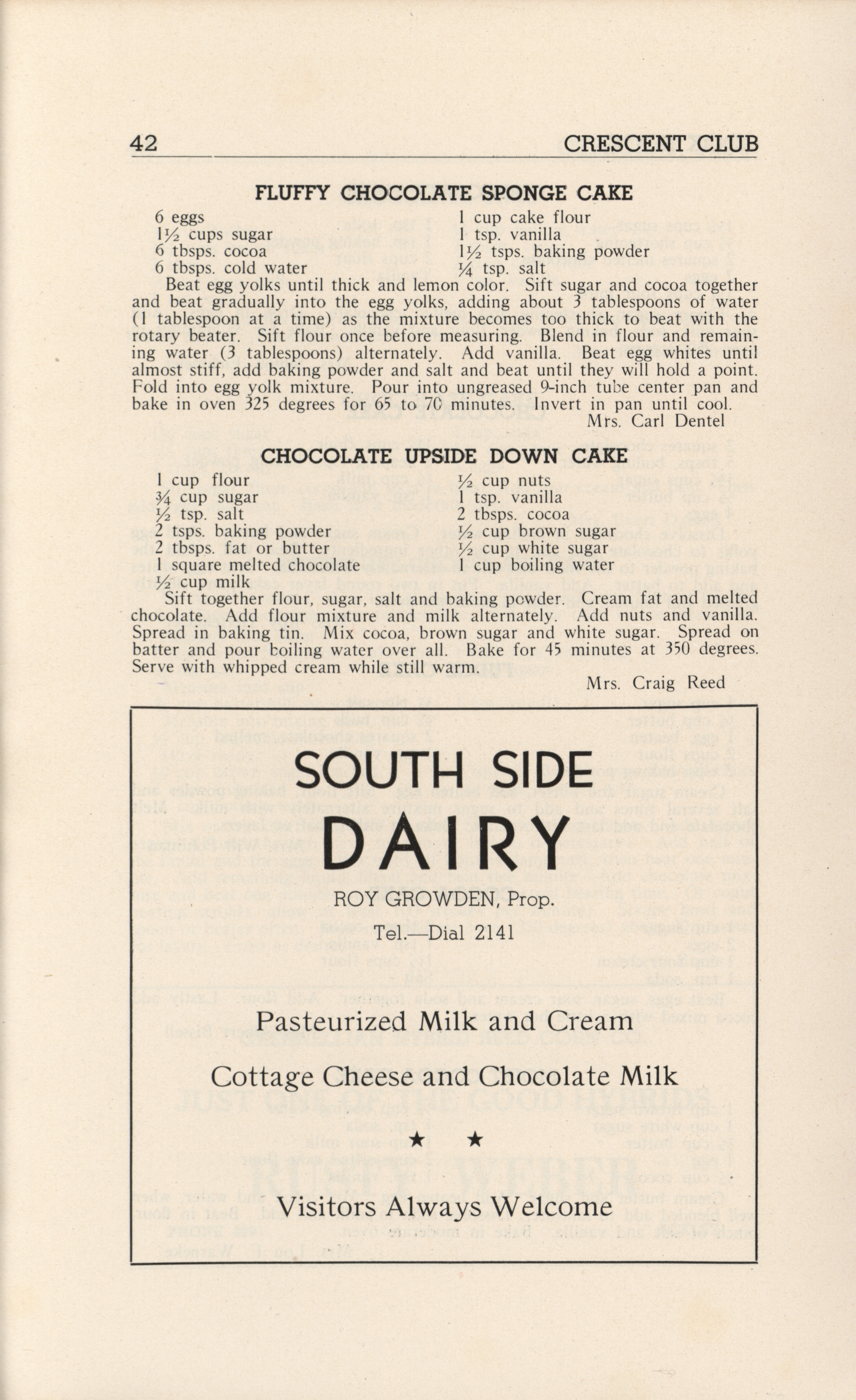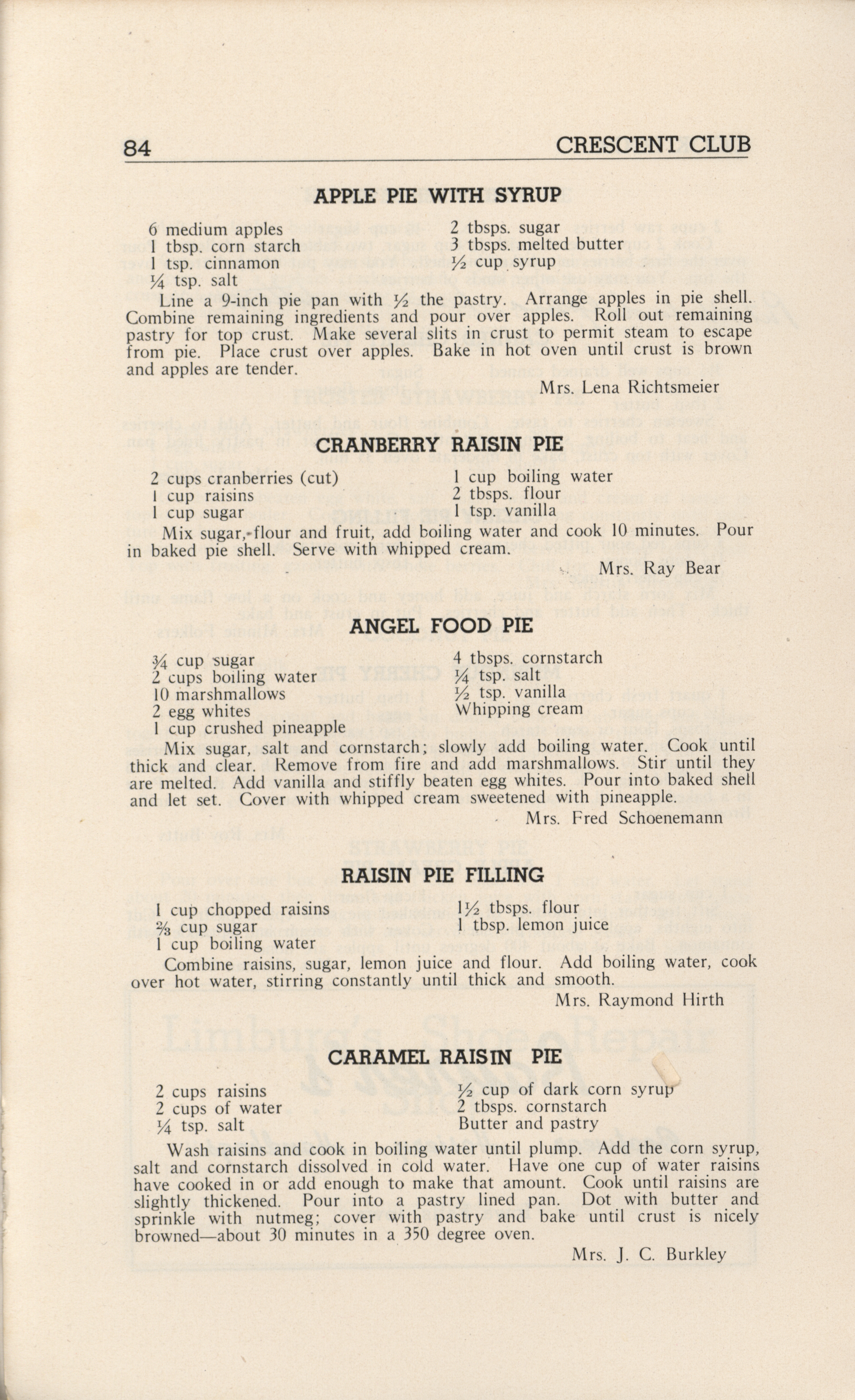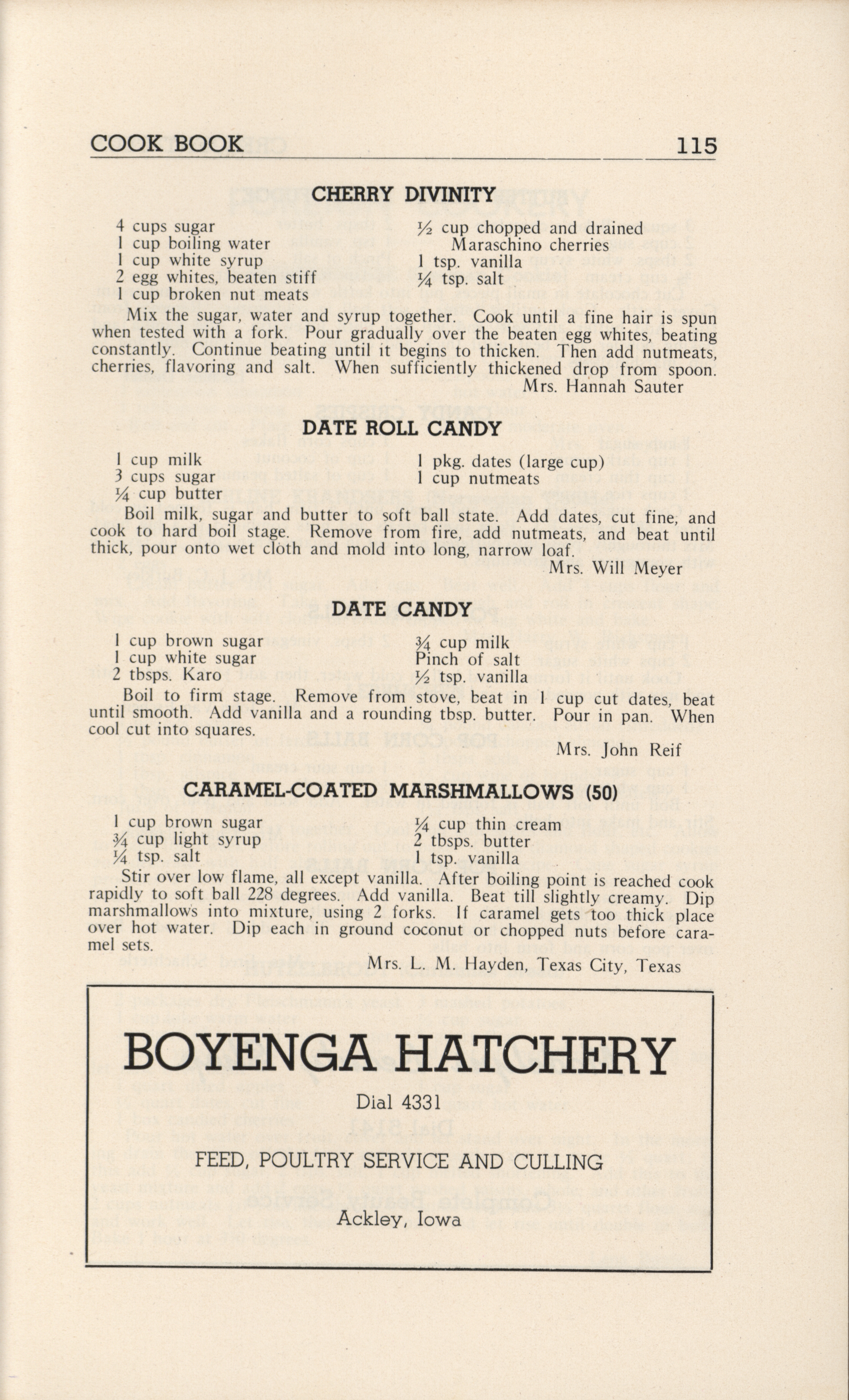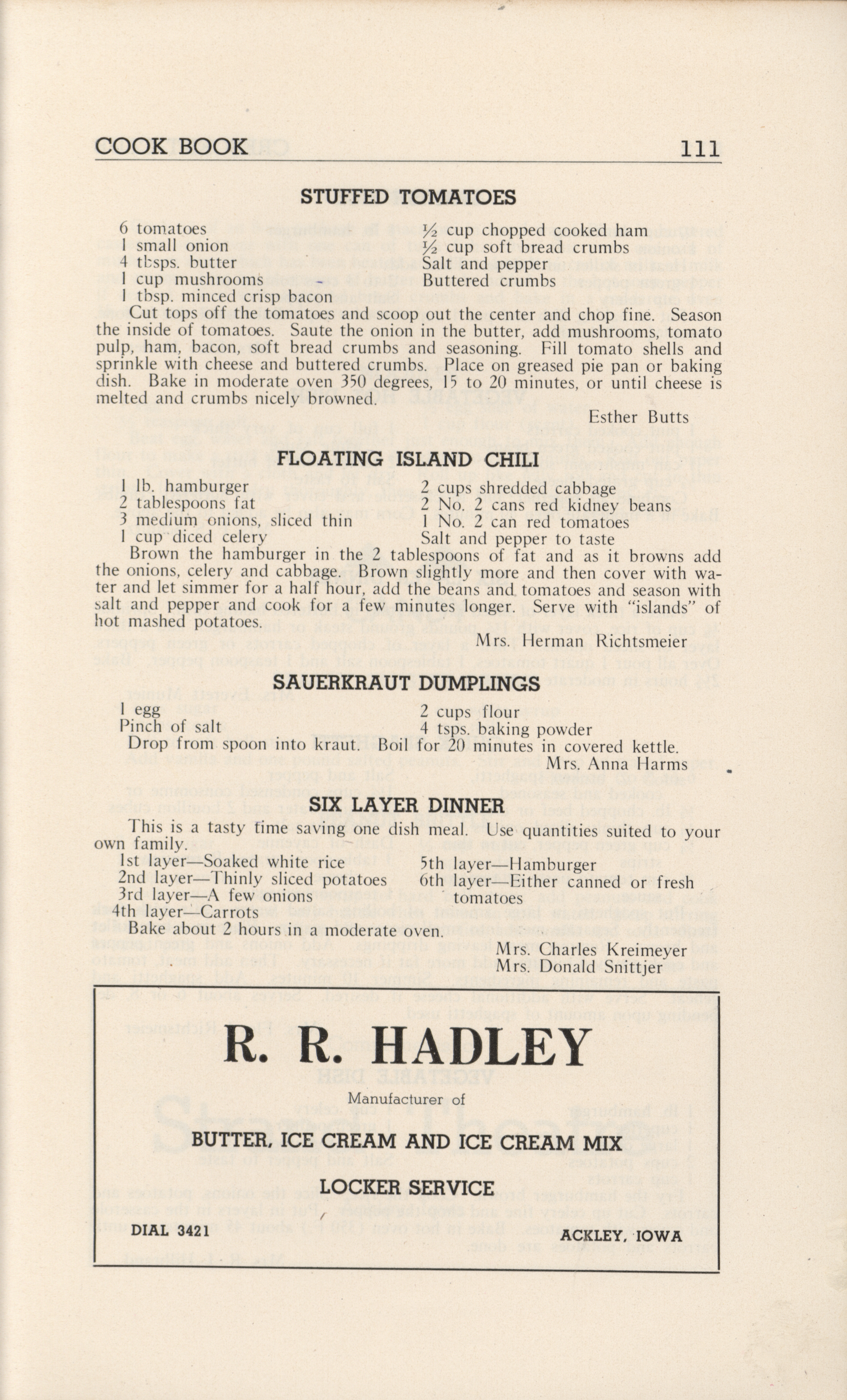 - A community cookbook compiled in 1946 by the Crescent Club of St. John’s Evangelical and Reformed Church in Ackley, Iowa. The book includes recipes contributed by club members and advertisements from local businesses.